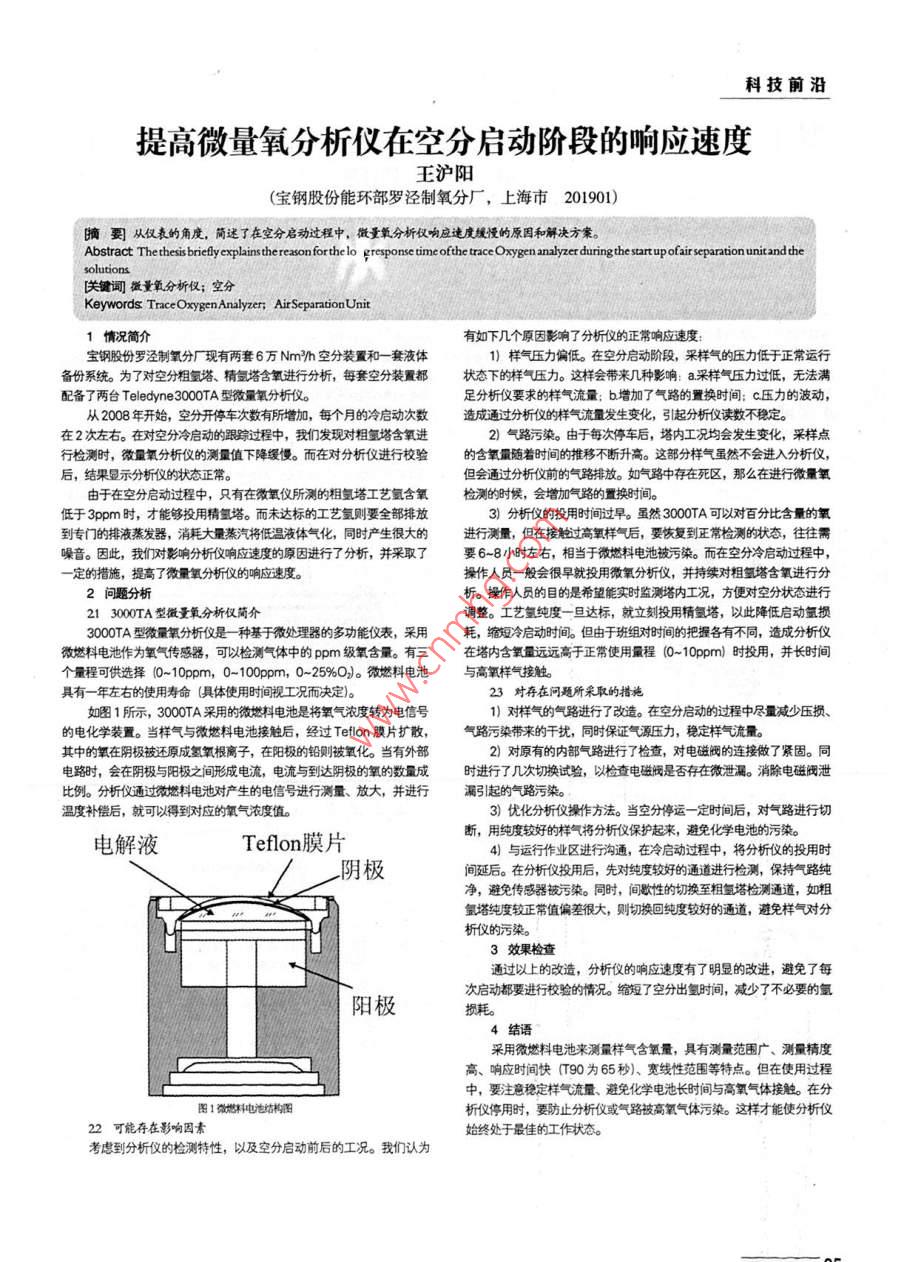 科技前沿提高微量氧分析儀在空分啟動(dòng)階段的響應(yīng)速度王滬陽(寶鋼股份能環(huán)部羅涇制氧分廠,上海市201901)摘要從僅表的角度,簡(jiǎn)述了在空分啟動(dòng)過程中,微量氧分析儀響應(yīng)速度緩慢的原因和解決方案。Abstract Thethesis briefly explainsthe reason forthe lo gresponse time ofthe trace Oxygen analyzer during the start upofairseparation unitandthe關(guān)鍵詞微量氧分析僅;空分Keywords Trace Oxygen Analyzer; AirSeparation Unit1惰況簡(jiǎn)介有如下幾個(gè)原因影響了分析儀的正常響應(yīng)速度寶鋼股份羅涇制氧分廠現(xiàn)有兩套6萬Nmh空分裝置和一套液體1)樣氣壓力偏低。在空分啟動(dòng)階段,采樣氣的壓力低于正常運(yùn)行備份系統(tǒng)。為了對(duì)空分粗氨塔、精氬塔含氧進(jìn)行分析,每套空分裝置都狀態(tài)下的樣氣壓力。這樣會(huì)帶來幾種影響:a采樣氣壓力過低,無法滿配備了兩臺(tái) Teledyne3000TA型微量氧分析儀。足分析儀要求的樣氣流量;b增加了氣路的置換時(shí)間:c壓力的波動(dòng),從2008年開始,空分開停車次數(shù)有所增加,每個(gè)月的冷啟動(dòng)次數(shù)造成通過分析儀的樣氣流量發(fā)生變化,引起分析儀讀數(shù)不穩(wěn)定。在2次左右。在對(duì)空分冷啟動(dòng)的跟蹤過程中,我們發(fā)現(xiàn)對(duì)粗氫塔含氧進(jìn)2)氣路污染。由于每次停車后,塔內(nèi)工況均會(huì)發(fā)生變化,采樣點(diǎn)行檢測(cè)時(shí),微量氧分析儀的測(cè)量值下降緩慢。而在對(duì)分析儀進(jìn)行校驗(yàn)的含氧量隨著時(shí)間的推移不斷升高。這部分樣氣雖然不會(huì)進(jìn)入分析儀后,結(jié)果顯示分析儀的狀態(tài)正常但會(huì)通過分析儀前的氣路排放。如氣路中存在死區(qū),那么在進(jìn)行微量氧由于在空分啟動(dòng)過程中,只有在微氧儀所測(cè)的粗氫塔工藝氫含氧檢測(cè)的時(shí)候,會(huì)增加氣路的置換時(shí)間。低于3ppm時(shí),才能夠投用精氫塔。而未達(dá)標(biāo)的工藝氫則要全部排放3)分析儀的投用時(shí)間過早。雖然3000TA可以對(duì)百分比含量的氧到專門的排液蒸發(fā)器,消耗大量蒸汽將低溫液體氣化,同時(shí)產(chǎn)生很大的進(jìn)行測(cè)量,但在接觸過高氧樣氣后,要恢復(fù)到正常檢測(cè)的狀態(tài),往往需噪音。因此,我們對(duì)影響分析儀響應(yīng)速度的原因進(jìn)行了分析,并采取了要6-8小時(shí)左右,相當(dāng)于微燃料電池被污染。而在空分冷啟動(dòng)過程中,一定的措施,提高了微量氧分析儀的響應(yīng)速度。操作人員一般會(huì)很早就投用微氧分析儀,并持續(xù)對(duì)粗氫塔含氧進(jìn)行分析。操作人員的目的是希望能實(shí)時(shí)監(jiān)測(cè)塔內(nèi)工況,方便對(duì)空分狀態(tài)進(jìn)行213000TA型微量氧分析儀簡(jiǎn)介調(diào)整。工藝氫純度一旦達(dá)標(biāo),就立刻投用精氫塔,以此降低啟動(dòng)氫損3000TA型微量氧分析儀是種基于微處理器的多功能儀表,采用耗,縮短冷令啟動(dòng)時(shí)間。但由于班組對(duì)時(shí)間的把握各有不同,造成分析儀微燃料電池作為氧氣傳感器,可以檢測(cè)氣體中的ppm級(jí)氧含量。有三在塔內(nèi)含氧量遠(yuǎn)遠(yuǎn)高于正常使用量程(0-10ppm)時(shí)投用,并長(zhǎng)時(shí)間個(gè)量程可供選擇(0-100m,0-100pm,0~25%0)。微燃料電池與高氧樣氣接觸。具有一年左右的使用壽命(具體使用時(shí)間視工況而決定)。23對(duì)存在問題所采取的措施如圖1所示,3000TA采用的微燃料電池是將氧氣濃度轉(zhuǎn)為電信號(hào)1)對(duì)樣氣的氣路進(jìn)行了改造。在空分啟動(dòng)的過程中盡量減少壓損、的電化學(xué)裝置。當(dāng)樣氣與微燃料電池接觸后,經(jīng)過Teon膜片擴(kuò)散,氣路污染帶來的干擾,同時(shí)保證氣源壓力,穩(wěn)定樣氣流量。其中的氧在期極被還原成氫氧根離子,在陽極的鉛則被氧化。當(dāng)有外部2)對(duì)原有的內(nèi)部氣路進(jìn)行了檢查,對(duì)電磁閥的連接做了緊固。同電路時(shí),會(huì)在陰極與陽極之間形成電流,電流與到達(dá)陰極的氧的數(shù)量成時(shí)進(jìn)行了幾次切換試驗(yàn),以檢查電磁閥是否存在微泄漏。消除電磁閥泄比例。分析儀通過微燃料電池對(duì)產(chǎn)生的電信號(hào)進(jìn)行測(cè)量、放大,并進(jìn)行漏引起的氣路污染溫度補(bǔ)償后,就可以得到對(duì)應(yīng)的氧氣濃度值。3)優(yōu)化分析儀操作方法。當(dāng)空分停運(yùn)一定時(shí)間后,對(duì)氣路進(jìn)行切電解液Teflon膜片斷,用純度較好的樣氣將分析儀保護(hù)起來,避免化學(xué)電池的污染。4)與運(yùn)行作業(yè)區(qū)進(jìn)行溝通,在冷啟動(dòng)過程中,將分析儀的投用時(shí)陰極間延后。在分析儀投用后,先對(duì)純度較好的通道進(jìn)行檢測(cè),保持氣路純凈,避免傳感器被污染。同時(shí),間歇性的切換至粗氫塔檢測(cè)通道,如粗氫塔純度較正常值偏差很大,則切換回純度較好的通道,避免樣氣對(duì)分析儀的污染3效果檢通過以上的改造,分析儀的響應(yīng)速度有了明昱的改進(jìn),避免了每次啟動(dòng)都要進(jìn)行校驗(yàn)的情況??s短了空分出氫時(shí)間,減少了不必要的氯陽極耗4結(jié)語采用微燃料電池來測(cè)量樣氣含氧量,具有測(cè)量范圍廣、測(cè)量精度高、響應(yīng)時(shí)間快「90為65秒)、寬線性范圍等特點(diǎn)。