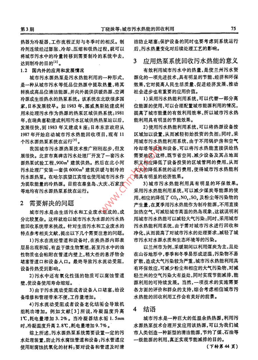 第26卷第3期甘肅科技Vol.26 No.32010年2月Cansu Science and TechnologyFeb.2010城市污水熱能的回收利用丁曉妹,李向陽(yáng)(蘭州大學(xué)資源環(huán)境學(xué)院,甘肅蘭州70000)摘要:根據(jù)熱泵發(fā)展的情況,通過(guò)利用污水源熱泵系統(tǒng)回收城市污水中的低溫?zé)崮芤怨┎膳椭评渲玫墓?jié)能、經(jīng)濟(jì)、環(huán)保的效果分析,說(shuō)明應(yīng)用該系統(tǒng)不僅可以節(jié)省煤、石油等-級(jí)能源的需求,而且可以實(shí)現(xiàn)能源的回收利用。關(guān)鍵詞:城市污水;熱能;熱泵系統(tǒng);回收利用中國(guó)分類號(hào):X124隨著經(jīng)濟(jì)的快速增長(zhǎng),人口的不斷膨脹和社會(huì)事業(yè)的不斷進(jìn)步,我國(guó)面臨著能源危機(jī)和環(huán)境污染1污水源熱泵系統(tǒng)破壞難題。今天的中國(guó)已經(jīng)達(dá)到GDP人均1000美所謂污水源熱泵就是以人工再生水,如城市污元的小康目標(biāo),按照預(yù)定的經(jīng)濟(jì)發(fā)展目標(biāo),2020年水為水源的既可供熱又可制冷的搞笑空調(diào)節(jié)能系將全面實(shí)現(xiàn)小康,達(dá)到中等發(fā)達(dá)國(guó)家的水平,人均統(tǒng)。 它是水源熱泵的一-種。以城市污水為熱源的熱CDP10000美元。從其他發(fā)達(dá)國(guó)家的發(fā)展歷程來(lái)泵可以按照用途熱量輸出、熱源類型和驅(qū)動(dòng)形式等看,GDP達(dá)到10000美元時(shí)能源消耗量是人均標(biāo)準(zhǔn)分為不同類型的泵,這里就不贅述了。油4Va,折合標(biāo)準(zhǔn)煤5.6Va。這樣到2020年我國(guó)人1.1 原理口達(dá)到15億,將需要標(biāo)準(zhǔn)油60億t,折合標(biāo)準(zhǔn)煤84在城市污水熱能回收利用系統(tǒng)中通常采用壓縮億,這是世界目前能源生產(chǎn)能力的60% ,是一個(gè)無(wú)式熱泵。其組成和工作原理,如圖1所示。論如何也不能達(dá)到的目標(biāo)”。2005年,國(guó)家主席胡錦濤強(qiáng)調(diào)加強(qiáng)可再生能源■開(kāi)發(fā)利用是應(yīng)對(duì)日益嚴(yán)重的能源和環(huán)境問(wèn)題的必由之路,也是人類社會(huì)實(shí)現(xiàn)可持續(xù)發(fā)展的必由之路。人們?cè)诒Wo(hù)和利用好現(xiàn)有能源的基礎(chǔ)上,正努力尋找新能源的出路。以蘭州市為例, 2009年2月26日在甘肅省召開(kāi)的市政府常務(wù)會(huì)議上明確提出蘭州市今年實(shí)施節(jié)能減排類工程10項(xiàng),估算投資約為口==>謝橫13億,占當(dāng)年投資總額的26%,以提高城市污水處圍1污水源熱泵工作原理理率和增加城市污水處理廠為提高能源利用率的主冬季工作時(shí),第一換熱器為冷凝器,第二換熱器要內(nèi)容,切實(shí)把國(guó)家規(guī)定落向?qū)嵦?。為蒸發(fā)器。城市污水流人蒸發(fā)器時(shí)將放出其賦存的據(jù)文獻(xiàn)[2],目前,供給城市的能量大部分最終熱量,同時(shí)制冷劑在蒸發(fā)器中蒸發(fā)吸收熱量,所產(chǎn)生都被作為廢熱排到大氣或河海中。這些廢熱中大部的蒸汽被壓縮機(jī)吸入并壓縮至較高壓力進(jìn)人冷凝分是50以下的低溫廢熱,但熱量很大。在尚未有器,制冷劑蒸汽在冷凝器中冷凝,同時(shí)放出熱量并加效利用的低溫能源中,城市污水因-年四季溫度變熱熱媒(水)的溫度,滿足供熱系統(tǒng)的需要,液態(tài)制化小,數(shù)量穩(wěn)定,具有冬暖夏涼的溫度特性,而且賦冷劑進(jìn)入膨脹閥,進(jìn)行絕熱膨脹,對(duì)外做功,使其達(dá)存著大量熱量,易于通過(guò)城市污水管道進(jìn)行收集。到很低的溫度,又進(jìn)入蒸發(fā)器,從城市污水中吸收其因此,被認(rèn)為是可回收利用的清潔能源。為此,我們賦存的熱量進(jìn)行下- -輪循環(huán)。在該系統(tǒng)中,制冷劑期望蘭州市這個(gè)能源不算富裕的城市可以采用污水連續(xù)經(jīng)過(guò)吸熱、壓縮、冷卻、膨脹過(guò)程,就可以將城市熱能回用的方式實(shí)現(xiàn)真正的節(jié)能減排。污水中的熱量轉(zhuǎn)移到需要供熱的系統(tǒng)中去,達(dá)到供熱目的。夏季工作時(shí),第- -換熱器為蒸發(fā)器,第二換第3期丁曉妹等:城市污水熱能的回收利用7熱器為冷凝器,工作流程正好與冬季時(shí)的相反。制潔防止堵塞;保護(hù)設(shè)備的同時(shí)也要考慮到系統(tǒng)運(yùn)行冷劑連續(xù)經(jīng)過(guò)膨脹、冷卻、壓縮和吸熱過(guò)程,就可以后,污水熱量變化對(duì)后續(xù)處理工藝的影響。將城市污水中的冷量轉(zhuǎn)移到需要制冷的系統(tǒng)中去,達(dá)到制冷的目的(2。3應(yīng)用熱泵 系統(tǒng)回收污水熱能的意義1.2國(guó)內(nèi)外的應(yīng)用和發(fā)展情況有效利用城市污水中的熱量,是使蘭州污水資城市污水源熱泵是污水熱能利用的- -種形式,源化的一項(xiàng)先進(jìn)技術(shù),具有明顯的節(jié)能、經(jīng)濟(jì)和環(huán)保是一種從城市污水等低品位熱源中提取熱量,將其效果,它對(duì)提高人民生活質(zhì)量、促進(jìn)經(jīng)濟(jì)發(fā)展、推動(dòng)轉(zhuǎn)換成高品位清潔能源,并向外提供供暖熱源空調(diào)社會(huì)進(jìn)步也有重要的應(yīng)用價(jià)值。冷源或生活熱水的熱泵系統(tǒng)。該系統(tǒng)在北歐很多國(guó)1)采用污水熱能利用系統(tǒng),可以代替一部分高家,日本發(fā)展較早。如1983年,揶威奧斯陸建成利位能源的使用,可以合理配置城市能源利用的情況,用未處理污水作為熱源的熱泵區(qū)域供熱系統(