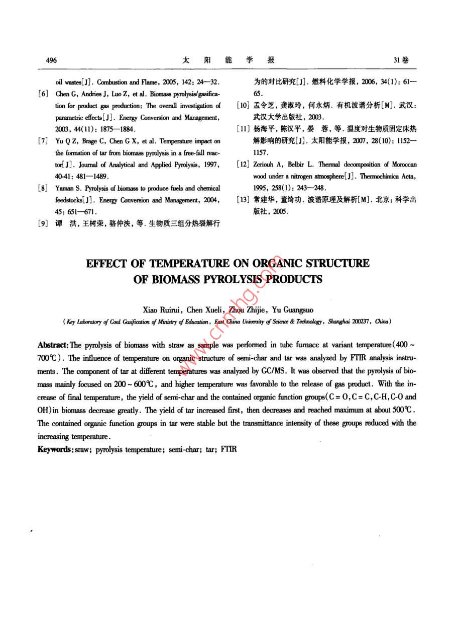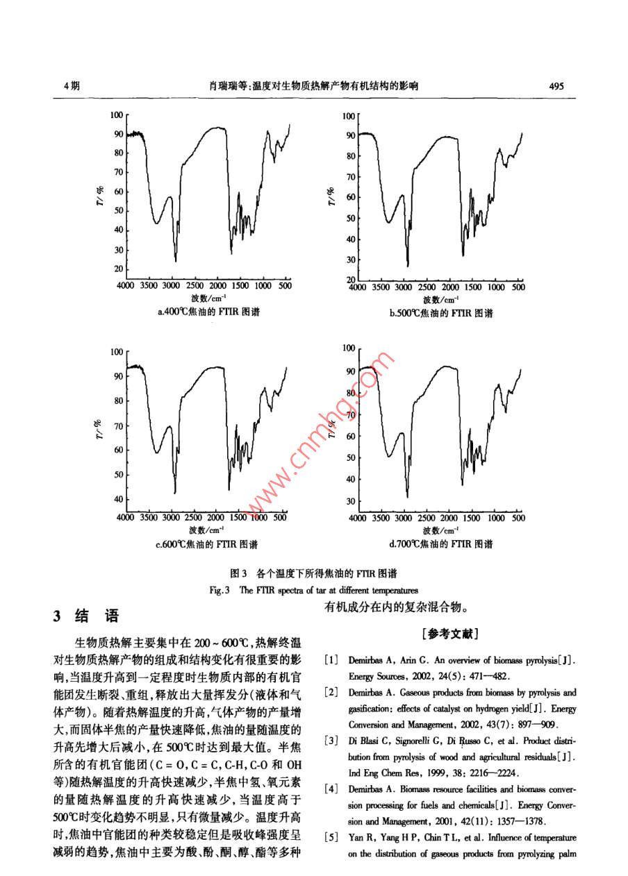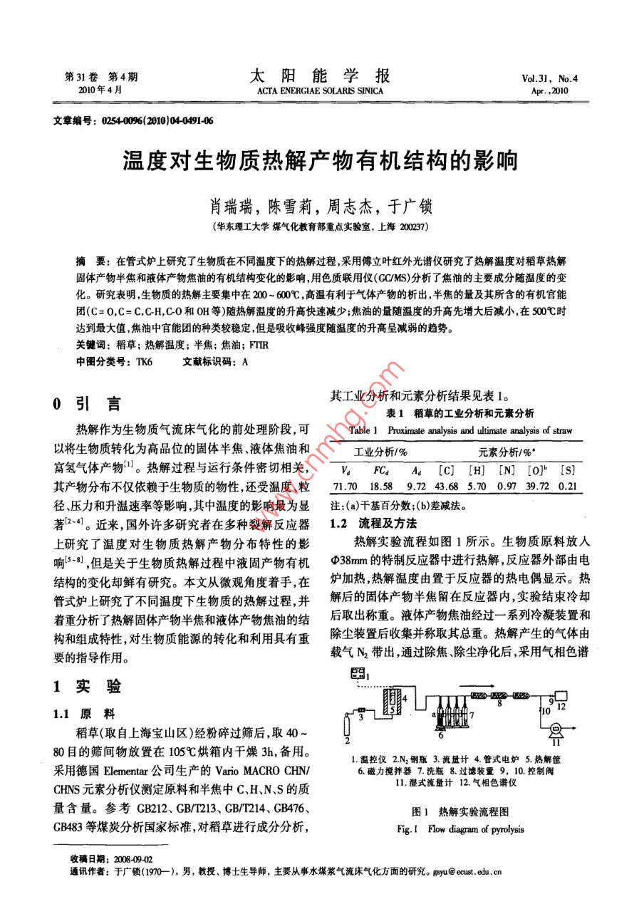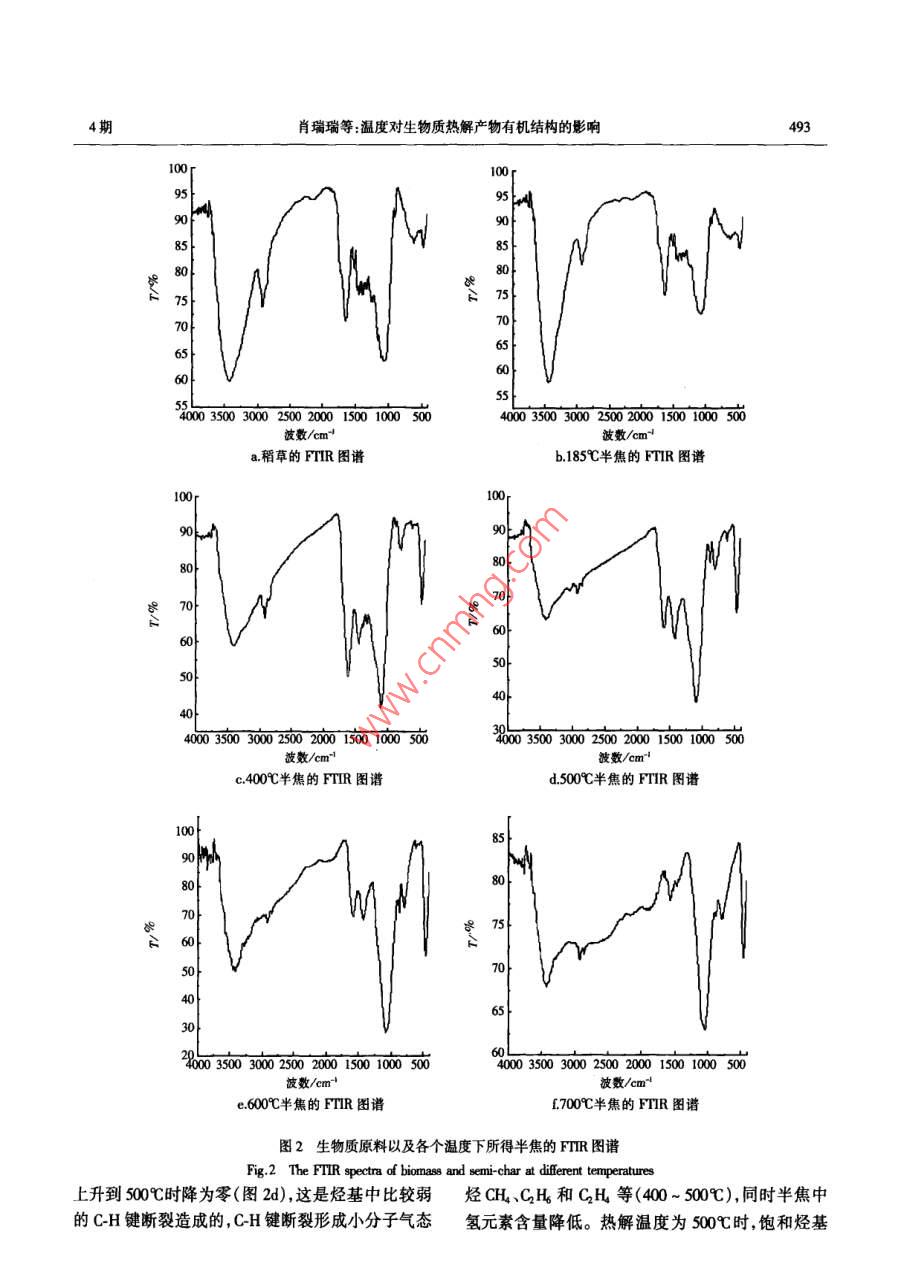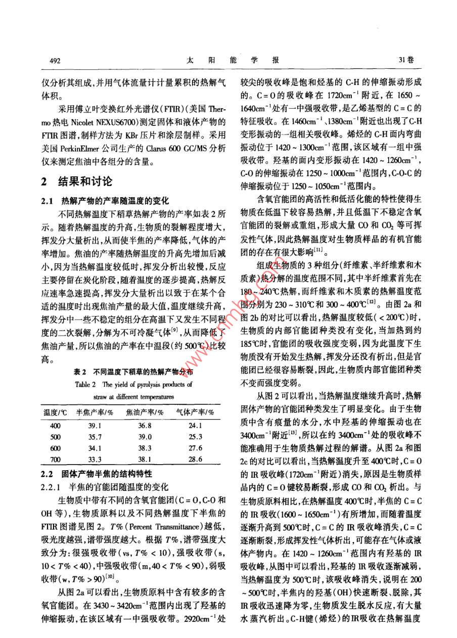 第31卷第4期太陽(yáng)能學(xué)報(bào)Vol 31, No 42010年4月ACTA ENERGIAE SOLARIS SINICA文章編號(hào):025406(2010)040491-6溫度對(duì)生物質(zhì)熱解產(chǎn)物有機(jī)結(jié)構(gòu)的影響肖瑞瑞,陳雪莉,周志杰,于廣鎖(華東理工大學(xué)煤氣化教育部重點(diǎn)實(shí)驗(yàn)室,上海20037)摘要:在管式爐上研究了生物質(zhì)在不同溫度下的熱解過(guò)程,采用傅立葉紅外光譜儀研究了熱解溫度對(duì)稻草熱解固體產(chǎn)物半焦和液體產(chǎn)物焦油的有機(jī)結(jié)構(gòu)變化的影響,用色質(zhì)聯(lián)用儀(cCMS)分析了焦油的主要成分隨溫度的變化。研究表明,生物質(zhì)的熱解主要集中在200~600℃,高溫有利于氣體產(chǎn)物的析出,半焦的量及其所含的有機(jī)官能團(tuán)(C=0,C=C,cH,CO和OH等)隨熱解溫度的升高快速減少;焦油的量隨溫度的升高先增大后減小,在500℃時(shí)達(dá)到最大值焦油中官能團(tuán)的種類較穩(wěn)定但是吸收峰強(qiáng)度隨溫度的升高呈減弱的趨勢(shì)。關(guān)鍵詞:稻草;熱解溫度;半焦;焦油;FIR中圖分類號(hào):TK6文獻(xiàn)標(biāo)識(shí)碼:A0引言其工業(yè)分析和元素分析結(jié)果見表1。表1稻草的工業(yè)分析和元素分析熱解作為生物質(zhì)氣流床氣化的前處理階段,可Table 1 Proximate analysis and ultimate analysis of straw以將生物質(zhì)轉(zhuǎn)化為高品位的固體半焦、液體焦油和工業(yè)分析/%元素分析/%富氫氣體產(chǎn)物”。熱解過(guò)程與運(yùn)行條件密切相關(guān),"vFCA4[(C][H][N][oy[s其產(chǎn)物分布不僅依賴于生物質(zhì)的物性,還受溫度粒717018.589.7243.685.700.939.720.21徑、壓力和升溫速率等影響,其中溫度的影響最為顯注:(a)干基百分?jǐn)?shù);(b)差減法著24。近來(lái)國(guó)外許多研究者在多種裂解反應(yīng)器1.2流程及方法上研究了溫度對(duì)生物質(zhì)熱解產(chǎn)物分布特性的影熱解實(shí)驗(yàn)流程如圖1所示。生物質(zhì)原料放入響,但是關(guān)于生物質(zhì)熱解過(guò)程中液固產(chǎn)物有機(jī)38m的特制反應(yīng)器中進(jìn)行熱解反應(yīng)器外部由電結(jié)構(gòu)的變化卻鮮有研究。本文從微觀角度著手,在爐加熱,熱解溫度由置于反應(yīng)器的熱電偶顯示。熱管式爐上研究了不同溫度下生物質(zhì)的熱解過(guò)程,并解后的固體產(chǎn)物半焦留在反應(yīng)器內(nèi)實(shí)驗(yàn)結(jié)束冷卻著重分析了熱解固體產(chǎn)物半焦和液體產(chǎn)物焦油的結(jié)后取出稱重。液體產(chǎn)物焦油經(jīng)過(guò)一系列冷凝裝置和構(gòu)和組成特性,對(duì)生物質(zhì)能源的轉(zhuǎn)化和利用具有重除塵裝置后收集并稱取其總重。熱解產(chǎn)生的氣體由要的指導(dǎo)作用。載氣N2帶出,通過(guò)除焦除塵凈化后,用氣相色譜1實(shí)驗(yàn)個(gè)國(guó)1.1原料稻草(取自上海寶山區(qū))經(jīng)粉碎過(guò)篩后,取80目的篩間物放置在105℃烘箱內(nèi)干燥3h,備用。1.溫控儀2N2鋼瓶3.流量計(jì)4.管式電爐5.熱解筐采用德國(guó) Elementar公司生產(chǎn)的 Vario MACRo ChN6磁力攪拌器7洗瓶8.過(guò)濾裝量9,10.控制閥CHs元素分析儀測(cè)定原料和半焦中C、H、NS的質(zhì)l1濕式流量計(jì)12.氣相色譜儀量含量。參考GB212、GB/T2l3、CB/T214、CB476、圖1熱解實(shí)驗(yàn)流程圖GB483等煤炭分析國(guó)家標(biāo)準(zhǔn),對(duì)稻草進(jìn)行成分分析Fig. I Flow diagram of pyrolysis收稿日期:20080902通訊作者:于廣鎖(1900),男,教授、博士生導(dǎo)師,主要從事水煤漿氣流床氣化方面的研究。gyu@eus,t492太陽(yáng)能學(xué)報(bào)31卷儀分析其組成,并用氣體流量計(jì)計(jì)量累積的熱解氣較尖的吸收峰是飽和烴基的CH的伸縮振動(dòng)形成體積。的。C=0的吸收峰在1720cm-附近,在1650~采用傅立葉變換紅外光譜儀(FTHR)(美國(guó)Ther1640cm處有一中強(qiáng)吸收帶,是乙烯基型的C=C的mo熱電 Nicolet neXUs6700測(cè)定固體和液體產(chǎn)物的特征吸收。在1460cm1、1380cm2附近也出現(xiàn)了CHFTIR圖譜,制樣方法為KBr壓片和涂層制樣。采用變形振動(dòng)的一組相關(guān)吸收峰。烯烴的CH面內(nèi)彎曲美國(guó) PerkinElmer公司生產(chǎn)的cans600cCMS分析振動(dòng)位于140~1300cm范圍,該區(qū)域有一組中強(qiáng)儀來(lái)測(cè)定焦油中各組分的含量。吸收帶。羥基的面內(nèi)變形振動(dòng)在1420~1260cmCO的伸縮振動(dòng)在1250-1000m1范圍內(nèi),COC的2結(jié)果和討論伸縮振動(dòng)位于1250~1060cm范圍內(nèi)。21熱解產(chǎn)物的產(chǎn)率隨溫度的變化含氧官能團(tuán)的高活性和低活化能的特性使得生不同熱解溫度下稻草熱解產(chǎn)物的產(chǎn)率如表2所物質(zhì)在低溫下較容易熱解并且低溫下不穩(wěn)定含氧示。隨著熱解溫度的升高生物質(zhì)的裂解程度增大,官能團(tuán)的裂解或重組,形成大量CO和CO2等可揮揮發(fā)分大量析出,從而使半焦的產(chǎn)率降低,氣體的產(chǎn)發(fā)性氣體,因此熱解溫度對(duì)生物質(zhì)樣品的有機(jī)官能率增加。焦油的產(chǎn)率隨熱解溫度的升高先增加后減團(tuán)的存在有很大影響小,因?yàn)楫?dāng)熱解溫度較低時(shí),揮發(fā)分析出較慢,反應(yīng)組成生物質(zhì)的3種組分(纖維素、半纖維素和木主要停留在炭化階段隨著溫度的逐步提高熱解反質(zhì)素)熱分解的溫度范圍不同其中半纖維素首先在應(yīng)速率急速提高,揮發(fā)分大量析出以致于在某個(gè)合180~2
