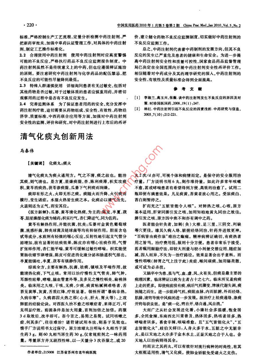 ●220●中國實(shí)用醫(yī)藥2010年1月第5卷第2期Chine Pme Med,Jan 2010.Val.5,No.2標(biāo)準(zhǔn),嚴(yán)格控制生產(chǎn)工藝流程,定量分析檢測中藥注射劑、嚴(yán)價(jià),建立健全藥物不良反應(yīng)監(jiān)測制度,切實(shí)做好中藥注射劑的把新藥審批關(guān),加強(qiáng)中草藥認(rèn)證管理工作,對具體的中藥注射不良反應(yīng)監(jiān)測工作。劑,制定工藝操作標(biāo)準(zhǔn)化??傊?中藥注射劑代表著中藥制劑的發(fā)展方向,但其不良2.2 合理使用中藥注射劑 使用中藥注射劑時(shí)應(yīng)高度警惕反應(yīng)的發(fā)生已嚴(yán)重危及患者的健康和生命安全。為進(jìn)- -步提可能的不良反應(yīng),嚴(yán)格執(zhí)行藥品不良反應(yīng)監(jiān)測報(bào)告制度。中高中藥注射劑安全性和質(zhì)量可控性,國家食品藥品監(jiān)督管理藥注射劑雖然不是傳統(tǒng)意義上的中藥,但也應(yīng)遵循辨證施治局已決定在全國范圍內(nèi)開展中藥注射劑安全性再評價(jià)工作。的原則。要注意研究中藥注射劑與化學(xué)藥品的配伍禁忌,把相信隨著對中藥成分及其藥理學(xué)研究的深入,中藥注射劑的不良反應(yīng)的可能性盡量降到最低。安全性有效性及質(zhì)量標(biāo)準(zhǔn)會(huì)得到全面提高。2.3特殊人群謹(jǐn)慎使用詳細(xì)詢問患者有 無過敏史,包括對參考文獻(xiàn)其他藥物是否過敏,對于過敏體質(zhì)的患者應(yīng)慎重用藥,并密切觀察用藥過程中是否有不良反應(yīng)發(fā)生。[1]李淑蘭,高玉興 ,張薇.談中藥注射劑發(fā)生不良反應(yīng)的原因及對2.4完善監(jiān)測體系為了保證患者用藥的安全,充分發(fā)揮中策.時(shí)珍國醫(yī)國藥,2008 ,19(1) :247.藥注射劑療效,迫切需要從藥物組成、安全性、有效性、藥物經(jīng)[2] 林紅。中藥注射劑引起不良反應(yīng)的因素淺析.中藥研究與信息,2005 ,7(10) :212-221.濟(jì)學(xué)、質(zhì)量標(biāo)準(zhǔn)、中西藥聯(lián)合應(yīng)用等方面,加強(qiáng)對中藥注射劑安全性的監(jiān)測、評價(jià)和研究,對中藥注射劑進(jìn)行上市后的再評清氣化痰丸創(chuàng)新用法馬舂偉[關(guān)鍵詞]化痰丸;痰火清氣化痰丸為痰火通用方。氣之不清,痰之故也。能治丸2次/d亦可,可視個(gè)體和病情而定。是保守的安全服用治其痰,則氣清也。是方夏.星燥痰濕,杏、陳利痰滯,枳實(shí)攻痰療量。廠方說明書用6丸,則作維持量。如此許多常年咳嗽積,黃芩消痰熱,茯苓滲痰濕,瓜蔞下氣利痰而潤燥。不愈,甚或哮喘患者有希望得到方便高效的治愈了。試用二痰即有形之火,火即無形之痰。痰隨火而升降,火引痰而瓶即便有滿意效果。凡見痰黃,苔黃者放心用之。受涼痰白、橫行,變生諸癥。水濕火熱皆生痰之本?;当匾郧鍤鉃橄?,苔白則暫停之?;鹜藙t還為正氣,而安其位。擴(kuò)而充之“五臟皆能令人咳”。對肺熱之咳,心咳,原方《醫(yī)方新解》:瓜菱,黃芩清化熱痰,為主藥;陳皮、半夏、茯基本適用,肝腎同源引發(fā)之咳,加用知柏地黃丸同治之效佳。苓、膽星燥濕化痰為輔藥;枳實(shí)行氣,杏仁降逆氣,同為佐藥。脾引發(fā)之咳,原方因中焦不和亦有調(diào)中之藥。黃芩有解熱作用,并能抗菌抗炎;瓜蔞對金黃色葡萄球醫(yī)者能會(huì)針灸者,加刺(灸)大椎、足三里、三陰交、列鋏菌,流感桿菌肺炎球菌及鏈球菌等均有抑制作用。膽星含皂等穴更佳。 緣其久病人絡(luò),臟俯經(jīng)絡(luò)同治,針?biāo)幉⑦M(jìn)效更神。甙等成分,水煎劑有輕微的咽心反應(yīng),反射性地引起支氣管分“百病皆由痰作祟"難治之癲病。精神病辨證確切,有痰熱者泌增加,故有顯著的祛痰效果,陳皮亦有心祛痰作用,氣管用之皆當(dāng)。治療費(fèi)用低服用十分方便?;颊叻浅酚诮邮?擴(kuò)張樣作用,杏仁能平嚙,黃芩可緩解過敏性哮喘。枳實(shí)能使醫(yī)者囑用顛簸療法,即較大劑量與較小劑量交替應(yīng)用,隨癥加胃腸收縮節(jié)律增強(qiáng),陳皮可促進(jìn)消化液分泌和腸道積氣排出,減,因人而異,不失為-治療路徑。效果顯著會(huì)出乎意料。而半夏能鎮(zhèn)吐,半夏、茯苓有鎮(zhèn)靜作用。慢性咽喉(肺胃之氣上注于此)炎癥、喉間頑痰,加用錫類散,綜觀全方,主要有解熱,抗菌,祛痰,鎮(zhèn)咳及平喘作用,故或可成為必殺技。能清熱化痰,下氣止咳。常用以治療慢性支氣管炎,肺氣腫,又腦卒中為患,雖與氣、血、虛、風(fēng)、火有關(guān),但痰是最主要的耳源性眩暈,哮喘,腦血管意外等,及多見之慢性咽炎,扁桃體病理因素。臨床辨證以痰為主者占十之七六。臨床所見重病痰炎。臨床用之久咳,干咳,無痰,少痰,痰黃粘膩稠難略者,舌上走的更多。 即使病前沒有痰病后氣機(jī)驟變,津液代謝失調(diào),痰苔見黃厚,灰黃,舌質(zhì)紅絳,療效顯著。領(lǐng)悟所謂“暴病非熱,濁隨之而生。進(jìn)-步阻礙氣機(jī),痰阻血脈,內(nèi)而臟腑,外而經(jīng)絡(luò)、久病非寒"。久病都因火熱之邪(心火、肝火、胃火等),上攻肌腠,清竅導(dǎo)致中風(fēng)病的進(jìn)一步發(fā)展。 故治療上祛痰通絡(luò)、滌痰肺臟的經(jīng)驗(yàn)論訣。對西醫(yī)久治不愈之咳嗽癥者,來得正巧,可開竅每獲良效。是“痰化,竅自開,絡(luò)自通,風(fēng)自消?!币娒黠@療效。前提條件是加大用量,首劑加倍之加倍。藥服大而廣之從社會(huì)發(fā)展進(jìn)化看,小康社會(huì)多溫暖,
