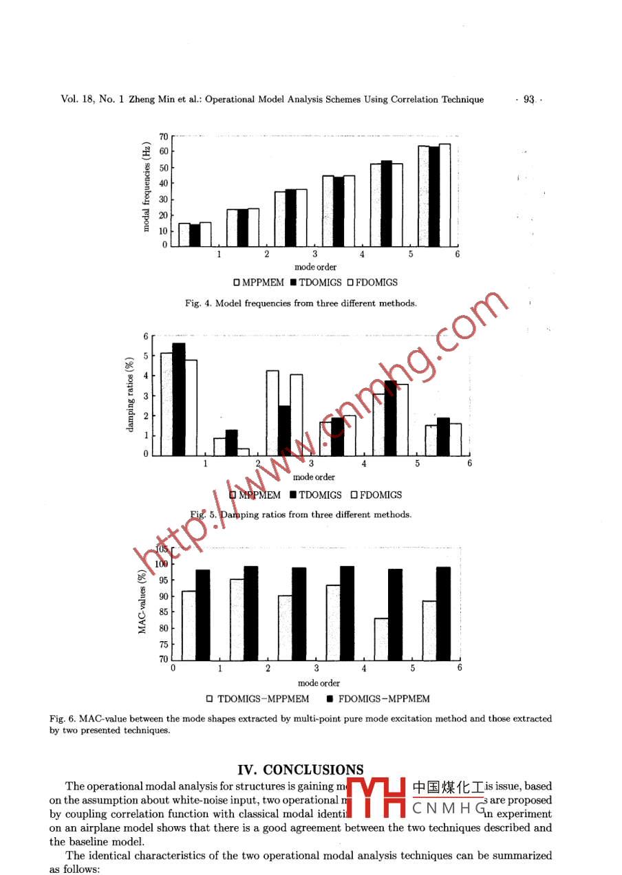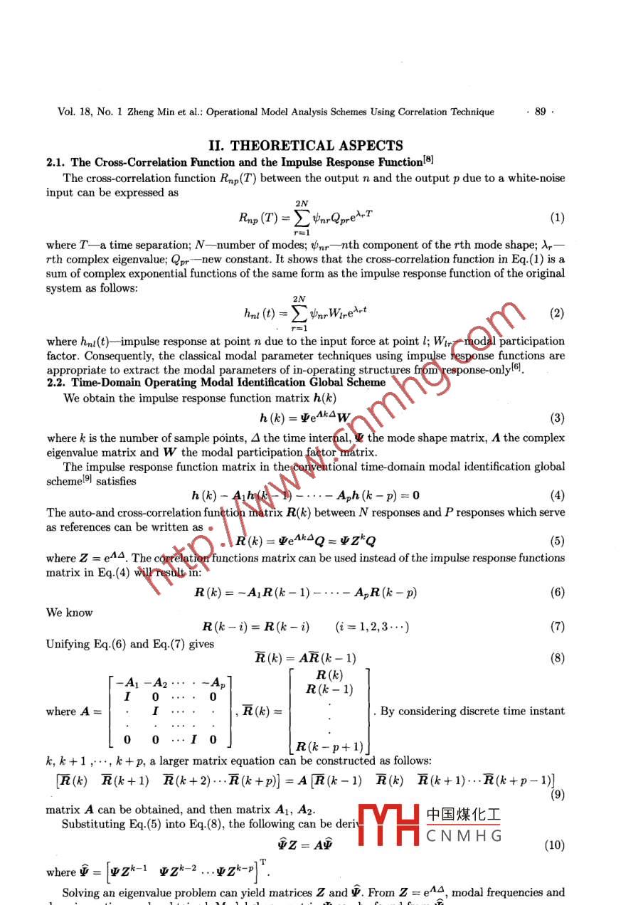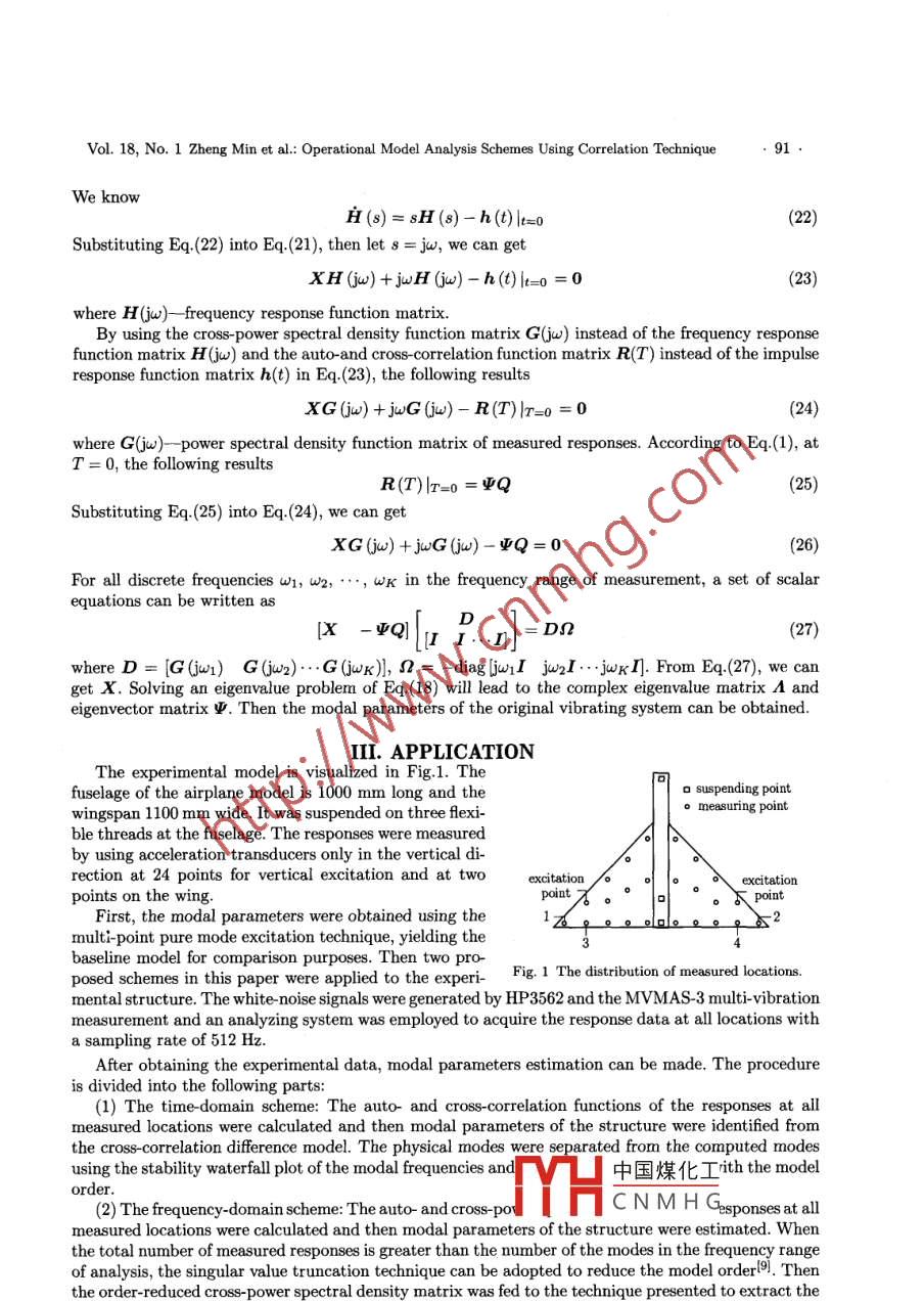 Acta Mechanica Solida Sinica, Vol. 18, No. 1, March, 2005ISSN 0894-9166Published by AMSS Press, Wuhan, China. DOI: 10.1007/s10338-005-0513-4OPERATIONAL MODAL ANALYSIS SCHEMES USINGCORRELATION TECHNIQUE*Zheng Min'Shen Fan2Chen Huaibai2(I College of Civil Aviation, Nanjing University of Aeronautics and Astronautics, Nanjing 210016, China)(2 Institute of Vibration Engineering Research, Nanjing University of Aeronautics and Astronautics,Nanjing 210016, China)Received 3 March 2004; revision received 1 November 2004ABSTRACT, For some large -scale engineering structures in operating conditions, modal param-eters estimation must base itself on response-only data. This problem has received a considerableamount of attention in the past few years. It is well known that the cross- correlation functionbetween the measured responses is a sum of complex exponential functions of the same form as theimpulse response function of the original system. So this paper presents a time domain operatingmodal identifcation global scheme and a frequency-domain scheme from output-only by cou-pling the cross- correlation function with conventional modal parameter estimation. The outlinedtechniques are applied to an airplane model to estimate modal parameters from response-onlydata.KEY WORDS modal analysis, operating mode, global identifcation, cross correlationI. INTRODUCTIONRecently, the problem about operating modal analysis (OMA) has gained more and more attention.For example, the EUROKE project SINOPSYS is designed to investigate in-operation modal identifi-cation for some structures such as offshore structures, bridges, aeroengines excited by wind, waves, ortraffic. Early in the development of approaches to estimating modal parameters from output-only data,there were peak picking from power spectral density (PSD) functions1l autoregressive moving average(ARMA) models[2, ITD/ random decrement processing[3), maximum entropy method (MEM)|4] andOperational Delection Shapes (ODS)5. In 1995, James and Carne working at Sandia National Labo-ratory of America put forward the concept of Natural Excitation Technique (NExT)6, which meansidentifying the modal parameters of large -scale structures in operating conditions with the unknowninputs. They applied the technique to a running wind turbine and presented some time-domain modalidentification schemes using cross-correlation functions instead of impulse response functions. The sub-space techniques71 have been used to identify modal parame中國煤化工e data in recentyears. Two operating modal identification global schemes (=d in this paper.One is done in the time domain and the other in frequencyfY;CNMHG* Project supported by the National Natural Science Foundation of China (No. 50205012), Aeronautics Foundation(No. 01152059) and Civil Aviation Foundation (No.1007-272001).Vol. 18, No. 1 Zheng Min et al: Operational Model Analysis Schemes Using Correlation TechniqueII. THEORETICAL ASPECTS2.1. The Cross-Correlation Function and the Impulse Response Function[8]The cross-correlation function Rnp(T) between the output n and the output p due to a white noiseinput can be expressed as2NRmp(T)= >vhrQpre>rTr=1where T- a time separation; N- number of modes; ψnr- -nth component of the rth mode shape; λr-rth complex eigenvalue; Qpr- new constant. It shows that the cross-correlation function in Eq.(1) is asum of complex exponential functions of the same form as the impulse response function of the originalsystem as follows:hni(t)= > ynrWire^rt(2)where hn(t)- -impulse response at point n due to the input force at point l; Wir- -modal participationfactor. Consequently, the classical modal parameter techniques using impulse response functions areappropriate to extract the modal parameters of in- operating structures from response -onlyl6I.2.2. Time-Domain Operating Modal Identification Global SchemeWe obtain the impulse response function matrix h(k)h(k) =④e4k^w3)where k is the number of sample points, 0 the time internal,亞the mode shape matrix, A the complexeigenvalue matrix and w the modal participation factor matrix.The impulse response function matrix in the conventional time -domain modal identifcation globalscbemel9] satisfiesh(k)- Alh(k-1)-...- Aph(k-p)=0(4)The auto and cross- correlation function matrix R(k) between N responses and P responses which serveas references can be written asR(k)= e4k^Q=業(yè)z*Q .5)where Z = eA0. The correlation functions matrix can be used instead of the impulse response functionsmatrix in Eq.(4) will result in:R(k)=-AiR(k-1)-...- ApR(k-p)(6)We knowR(k-i)=R(k-i)(i= 1,2,3..)(7)Unifying Eq.(6) and Eq.(7) givesR(k)= AR(k- 1)(8)R(k)-Ap 1R(k- 1) .where A =, R(k) =. By considering discrete time instantR(k-p+ 1)k,k+1 ,..k + p, a larger matrix equation can be constructed as follows:[原(k) R(k+1) R(k+2)..R(k+明=A[甌(k-1) R(k) (R(+1)..R(k+p-1)](9)matrix A can be obtained, and then matrix A1, A2.中國煤化工Substituting Eq.(5) into Eq.(8), the following can be deriv= A亞MYHCNMHG(10)where重= [ψzk-1業(yè)z*-2 .z2-2.Solving an eigenvalue problem can yield matrices Z and業(yè). From Z = eAo, modal frequencies anddampingratios can be obtained. Modal shape matrix業(yè)can be found from亞ACTA MECHANICA SOLIDA SINICA20052.3. The Cross-Power Spectral Density Function and the Frequency Response FunctionThe Fourier transform of the impulse response function hni(t) in Eq.(2) can be performed, then thefrequency response function Hnl(jw) can be expressed as follows:Hn(jw)='2NynrWr(11)The cross power spectral density function Gnp(jw) is the Fourier transform of the cross-correlationfunctionRnp(T) in Eq.(1), and can be expressed asVnrQprGnp(jw)=2jw- λ(12)It can be easily shown that the cross- power spectral density function in Eq.(12) is a sum of fractionfunctions that is of the same form as the frequency response function in Eq.(11). Consequently, thecross- power spectral density functions between responses can be used to estimate modal parametersfrom o