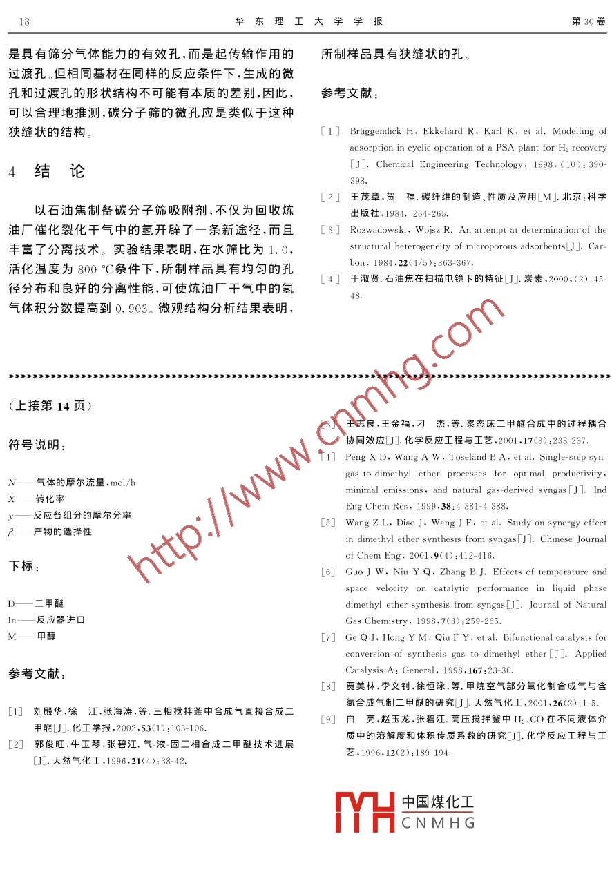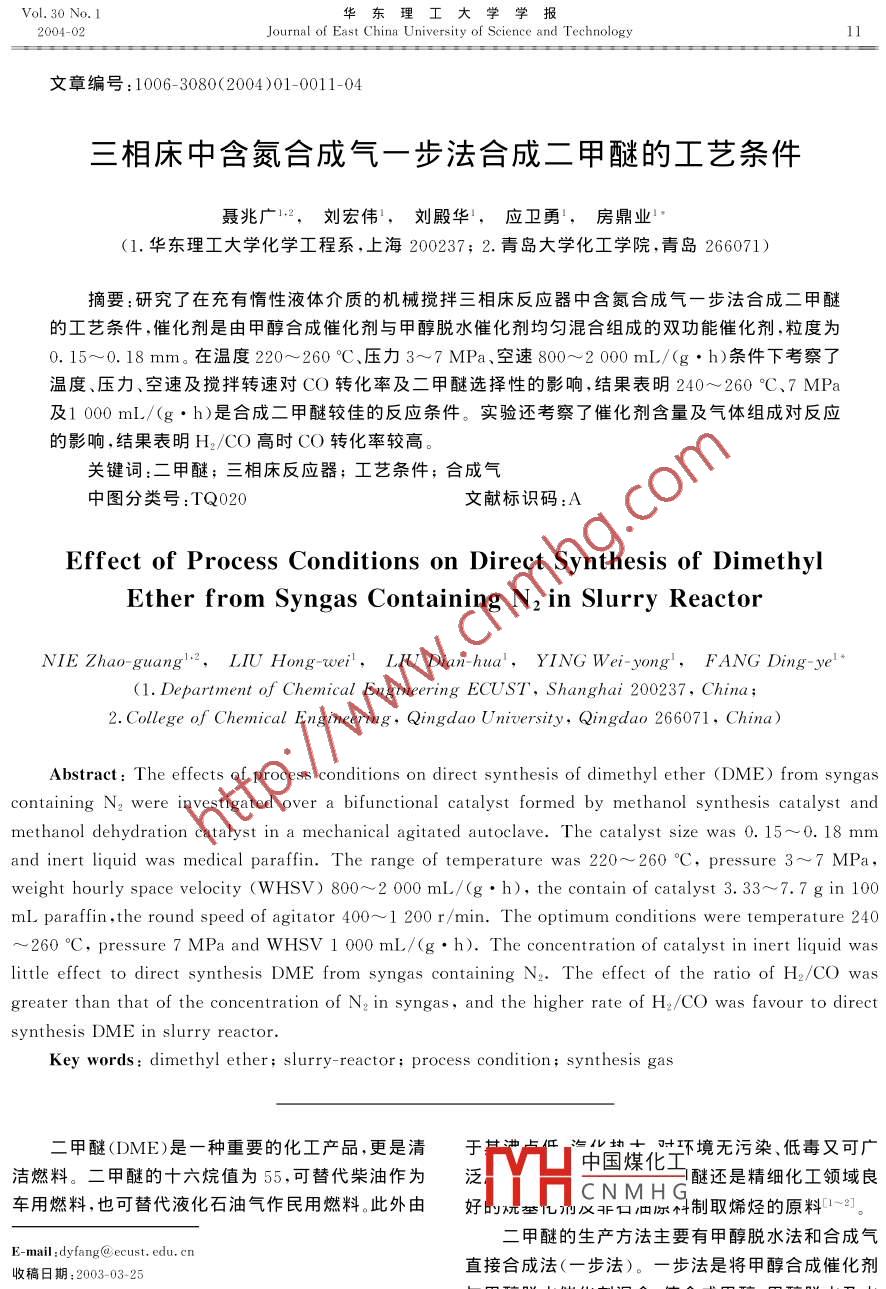 Vol. 30 No. I華東理工大學(xué)學(xué)報(bào)2004-02Journal of East China University of Science and Technology文章編號(hào):1006-3080(2004)01-0011-04三相床中含氮合成氣一步法合成二甲醚的工藝條件聶兆廣劉宏偉,劉殿華,應(yīng)衛(wèi)勇,房鼎業(yè)(1.華東理工大學(xué)化學(xué)工程系,上海200237;2.青島大學(xué)化工學(xué)院,青島266071)摘要:研究了在充有惰性液體介質(zhì)的杋械攪拌三相床反應(yīng)器中含氮合成氣一步法合成二甲醚的工藝條件,催化劑是由甲醇合成催化劑與甲醇脫水催化劑均勻混合組成的雙功能催化劑,粒度為0.15~0.18mm。在溫度220~260℃、壓力3~7MPa、空速800~2000mL/(g·h)條件下考察了溫度、壓力、空速及攪拌轉(zhuǎn)速對CO轉(zhuǎn)化率及二甲醚選擇性的影響,結(jié)果表明240~260℃C、7MP及1000mL/(g·h)是合成二甲醚較佳的反應(yīng)條件。實(shí)驗(yàn)還考察了催化劑含量及氣體組成對反應(yīng)的影響,結(jié)果表明H2CO高時(shí)CO轉(zhuǎn)化率較高關(guān)鍵詞:二甲醚;三相床反應(yīng)器;工藝條件;合成氣中圖分類號(hào):TQ020文獻(xiàn)標(biāo)識(shí)碼Effect of Process Conditions on Direct Synthesis of DimethylEther from Syngas Containing N2 in Slurry ReactorNIE Zhao-guang. 2, LIU Hong-wei, LIU Dian-hua, YING Wei-yong, FANG Ding-ye'(1. Department of Chemical Engineering ECUST, Shanghai 200237, China;2. College of Chemical Engineering, Qingdao University, Qingdao 266071, China)Abstract: The effects of process conditions on direct synthesis of dimethyl ether (DME) from syngascontainerwere investigated over a bifunctional catalyst formed by methanol synthesis catalyst andmethanol dehydration catalyst in a mechanical agitated autoclave. The catalyst size was 0. 15-0. mmand inert liquid was medical paraffin. The range of temperature was 220--260C, pressure 3-7 MPweight hourly space velocity (WHSV)8002 000 mL/(g. h), the contain of catalyst 3. 33-7. 7 g in 100mL paraffin, the round speed of agitator 4001 200 r/min. The optimum conditions were temperature 240260C, pressure 7 MPa and WHSV 1 000 mL/(g. h). The concentration of catalyst in inert liquid waslittle effect to direct synthesis DME from syngas containing N2. The effect of the ratio of H2/CO wasgreater than that of the concentration of n, in syngas, and the higher rate of H2/CO was favour to directsynthesis DME in slurry reactor.Key words: dimethyl ether; slurry-reactor: process condition; synthesis gas二甲醚(DME)是一種重要的化工產(chǎn)品,更是清于沖盧點(diǎn)首鹽計(jì),時(shí)環(huán)境無污染、低毒又可廣潔燃料。二甲醚的十六烷值為55,可替代柴油作為泛,醚還是精細(xì)化工領(lǐng)域良車用燃料,也可替代液化石油氣作民用燃料。此外由好的況幾反年口原科制取烯烴的原料-21二甲醚的生產(chǎn)方法主要有甲醇脫水法和合成氣E-mail:dyfang@ecust.edu.cn收稿日期:2003-03-25直接合成法(一步法)。一步法是將甲醇合成催化劑作者簡介:聶兆廣(1968-),男,山東人,在職博土,研究方向:催化與與甲醇脫水催化劑混合,使合成甲醇、甲醇脫水及水反應(yīng)工程汽變換反應(yīng)同時(shí)進(jìn)行,優(yōu)點(diǎn)是及時(shí)移走甲醇合成反華東理工大學(xué)學(xué)報(bào)第30卷應(yīng)的產(chǎn)物,打破了甲醇合成過程中熱力學(xué)平衡的限式計(jì)算制,使合成氣有更高的轉(zhuǎn)化率。但是甲醇合成與脫水Xco =(Ninyco n- Nyco)/Ninyco兩個(gè)串聯(lián)的反應(yīng)均是強(qiáng)放熱反應(yīng),因此及時(shí)移走反Bp=2Nyp/(Nin yco應(yīng)熱,防止催化劑過熱失活變得特別重要在這一方/(Nin yco in - Nyco)面三相淤漿床反應(yīng)器由于存在大量導(dǎo)熱性能好、熱pp=/nyco in容大的惰性液相載體,便于及時(shí)移岀反應(yīng)熱并維持反應(yīng)器恒溫,因而三相淤漿床中合成二甲醚成為近幾年研究的熱點(diǎn){3-7。2結(jié)果與討論從合成氣的來源看主要分為煤基合成氣、天然氣基合成氣及其他合成氣。天然氣空氣催化氧化及以下就各種工藝條件對CO的轉(zhuǎn)化率及甲醇L及二甲醚兩種產(chǎn)物的選擇性的影響進(jìn)行討論。以煤為原料制得的半水煤氣是含氮合成氣,由于減少了空分裝置而大幅度降低了合成氣的成本。為了2.1催化劑含量的影響圖1是三相床中固體催化劑含量對反應(yīng)的影響減少含氮原料氣的循環(huán)壓縮功,需要較高的單程轉(zhuǎn)化率,為多聯(lián)產(chǎn)提供新途徑。本文就是研究三相於曲線,原料氣A,實(shí)驗(yàn)條件為7MPa、230℃、空速000mL/(g·h)、攪拌轉(zhuǎn)速10r/min。從圖1中漿床中含氮合成氣直接合成二甲醚的工藝條件對反可以看出.催化劑含量對CO轉(zhuǎn)化率影響不大,這是應(yīng)的影響。由于三相床使用的催化劑粒徑很小,基本消除了內(nèi)1實(shí)驗(yàn)部分?jǐn)U散,而氣液間的傳質(zhì)在一定條件下影響較大。在實(shí)驗(yàn)范圍內(nèi)操作條件相同的情況下,傳質(zhì)效果基本相實(shí)驗(yàn)用反應(yīng)器為500mL磁力攪拌高壓反應(yīng)同,所以催化劑含量對CO轉(zhuǎn)化率影響不大。同樣催釜悄性液相熱載體的正常沸點(diǎn)在290℃以上。所用化劑含量對于二甲醚和甲醇選擇性同樣影響也不0.15~0.18mm,然后按1:1(m:m)充分混合。催0.80.8化劑總質(zhì)量除考察催化劑含量影響外均為10g,惰性液相熱載體為300mL0.6催化劑用φ=0.05的氮?dú)浠旌蠚膺M(jìn)行還原活04化,升溫速率小于0.5°C/min并在180℃恒溫10cO0.4h,在230℃恒溫5h,然后在實(shí)驗(yàn)溫度下切換成原料氣進(jìn)行反應(yīng)0實(shí)驗(yàn)所用原