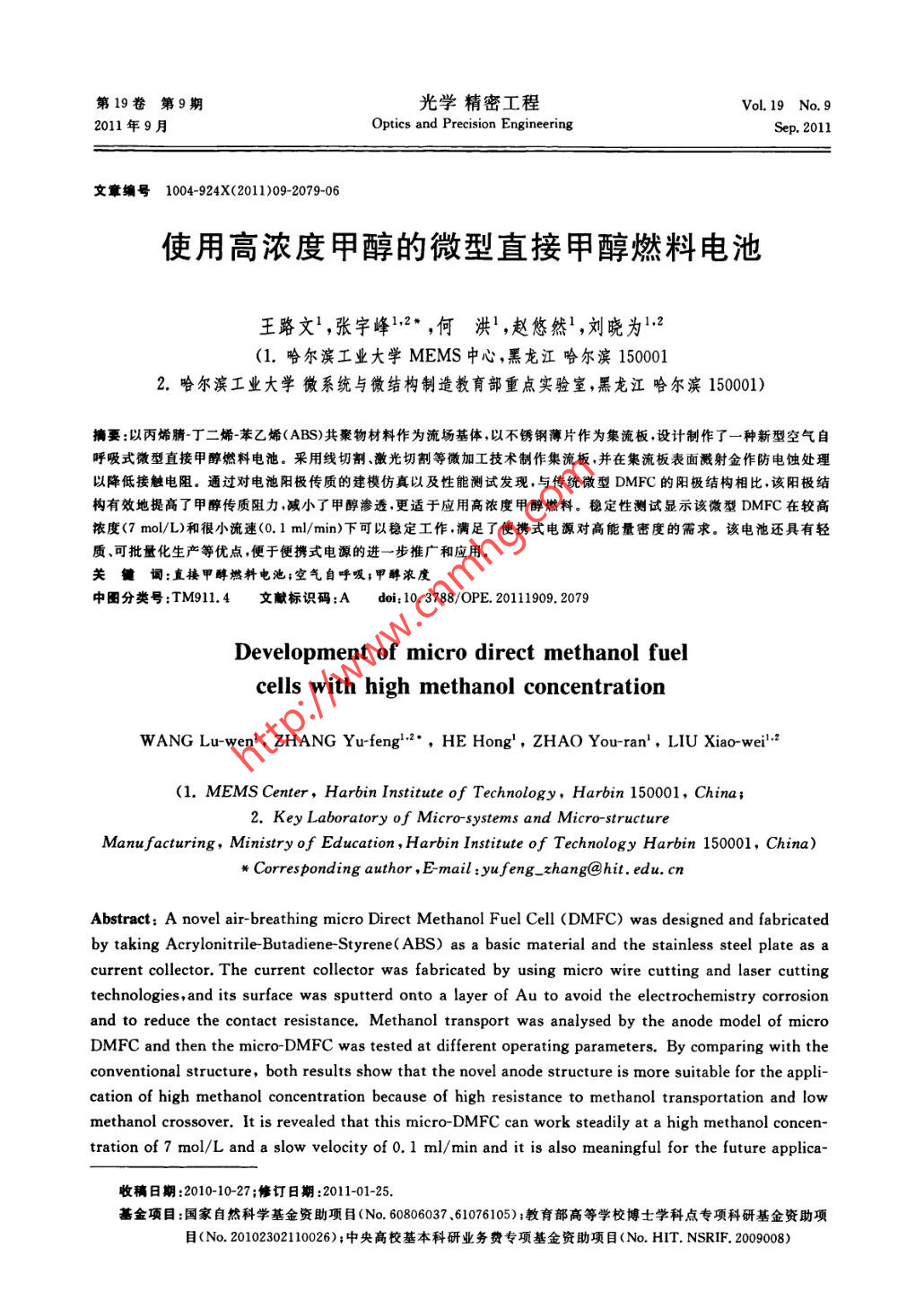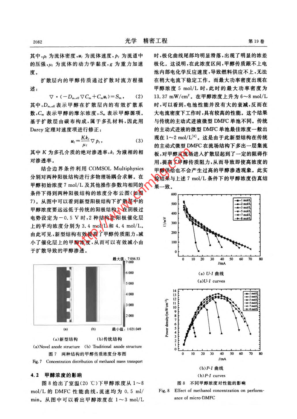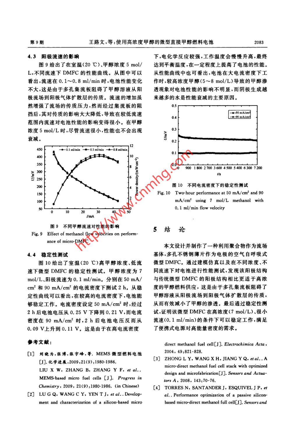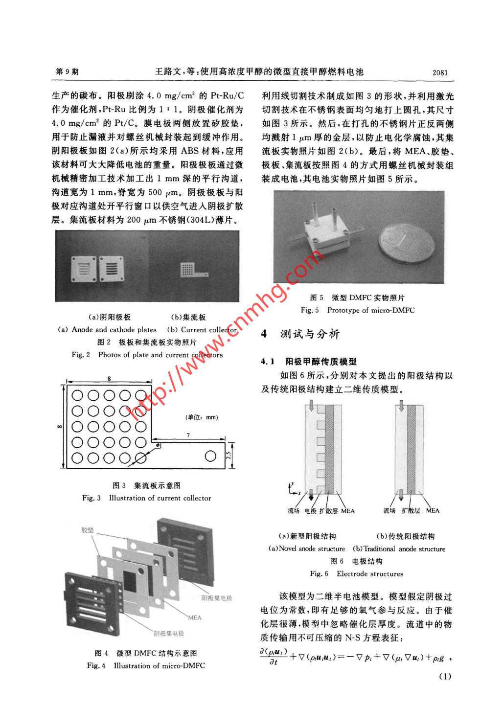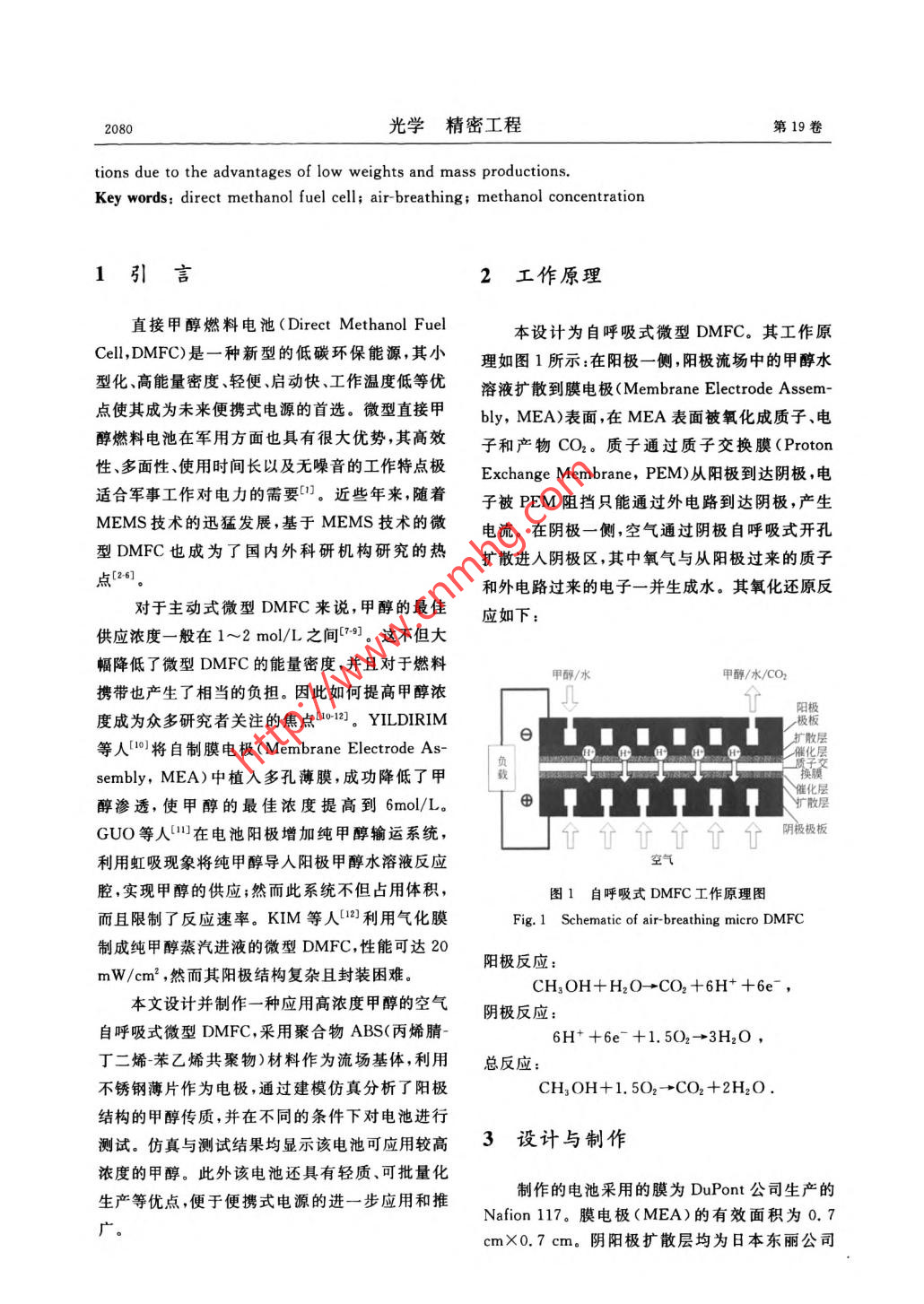 第19卷第9期光學(xué)精密工程Vol.19 No. 92011年9月Optics and Precision EngineeringSep. 2011文章編號(hào)1004-924X(2011)09-2079-06使用高濃度甲醇的微型直接甲醇燃料電池王路文',張宇峰1.2*,何洪',趙悠然',劉 曉為1.,2(1. 哈爾濱工業(yè)大學(xué)MEMS中心,黑龍江哈爾濱1500012.哈爾濱工業(yè)大學(xué)微系統(tǒng)與微結(jié)構(gòu)制造教育部重點(diǎn)實(shí)驗(yàn)室,黑龍江哈爾濱150001)摘要:以丙烯腈~丁二烯=苯乙烯(ABS)共聚物材料作為流場(chǎng)基體,以不銹鋼薄片作為集流板,設(shè)計(jì)制作了一種新型空氣自呼吸式微型直接甲醇燃料電池。采用線切割、激光切割等微加工技術(shù)制作集流板,并在集流板表面濺射金作防電蝕處理以降低接觸電阻。通過(guò)對(duì)電池陽(yáng)極傳質(zhì)的建模仿真以及性能測(cè)試發(fā)現(xiàn),與傳統(tǒng)微型DMFC的陽(yáng)極結(jié)構(gòu)相比.該陽(yáng)極結(jié)構(gòu)有效地提高了甲醇傳質(zhì)阻力,減小了甲醇滲透,更適于應(yīng)用高濃度甲醇燃料。穩(wěn)定性測(cè)試顯示該微型DMFC在較高依度(7 mol/L)和很小流速(0.1 ml/min) 下可以穩(wěn)定工作,滿足了便攜式電源對(duì)高能量密度的需求。該電池還具有輕質(zhì).可批量化生產(chǎn)等優(yōu)點(diǎn),便于便攜式電源的進(jìn)- -步推廣和應(yīng)用。關(guān)鍵詞:直接甲醇燃料電池;空氣自呼吸;甲醇濃度中圈分類號(hào):TM911.4文獻(xiàn)標(biāo)識(shí)碼:Adoi: 10. 3788/OPE.20111909.2079Development of micro direct methanol fuelcells with high methanol concentrationWANG Lu-wen',ZHANG Yu-feng'2° ,HE Hong',ZHAO You-ran' ,LIU Xiao-weil2(1. MEMS Center, Harbin Institute of Technology, Harbin 150001 ,China;2. Key Laboratory of Micro-systems and Micro-structureManufacturing, Ministry of Education , Harbin Institute of Technology Harbin 150001, China)* Corresponding author , E-mail :yufeng- _xhang@hit. edu. cnAbstract: A novel air- breathing micro Direct Methanol Fuel Cell (DMFC) was designed and fabricatedby taking Acrylonitrile Butadiene-Styrene(ABS) as a basic material and the stainless steel plate as acurrent collector. The current collector was fabricated by using micro wire cutting and laser cuttingtechnologies,and its surface was sputterd onto a layer of Au to avoid the electrochemistry corrosionand to reduce the contact resistance. Methanol transport was analysed by the anode model of microDMFC and then the micro-DMFC was tested at different operating parameters. By comparing with theconventional structure, both results show that the novel anode structure is more suitable for the appli-cation of high methanol concentration because of high resistance to methanol transportation and lowmethanol crossover. It is revealed that this micro-DMFC can work steadily at a high methanol concen-tration of 7 mol/L and a slow velocity of 0.1 ml/min and it is also meaningful for the future applica-收稿日期:2010-10-27 ;修訂日期:2011-01-25.基金項(xiàng)目:國(guó)家自然科學(xué)基金資助項(xiàng)目(No.60806037.61076105);教育部高等學(xué)校博士學(xué)科點(diǎn)專項(xiàng)科研基金資助項(xiàng)目(No.20102302110026);中央高?;究蒲袠I(yè)務(wù)費(fèi)專項(xiàng)基金資助項(xiàng)目(No. HIT. NSRIF. 2009008).光學(xué)精密工程第19卷tions due to the advantages of low weights and mass productions.Key words: direct methanol fuel cell; air breathing; methanol concentration1引言2工作原理直接甲醇燃料電池(Direct Methanol Fuel本設(shè)計(jì)為自呼吸式微型DMFC。其工作原Cell,DMFC)是一種新型的低碳環(huán)保能源,其小理如圖1所示:在陽(yáng)極一側(cè),陽(yáng)極流場(chǎng)中的甲醇水型化、高能量密度、輕便、啟動(dòng)快、工作溫度低等優(yōu)溶液擴(kuò)散到膜電極( Membrane Electrode Assem-點(diǎn)使其成為未來(lái)便攜式電源的首選。微型直接甲bly, MEA)表面,在MEA表面被氧化成質(zhì)子、電醇燃料電池在軍用方面也具有很大優(yōu)勢(shì),其高效子和產(chǎn)物CO2。質(zhì)子通過(guò)質(zhì)子交換膜(Proton性、多面性、使用時(shí)間長(zhǎng)以及無(wú)噪音的工作特點(diǎn)極Exchange Membrane, PEM)從陽(yáng)極到達(dá)陰極,電適合軍事工作對(duì)電力的需要1]。近些年來(lái),隨著子被PEM阻擋只能通過(guò)外電路到達(dá)陰極,產(chǎn)生MEMS技術(shù)的迅猛發(fā)展,基于MEMS技術(shù)的微電流。在陰極一側(cè),空氣通過(guò)陰極自呼吸式開(kāi)孔型DMFC也成為了國(guó)內(nèi)外科研機(jī)構(gòu)研究的熱擴(kuò)散進(jìn)人陰極區(qū),其中氧氣與從陽(yáng)極過(guò)來(lái)的質(zhì)子點(diǎn)[26]。和外電路過(guò)來(lái)的電子- -并生成水。其氧化還原反對(duì)于主動(dòng)式微型DMFC來(lái)說(shuō),甲醇的最佳應(yīng)如下:供應(yīng)濃度一般在1~2 mol/L之間[7-]。這不但大幅降低了微型DMFC的能量密度,并且對(duì)于燃料甲醇/水甲醇/水/CO2 .攜帶也產(chǎn)生了相當(dāng)?shù)呢?fù)擔(dān)。因此如何提高甲醇濃個(gè)度成為眾多研究者關(guān)注的焦點(diǎn)(012]。YILDIRIM_θ極極等人[0)將自制膜電極(Membrane Electrode As-二瑞華姜sembly, MEA)中植人多孔薄膜,成功降低了甲載催化層醇滲透,使甲醇的最佳濃度提高到6mol/L.擴(kuò)散層GUO等人”在電池陽(yáng)極增加純甲醇輸運(yùn)系統(tǒng),」個(gè)個(gè)個(gè)個(gè)個(gè)個(gè)陰極極板利用虹吸現(xiàn)象將純甲醇導(dǎo)人陽(yáng)極甲醇水溶液反應(yīng)空氣腔,實(shí)現(xiàn)甲醇的供應(yīng);然而此系統(tǒng)不但占用體積,圖1自呼吸式DMFC工作原理圖而且限制