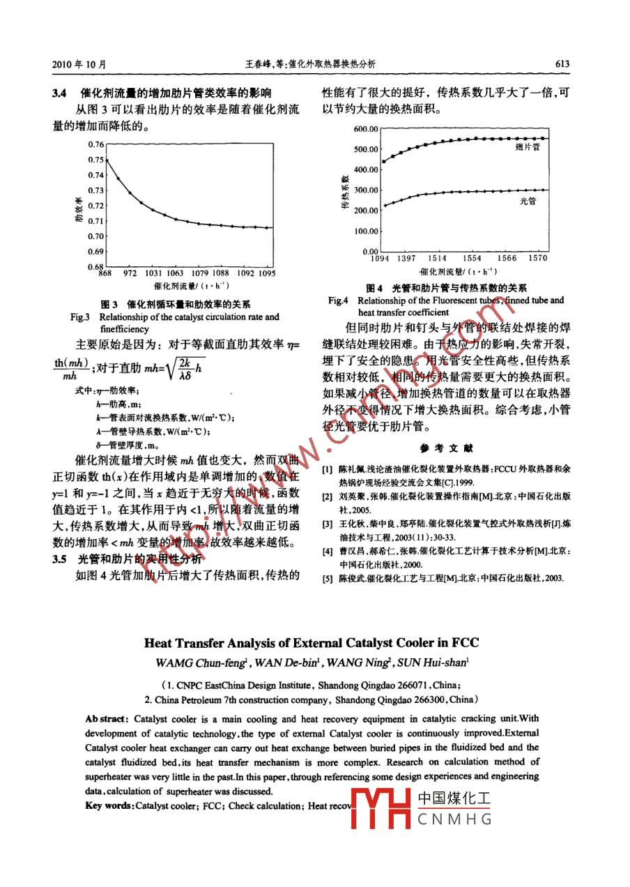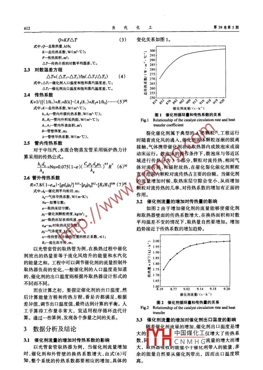第39卷第5期當代化工vol.39,N.52010年10月Contemporary Chemical IndustryOctober, 2010催化外取熱器換熱分析王春峰',萬德斌’,王寧2,孫惠山1(1中國石油華東勘察設(shè)計研究院,山東青島26071;2中國石油天然氣第七建設(shè)工司,山東青島266300)要:外取熱器是催化裂化裝置主要的冷卻和余熱回收設(shè)備隨著催化裂化技術(shù)的發(fā)展外取熱器的形式也在不斷的改進。外取熱器的換熱是催化劑流化床和床內(nèi)埋管之間的傳熱傳熱的機理也比較的復雜。過去對外取熱器計算方法的探討涉及很少,在借鑒了一些設(shè)計經(jīng)驗和工程資料數(shù)據(jù)的基礎(chǔ)上筆者對外取熱器的計算進行初步的探討關(guān)鍵詞:外取熱器;催化裂化;換熱計算;余熱回收中圖分類號:TE965文獻標識碼:A文章編號:1671-0460(2010)05-0611-03隨著催化裂化技術(shù)的快速發(fā)展取熱器作為催2計算分析化劑冷卻和能量回收的重要設(shè)備,已經(jīng)廣泛的應(yīng)用于催化裂化裝置中。取熱器按照布置方式分為內(nèi)取外取熱器計算從設(shè)計角度分為設(shè)計型計算和校熱器和外取熱器兩種形式內(nèi)取熱是直接在再生器核型計算。設(shè)計型計算按照工程取熱量的要求,選取內(nèi)部設(shè)置垂直或水平管道在再生器內(nèi)直接取熱。取熱管的形式、傳熱面積、管道長度、管道的排列方取熱器是將催化劑引至再生器外部的取熱形式叫式取熱器外徑從而完成設(shè)計計算。校核型計算是內(nèi)取熱器投資少,結(jié)構(gòu)簡單,不需要催化劑循環(huán)調(diào)驗證設(shè)計的模型是否能滿足當前工程的需要,從而節(jié)系統(tǒng),不需要增壓風系統(tǒng)。不足之處是熱負荷不對模型進行修改,以完成設(shè)計任務(wù)。實際計算的過能調(diào)節(jié),啟動和停用困難。外取熱器結(jié)構(gòu)復雜投資程中兩者往往相互穿插先設(shè)計后校核。從過程機大,占地多,但因為其維修方便操作調(diào)節(jié)比例大理的角度分為水力計算,熱力計算和磨損計算。水因而應(yīng)用的范圍很廣,已經(jīng)逐漸的取代了內(nèi)取熱力計算又分為自然循環(huán)和強制循環(huán)計算兩種形式器。內(nèi)取熱一般只應(yīng)用在過熱防焦蒸汽上面。本文就下流式外取熱器的熱力計算進行探討。取熱管為光管,管內(nèi)熱介質(zhì)為飽和汽、水兩相流。外1外取熱器分類介紹取熱的傳熱過程實際上是管外流化風攜帶催化劑與管內(nèi)的飽和汽、水進行換熱,屬于流化床換熱過外取熱器有多種分類方法按催化劑的流動方程。過程的控制方程為能量平衡方程和傳熱方程式分為,上流式、下流式、氣控式(內(nèi)循環(huán)、外循環(huán))外取熱器換熱過程分析如下。返混式、串聯(lián)式等多種形式。按熱介質(zhì)分為蒸發(fā)取21能量平衡方程熱和過熱取熱或兩者兼有叫。按水力循環(huán)方式分為c MtI-C2Mt=My +cM2(trt,)(1)自然循環(huán)取熱和強制循環(huán)取熱。式中:催化劑入口的溫度,℃下流式外取熱器:催化劑自再生器密相床引2催化劑出口的溫度,℃;出,經(jīng)熱催化劑斜管、單動滑閥進入外取熱器。在外t-流化風入口的溫度,℃取熱器下部送入流化風,外取熱器床層以鼓泡床形c對應(yīng)的催化劑比熱容,k(kgK);式流化。催化劑與取熱單元進行熱量交換。流化風cx-對應(yīng)t的催化劑比熱容kJ(kgKe-流化風的比熱容k(kg·K);自頂部引出返回再生器冷催化劑從外取熱器底部M催化劑的質(zhì)量流量kgs;引出經(jīng)單動滑閥冷催化劑斜管返回再生器M一產(chǎn)生蒸汽的質(zhì)量流量,kgs;下流式外取熱器換熱過程主要發(fā)生在催化劑M流化風的質(zhì)量流量kgs;密相區(qū),傳熱系數(shù)高,同時需要流化風的速度小,同2.2中國煤化工時熱負荷的調(diào)節(jié)范圍較大,適于大型裝置的應(yīng)用。CNMHG(2)·收稿日期:201005-18作者簡介:王春峰(1979-),男,工程師,碩士,河北省滄州市,200年畢業(yè)河北工業(yè)大學,熱能工程:煉油設(shè)計工作E-mail:wangchunfeng2010@126.coma612當代化工第39卷第5期Q=KF△T(3)變化關(guān)系如圖1。式中:Q一總?cè)崃?kJh;K一總傳熱系數(shù),w(m2℃);F傳熱面積7傳熱介質(zhì)的對數(shù)平均溫差,℃E28523對數(shù)溫差方程△T=(△Tr-△T2n(△T/△T2)(4)式中:△T催化劑入口溫度和飽和蒸汽溫度差,℃;7催化劑出口溫度和飽和蒸汽溫度差,℃。20024傳熱系數(shù)255K=/{(1h1)+R1+8/](AA1)+R+1/h23……(5)$的乎小求。小°°式中K—總傳熱系數(shù),w(m℃);催化劑流量(t·hh,h管內(nèi)外膜傳熱系數(shù),W(m2℃);圖1催化劑循環(huán)量和傳熱系數(shù)的關(guān)系R1,R管內(nèi)外積垢熱阻,w(m2·℃)Fig 1 Relationship of the catalyst circulation rate and heatA1,A?管內(nèi)外表面積ansfer coefficient管壁厚度,m裂化催化劑屬于典型的A類顆粒,工程運行A管壁導熱系數(shù),W(m·℃)。25管內(nèi)傳熱系數(shù)時隨著流化風的通入,催化劑固體顆粒逐漸的脫離對于中壓汽、水混合物蒸發(fā)管采用鍋爐熱力計接觸氣體攜帶催化劑在外取熱器內(nèi)成鼓泡床或湍算采用的傳熱公式。動床運行。鼓泡床的操作條件下,鼓泡床與鄰近區(qū)域進行傳熱分為3個部分,顆粒對流傳熱,相間氣=Nu=0075(1-)(CP24"R(6)體對流傳熱,和輻射放熱,在催化裂化催化劑顆粒直徑范圍內(nèi)顆粒對流傳熱占主要的份額。當催化劑2.6管外傳熱系數(shù)R781-d4門,ppy2,[RR(7)的流量增加時候取熱床層空隙會變小,