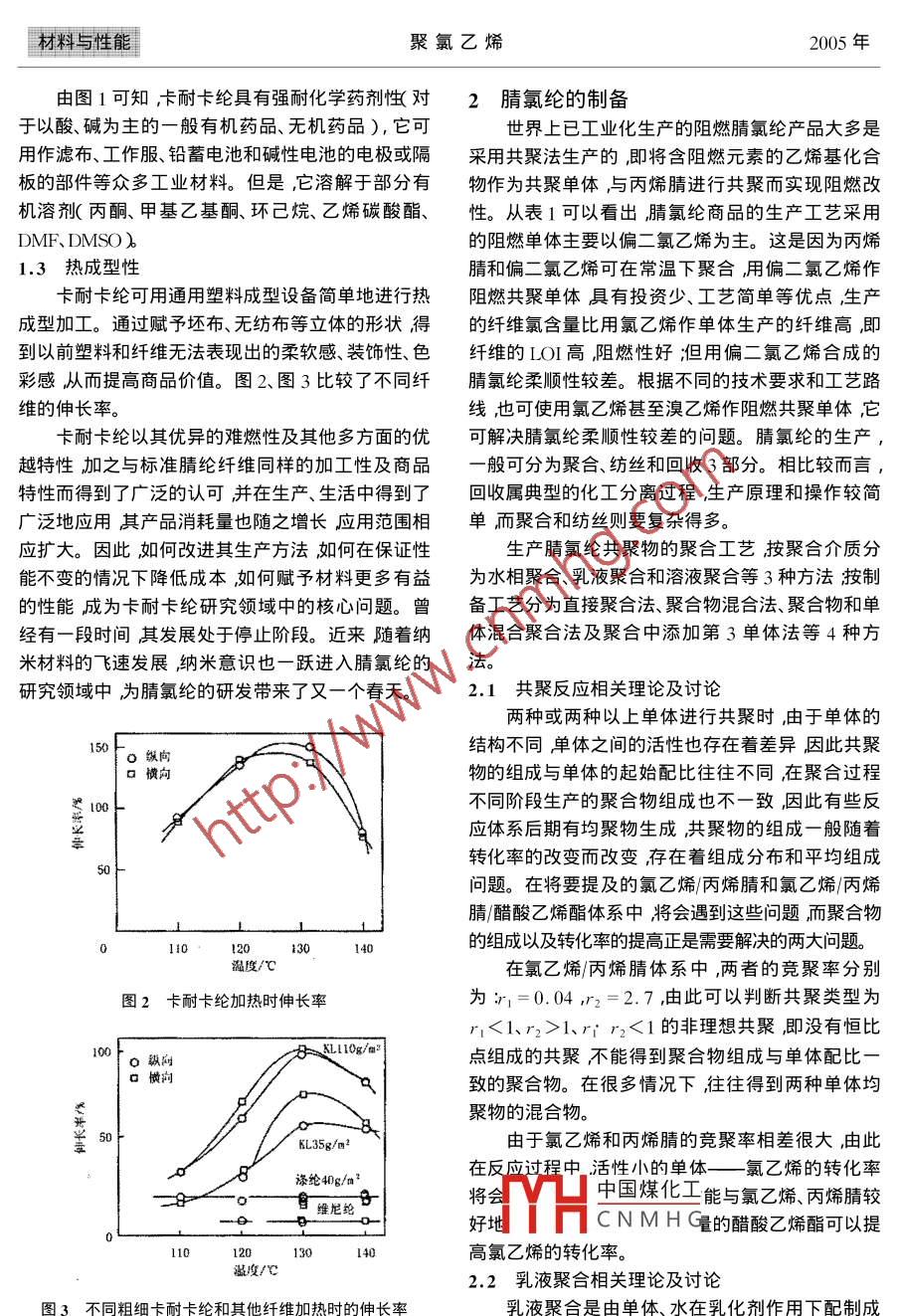No.2聚氯乙烯第2期Feb. 2005Polyvinyl Chloride2005年2月[材料與性能]氯乙烯-丙烯腈共聚物的開發(fā)及應(yīng)用.朱云新'余天石2( 1.南通江山農(nóng)藥化工股份有限公司江蘇南通226006 ;2.華東理工大學(xué)材料科學(xué)與工程學(xué)院上海200237 )[關(guān)鍵詞]氯乙烯-丙烯腈共聚物;性能制備:應(yīng)用[摘要]敘述了氯乙烯-丙烯腈共聚物的難燃性、耐化學(xué)藥劑性及熱成型性等主要性能。指出,該共聚物可制得較優(yōu)良的阻燃材料并討論了該共聚物的聚合方法。[中圖分類號]TQ325.3 [ 文獻(xiàn)標(biāo)識碼]A [ 文章編號] 1009 - 7937 2005 )2 - 0022 -04The development and application of vinyl chloride - acrylonitrile copolymerZHU Yun- xin' ,YU Tian - shi2( 1. Nantong Jiangshan Pesticide Chemical Industry Co. ,Ltd. ,Nantong 226006 China ;2. Material Science and Engineering Institute ,East China Universtiy of Science and Technology Shanghai 200237 China )Key words :vinyl chloride - - acrylonitrile copolymer iproperty preparation applicationAbstract :The main properties of vinyl chloride - acrylonitrile copolymer such as fire retardance ,chemical resistance and heat molding property ,were introduced. It was indicated that this copolymercould be used to prepare good fire retardant materials. The polymerization methods for this copolymerwere also discussed.由氯乙烯( VC)偏氯乙烯( VDC)丙烯腈( AN )大利Snia公司、德國拜耳公司和日本鐘紡公司等也,共聚物紡成的纖維稱為腈氯綸,該類纖維可以制成相繼投入生產(chǎn)。目前,生產(chǎn)能力最大的是日本鐘淵人造毛皮、各種阻燃織物,它又與人發(fā)非常相似,因化學(xué)工業(yè)公司的卡耐卡綸產(chǎn)品。20世紀(jì)60年代國而又可制成假發(fā)、假發(fā)套。該類樹脂經(jīng)溶劑溶解后內(nèi)就有幾個單位相繼進(jìn)行過該產(chǎn)品的研究在撫順還可以制成超濾膜等。隨著我國人民生活水平的不還曾從意大利引進(jìn)了腈氯綸的生產(chǎn)線,但由于種種斷提高及有關(guān)防火材料標(biāo)準(zhǔn)法規(guī)的制定,對紡織制原因,該產(chǎn)品一直沒有得到及時開發(fā)和應(yīng)用事隔品的阻燃化要求迅速提高阻燃纖維(尤其是腈氯綸20多年又重新進(jìn)行了試驗研究(上海合成纖維研究纖維)的研究和生產(chǎn)勢在必行。所進(jìn)行紡絲研究》特別值得注意的是,由于二氯乙國外生產(chǎn)腈氯綸阻燃纖維已有40余年的歷史。烯在聚合物鏈段中同一個碳原子上的兩個氯原子加最早開始于1950年美國Union Carbide公司將VC大了鏈的活動能力,因此用二氯乙烯合成的腈氯綸60%、AN 40%的共聚物用作纖維,投入工業(yè)化生.柔順性較差。在撫順的生產(chǎn)線生產(chǎn)的就是這種腈氯產(chǎn)并首先商品化商品名為Dynel ;1957年,日本鐘綸而日本鐘淵化學(xué)工業(yè)公司則是采用氯乙烯生產(chǎn)淵化學(xué)工業(yè)公司的Kanecaron和美國伊斯曼公司的腈氯綸因此產(chǎn)品性能更好。表1列出了部分腈氯Verel投入了工業(yè)化生產(chǎn);英國Courtaulds 公司、意中國煤化工YHCNMHG。 [收稿日期]2004-02 - 13 .[作者簡介]朱云新( 1956- ) 男現(xiàn)任南通江山農(nóng)藥化工股份有限公司新材料研究所所長主要從事氯乙烯系列聚合物的研發(fā)工作。第2期朱云新等氯乙烯-丙烯腈共聚物的開發(fā)及應(yīng)用材料與性能表1部分腈氯綸纖維產(chǎn)品情況名稱生產(chǎn)廠家阻燃單體聚合工藝紡絲工藝溶劑開米司綸N日本旭化成VDC沉淀濕紡硝酸勒夫綸日本鐘紡溶液DMF恩夫拉日本東麗DMSO卡耐卡綸日本鐘淵VC丙酮代納爾美國U.C.C.奧綸FLR美國杜邦干紡DMA蒂克綸英國Courtaulds韋利克綸FR意大利Snia Viscose德拉綸C德國Bayer腈氯綸中國撫順阻燃腈綸廠注:DMA為二甲基乙酰胺:DMF為二甲基甲酰胺;DMSO為二甲基亞砜。1性能火焰的面積等油料、漿料和染料也會影響阻燃效1.1 難燃性果所以使用時必須考慮這些因素及其相互關(guān)系。卡耐卡綸(Kanekaron)是日本鐘淵化學(xué)工業(yè)表2各種材料的 LOI(株)以獨創(chuàng)的技術(shù)開發(fā)的聚丙烯腈纖維(腈綸類合纖維的種類LOI/%成纖維)的商標(biāo)。1957 年,卡耐卡綸作為腈綸類合聚氯乙烯纖維35~40難燃滌綸28成纖維在日本開始工業(yè)化生產(chǎn)并以其獨特的難燃聚丙烯腈纖維25~32性(自身滅火性)仿獸毛性、耐化學(xué)藥劑性、熱成型羊毛24- ~ 25滌綸20.0~23.5性及熱收縮性等而聞名。此外它還兼具腈綸纖維腈綸18~20具有的優(yōu)點即彈性、保溫性、顯色性、柔軟性等。聚丙烯纖維纖維的阻燃性--般用極限氧指數(shù)(LOI,即能維維尼綸19.5~20.0持燃燒的最低氧含量的百分率表示。標(biāo)準(zhǔn)狀況下,棉人造絲18~21空氣中的氧的體積分?jǐn)?shù)約為21%。若纖維的LOI28.0~35.5大于21%則其離開火焰后,在空氣中就不能繼續(xù)以LOI看卡耐卡綸,它也是非常難燃的纖維。燃燒。-般來說LOI大于26%的纖維就可認(rèn)為是正因為材料本身難燃,所以不會因洗滌或干洗而降阻燃纖維。阻燃腈氯綸的LOI達(dá)28%~37%。表低難燃性。此外,它燃燒時無熔融是-種很難由于2列出了各種材料的LOI。.火焰的熔融滴下而引起二次災(zāi)害的纖維。對織物阻燃能力的全面評價不僅取決于LOI ,1.2 耐化學(xué)藥劑性還取決于纖維的結(jié)構(gòu),包括產(chǎn)品組成中所有可變因4種材料的耐酸、堿性能比較見圖1。素如紗線的支數(shù)、單位面積的質(zhì)量、織物組織、接觸(硫酸70%、8 CX20 h) .99.7 (氫氧化鈉50%、 80 Cx20 h)00 [100出五9118