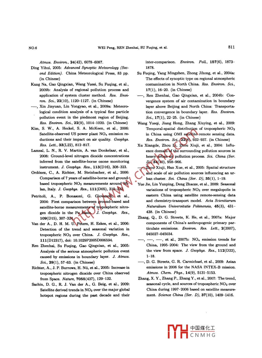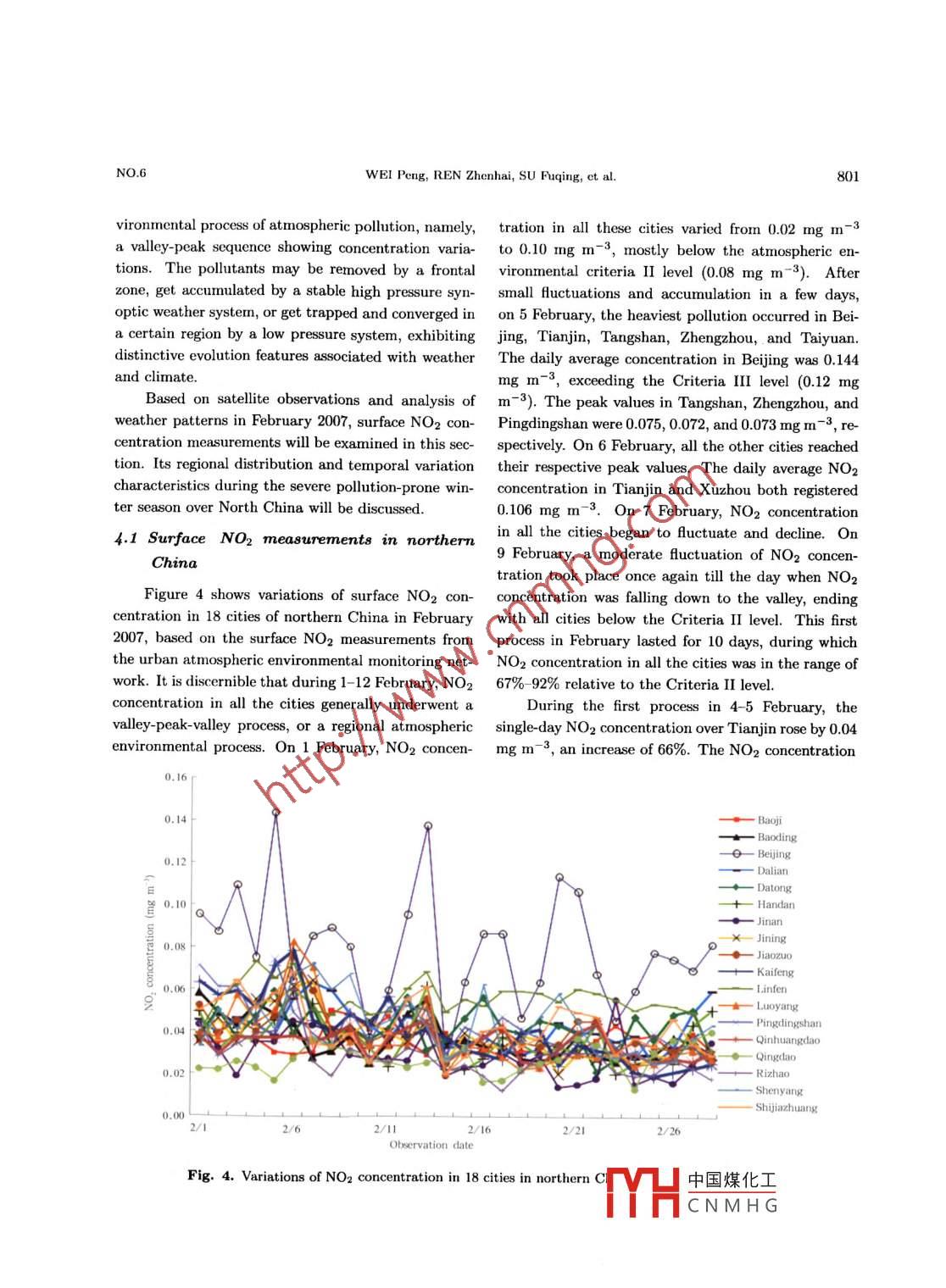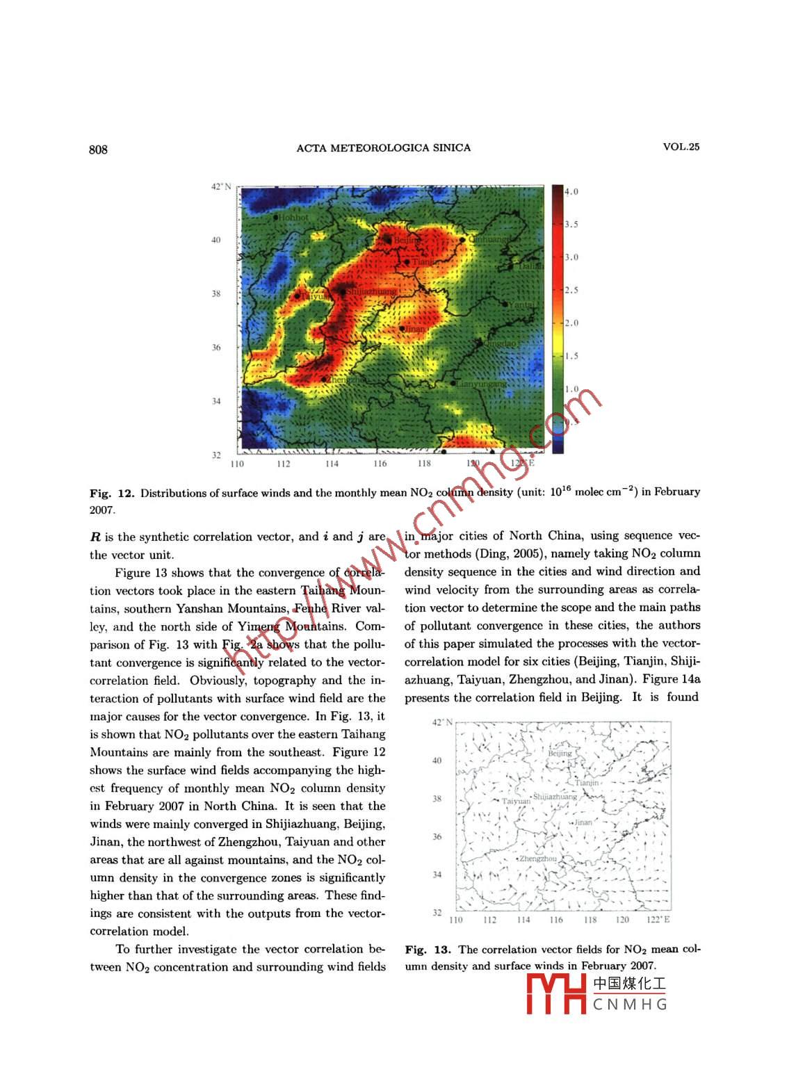 VOL.25 NO. 6ACTA METEOROLOGICA SINICA2011Environmental Process and Convergence Belt of Atmospheric NO2Pollution in North China*WEI Peng' (尉鵬), REN Zhenhai2t(任陣海), sU Fuqing?(蘇福慶), CHENG Shuiyuan'(程水源),ZHANG Peng3(張鵬), and GAO Qingxian2(高慶先)1 College of Environmental & Energy Engineering, Beijing University of Technology, Beijing 1000222 Chinese Research Acaderny of Environmental Sciences, Beijing 1000123 National Satelite Meteorological Center, China Meteorological Administration, Beijing 100081(Received October 16, 2010; in final form October 8, 2011)ABSTRACTBoth surface environmental monitoring and satellite remote sensing show that North China is one ofthe regions that are heavily polluted by NOz. Using the NO2 monitoring data from 18 major cities inthe region, the tropospheric NO2 column density data from the Ozone Monitoring Instrument (OMI) onthe Aura satellite, and the observations from the China Meteorological Administration network, this paperanalyzes a regional NO2 pollution event in February 2007 over North China, examines the convergence of thepollutant, and identifies its correlation with the atmospheric background conditions. The results show thatdaily mean NO2 concentrations derived from surface observations are consistent with the mean values of theOMI measurements, with their correlation coefficient reaching 0.81. The correlations of NO2 concentrationwith general weather patterns and sequential changes of temperature structure from 925 hPa down to thesurface indicate that the weather fronts, high pressure and low pressure systems in the atmosphere playrole in changing the temporal and spatial evolutions of NO2 through removing, accumulating or convergingof the pollutant, respectively. It is also found that the eastern Taihang Mountains is most heavily pollutedby NO2 in North China. Based on a model that correlates NOz column density with surface wind vector,the relation of the NO2 concentrations in six major cities in North China to the surrounding wind feldis analyzed. The results show that the maximum wind field is associated with the highest frequency opollution events, and under certain large scale atmospheric conditions together with the topographic effectsmall- and meso-scale wind fields often act to transport and converge pollutants, and become a major factorin forming the heaviest NO2 pollution event in North China. Analysis of the causes for the severe NOpollution event in this study may shed light on understanding, forecasting, and mitigating occurrences ofheavy NO2 pollution.Key words: atmospheric pollution, environmental process, convergence belt, satellite remote sensingCitation: Wei Peng, Ren Zhenhai, Su Fuqing, et al., 2011: Environmental process and convergence belt ofatmospheric NO2 pollution in North China. Acta Meteor. Sinica, 25(6), 797-811, doi: 10.1007/s13351-011-0610-x.1. IntroductionPrevious studies show that during 1996- 2006, adecreasing trend in NO2 concentration appeared glob-Nitrogen dioxide (NO2) is a major atmospherically, especially along the eastern coast of the Unitedpollutant and a main precursor of acid rain and photo- States (Kim et al, 2006) and Europe (Richter et al,chemical smog, which has serious effects on atmo-2005). In contrast, as a result of the rapid economicspheric environment quality. High NO2 concentration development in recent years, China now becomes amay lead to a higher mortality of lung cancer, 80 it isregion with the highest NO2 concentration and thedetrimental to human health. Also as a precursor offastestNO2 increase rate; especially, the easternozone, higher NO2 concentration often leads to peak-China has witnessed a rapid NO2 increase sincevalued ozone concentration.2000 (Sachin et al., 2009). Therefore, studies on the●Supported by the Fundamental Rescarch Fund of the Chinese Research Academy of Environmental Sciences (2010KYYW08).↑Corresponding author: weipeng - 1981 @hotmail.com.CThe Chinese Meteorological Society and Springer- Verlag Berlin Heidelberg 2011中國煤化工MYHCNMHG798ACTA METEOROLOGICA SINICAVOL.25 .characteristics and mechanisms of severe NO2 pollu-also analyzed the pollution sources. They suggestedtion events are of particular interest and urgency to that human activities may affect the spatial distribu-the environmental science community.tion of NO2 concentration (Zhang x. Y., et al, 2007).The concentration changes of pollutants in a reGOME and SCIAMACHY data, andgional air pllution process are subject to impacts of with an atmospheric chemistry transport model, Yueatmospheric conditions, as the removal, accumulation,t al. (2009) investigated the seasonal NO2 variationsand convergence of air pollutants are closely related and drew simnilar conclusions. Wang et al. (2009) con-to the changes in weather patterns (Ren et al, 2005;firmed the impacts of human activities on NO2 columnDing, 2005). A convergence belt usually representsa density in the troposphere in several geographic zoneszone with the highest concentration of a given pollu-of China.tant within a certain region, and its genesis and re-In the next five years (2011 -2015), the China en-moval with time and its spatial variation determine vironmental protection authority will make greater ef-the occurrence probability of severe pollution eventsforts to control the NO2 pollution. But so far, neitherin China (Su et al., 2004a).comprehensive investigations on the spatial distribu-In recent years, with advances in space-basedtion and temporal evolution of pollutants in Chinaremote sensing technologies, the sensorsnor studies on the seasonal NO2 variations have beenMACHY (Scanning Imaging Absorption Spectromecarried out at home and abroad. Using high resolu-ter for Atmosplheric CHartographY) and OMI (Ozonetion and large coverage satellite remote sensing ob-Monitoring Instrument), among others, have beenservations, this paper focuses on the pending issuesused to obtain the distributions of large-scale NO2 co