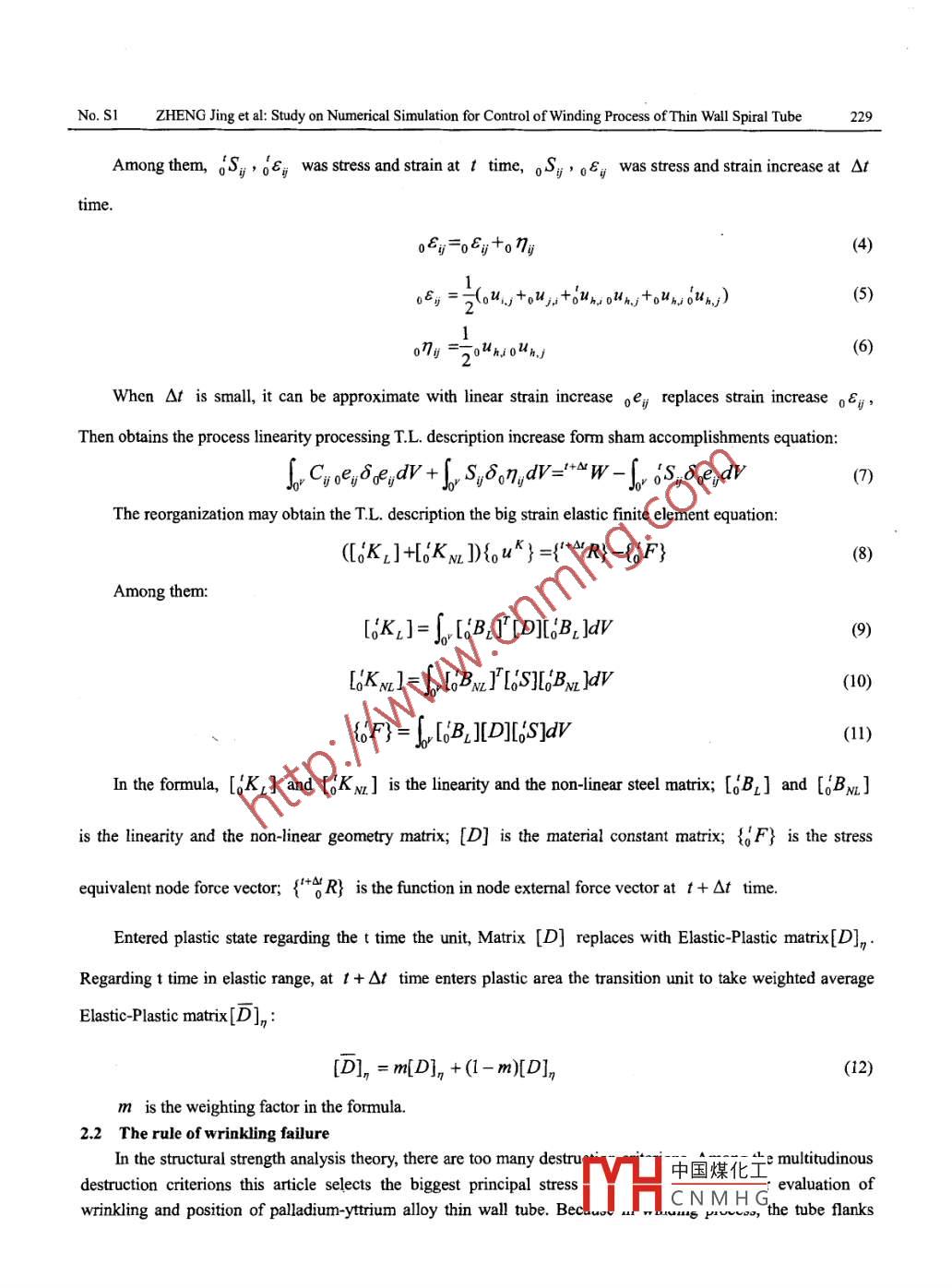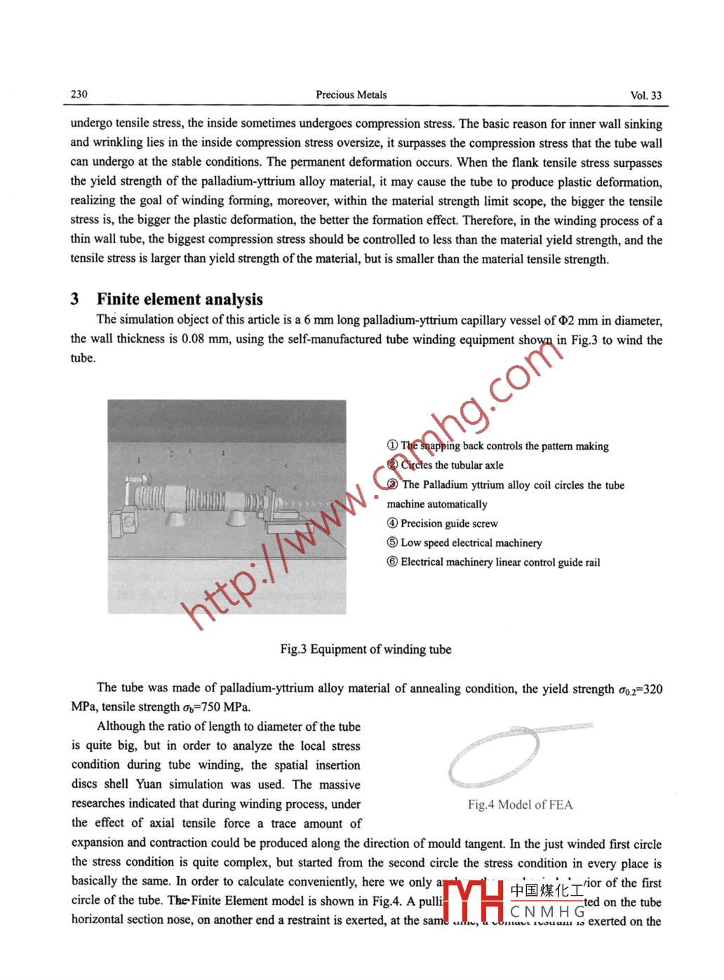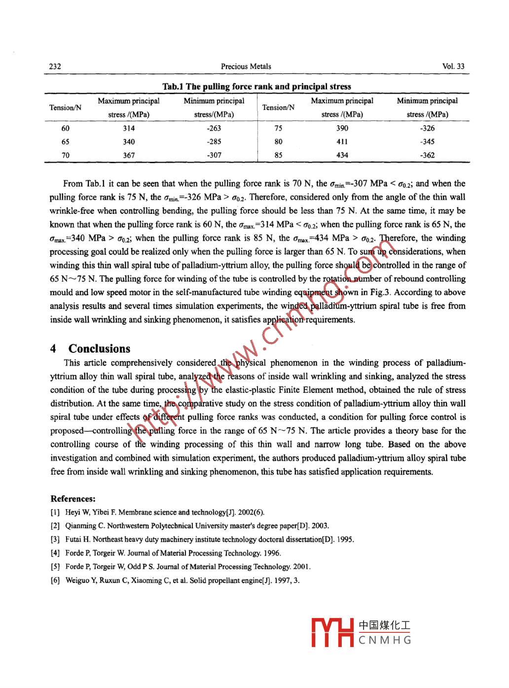 2012年10月貴金屬Oct. 2012第33卷增刊1Precious MetalsVol. 33, No. SIStudy on Numerical Simulation for Control ofWinding Process of Thin Wall Spiral TubeZHENG Jing, MA Guang, WANG Yi, LI Yin'e, JIA Zhihua, LI Jin(Northwest Institute for Nonferrous Metal Research, Xi'an China. E-mail:13892899884@163 .com)Abstract: Being aimed at the inside wall wrinkling and sinking phenomenon of plladium ytrium aly thin wallspiral tube used for preparation of high purity hydrogen, extraction of hydrogen isotope, and purification andseparation of hydrogen in the winding process, this article analyzed the reasons for above phenomena, establisheda numerical simulation model of winding process of above tube, using elastic-plastic Finite Element methodanalyzed the max. tensile stress and max. compression stress and their locations, thereby provides a theory basefor the control of working forming course of thin wall spiral tube.Key words: Pd-Y aloy;, thin wall spiral tube; winding; Finite Element method; numerical simulationCLC number: TG146.3*6 Document Code: AArticle ID: 1004-0676(2012)S1-0227-06Because the palladium alloy membrane difusion method has unique purifcation performance, it isincomparable with other physical method or chemical method, and it is a main method to prepare high purityhydrogen and extract, purify and separate bydrogen isotopes at presentl". But the hydrogen filtration effect of thefiltrating equipment made of palladium-silver membrane and tube is not sufficient, and the volume of theequipment is big, so using palladium ytriurm thin wall spiral tube which possesses high hydrogen permeabilityand may reduce the volume of filtrating equipment, to replace palladium-silver membrane and short tube has goodreal engineering value. The palladium- ytrium alloy has big sifiness and poor toughness, and because of therequirements by hydrogen permeating, the tube wall should be thin, and tube should be long. When windingpalladium-yttrium thin wall narrow tube, the inside wall wrinkling and sinking phenomena often appear leading tothe reduction of service life. This article used the Finite Element method to study the mechanic behavior in thewinding process of thin wall spiral tube, analyzed the reason of inside wall wrinkling and sinking, provided acontrol method for winding process.1 Wrinkling mechanism of inner wallThere are many methods to wind tubes, such as commonly used push bending, compression bending, rollbending, rotating bending, NC bending, and so on at present"!. The thin wall tube has quite big plasticdeformation inevitably when it circles on a mould; there is a difference in stress condition in inside and outside ofthe tube inevitably. Regarding the push bending, compression bending and roll bending, the tube inside undergoescompression stress, the flank undergoes tensile stress. Regarding the rotating bending, a micro section was taken中國煤化工Received date: 2012-04-15MHCNMHG228Precious Metalsas the object for study. This micro section of the tube simulaneously undergoes a pulling force that is along themould tangential direction, and a compression force that is given by the mould. The outside wall of the tube is inthe tensile stress state, and the stress state of inside wall is decided by the two combined actions. When the tensilestress surpasses the tensile strength of the material, cracks appear on the outer wall( as shown in Fig.1). If thecompression stress in inside wall is too big, surpasses the flexure stability of the material, wrinkling phenomenonwill occur(as shown in Fig. 2).Fig.1 SinkingFig.2 Wrinkling2 Simulated mechanical model of thin wall spiral tube in winding processingThe winding process of a thin wall narrow tube is an extremely complex physical phenomenon. On the onehand, the winding process causes the tube to produce a certain way permanent deformation, so that a spiral tube ofneeded shape and size could be obtained. Therefore, in the processing the material has a big displacement androtation inevitably, existing geometry non-linearity. On the other hand, if the force exerted on the metal materialsurpasses the yield strength, the material enters the plastic state, the stress-strain course is no longer a linearrelation. It is related with loading process, existing material non-linearity. At the same time, when the narrow tubecircles on the mould, the contacting condition of the tube wall and convex-concave mould is unceasingly changedcausing the contact non-linearity. These non-linear phenomena cause the numerical simulation of winding processof thin wall narrow tube to become extremely complex. In recent years, domestic and foreign scholars did lots ofwork on the numerical simulation of tube bending forming processb-s, obtained many valuable conclusions, butthe forming process of these objects studied all were that process of the outer wall is pulled and the inner wall iscompressed, the study on the numerical simulation of winding process of thin wall tube is insufficient.In order to simulate this non-linear processing well, the author selects the elastic- plastic Finite Elementmethod as the study method.2.1 Finite Element equation of large deformation elastic-plastic analysis(lAccording to Total Lagrange Formulation, it supposes t time beforehand solution to extract. According toprinciple of virtual work, Describes the t +△t time sham accomplishments equation is:I +&'S$8+^EejdV-=^*W(1)Among them,' oSg, toOEy was Cauchy stress and Green strain at 1+ Ot time. West time tan oak stressand Grimm strain.SEg=6°εy +oEy(2)"4S, =oS; +oSo中國煤化工(3)MHCNMHG..No. S1.ZHENG Jing et al: Study on Numerical Simulation for Control of Winding Process of Thin Wall Spiral Tube229Among them, Sj,0Eg was stress and strainat t time, oSy, o8,was stress and strain increase at Ottime.oE=o&;+o7j(4oEj = (ou,+ou.i+oUnj oUnj+ounsounj)o7gy一ounsoUn,JWhen Ot is small, it can be approximate with linear strain increase oey replaces strain increase oEy,Then obtains the proces