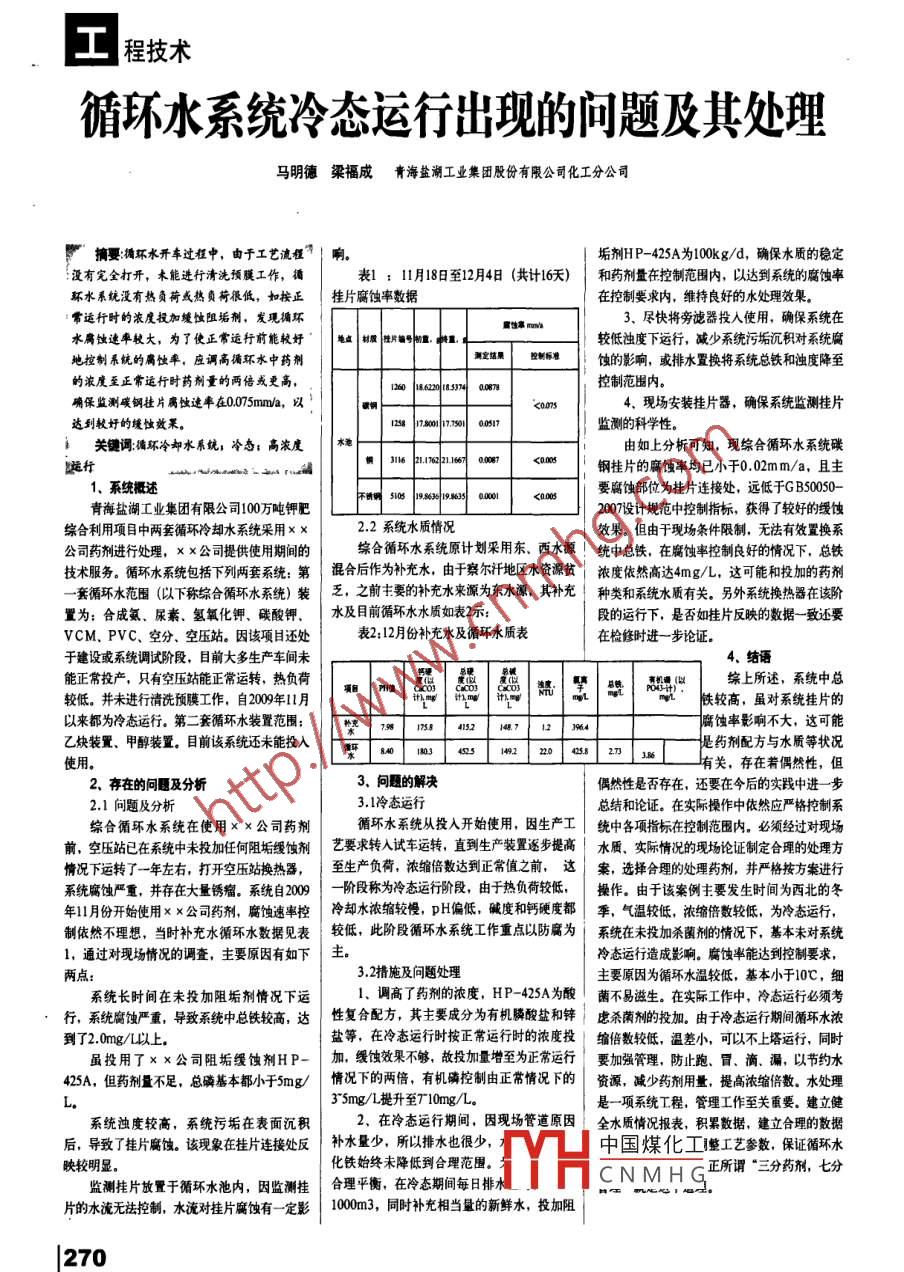 程技術(shù)循環(huán)水系統(tǒng)冷態(tài)運(yùn)行出現(xiàn)的問題及其處理馬明德梁福成青海鹽湖工業(yè)集團(tuán)股份有限公司化工分公司摘要:循環(huán)水開車過程中, 由于工芑流程”|響垢劑HP-425A為100k g/d,確保水質(zhì)的穩(wěn)定沒有完全打開,木能進(jìn)行清洗預(yù)膜工作,循表1 : 11月18日至12月4日(共計(jì)16天)和藥劑量在控制范圍內(nèi),以達(dá)到系統(tǒng)的腐蝕率環(huán)水系統(tǒng)沒有熱負(fù)荷或熱負(fù)荷很低,如按正桂片腐蝕率數(shù)據(jù)在控制要求內(nèi),維持良好的水處理效果。:常運(yùn)行時(shí)的濃度投加緩蝕阻垢劑,發(fā)現(xiàn)循環(huán)3. 盡快將旁謔器投人使用,確保系統(tǒng)在水腐蝕迷率較大,為了使正常運(yùn)行前能較好材質(zhì) 推片編號n. 中n.較低濁度下運(yùn)行,減少系統(tǒng)污垢沉積對系統(tǒng)腐地控制系統(tǒng)的腐蝕率,應(yīng)調(diào)高循環(huán)水中藥劑測定結(jié)果控制拆準(zhǔn)蝕的影響,或排水置換將系統(tǒng)總鐵和獨(dú)度降至的濃度至正常運(yùn)行時(shí)藥劑量的兩倍或更高,1260 120185934 0.0878控制范圍內(nèi)。確保監(jiān)測碳鋼桂片腐蝕迷率在0.075mn/a,以