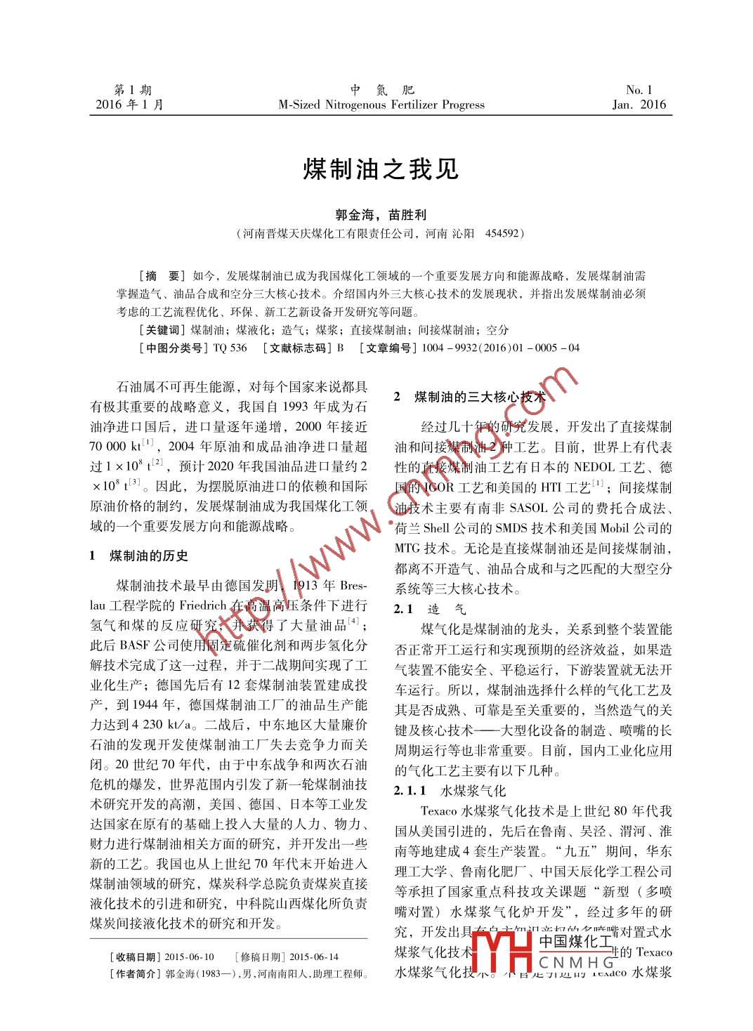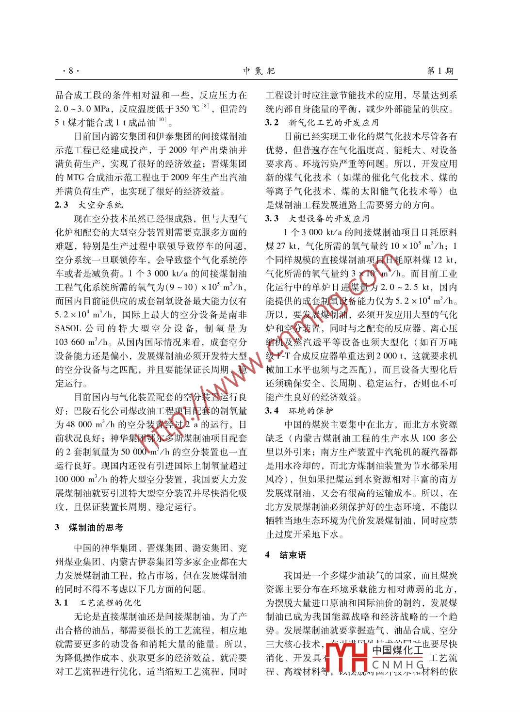 第1期中氮肥No.12016年1月M-Sized Nitrogenous Fertilizer ProgressJan. 2016煤制油之我見(jiàn)郭金海,苗勝利(河南晉煤天慶煤化工有限責(zé)任公司,河南沁陽(yáng)454592 )[摘要]如今,發(fā)展煤制油e成為我國(guó)煤化工領(lǐng)域的一-個(gè)重要發(fā)展方向和能源戰(zhàn)略,發(fā)展煤制油需掌握造氣、油品合成和空分三大核心技術(shù)。介紹國(guó)內(nèi)外三大核心技術(shù)的發(fā)展現(xiàn)狀,并指出發(fā)展煤制油必須考慮的工藝流程優(yōu)化.環(huán)保、新I藝新設(shè)備開(kāi)發(fā)研究等問(wèn)題。[關(guān)鍵詞]煤制油;煤液化;造氣;煤漿;直接煤制油;間接煤制油;空分[中圖分類號(hào)] TQ536 [文獻(xiàn)標(biāo)志碼] B [文章編號(hào)] 1004 - 9932(2016)01 -0005 -04石油屬不可再生能源,對(duì)每個(gè)國(guó)家來(lái)說(shuō)都具.2煤制油的三大核心技術(shù)有極其重要的戰(zhàn)略意義,我國(guó)自1993年成為石油凈進(jìn)口國(guó)后,進(jìn)口量逐年遞增,2000 年接近,經(jīng)過(guò)幾十年的研究發(fā)展,開(kāi)發(fā)出了直接煤制70000kt'),2004年原油和成品油凈進(jìn)口量超油和間接煤制油2種工藝。目前,世界上有代表過(guò)1 x108 t[21,預(yù)計(jì)2020年我國(guó)油品進(jìn)口量約2性的直接煤制油工藝有日本的NEDOL工藝、德x 10* [3。因此,為擺脫原油進(jìn)口的依賴和國(guó)際國(guó)的IGOR工藝和美國(guó)的HTI工藝”;間接煤制原油價(jià)格的制約,發(fā)展煤制油成為我國(guó)煤化工領(lǐng)油技術(shù)主要有南非SASOL公司的費(fèi)托合成法、域的一個(gè)重要發(fā)展方向和能源戰(zhàn)略。荷蘭Shell公司的SMDS技術(shù)和美國(guó)Mobil公司的MTG技術(shù)。無(wú)論是直接煤制油還是間接煤制油,1煤制油的歷史都離不開(kāi)造氣、油品合成和與之匹配的大型空分煤制油技術(shù)最早由德國(guó)發(fā)明,1913 年Bres-系統(tǒng)等三大核心技術(shù)。lau工程學(xué)院的Friedrich 在高溫高壓條件下進(jìn)行2.1造氣氫氣和煤的反應(yīng)研究,并獲得了大量油品'4;煤氣化是煤制油的龍頭,關(guān)系到整個(gè)裝置能此后BASF公司使用固定硫催化劑和兩步氫化分否正常開(kāi)工運(yùn)行和實(shí)現(xiàn)預(yù)期的經(jīng)濟(jì)效益,如果造解技術(shù)完成了這一過(guò)程,并于二戰(zhàn)期間實(shí)現(xiàn)了工氣裝置不能安全、平穩(wěn)運(yùn)行,下游裝置就無(wú)法開(kāi)業(yè)化生產(chǎn);德國(guó)先后有12套煤制油裝置建成投車運(yùn)行。所以,煤制油選擇什么樣的氣化工藝及產(chǎn),到1944 年,德國(guó)煤制油工廠的油品生產(chǎn)能其是否成熟、可靠是至關(guān)重要的,當(dāng)然造氣的關(guān)力達(dá)到4 230 kt/a。二戰(zhàn)后,中東地區(qū)大量廉價(jià)鍵及核心技術(shù)-一大 型化設(shè)備的制造、噴嘴的長(zhǎng)石油的發(fā)現(xiàn)開(kāi)發(fā)使煤制油工廠失去競(jìng)爭(zhēng)力而關(guān)周期運(yùn)行等也非常重要。目前,國(guó)內(nèi)工業(yè)化應(yīng)用閉。20世紀(jì)70年代,由于中東戰(zhàn)爭(zhēng)和兩次石油的氣化工藝主要有以下幾種。危機(jī)的爆發(fā),世界范圍內(nèi)引發(fā)了新一輪煤制油技2.1.1水煤漿 氣化術(shù)研究開(kāi)發(fā)的高潮,美國(guó)、德國(guó)、日本等工業(yè)發(fā)Texaco水煤漿氣化技術(shù)是上世紀(jì)80年代我達(dá)國(guó)家在原有的基礎(chǔ)上投人大量的人力、物力、國(guó)從美國(guó)引進(jìn)的,先后在魯南、吳涇、渭河、淮財(cái)力進(jìn)行煤制油相關(guān)方面的研究,并開(kāi)發(fā)出一- 些南等地建成4套生產(chǎn)裝置?!熬盼濉逼陂g,華東新的工藝。我國(guó)也從上世紀(jì)70年代末開(kāi)始進(jìn)人理工大學(xué)、魯南化肥廠、中國(guó)天辰化學(xué)工程公司煤制油領(lǐng)域的研究,煤炭科學(xué)總院負(fù)責(zé)煤炭直接等承擔(dān)了國(guó)家重點(diǎn)科技攻關(guān)課題“新型(多噴液化技術(shù)的引進(jìn)和研究,中科院山西煤化所負(fù)責(zé)嘴對(duì)置)水煤漿氣化爐開(kāi)發(fā)”,經(jīng)過(guò)多年的研煤炭間接液化技術(shù)的研究和開(kāi)發(fā)。"中國(guó)煤化工嘴對(duì)置式水[收稿日期] 2015-06- 10[修稿日期] 2015-06-.14煤漿氣化技術(shù)CNMHG[作者簡(jiǎn)介]郭金海(1983- -),男,河南南陽(yáng)人,助理工程師。水煤漿氣化技小。小白心小邊的icdco水煤漿●6.中氮肥第1期氣化技術(shù)還是國(guó)產(chǎn)化的多噴嘴對(duì)置式水煤漿氣化(2)煤氣中含有8% ~15%的甲烷,特別適技術(shù),均屬于氣流床氣化技術(shù),水煤漿進(jìn)料,以宜于聯(lián)產(chǎn)城市煤氣或煤制天然氣。純氧為氣化劑,氣化壓力可在2.0~8.5 MPa之(3)煤氣中含有焦油、輕油、石腦油、酚間選擇,氣化溫度在1 300~1 500 °C。等,下游產(chǎn)品多樣化,但也導(dǎo)致氣體凈化工段設(shè)工藝流程:原煤經(jīng)濕磨煤機(jī)制漿后成為備增多、操作復(fù)雜。63% (質(zhì)量分?jǐn)?shù))左右的水煤漿,經(jīng)高壓煤漿(4)設(shè)備、技術(shù)等已全部實(shí)現(xiàn)國(guó)產(chǎn)化,投泵送至氣化爐頂與純氧(純度98%)一起進(jìn)人資費(fèi)用大幅度下降。噴嘴,煤漿經(jīng)噴嘴霧化后與氧氣在氣化爐內(nèi)發(fā)生(5)煤氣水處理難度較大、投資較大。部分氧化反應(yīng),生成水煤氣,水煤氣出氣化爐后(6) - -般有備爐,可實(shí)現(xiàn)長(zhǎng)周期、連續(xù)運(yùn).經