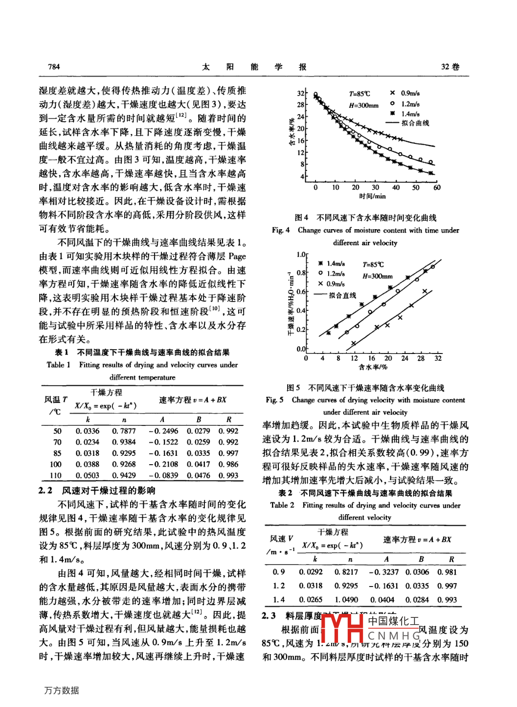 第32卷第6期太陽能學報Vol 32. No 6011l年6月ACTA ENERGIAE SOLARIS SINICAJun . 2011文章編號:02540096(2011)06078205生物質(zhì)流化床熱風干燥特性研究李斌,陳漢平,鞠付棟,楊海平,王賢華,張世紅(華中科技大學煤燃燒國家重點實驗室,武漢430074)摘要:在一個自制的能實時檢測質(zhì)量的流化床干燥試驗裝置上對一種速生林木材的熱風干燥特性進行了深入系統(tǒng)的研究,分析了熱風溫度熱風速度以及料層高度等對生物質(zhì)樣品干燥熱特性的影響。結果表明:干燥速率隨溫度和風速的增加而增大;隨料層厚度的增加而下降;物料的含水率越高,干燥速率越快,隨含水率的變化各條件對干燥速率的影響程度發(fā)生改變。通過對干燥過程模擬分析發(fā)現(xiàn),干燥曲線以及脫水速率分別符合薄層Page模型和線性方程模型,且干燥方程中的參數(shù)k主要受風溫和料層厚度影響,參數(shù)n則主要受風速影響。關鍵詞:流化床熱風干燥;含水率;干燥速率;模型中圖分類號:TK6文獻標識碼:A0引言制樣時為保證樣本的代表性,將樹木的各部分(樹干、樹根、枝條等)碾切后,按照相應質(zhì)量比配比混合生物質(zhì)的初始含水率一般較高(達到30%以形成分析樣品。試樣的尺寸為20cm×1.0cmx上(),而高含水率對其后續(xù)轉(zhuǎn)化利用(如增加能0.5cm,初始含水量約為30%,實驗中所用的樣品的耗2)、影響設備運行穩(wěn)定性和產(chǎn)品品質(zhì)等)非尺寸與初始含水量均和實際工業(yè)裝置接近能有效常不利。傳統(tǒng)的自然晾曬干燥方式不僅耗時長,且保證所測數(shù)據(jù)的實際價值受天氣變化的影響較大,嚴重限制了生物質(zhì)的規(guī)模1.2試驗裝置與方法化利用;而流化床干燥技術以其傳熱傳質(zhì)強、處理強試驗所采用的流化床干燥試驗系統(tǒng)見圖1,主要度大等優(yōu)點而受到廣泛重視。目前有關干燥特性的由熱風產(chǎn)生系統(tǒng)、干燥系統(tǒng)和稱重系統(tǒng)3部分組成。研究報道主要集中在食品工業(yè)56和多孔材料類物干燥系統(tǒng)為方形流化床式干燥反應器流化床截面尺質(zhì)3,對農(nóng)林廢棄物干燥特性的研究報道較寸為100mm×10m。臺架高約1m,為了便于放置少9.10,且目前相關研究中所采用的試驗裝置較小,樣品和實時稱重內(nèi)置一個100mm×1om×400mm試樣量和尺寸均非常小,與實際工業(yè)裝置差別較大。的金屬絲網(wǎng)吊籃,不影響其內(nèi)部布風和空氣流動。鑒于此,本文采用自制的一個能實時檢測質(zhì)量的流空壓機輸出的冷空氣分為兩股其中一股經(jīng)加熱爐化床千燥試驗裝置,對較大質(zhì)量和較大尺寸的生物加熱到某溫度后與另一股混合,得到設定溫度和流質(zhì)原料的干燥特性進行了深入研究,系統(tǒng)考察了風量的干燥用熱風,通過調(diào)節(jié)兩股空氣的流量和配比速、風溫和料層厚度等對干燥特性的影響,并對干燥可調(diào)節(jié)試驗用的風量和風溫。熱風從底部進入干燥過程模擬進行了深入探討。為工業(yè)化流化床干燥裝系統(tǒng),經(jīng)過一漸擴段后,開始與物料接觸并穿過物料置的研究設計和高效運行提供了一定依據(jù),具有積進行干燥,最后由出氣口排出。試驗時稱取一定質(zhì)極的參考價值。量的試樣裝入干燥系統(tǒng)的吊籃中,根據(jù)料層厚度的不同,試樣質(zhì)量為250~500g,吊籃通過質(zhì)量傳感器1實驗與稱重系統(tǒng)相連。熱風進入干燥系統(tǒng)對試樣進行干1,1原料燥,通過稱重系統(tǒng)實時記錄試樣質(zhì)量隨時間變化的試驗采用的生物質(zhì)原料為一種速生林木材。在數(shù)據(jù),為避免熱重香締的影響干燥時提起吊中國煤化工收稿日期:200947-13CNMHG基金項目:國家重點基礎研究發(fā)展(973)計劃(2007cB210202);國家自然科學基金(50806027;50721005)通訊作者:陳漢平(1962一),男,教授、博士生導師,主要從事煤與生物質(zhì)的清潔轉(zhuǎn)化利用方面研究。chen@163,c0m6期李斌等:生物質(zhì)流化床熱風干燥特性研究783根據(jù)干燥實驗數(shù)據(jù),以ln為橫坐標、lnln為縱坐標作圖,采用最小二乘法求得擬合直線的斜率和截距,進而求得不同條件下的干燥常數(shù)k和n。④22結果與討論22.1溫度對干燥過程的影響不同溫度下,試樣的干基含水率隨時間的變化規(guī)律見圖2,干燥速率隨干基含水率的變化規(guī)律見圖3。根據(jù)流化風速的要求試驗中風速取為1.2m/s,料層厚度為300mm,熱風溫度分別為50、70、85、100和1空壓機2流量計3加熱爐4K型熱電偶5出氣口6稱重天平7吊籃110℃,圖中點均為試驗測量值。V=1.2m/圖1流化床干燥試驗臺示意圖H=300mm70C85℃Fig 1 Schematic diagram of the huidized bed drying device籃并停止通風。1.3含水率與干燥速率的計算擬合曲線試樣的初始含水率通過烘箱110℃恒溫干燥至恒重來計算。含水率采用干基含水率,計算公式如式(1):時間/minx100%(1)干式中,X——含水率;m—在110℃烘箱中干燥至圖2不同溫度下含水率隨時間變化曲線Fig 2 Change curves of moisture content with time under恒重的質(zhì)量;m—在實驗過程中的實時質(zhì)量。different temperature干燥速率用每分鐘的干基失水速率來表示,計V=1.2m/算公式如式(2):l00H=300mmX-;-X(2)50式中,"14:時刻的干燥速率,%水/mn;Xx-1.Q王求瓣擬合直線X1—在t1-t11時間間隔內(nèi)失水率的變化量。要041.4干燥過程模擬分析通常干燥過程可以用薄層Page模型山來進行0.011520模擬,其方程如式(3):含水率/%X。-X(3)圖3不同