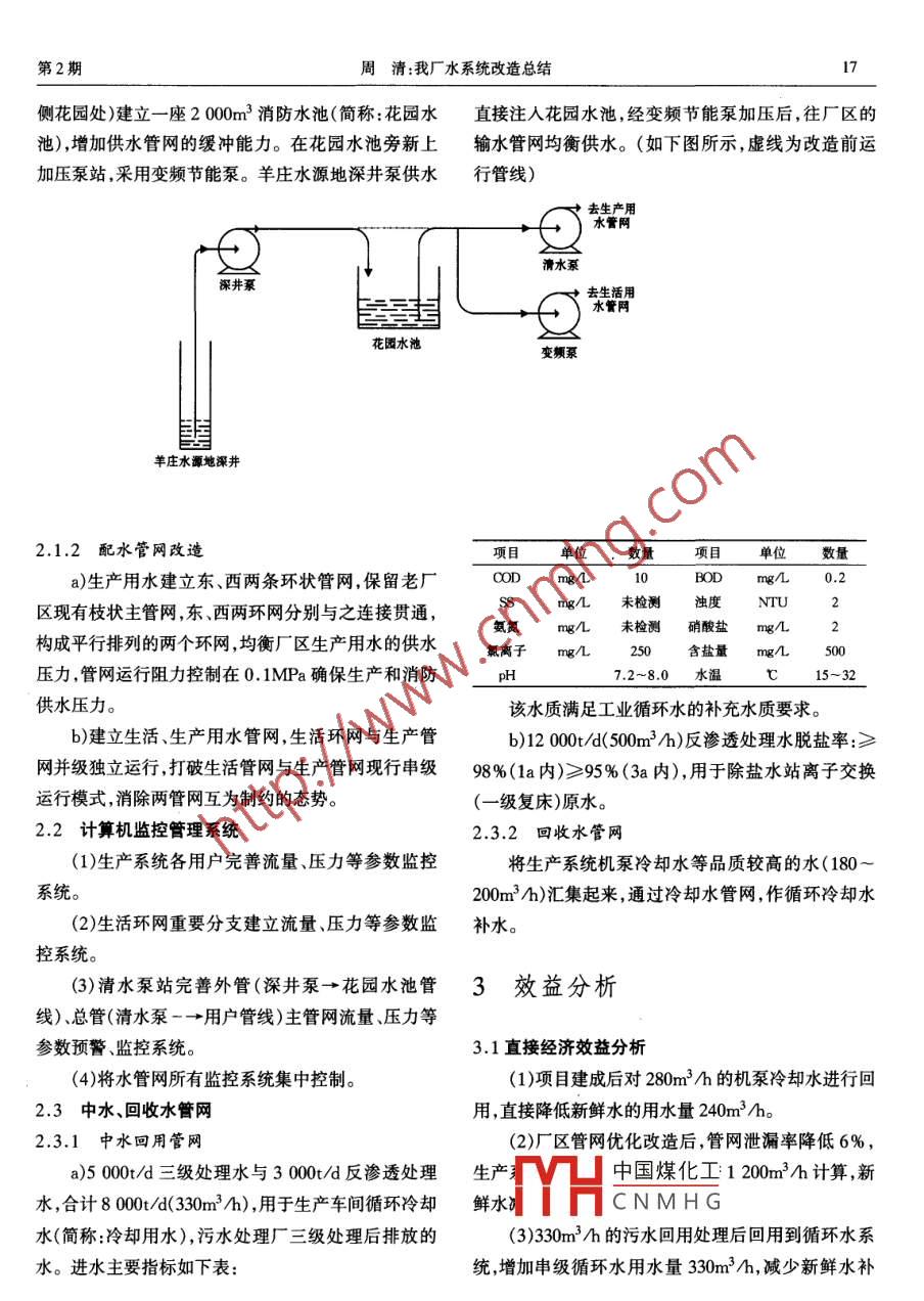 33卷第2期化工設(shè)計(jì)通訊Vol 33 No. 22007年6Chemical Engineering Design CommunicationsJun,2007我廠水系統(tǒng)改造總結(jié)周清(山東省滕州市兗礦魯南化肥廠,山東滕州277527)摘要:本著節(jié)能降耗、環(huán)保的宗旨,對(duì)我廠水系統(tǒng)(尤其是老區(qū)),從管網(wǎng)到監(jiān)控運(yùn)行,提出技術(shù)改造方案,并作出效益分析。關(guān)鍵詞:管網(wǎng);輸水;配水;節(jié)水;污水;中水;效益中圖分類號(hào):TQ085文獻(xiàn)標(biāo)識(shí)碼:A文章編號(hào):1003-6490(2007)02-0015-04下水通過(guò)深井集水后,由深井泵抽吸直接進(jìn)入兩條低0引言壓輸水管道(DN500),利用深井泵出口余壓,通過(guò)兩條輸水管道,同時(shí)依靠水封控制低壓輸水管道壓力,兗礦魯南化肥廠始建于1967年,1999年12月使壓力不超過(guò)0.04MPa,使新鮮水進(jìn)入一次泵吸水管30日正式掛牌成立,是兗礦集團(tuán)下屬一家專門從事道,經(jīng)一次泵加壓后進(jìn)入羊莊水源配水枝狀管網(wǎng),通過(guò)化工生產(chǎn)與科研開(kāi)發(fā)、具有獨(dú)立法人資格的化工企供水干管,支管到達(dá)各用戶及生活區(qū)新鮮水供水系統(tǒng)。業(yè)。自建廠以來(lái),兗礦魯南化肥廠環(huán)保和節(jié)能工作在1.2水源地供水簡(jiǎn)圖全國(guó)氮肥行業(yè)一直走在前列,逐漸成為全國(guó)中氮肥行1.3目前供水工藝現(xiàn)狀業(yè)的一面旗幟,先后榮獲“全國(guó)環(huán)保先進(jìn)企業(yè)”、“清潔由于老廠區(qū)供水系統(tǒng)是在60年代末建立起來(lái)的文明工廠樣板廠”等一系列榮譽(yù)稱號(hào)。特別是近幾年枝狀管網(wǎng)供水系統(tǒng),消防系統(tǒng)與生產(chǎn)生活供水系統(tǒng)合來(lái),兗礦魯南化肥廠在生產(chǎn)規(guī)模不斷擴(kuò)大的同時(shí),各為一個(gè)供水系統(tǒng),設(shè)計(jì)中沒(méi)有考慮消防水池,存在用項(xiàng)環(huán)保指標(biāo)不斷改善,水資源消耗指標(biāo)逐年下降,多水不合理的環(huán)節(jié),造成新鮮水用水量大,水的重復(fù)利項(xiàng)指標(biāo)創(chuàng)歷史最好水平。用率低,排污水量大的問(wèn)題。具體分析如下(1)目前生產(chǎn)系統(tǒng)中新鮮水用于換熱器冷卻的水1系統(tǒng)現(xiàn)狀量高達(dá)1600m3/h;用于生產(chǎn)系統(tǒng)機(jī)泵冷卻水量也將近280m3/h,這些水溫度在20~25℃左右,懸浮物含1.1新鮮水系統(tǒng)供水工藝量在5mgL以下,無(wú)論從水溫還是水質(zhì)方面對(duì)生產(chǎn)兗礦魯南化肥廠老廠區(qū)新鮮水供水系統(tǒng)是1967系統(tǒng)都是極好的水源。目前這部分水用后直接排放,年建成投用的水系統(tǒng),由取水深井、深井泵、輸水管水重復(fù)利用率低一方面浩成水資源的過(guò)度開(kāi)采道、一次泵(加壓泵)供水管網(wǎng)等幾個(gè)部分組成的。地方中國(guó)煤化工CNMHG收稿日期:2007-01-15作者簡(jiǎn)介:周清,男,2002年畢業(yè)于華中理工大學(xué)漢口分校化學(xué)工程及工藝專業(yè),現(xiàn)任兗礦魯南化肥廠生產(chǎn)調(diào)度處助理工程師,從事公用工程管理工作。聯(lián)系電話:0632-2362210化工設(shè)計(jì)通訊第33卷高壓供水管路3臺(tái)廠區(qū)加壓泵低壓供水管線用戶水源地6臺(tái)深井泵消防栓消防栓圖1水源地供水簡(jiǎn)圖(2)污水處理廠采用AO工藝的三級(jí)處理后的30Ls,其室內(nèi)外消防總用水量為60L/s,(216m3h)。目污水,排放水質(zhì)較好,符合工業(yè)循環(huán)水補(bǔ)充用水的要前的單管線灌水量不能保證事故狀態(tài)下的消防供水。求,應(yīng)對(duì)建立中水回用管網(wǎng),降低一次水的開(kāi)采,最大(6)由于目前老系統(tǒng)廠區(qū)的消防栓直接從供水總限度的節(jié)約水質(zhì)資源。管上供水,管網(wǎng)末端的消防栓的壓力僅達(dá)到0.1MPa(3)老廠區(qū)一次水輸水系統(tǒng)緩沖能力差,操作彈左右,不能滿足《石油化工企業(yè)設(shè)計(jì)防火規(guī)范》中第性小,供水系統(tǒng)極不穩(wěn)定。生產(chǎn)、生活、消防從一個(gè)管7.3.11條“其它場(chǎng)所采用低壓消防給水系統(tǒng)時(shí),其壓網(wǎng)供水,存在供水水量波動(dòng)大,供水壓力不均勻。力應(yīng)確保滅火時(shí)最不利點(diǎn)消防栓的水壓不低于(4)老廠區(qū)一次水配水系統(tǒng)為枝狀結(jié)構(gòu),隨著生0.15MPa”。產(chǎn)系統(tǒng)不斷擴(kuò)大,枝狀管網(wǎng)不斷延伸,管網(wǎng)存在嚴(yán)重(7)老系統(tǒng)供水管網(wǎng)已運(yùn)行30多年,管網(wǎng)泄漏率的配水不均勻性,其末端壓力逐漸下降(目前末端壓高達(dá)10%以上,造成水資源浪費(fèi),不符合節(jié)水大綱的力約為0.10MPa,管網(wǎng)最大壓差約為0.25MPa),嚴(yán)要求。重制約末端用戶的用水需求,供水系統(tǒng)能耗偏高。(8)管網(wǎng)分支多,計(jì)量體系不完善,管理較為落(5)《石油化工企業(yè)設(shè)計(jì)防火規(guī)范》規(guī)定,無(wú)消防后,存在局部用水不合理的現(xiàn)象。水池的供水系統(tǒng),單管線供水量應(yīng)達(dá)到最大事故狀態(tài)下的消防最大用水量和70%的生產(chǎn)用水量。根據(jù)2改造方案《建筑設(shè)計(jì)防火規(guī)范》(GBJ16-87)和《石油化工企業(yè)中國(guó)煤化工設(shè)計(jì)防火規(guī)范(1999年版)(GB50160-92)的規(guī)定,全2.1CNMHG廠同一時(shí)間內(nèi)火災(zāi)次數(shù)按一次計(jì)算,最大一處著火點(diǎn)2.1.1輸水管網(wǎng)改造次室外消防用