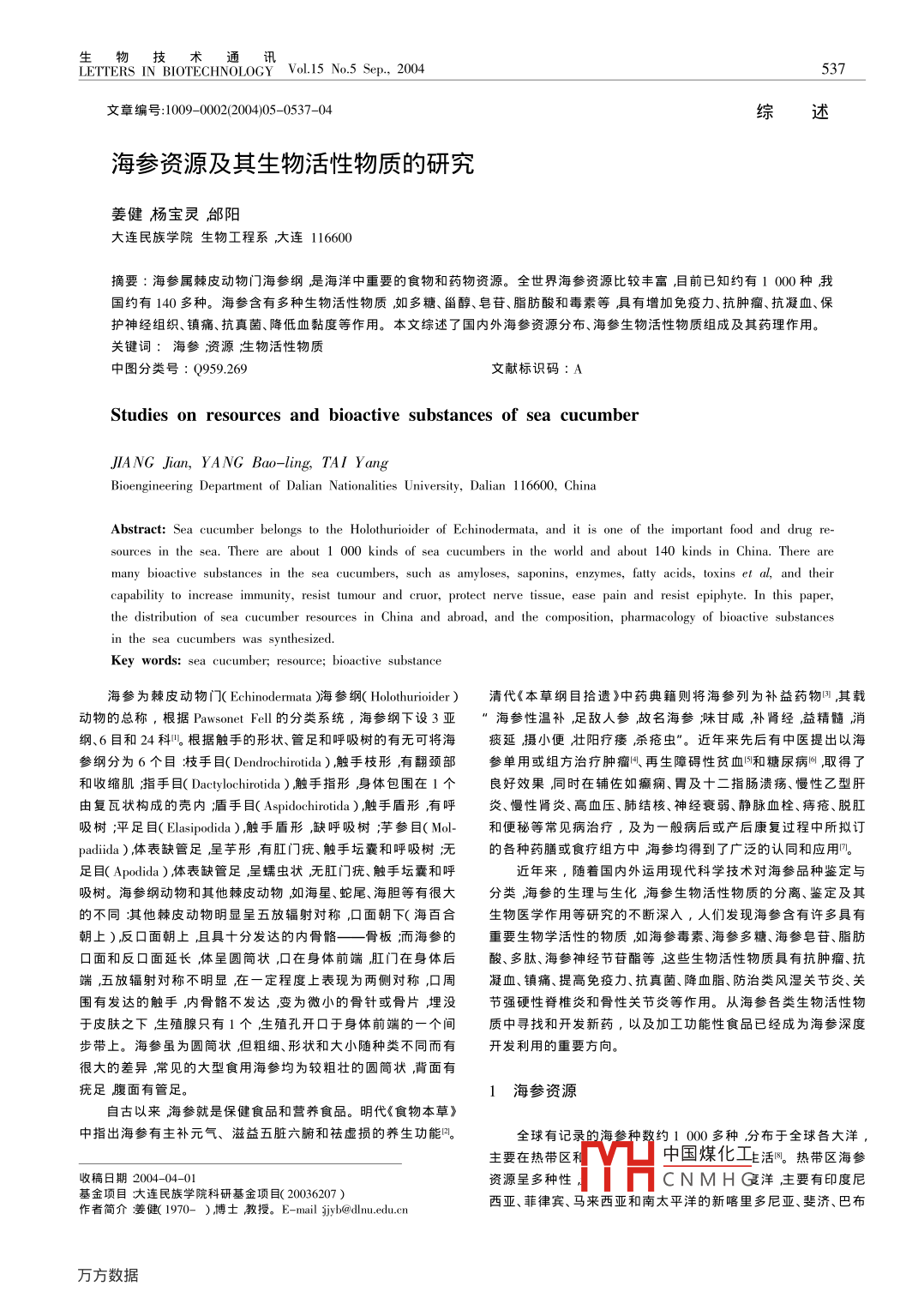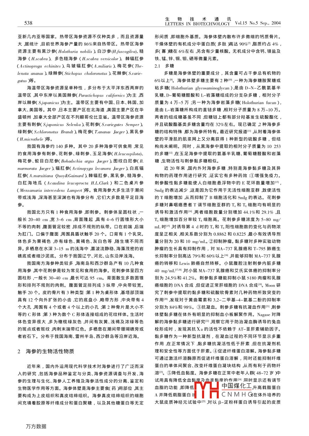 物技術(shù)通訊ERS IN BIOTECHNOLOGY Vol 15 No 5 Sep, 2004文章編號:1009-0002(200405-0537-04綜述海參資源及其生物活性物質(zhì)的研究姜健楊寶靈邰陽大連民族學(xué)院生物工程系大連116600摘要:海參屬棘皮動物門海參綱是海洋中重要的食物和藥物資源。全世界海參資源比較豐富,目前已知約有1000種我國約有140多種。海參含有多種生物活性物質(zhì)如多糖、甾醇、皂苷、脂肪酸和毒素等具有増加免疫力、抗腫瘤、抗凝血、保護(hù)神經(jīng)組織、鎮(zhèn)痛、抗真菌、降低血黏度等作用。本文綜述了國內(nèi)外海參資源分布、海參生物活性物質(zhì)組成及其藥理作用。關(guān)鍵詞:海參資源泩生物活性物質(zhì)中圖分類號:Q959.269文獻(xiàn)標(biāo)識碼:AStudies on resources and bioactive substances of sea cucumberJIANG Jian, YANG Bao-ling, TA/ YangBioengineering Department of Dalian Nationalities University, Dalian 116600, ChinaAbstract: Sea cucumber belongs to the Holothurioider of Echinodermata, and it is one of the important food and drug re-sources in the sea. There are about 1 000 kinds of sea cucumbers in the world and about 140 kinds in China Theremany bioactive substances in the sea cucumbers, such as amyloses, saponins, enzymes, fatty acids, toxins et al, and theircapability to increase immunity, resist tumour and cruor, protect nerve tissue, ease pain and resist epiphyte. In this paper,the distribution of sea cucumber resources in China and abroad, and the composition, pharmacology of bioactive substancesthe sea cucumbers was synthesizedKey words: sea cucumber; resource; bioactive substance海參為棘皮動物門( Echinodermata)海參綱( Holothurioidea)清代《本草綱目拾遺》中藥典籍則將海參列為補(bǔ)益藥物,其載動物的總稱,根據(jù) Pawsonet Fell的分類系統(tǒng),海參綱下設(shè)3亞”海參性溫補(bǔ),足敵人參故名海參味甘咸補(bǔ)腎經(jīng),益精髓消6目和24科根據(jù)觸手的形狀、管足和呼吸樹的有無可將海痰延攝小便壯陽療痿殺瘡蟲。近年來先后有中醫(yī)提岀以海參綱分為6個目技手目( Dendrochirotida),觸手枝形,有翻頸部參單用或組方治療腫瘤、再生障礙性貧血和糖尿病取得了和收縮肌指手目(υ actylochirotida)觸手指形身體包圍在Ⅰ個良好效果同時在輔佐如癲癇、胃及十二指腸潰瘍、慢性乙型肝由復(fù)瓦狀構(gòu)成的殼內(nèi)盾手目( Aspidochirotida),觸手盾形有呼炎、慢性腎炎、高血壓、肺結(jié)核、神經(jīng)衰弱、靜脈血栓、痔瘡、脫肛吸樹泙平足目( Elasipodida),觸手盾形,缺呼吸樹渫芋參目(Ml-和便秘等常見病治療,及為一般病后或產(chǎn)后康復(fù)過程中所擬訂padina)體表缺管足呈芋形,有肛門疣、觸手壇囊和呼吸樹沅的各種藥膳或食療組方中海參均得到了廣泛的認(rèn)同和應(yīng)用足目( Apodida)體表缺管足呈蠕蟲狀無肛門疣、觸手壇囊和呼近年來,隨著國內(nèi)外運用現(xiàn)代科學(xué)技術(shù)對海參品種鑒定與吸樹。海參綱動物和其他棘皮動物如海星、蛇尾、海膽等有很大分類海參的生理與生化海參生物活性物質(zhì)的分離、鑒定及其的不同淇其他棘皮動物明顯呈五放輻射對稱,口面朝下(海百合生物醫(yī)學(xué)作用等研究的不斷深入,人們發(fā)現(xiàn)海參含有許多具有朝上)反口面朝上,且具十分發(fā)達(dá)的內(nèi)骨骼——骨板洏而海參的重要生物學(xué)活性的物質(zhì)如海參毒素、海參多糖、海參皂苷、脂肪口面和反口面延長,體呈圓筒狀,口在身體前端肛門在身體后酸、多肽、海參神經(jīng)節(jié)苷酯等這些生物活性物質(zhì)具有抗腫瘤、抗端,五放輻射對稱不明顯在一定程度上表現(xiàn)為兩側(cè)對稱,口周凝血、鎮(zhèn)痛、提髙免疫力、抗真菌、降血脂、防治類風(fēng)濕關(guān)節(jié)炎、關(guān)有發(fā)達(dá)的觸手內(nèi)骨骼不發(fā)達(dá)變?yōu)槲⑿〉墓轻樆蚬瞧?埋沒節(jié)強(qiáng)硬性脊椎炎和骨性關(guān)節(jié)炎等作用。從海參各類生物活性物于皮膚之下生殖腺只有1個生殖孔開口于身體前端的一個間質(zhì)中尋找和開發(fā)新藥,以及加工功能性食品已經(jīng)成為海參深度步帶上。海參雖為圓筒狀但粗細(xì)、形狀和大小隨種類不同而有開發(fā)利用的重要方向。很大的差異,常見的大型食用海參均為較粗壯的圓筒狀背面有疣足腹面有管足海參資源自古以來海參就是保健食品和營養(yǎng)食品。明代《食物本草》中指出海參有主補(bǔ)元氣、滋益五臟六腑和祛虛損的養(yǎng)生功能凹全球有記錄的海參種數(shù)約1000多種分布于全球各大洋主要在熱帶區(qū)利中國煤化工主活叫。熱帶區(qū)海參收稿日期200404-01資源呈多種性CNMH夏洋主要有印度尼基金項目大連民族學(xué)院科研基金項目(20036207)作者簡介姜做1970-)博士教授。E-mailSjyb@dlnu.edu.cn西亞、菲律賓、馬來西亞和南太平洋的新喀里多尼亞、斐濟(jì)、巴布生物技術(shù)通訊538LETTERS IN BIOTECHNOLOGY Vol 15 No 5 Sep, 2004亞新幾內(nèi)亞等國家。熱帶區(qū)海參資源不僅種類多,而且資源量形間質(zhì)即細(xì)胞外基質(zhì)。海參體壁內(nèi)散布許多微細(xì)的鈣質(zhì)骨片。大據(jù)統(tǒng)計,目前世界海參產(chǎn)量的86%來自熱帶區(qū)。熱帶區(qū)海參干燥體璧的有杋成分中蛋白質(zhì)(多肽熇達(dá)9%脂質(zhì)約占4%資源主要有黑沙參( Holothuriaπ bilisλ白沙參(Ⅶ . fuscogilva、糙多寡廳在6%左右另含有少量核酸。無機(jī)成分中含鈣、鎂鹽及海參(H. sabre)多色