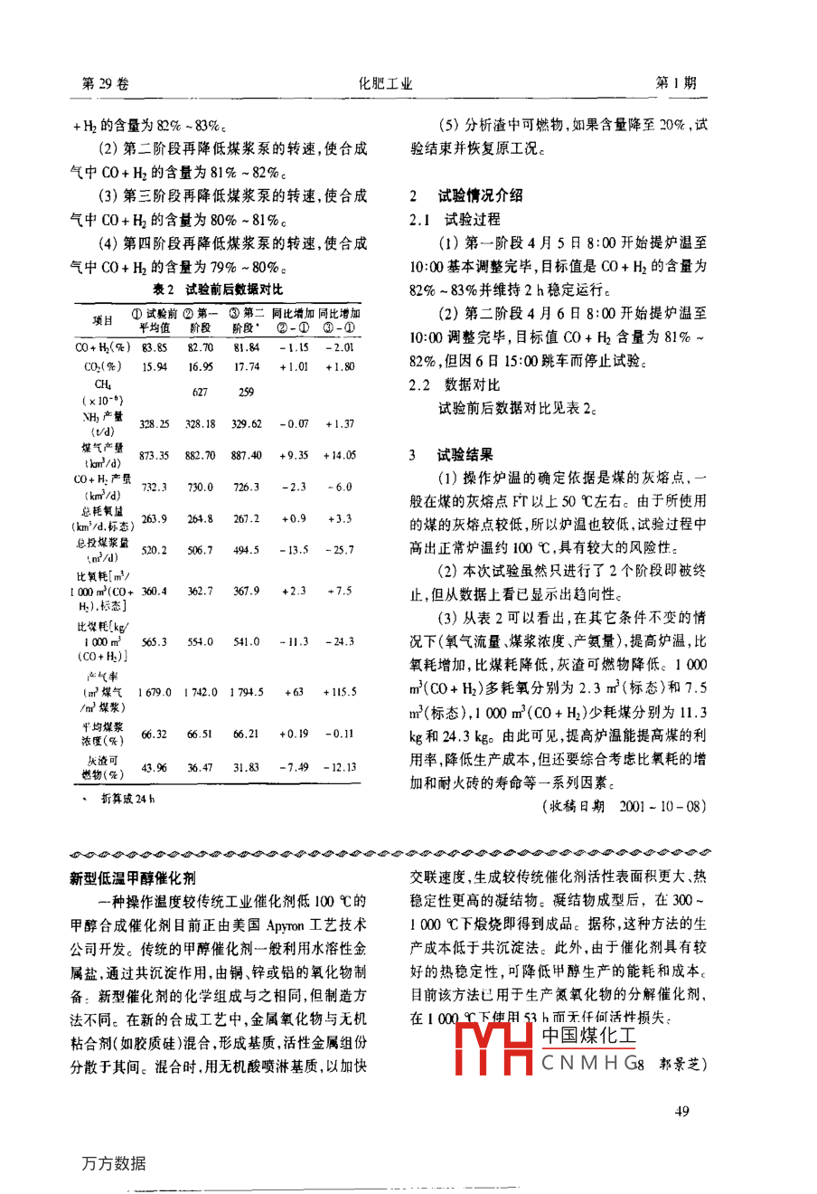 第29卷化肥工業(yè)第1期德士古氣化爐的提溫操作金剛張濤(山東省兗礦魯南化肥廠滕州277527)摘要通過更換煤種使生產(chǎn)消耗得到了大幅度降低,生產(chǎn)能力得到了較大的捉高,但渣中可燃物較設(shè)計標(biāo)提高了2-3倍。為此進(jìn)行了提高爐溫的試驗,考察渣中可燃物隨爐溫的變化關(guān)系,同時考核不同渣中可然物含量下的氧耗和煤耗。關(guān)鍵詞德士古氣化爐灰渣可燃物操作溫度兗礦魯南化肥廠的德士古氣化裝置自1993本次試驗的主要日的是考察渣屮可燃物隨爐年4月試車以來進(jìn)行了較多的技術(shù)改造,生產(chǎn)能溫的變化關(guān)系,同時考核不同渣中可燃物含量下力由年產(chǎn)8萬t合成氨提高到年產(chǎn)10.7t,生產(chǎn)用的氧耗煤耗ε煤由原來的單一“七五"煤發(fā)展成多礦點混煤。隨1.2試驗原則及注意事項著生產(chǎn)產(chǎn)量的提高、使用煤種的增多,灰渣中可燃(1)本次試驗氧氣流量不變、壓力保持穩(wěn)定物含量也有所升高(表1)。分析其原因,認(rèn)為操在(3.8±0.05)MPa,氧氣純度在9.6%以上,通作爐溫過低是主要因素,因此在200年4月進(jìn)行過逐漸降低煤漿泵轉(zhuǎn)速以提高O/C伯,最終達(dá)到了提高爐溫的試驗工作提溫之目的。表1不同煤種灰渣可燃物含量(2)以合成氣中C+H2的百分含量每降低項1993年194年1995年1996年1998年%為一個階段,每個階段穩(wěn)定運行24h,每個階北i段從8:00開始,氣體分析又增加了9:00和1:00北宿北宿楊落陵≯落2次(原是每個雙點分析1次)(3)爐溫提升應(yīng)緩慢,煤漿泵轉(zhuǎn)速應(yīng)緩慢降燃物)10-1515-202530操作溫1450I400140013501350(4)試驗時應(yīng)嚴(yán)格監(jiān)視合成氣溫度(≤℃)、合成氣成份、支撐板溫度(≤25℃)、爐壁溫度(≤260℃)、甲烷含量、排渣情況等,在上述參1試驗方案的制定數(shù)不出現(xiàn)異常時才能進(jìn)行下一步的試驗,否則試本次系統(tǒng)運行從200年3月11日開始,試驗終止。驗時系統(tǒng)運行穩(wěn)定,各項指標(biāo)已得到優(yōu)化,試驗結(jié)(5)儀表車間應(yīng)保持在線甲烷表的準(zhǔn)確性,果應(yīng)是具有代表性的并每天校驗1次德士古氣化爐高溫?zé)犭娕嫉氖褂脡勖话悴?6)試驗期間灰渣取樣每班2次(原每班1超過1周。本次試驗選在非初始開車階段熱電次),分別在接班后的第三第六小時取樣:煤質(zhì)分偶已不能指示,只能以氣體成份為參考來標(biāo)定爐析室分白班、中班隨時分析,分析結(jié)果及時上報至溫。盡管甲烷含量能較快地反映爐溫,但變化較相關(guān)部門決,受系統(tǒng)其它因素影響較大。CO+H2的百分含(7)試驗期間操作人員應(yīng)真實地記錄工藝參量隨爐溫的升高而降低,雖變化慢一些,但受其它數(shù),認(rèn)真巡回檢查,氣化爐壁溫每2小時用紅外測因素干擾小,爐溫與CO+H2含量的對應(yīng)關(guān)系較溫儀實測1次為確定,再現(xiàn)性較好,所以選定以CO+H的含量1L凵中國煤化工標(biāo)定爐溫CNMHG+H2=83.85%),1.1試驗?zāi)康闹鸩浇档兔簼{泵轉(zhuǎn)速,提高OC值,使合成氣中第29卷化肥工業(yè)第期+H2的含量為8%-83%c(5)分析渣中可燃物,如果含量降至20%,試(2)第二階段再降低煤漿泵的轉(zhuǎn)速,使合成驗結(jié)束并恢復(fù)原工況氣中CO0+H2的含量為81%~82%c(3)第三階段再降低煤漿泵的轉(zhuǎn)速,使合成2試驗情況介紹氣中CO+H2的含量為80%~81%c2.1試驗過程(4)第四階段再降低煤漿泵的轉(zhuǎn)速,使合成(1)第一階段4月5日8:00開始提爐溫至氣中CO+H2的含量為79%~80%。10:00基本調(diào)整完畢,目標(biāo)值是CO+H2的含量為2試驗前后數(shù)據(jù)對比82%~83%并維持2h穩(wěn)定運行項日①試驗前②第一③第二同比增加同比增加(2)第二階段4月6日8:00開始提爐溫至段C0+H(%)83.8582.708184-1.15-2.0110:00調(diào)整完畢,目標(biāo)值CO+H含量為81%O2(%)159416.9517.74+1.01+1.8082%,但因6日15:00跳車而停止試驗2.2數(shù)據(jù)對比H2產(chǎn)量試驗前后數(shù)據(jù)對比見表2t/d)3825328.18329.62-007+1.37煤氣產(chǎn)量km/d873.35882,70887,40+935+14.053試驗結(jié)果CO+H產(chǎn)量0726.3(1)操作爐溫的確定依據(jù)是煤的灰熔點,般在煤的灰熔點FT以上50℃左右。由于所使用263.9264.8267.2+0.9+3.3的煤的灰熔點較低,所以爐溫也較低,試驗過程中總投煤漿量520.2506,7494.5高出正常爐溫約100℃,具有較大的風(fēng)險性比氧耗[m3(2)本次試驗雖然只進(jìn)行了2個階段即被終0m3(CO+360.436273679+23+75止,但從數(shù)據(jù)上看已顯示出趨向性H2)標(biāo)態(tài)]3)從表2可以看出,在其它條件不變的情565.3554.0541.0.3-24.3況下(氧氣流量、煤漿濃度、產(chǎn)氨量),提高爐溫,比(CO+H: )氧耗增加,比煤耗降低,灰渣可燃物降低ε100m3煤氣1679.01742.0179.5+63+115.5m3(CO+H2)多耗氧分別為23m3(標(biāo)態(tài))和75m煤漿)標(biāo)態(tài)),1000m3(C0+H2)少耗煤分別為1l3平均煤漿濃度(66,326.5166.21+0.19-0.1lkg和24-.3kg。由此可見,提高爐溫能提高煤的利灰渣可燃物(袋)439364731.83-749-12.13用率,降低生產(chǎn)成本,但還要綜合考慮比氧耗的增加和耐火磚的壽命等一系列因素折算成24h收稿日期001-10-08)心必必必必必分心辦必必辦?、诒乇丌谵k價命必必必必分必必必必②分分必分新型低溫甲醇催化劑交聯(lián)速度,生成較傳統(tǒng)催化劑活性表面積更大、熱種操作溫度較鉸傳統(tǒng)工業(yè)催化劑低100℃的穩(wěn)定性更高的凝結(jié)物。凝結(jié)物成型后,在300甲醇合成催化劑目前正由美國 Apron工藝技術(shù)100℃