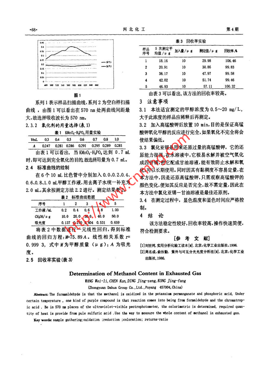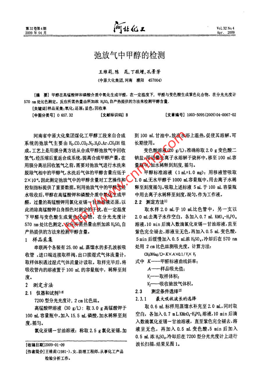 第32卷第4期VoL32 Na42009年04 月河北化工Apr.2009弛放氣中甲醇的檢測(cè)王維莉,陳昆, 丁敬增,孔景芳(中原大化集團(tuán),河南濮陽(yáng)457004)[摘要] 甲醇在高錳酸鉀和磷酸介質(zhì)中氧化生成甲醛,在一-定溫度下, 甲醛與色酸生成紫色化合物,在分光光度計(jì)570 m處比色測(cè)定。反應(yīng)所靄熱量由所加濃H.SO,產(chǎn)熱提供的方法來(lái)檢測(cè)甲醇含量.[關(guān)鍵詞]樣品采集;氧化;還原:顯色:回收率[中圖分類號(hào)] 0 657. 32[文獻(xiàn)標(biāo)識(shí)碼] B[文章編號(hào)] 1003-5095(2009)04-0067-02河南省中原大化集團(tuán)煤化工甲醇工段來(lái)自合成到100 mL甘油中,放在水浴上溫?zé)?促使其溶解,可系統(tǒng)的弛放氣主要由H2、CO、CO2N2H2O、Ar.、CH.OH組長(zhǎng)期使用。成。工藝上是用膜分離方法從合成甲醇弛放氣中回收變色酸溶液(20 g/L):準(zhǔn)確稱取2.0 g變色酸二氫氣,經(jīng)壓縮后重返合成系統(tǒng),提高合成甲醇產(chǎn)量.在鈉鹽,用適量去離子水溶解于燒杯中,移至100 mL容用膜分離法回收氫氣之前,需要對(duì)弛放氣進(jìn)行水洗來(lái)量瓶中,加水稀釋到刻度,搖勻。脫除氣相中的甲醇?xì)?水洗后氣體的甲醇含量應(yīng)低于甲醇標(biāo)準(zhǔn)溶液(1mL=1.0 mg):用移液管吸取2X 10%.因此測(cè)定弛放氣中的甲醇含量對(duì)工藝操作和1.0 mL無(wú)水甲醇于1000 mL容量瓶中,用去離子水稀控制指標(biāo)提供了重要數(shù)據(jù)。利用弛放氣中的甲醇?xì)饨?jīng)釋至刻度搖勻。吸取上述標(biāo)液5ml于100 ml容量瓶水吸收后,甲醇在高錳酸鉀和磷酸介質(zhì)中氧化生成甲中用去離子水稀釋至刻度,混勻,作為工作液。醛,過量的高錳酸鉀用氯化亞錫-甘油溶液還原,以2.2測(cè)定方法叩此消除高錳酸鉀自身顏色對(duì)測(cè)定的干擾,在一-定溫度取水樣2.0 m于10 mL比色管中,另一-支以下甲醛與變色酸生成紫色化合物,在分光光度計(jì)2.0 m去離子水作空白,各加入0.7 ml KMO,-H.PO.570 nm處比色測(cè)定。反應(yīng)所需熱量由所加濃HSO,自溶液,10 min后滴入數(shù)滴氯化亞錫一甘油溶液,直至產(chǎn)熱提供的方法來(lái)檢測(cè)甲醇含量。紫色完全褪去,溶液呈無(wú)色,再加入0.5 ml變色酸,1樣品采集5 min后緩慢加入0.5 mL濃H2SO,冷卻后在570 nm串聯(lián)兩個(gè)各裝有25. 00 mL蒸餾水的多孔波板吸處用2 cm比色皿測(cè)吸光度。計(jì)算方法:收管,進(jìn)口端連接取樣閥,出口接濕式氣體流量計(jì),CHJOH@g/D= KXAXQ1/VX %取樣體積通過濕式氣體流量計(jì)讀取。取樣完畢后,將式中K- - -甲醛標(biāo)液曲線斜率;吸收管內(nèi)的溶液置于100 mL的容量瓶中,稀釋至刻A--樣品吸光值;V- -一取樣體積; .2測(cè)定方法V- -吸收馳放氣體積。2.1儀器和試劑1.212.3測(cè)定條件選擇∞7200型分光光度計(jì), 2 cm比色皿。2.3.1最大吸收波長(zhǎng)的選擇高錳酸鉀溶液(30 g/L):取3.0 g高錳酸鉀于取0.6 mL標(biāo)樣用蒸餾水補(bǔ)充至2.0 ml,同時(shí)取100 ml容量瓶中,加入15. 5 mL磷酸,加水稀釋至刻空白,各加入0.7 mL KMn0;-HIPO溶液, 10 min后滴度,搖勻。.入數(shù)滴氯化亞錫-甘油溶液,直至紫色完全褪去,溶氯化亞錫一甘油溶液:稱取2.5 g氯化亞錫,加液呈無(wú)色,再加入0.5 mL變色酸,5 min 后加入0.5 mL濃HsSO,冷卻后在7200型分光光度計(jì)上進(jìn)行[收稿日期]2009-01-09波長(zhǎng)掃描,結(jié)果見圖1。[作者簡(jiǎn)介]王維莉(1981-),女助理工程師,從事化工產(chǎn)品檢驗(yàn)分析工作。