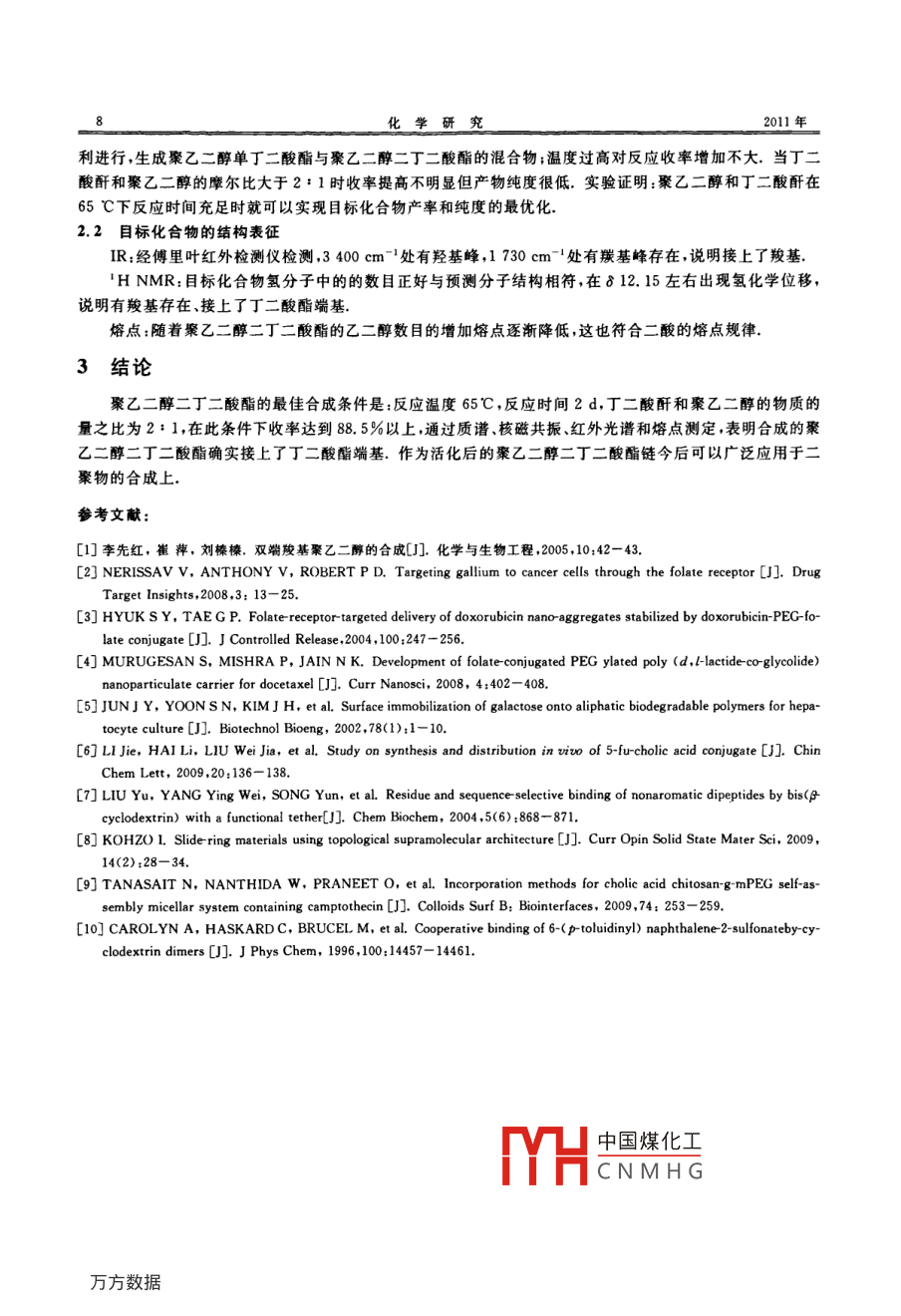 第22卷第2期中國科技核心期刊2011年3月CHEMICAL RESEARCHhxyj@henu.edu.cn聚乙二醇二丁二酸酯的合成李殿秀13,袁保重2…3,馬金飛13,王平安3,邱禎13,代本才3,趙永德(1.河南大學化學化工學院,河南開封475004;2.河南工業(yè)大學化學化工學院,河南鄭州4500013.河南省科學院化學研究所,河南鄭州450002)摘要:聚乙二醇在藥物合成上有很廣泛的用途,但其端羥基的活性相對較低,直接應用受到限制.若將羥基活化為羧基則可以擴大其應用范圍;尤其是在合成二聚物時,將疏水鏈換成親水的聚乙二醇二丁二酸酯鏈可以增加橋鏈的親水性,為此,以聚乙二醇、丁二酸酐為反應物,以吡啶為溶劑,分別合成了一縮二乙二醇二丁二酸酯二縮三乙二醇二丁二酸酯、三縮四乙二醇二丁二酸酯關鍵詞:聚乙二醇;丁二酸酐;吡啶;合成中圖分類號:O623.2文獻標志碼:A文章編號:1008-1011(2011)02-0006-03Synthesis of polyethylene glycol disuccinateLI Dian-xiu" 2, YUAN Bao-zhong MA Jin-fei, WANG Ping-an.3QIU Zhen, DAI Ben-cai, ZHAO Yong-de(1. College of Chemistry and Chemical Engineering, Henan University, Kaifeng 475004, Henan, China2. College of Chemistry and Chemical Engineering, Henan Polytechnical University, Zhengzhou 450001, Henan, China3. Institute of Chemistry, Henan Academy of Sciences, Zhengzhou 450002, Henan, China)Abstract: Polyethylene glycol (PEG) is widely applied to synthesize drug. However, its directapplication is limited due to low activity of terminal hydroxyl groups. This means that the application field of Peg can be extended under the condition that the hydroxyl groups are conver-ted to active carboxyl groups, Particularly, it is feasible to enhance the bridge chain's hydrophilicity when substituting hydrophobic chain with hydrophilic chain during the synthesis of thepolymers. Therefore, diethylene disuccinate, triethylene disuccinate and tetraethylene disucci-nate were synthesized by using PEG and succinic anhydride as the starting matKeywords: polyethylene glycol; succinic anhydride; pyridine; synthesis聚乙二醇作為一種兩親性聚合物既可以溶于水,又可溶于大多數(shù)有機溶劑具有生物相容性好、性質(zhì)穩(wěn)定、無副作用、免疫原性低等特點,當聚乙二醇偶聯(lián)到藥物分子或藥物表面時,可以將許多優(yōu)異性能賦予被修飾的物質(zhì),改變它們在水溶液中的生物分配行為和溶解性,在其修飾的藥物周圍產(chǎn)生空間屏障,減少藥物的酶解,避免在腎臟的代謝中很快消除,并使藥物能被免疫系統(tǒng)的細胞識別.聚乙二醇常用來修飾蛋白質(zhì)、多肽、脂質(zhì)體和小分子有機物等藥物材料.聚乙二醇端基是反應活性較低的羥基,只能在較激烈的條件下與其他基團發(fā)生反應,易破壞被修飾物,實際應用時常需先進行活化.聚乙二醇傳統(tǒng)活化方法有氧化酯化法等口.由于羧酸的羧基化學性質(zhì)比較活潑,可以轉(zhuǎn)變?yōu)轷ヵ0孵B群退狒纫幌盗谢衔?所以在合成上用途很廣.把聚乙二醇活化為羧基在合成上具有重要應用意的一元物酸的反應非常多元羧酸的反應相對少些-8,二元羧酸中有兩個可解離的氫,中國煤化工此二元羧酸作為聚體的中間物應用前景非常廣,文獻報道用丁二酸酐和聚CNMHG9),本文作者采用收稿日期:2010-11-22.者簡介:李殿秀(1979-)男碩士生,主要從事膽酸和環(huán)糊精術生物研究.E-mail:dianxiul@163.com李殿秀等;聚乙二醇二丁二酸酯的合成丁二酸酐對分子量小的聚乙二醇進行活化,制得了聚乙二醇二丁二酸酯,并經(jīng)結(jié)構分析證實,除端基發(fā)生改變外,沒有在聚乙二醇分子鏈上引入其他基團,從而避免影響被修飾物的活性聚乙二醇二丁二酸鏈相對于烷基鏈來說親水性比較強,用其連接二聚物時可以增加親水性. Carolyn A等用烷基二酰氯與兩分子單(6氨基6去氧)P環(huán)糊精反應生成二聚酰胺環(huán)糊精,該系列化合物對客體分子鍵合能力一般隨著主體橋鏈長度的增加而逐漸減弱.若烷基換成聚乙二醇二丁二酸鏈,可以增加其對客體分子的鍵合能力,親水性大大增加作者研究了聚乙二醇酸酯的合成,以期增加二聚物鏈的親水性,這些化合物通過HNMR、IR和MS等方法確認結(jié)構.具體合成路線如圖1所示65℃圖1聚乙二醇二丁二酸酯的合成Fig. 1 Synthesis of polyethylene glycol disuccinate1實驗部分1.1試劑與儀器一縮二乙二醇、二縮三乙二醇(國藥集團化學試劑公司),三縮四乙二醇(天津 Alfa-Aesar試劑有限公司),丁二酸酐(上海晶純實業(yè)有限公司阿拉丁試劑)吡啶(AR),乙醚(AR); Bruker ace-300型核磁共振儀(TMS為內(nèi)標), Perkin-Elmer FT-IR1750型紅外光譜儀, Bruker Esquire300型質(zhì)譜儀,X-4型數(shù)顯顯微熔點測定儀(溫度未經(jīng)校正)1.2目標化合物的合成1.2.1二乙二醇二丁二酸酯的合成縮二乙二醇1.06g(10mmol)溶于30mL吡啶中,磁力攪拌下加入丁二酸酐2g(20mmol),65C下反應2d.產(chǎn)物用乙醚萃取(30mL×3),去除未反應的丁二酸酐,旋蒸掉溶劑吡啶,50℃下真空干燥1d得白色固體2.78g,收率為90.8%,mp163~165℃.IR(KBr),v/cm:3453(O- H acid),1727(C=Oester).H NMR(300 MHz, DMSO)8:2.42-4.14(16H,-CH2), 12 17(2H, -COOH). MS (LC-MS)m/z:328.6(M+23 for Na)1.2.2三乙二醇二丁二酸酯的合成二縮三乙二醇1.50g(10mmol)溶于30mL吡啶中,磁力攪拌下加入丁二酸酐2g(20mmol),65℃下反應2d.產(chǎn)物用乙醚萃取(30mL×3),去除未反應的丁二酸酐,旋蒸掉溶劑吡啶,50℃下真空干燥1d得白色固體3.12g,收率為89.1%.mp154~156℃.IR(KBr),vcm-:3448(O- H acid),1732(C=0ester).H NMR(300 MHz, DMSO)&: 2. 41-4. 12(20H, -CH2 ), 12 16(2H, -COOH). MS (LCMS)m/z: 372.6(M+23 for Na)1.2.3四