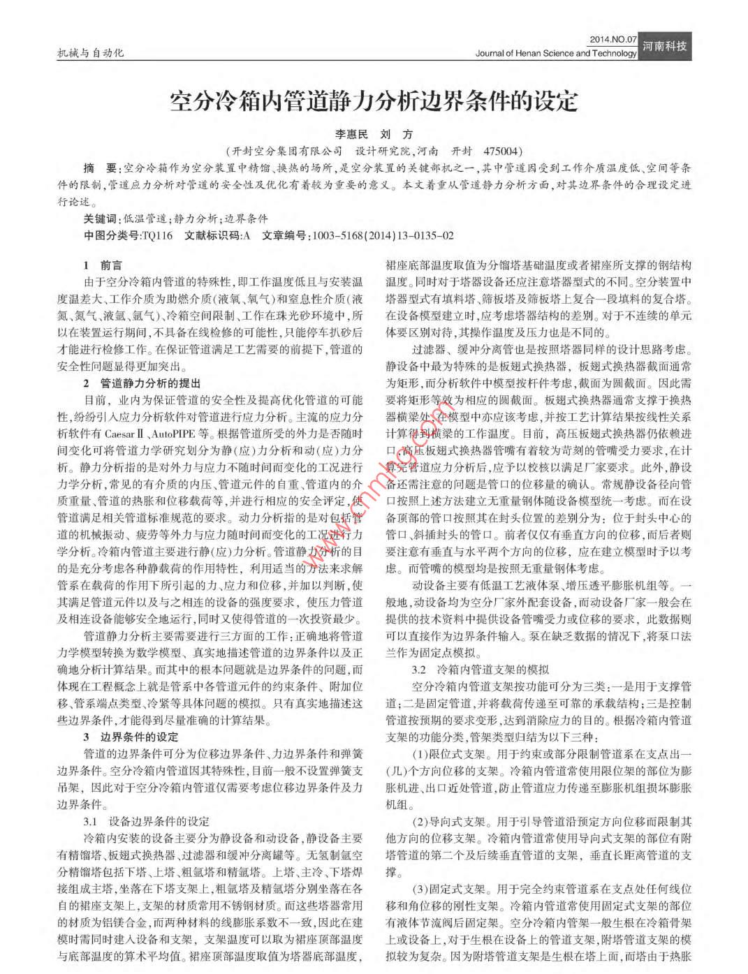 2014N007機械與自動化Joumal of Henan Science and Technology河南科技空分冷箱內(nèi)管道靜力分析邊界條件的設定李惠民劉方(開封空分集團有限公司設計研究院,河南開封475004)摘要:空分冷箱作為空分裝置中精餾、換熱的場所,是空分裝置的關(guān)鍵部杋之一,其中管道因受到工作介質(zhì)溫度低、空間等條」件的限制,管道應力分析對管道的安全性及優(yōu)化有著較為重要的意義。本文著重從管道靜力分析方面,對其邊界條件的合理設定進行論述。關(guān)鍵詞:低溫管道;靜力分析;邊界條件中圖分類號TQ116文獻標識碼:A文章編號:1003-5168(2014)13-0135-021前言裙座底部溫度取值為分餾塔基礎溫度或者裙座所支撐的鋼結(jié)構(gòu)由于空分冷箱內(nèi)管道的特殊性,即工作溫度低且與安裝溫溫度。同時對于塔器設備還應注意塔器型式的不同。空分裝置中度溫差大、工作介質(zhì)為助燃介質(zhì)(液氧、氧氣)和窒息性介質(zhì)(液塔器型式有填料塔、篩板塔及篩板塔上復合一段填料的復合塔。氮、氮氣、液氬、氬氣)、冷箱空間限制、工作在珠光砂環(huán)境中,所在設備模型建立時,應考慮塔器結(jié)構(gòu)的差別。對于不連續(xù)的單元以在裝置運行期間,不具備在線檢修的可能性,只能停車扒砂后體要區(qū)別對待,其操作溫度及壓力也是不同的才能進行檢修工作。在保證管道滿足工藝需要的前提下,管道的過濾器、緩沖分離管也是按照塔器同樣的設計思路考慮安全性問題顯得更加突出。靜設備中最為特殊的是板翅式換熱器,板翅式換熱器截面通常2管道靜力分析的提出為矩形,而分析軟件中模型按桿件考慮,截面為圓截面。因此需目前,業(yè)內(nèi)為保證管道的安全性及提高優(yōu)化管道的可能要將矩形等效為相應的圓截面。板翅式換熱器通常支撐于換熱性,紛紛引入應力分析軟件對管道進行應力分析。主流的應力分器橫梁處,在模型中亦應該考慮,并按工藝計算結(jié)果按線性關(guān)系析軟件有 Caesar I、 AutoPIPE等。根據(jù)管道所受的外力是否隨時計算得到橫梁的工作溫度。目前,高壓板翅式換熱器仍依賴進間變化可將管道力學研究劃分為靜(應)力分析和動(應)力分口,高壓板翅式換熱器管嘴有著較為苛刻的管嘴受力要求,在計析。靜力分析指的是對外力與應力不隨時間而變化的工況進行算完管道應力分析后,應予以校核以滿足廠家要求。此外,靜設力學分析,常見的有介質(zhì)的內(nèi)壓、管道元件的自重、管道內(nèi)的介備還需注意的問題是管口的位移量的確認。常規(guī)靜設備徑向管質(zhì)重量、管道的熱脹和位移載荷等,并進行相應的安全評定,使口按照上述方法建立無重量鋼體隨設備模型統(tǒng)一考慮。而在設管道滿足相關(guān)管道標準規(guī)范的要求。動力分析指的是對包括管備頂部的管口按照其在封頭位置的差別分為:位于封頭中心的道的機械振動、疲勞等外力與應力隨時間而變化的工況進行力管口、斜插封頭的管口。前者僅僅有垂直方向的位移,而后者則學分析。冷箱內(nèi)管道主要進行靜(應)力分析。管道靜力分析的目要注意有垂直與水平兩個方向的位移,應在建立模型時予以考的是充分考慮各種靜載荷的作用特性,利用適當?shù)姆椒▉砬蠼鈶]。而管嘴的模型均是按照無重量鋼體考慮。管系在載荷的作用下所引起的力、應力和位移,并加以判斷,使動設備主要有低溫工藝液體泵、增壓透平膨脹機組等。其滿足管道元件以及與之相連的設備的強度要求,使壓力管道般地,動設備均為空分廠家外配套設備,而動設備廠家一般會在及相連設備能夠安全地運行,同時又使得管道的一次投資最少。提供的技術(shù)資料中提供設備管嘴受力或位移的要求,此數(shù)據(jù)則管道靜力分析主要需要進行三方面的工作:正確地將管道可以直接作為邊界條件輸入。泵在缺乏數(shù)據(jù)的情況下,將泵口法力學模型轉(zhuǎn)換為數(shù)學模型、真實地描述管道的邊界條件以及正蘭作為固定點模擬確地分析計算結(jié)果。而其中的根本問題就是邊界條件的問題,而3.2冷箱內(nèi)管道支架的模擬體現(xiàn)在工程概念上就是管系中各管道元件的約束條件、附加位空分冷箱內(nèi)管道支架按功能可分為三類:一是用于支撐管移、管系端點類型、冷緊等具體問題的模擬。只有真實地描述這道;二是固定管道,并將載荷傳遞至可靠的承載結(jié)構(gòu);三是控制些邊界條件,才能得到盡量準確的計算結(jié)果。管道按預期的要求變形,達到消除應力的目的。根據(jù)冷箱內(nèi)管道3邊界條件的設定支架的功能分類,管架類型歸結(jié)為以下三種管道的邊界條件可分為位移邊界條件、力邊界條件和彈簧(1)限位式支架。用于約東或部分限制管道系在支點出邊界條件。空分冷箱內(nèi)管道因其特殊性,目前一般不設置彈簧支(幾)個方向位移的支架。冷箱內(nèi)管道常使用限位架的部位為膨吊架,因此對于空分冷箱內(nèi)管道僅需要考慮位移邊界條件及力脹機進、出口近處管道,防止管道應力傳遞至膨脹機組損壞膨脹邊界條件機組。3.1設備邊界條件的設定(2)導向式支架。用于引導管道沿預定方向位移而限制其冷箱內(nèi)安裝的設備主要分為靜設備和動設備,靜設備主要他方向的位移支架。冷箱內(nèi)管道常使用導向式支架的部位有附有精餾塔、板翅式換熱器、過濾器和