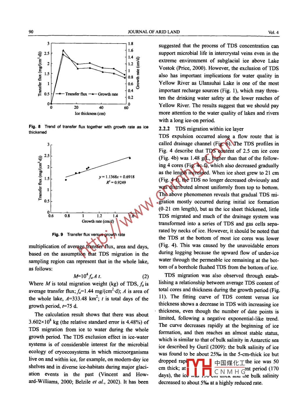 Journal of Arid Land2012, 4(1): 85 -94doi: 10.3724/SP.J.1227.2012.00085Science Pressjal.xjegi.com; www.chinasciencejournal.comThe migration of total dissolved solids during naturalfreezing process in Ulansuhai LakeYan ZHANG', ChangYou L1", XiaoHong SHI', Chao L1,2'Water Conservancy and Civil Engineering College, Inner Mongolia Agricultural Universit, Huhhot 010018, China;2 Department of Civil and Environmental Engineering, Clarkson University, Potsdam, NY 13699-5710, USAAbstract: High total dissolved solids (TDS) content is one of the most important pollution contributors in lakes inarid and semiarid areas. Ulansuhai Lake, located in Urad Qianqi, Inner Mongolia, China, was selected as the objectof study. Temperatures and TDS contents of both ice and under-ice water were collected together withcorresponding ice thickness. TDS profiles were drawn to show the distribution of TDS and to describe TDS migra-tion. The results showed that about 80% (that is 3.602*108 kg) of TDS migrated from ice to water during the wholegrowth period of ice. Within ice layer, TDS migration only occurred during initial ice-on period, and then perished.The TDS in ice decreased with increasing ice thickness, fllowing a negative exponential-like trend. Within un-der-ice water, the TDS migrated from ice-water interface to the entire water column under the effect of concentra-tion gradient until the water TDS content was uniform. In winter, 6.044x10' kg (16.78% of total TDS) TDS migratedfrom water to sediment, which indicated that winter is the best time for dredging sediment. The migration effectgives rise to TDS concentration in underice water and sediment that is likely to affect ecosystem and water qualityof the Yellow River. The trend of transfer flux of ice water and water- sediment interfaces is similar to that of icegrowth rate, which reveals that ice growth rate is one of the determinants of TDS migration. The process andmechanism of TDS migration can be referenced by research on other lakes with similar TDS content in cold andarid areas.Keywords: arid and semiarid areas; Ulansuhai Lake; total dissolved solids (TDS) migration; natural freezing process; transferflux; ice growth rateLakes in arid and semiarid areas are not only anal, 201 1) than to pollution characteristics of ice-cov-indicator of climate change, but also an important linkered lakes. Mirono and Terzhevik (2000) concludedof water cycle. They have a great effect on ecologicalthat the conductivity of the lake ice was 10%- -20% ofenvironment change (Li et al, 2007). High total dis-that of the lake water in Lake Paajarvi. Huang et al.solved solids (TDS) content is one of the most impor-(2009) described the distribution patterm of nutrientstant pollution contributors because of lttle precipita-and phytoplankton during the icebound season intion, insufficient supply of surface runoff and com-Changchun, China. Roger and Gregory (2009) showedparatively great evaporation intensity in these areasthe effect of pollutant exclusion from lake ice on sea-(Tao, 2001; Wang and Sun, 2007). TDS characteris-sonal circulation. However, TDS migration and col-tics during ice-off period have long been a focus ofmn distribution patterm during ice-on period are notresearch, which mostly concentrated on distribution,well known, and have received lttle attention frommigration and environmental effects (Gupta andresearchers, leading to lacked studies on pollutionDeshpande, 2003; Zhou et al, 2007; Han et al, 2009).mechanism and TDS process in winter.In general, the studies on lake ice paid more attentionDue to man中國煤化工intensity andto the process of ice growth process (Fang et al, 1996;:MYHCNMH GMirono et al, 2002; liescu and Baker, 2007; Jiang et*Corresponding author: ChangYou LI (E mail: ndlichangyou@163.com)36JOURNAL OF ARID LANDVol. 4.heat exchange, the characteristics of TDS pollutionhe largest lake at the same latitude on the earth. Induring the ice-on period may be different from thoserecent years, the water supply to Ulansuhai Lake hasin the ice-free period (Belzile et al, 2002; Lu et al,been decreasing due to climate change and the irriga-2010). Ulansuhai Lake, which is a typical representa-tion quota adopted in Hetao irrigation area, and thetive of lakes in arid and semiarid areas, was selectedwater level has been continuously falling. Meanwhile,as the subject of study to measure TDS content ofTDS pollution has been worsening and industrialboth ice and under-ice water as ice thickened. Thewastewater of high TDS content was drained into thestudy focused on the following two questions: (1)lake (Ren et al, 2008).How and in what volume did TDS migrate amongRegional meteorologic statistics in Urad Qianqiice-water-sediment system during the whole freeze-upshow that in the region of Ulansuhai Lake the meanperiod? (2) Why did TDS migrate and what did theannual air temperature is 6.6°C. The warmest month ismigration imply? The results of this work can be ref-July (24.6°C) and the coldest is January (-10.2°C).erenced by research on other lakes with similar TDSThe average air temperature from November to Feb-content in cold and arid areas.ruary is below 0°C. Ice season lasts for 5- 6 months inUlansuhai Lake, from November/December to April,1 Materials and methodsand the maximum annual ice thickness ranges from 401.1 Study areato 70 cm. In winter, after ice formation, the lake turnsinto a calm water body in which water turbulence andUlansuhai Lake (40936'-41903N, 10843-108*57E)circulation activities are weak. The annual precipita-is located in Urad Qianqi, Inner Mongolia, China andtion is 219.5 mm and 67.9% of it falls between Julyit is part of Hetao irigation system which takes aboutand September. The anual evaporation is 1,396.3 mm5x108 m3 of water from the Yellow River. A complexby E601 evaporator and 47.4% of it occurs betweensource of water, including domestic and industrialMay and July.wastewater from neighboring areas, is drained into thelake Fig. 1). The t