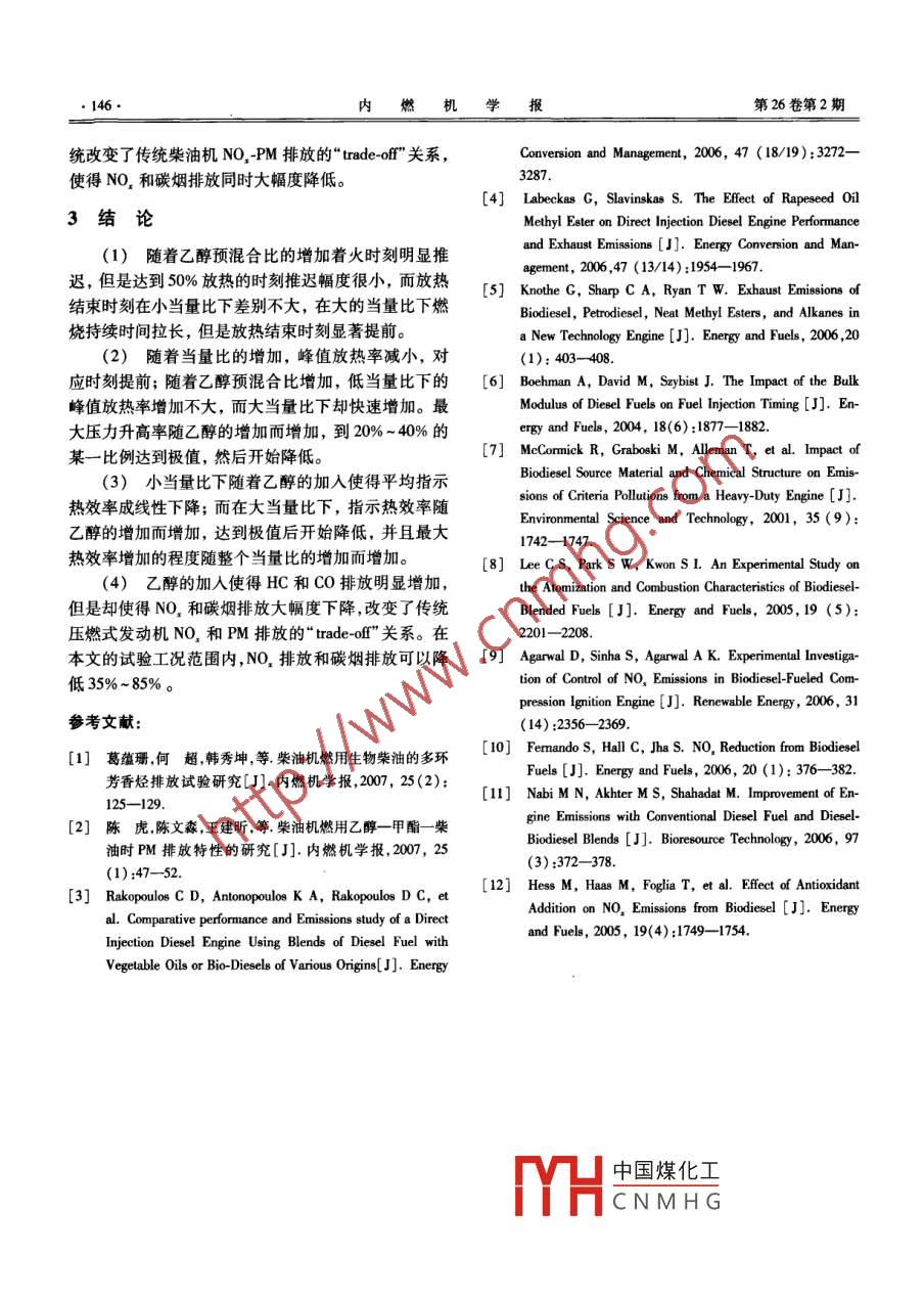 第26卷(2008)第2期內(nèi)燃機(jī)學(xué)報(bào)Transactions of CSICEvol.26(2008)N.2文章編號(hào):1000-0909(2008)02-0140-0726021乙醇/生物柴油雙燃料發(fā)動(dòng)機(jī)燃燒過(guò)程與排放特性的研究呂興才,馬駿駿,吉麗斌,黃震(上海交通大學(xué)動(dòng)力機(jī)械及工程教育部重點(diǎn)實(shí)驗(yàn)室,上海200240摘要:研究了氣口預(yù)噴射乙醇、缸內(nèi)直噴生物柴油雙燃料系統(tǒng)的燃燒特性和排放特性。研究表明,隨著乙醇預(yù)混合比的增加著火時(shí)刻推遲,峰值放熱率增加。在較小的總當(dāng)量比下,峰值放熱率增加幅度不大,最大氣缸壓力和最高溫度降低,放熱結(jié)束時(shí)刻差別較小。在較大的當(dāng)量比下,燃燒持續(xù)時(shí)間拉長(zhǎng);但隨著乙醇比例的增加峰值放熱率增加很快,放熱結(jié)束時(shí)刻顯著提前,最大壓力升高率在預(yù)混合比例為20%~40%的某點(diǎn)達(dá)到極值,此時(shí)熱效率最高。乙醇的加入使得HC和CO排放明顯增加,但是卻使得NO,和碳煙排放同時(shí)大幅度下降。在1800r/min的各種負(fù)荷下,NO,和碳煙排放相對(duì)純生物柴油降低35%~85%關(guān)鍵詞:生物柴油;乙醇;雙燃料發(fā)動(dòng)機(jī);燃燒;排放中圖分類(lèi)號(hào):TK421文獻(xiàn)標(biāo)志碼:AAn Experimental Study on the Combustion Characteristics and Emissions ofEthanol Bio-Diesel Dual Fuel Combustion EnginesLi Xing- cai, MA Jun-jun, JI Li-bin, HUANG ZhenKey Laboratory for Power Machinery and Engineering of Ministry of EducationShanghai Jiaotong University, Shanghai 200240, China)Abstract: In this study, the combustion and emission characteristics of a dual fuel engine using direct injection of bio-diesel and port injection of ethanol were investigated. The heat release analysis shows thatthe introduction of ethanol fuel bytongslightcreasing in the maximum heat release rate. For a fixed leaner fuel/ air mixture, the peak value of the heatgas pressure and in-cyliThe indicated thermal efficiency decreases with the increase of ethanol proportion. For a rich fuel air mix-tureIncreaseleads to a rapid increase in the maximum heat release rate, and thecombustion duration decreases. The maximum value of heat release rate and the indicated thermal efficiency reach their peak value at the ethanol ratio between 20%-40%. The introduction of the ethanol fuel byport injection leads to the decrease in NO, emission and smoke opacity decreases by 35%-85% for thevestigated operating conditionsKeywords: Bio-diesel; Ethanol; Dual fuel combustion engine; Combustion; Emission引言再生燃料在美國(guó)和歐洲開(kāi)始進(jìn)人應(yīng)用領(lǐng)域,國(guó)內(nèi)也開(kāi)始了大量的研究1-2)。研究表明,用生物柴油部分或?yàn)榱私鉀Q目前的能源短缺和環(huán)境污染問(wèn)題,尋求者完全替代柴油作為柴油機(jī)燃料,發(fā)動(dòng)機(jī)的熱效率與清潔可再生的車(chē)用替代燃料受到越來(lái)越廣泛的重視。柴油相當(dāng)燃油消耗率由于熱值低的原因而稍微升高,生物柴油,一種可以用來(lái)完全或者部分替代柴油的可但是中國(guó)煤化工降低0%左右,CNMHG收稿日期:2007-04-07;修回日期:2007-07-28。基金項(xiàng)目:上海市自然科學(xué)基金資助項(xiàng)目(06ZR4045)。作者簡(jiǎn)介:呂興才,博土, E-mail:lyuc@sju,edu2008年3月目興才等:乙醇/生物柴油雙燃料發(fā)動(dòng)機(jī)燃燒過(guò)程與排放特性的研究瞬態(tài)和穩(wěn)態(tài)工況下的煙度大幅度降低25%~70%,試驗(yàn)釆用雙燃料燃燒系統(tǒng),乙醇通過(guò)安裝在進(jìn)氣降低25%-50%,常規(guī)和非常規(guī)碳?xì)渑欧趴偭亢艿?但管處的汽油噴嘴供給,噴射時(shí)刻和噴射量由電控單元是有一個(gè)明顯的弊端,就是所有生物柴油發(fā)動(dòng)機(jī)的控制;生物柴油采用原柴油機(jī)的噴射系統(tǒng)直接噴入氣NO2排放都有不同程度的上升缸。碳?xì)?HC)排放、氧的濃度、CO、二氧化碳(CO2)、為了揭示生物柴油發(fā)動(dòng)機(jī)NO.排放升高的機(jī)理,NO,通過(guò)氣體分析儀進(jìn)行測(cè)量。煙度采用AVL439進(jìn)Lehman6研究了由于生物柴油的壓縮彈性模數(shù)變化行測(cè)量。氣缸壓力采用 Kistler的6125A型傳感器,采而引起的動(dòng)態(tài)噴射時(shí)刻的變化。 McCormick則在重樣間隔為0.25°CA,每個(gè)試驗(yàn)點(diǎn)采集50個(gè)循環(huán)進(jìn)行示型柴油機(jī)上考察了生物柴油的分子結(jié)構(gòu)特別是脂肪功圖平均不失一般性。本文所有試驗(yàn)是在固定轉(zhuǎn)速酸鏈長(zhǎng)度和不飽和鍵個(gè)數(shù)對(duì)NO.和PM排放的影響。為1800r/min下進(jìn)行。lee③認(rèn)為十六烷值較高使得著火延遲期縮短、燃料含氧促進(jìn)燃燒,最終導(dǎo)致燃燒溫度升高,使得NO,排放2結(jié)果與分析增加。對(duì)乙醇一生物柴油雙燃料燃燒系統(tǒng),由于兩者的此外, Agarwal1對(duì)EGR降低生物柴油發(fā)動(dòng)機(jī)的熱值不同,因此定義了預(yù)混合比(P1)來(lái)表示進(jìn)氣口噴NO.排放進(jìn)行了試驗(yàn)研究; Fernando考察了生物柴射的乙醇熱值占總?cè)剂?乙醇和生物柴油之和)熱值油NO,產(chǎn)生的化學(xué)機(jī)理并分析了NO,的有效降低途的比為徑;Nab.用EGR技術(shù)將生物柴油發(fā)動(dòng)機(jī)的NO降低到原柴油機(jī)的水平。Hes2根據(jù)NO,的產(chǎn)生機(jī)X100%理提出了在生物柴油中加入適量的抗氧化劑,通過(guò)控mBpAuBd +meHu制NO,缸內(nèi)高溫生成途徑的方式來(lái)降低NO,排放。式中:h和m分別為乙醇和生物柴油的循環(huán)消耗
