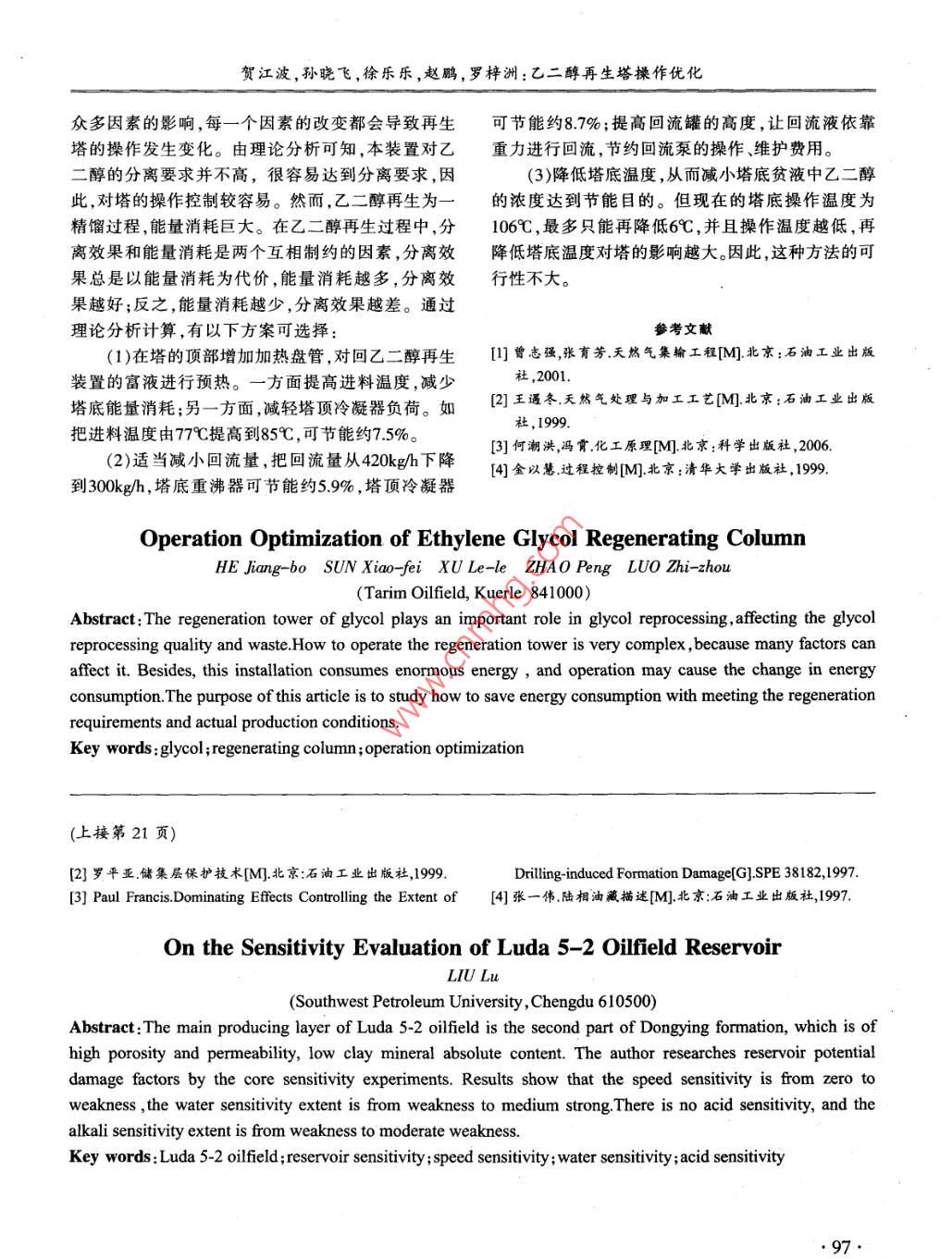 第13卷第4期重慶科技學(xué)院學(xué)報(bào)(自然科學(xué)版)011年8月乙二醇再生塔操作優(yōu)化賀江波孫曉飛徐樂樂趙鵬羅梓洲(中國石油塔里木油田分公司,庫爾勒8410000摘要:在乙二醇再生過程中,分離效果和能量消耗是兩個(gè)互相制約的因素。分析影響再生塔氣液平衡過程中的主要因素,研究在滿足分離要求、滿足生產(chǎn)的條件下,降低能耗、節(jié)約能源的新措施。關(guān)鍵詞:乙二醇;再生塔;回流量;貧液濃度中圖分類號:TQ223文獻(xiàn)標(biāo)識碼:A文章編號:1673-1980(2011)040094-04乙二醇再生塔在乙二醇再生過程中起著重要的部,從重沸器底部出來的貧液(85%,wt)經(jīng)MEG貧富作用,關(guān)系著乙二醇的再生質(zhì)量和損耗,也決定脫水液換熱器換熱后進(jìn)入MEG貧液冷卻器冷卻,冷卻后脫烴裝置能否正常運(yùn)行。再生塔的操作是一個(gè)復(fù)雜MEG貧液由貧液泵送人MEG貧液緩沖罐。緩沖罐內(nèi)的過程,受到眾多因素的影響,每一個(gè)因素的改變都的貧液經(jīng)MEG貧液注入泵分別注入脫水脫烴裝置。會(huì)導(dǎo)致再生塔的操作發(fā)生變化。此外,再生塔還是個(gè)能耗巨大的裝置,任何操作上的變動(dòng)都會(huì)引年D冷卻器起能耗的變化。因此,本文的目的就是研究怎樣在回流罐滿足分離要求、滿足生產(chǎn)的條件下,降低能耗,節(jié)約能源。回流泵1乙二醇再生塔使用概況MEG再生塔富液緩沖罐克拉2氣田中央處理廠采用J_T閥節(jié)流膨脹制冷工藝進(jìn)行天然氣脫水處理。通過節(jié)流降壓,控制適重沸器當(dāng)?shù)臏囟?從而獲得水烴露點(diǎn)均滿足外輸要求的天然氣。但是,在經(jīng)過J-T閥節(jié)流制冷后,天然氣的溫度圖1MEG再生裝置流程示意圖急劇下降(可達(dá)-30℃),為了防止含有飽和水的天2MEG再生塔的控制目標(biāo)然氣隨溫度的降低而形成水合物,在天然氣預(yù)冷前須注入水合物抑制劑,中央處理廠選用乙二醇為了對MEG再生塔進(jìn)行有效控制,實(shí)現(xiàn)最優(yōu)化(MEG)作為抑制劑,循環(huán)利用。操作,必須先了解再生塔的控制目標(biāo)。對于本裝置來圖1為MEG再生裝置流程示意圖。從脫水脫烴說,再生塔的控制目標(biāo)就是在滿足MEG貧液質(zhì)量的裝置分離出來的MEG富液(75%,w)經(jīng)系統(tǒng)匯集后前提下,使總的收益最大或總的成本最小。也就是進(jìn)入MEG富液緩沖罐,依次經(jīng)MEG富液機(jī)械過濾說,再生塔的控制要求,應(yīng)該從MEG貧液質(zhì)量、產(chǎn)量器、活性炭過濾器過濾以除去雜質(zhì)及降解產(chǎn)物。和整個(gè)塔的能量消耗三個(gè)方面進(jìn)行綜合考慮濾后的宮液經(jīng)MEG貧富液換熱器換熱后進(jìn)入MEGMEG再生塔的塔底產(chǎn)品(MFG貧液)的設(shè)計(jì)要再生塔,塔頂出來的蒸氣經(jīng)塔頂冷凝冷卻器冷卻后求是MEG含量大于等于85%(w),在再生塔的操作進(jìn)人再生塔頂回流罐經(jīng)回流泵部分回流至塔頂;塔過程中,應(yīng)該使貧液的濃度剛好滿足這個(gè)要求,即處底溶液進(jìn)入塔底重沸器,沸騰后的蒸氣回到塔的下卡邊”生產(chǎn)。如果貧液中MEG的濃度遠(yuǎn)遠(yuǎn)超過設(shè)計(jì)值,它的吸水性能和防凍性不一定增強(qiáng),只能降低收稿日期:2011-01-19作者簡介:賀江波(1980-),男,工程師,主要從事天然氣開發(fā)、凈化的管理工作。賀江波,孫曉飛,徐樂樂,趙鵬,羅梓洲:乙二醇再生塔操作優(yōu)化貧液產(chǎn)量,增大能耗。對于精餾塔來說,產(chǎn)品的質(zhì)液濃度x。量——通常用純度表示,產(chǎn)量—通常用回收率這些影響因素中,有些是可以控制的,有些不能表示,它們與能耗三者之間的關(guān)系可以用圖2所示控制。如進(jìn)料量和進(jìn)料濃度,它們是由前面工藝要求曲線反映。所決定,通過再生塔的控制和操作不能改變。進(jìn)料溫圖2中用V/表示能耗,其中ν表示從塔底重沸度和進(jìn)料熱狀況以及回流量對塔操作影響較大,可器上升的蒸汽量,F表示MEG富液進(jìn)料量。從圖中可以進(jìn)行適當(dāng)調(diào)整優(yōu)化塔的操作。塔底貧液濃度是由以看出,在能耗一定的情況下,隨著塔底貧液中貧液質(zhì)量要求決定的塔底溫度改變,會(huì)導(dǎo)致貧液濃MEG濃度的增加,MEG的回收率會(huì)迅速下降,并且度的改變。因此,在一定的分離要求下,塔底溫度應(yīng)濃度越高,這個(gè)下降趨勢越明顯。在產(chǎn)品濃度一定保持恒定的情況下,能耗越大,回收率越高,但能耗較小時(shí),這3.1進(jìn)料溫度的影響個(gè)效果更加明顯。隨著進(jìn)料溫度改變,進(jìn)料的熱狀況參數(shù)q也隨之改變,進(jìn)而影響塔的操作。下面就通過定量的計(jì)算來討論進(jìn)料溫度改變對塔的影響?,F(xiàn)在的進(jìn)料量F=7000kg/h=18190kmol/h,濃度x=0.535,分離條件不變x=0.378,x12=0.965,溫度由77℃增加到85℃,計(jì)算結(jié)果列于表1從表1中可以看出,提高進(jìn)料溫度對塔的操作影響比較小,主要影響到塔提餾段的操作線和提餾段的氣液流量。提餾段操作線方程斜率增大,操作線向平衡線移動(dòng),單從分離角度來看,不利于乙二醇的分50809095989999.599.8999離;但另一方面,使塔底重沸器內(nèi)上升的蒸汽量減產(chǎn)品純度%少,從2044kgh降到1890kg/h,可節(jié)能7.5%。同時(shí)圖2產(chǎn)品純度、回收率和能耗關(guān)系由于進(jìn)料溫度更加接近泡點(diǎn)溫度,可以增加塔操作3影響再生塔操作的因素分析的