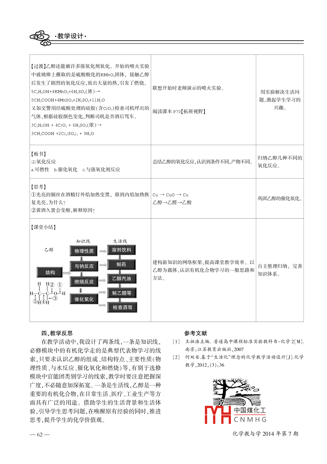 教學(xué)設(shè)計(jì)·8基于生活視角的“乙醇(必修)”教學(xué)設(shè)計(jì)馬潔(江蘇省外囯語學(xué)校江蘇蘇州215104)摘要:從學(xué)生已有生活經(jīng)驗(yàn)岀發(fā),將化學(xué)學(xué)習(xí)置于真實(shí)的生活情境中進(jìn)行“乙醇”教學(xué)設(shè)計(jì),提供給學(xué)生學(xué)習(xí)和交流的機(jī)會(huì),使他們將化學(xué)學(xué)習(xí)放眼生活,用生活的眼光看化學(xué)。關(guān)鍵詞:乙醇;教學(xué)設(shè)計(jì);生活文章編號:1008-0546(2014)07-0059-04中圖分類號:G633文獻(xiàn)標(biāo)識碼:Bdoi:10.3969/j.issn.1008-0546.201407022教學(xué)思想無意識的狀態(tài)下形成的,他們?nèi)狈τ^察生活的習(xí)慣及化學(xué)與生活、化學(xué)與自然界都有著天然的血緣關(guān)探究意識。當(dāng)我們引領(lǐng)學(xué)生走進(jìn)化學(xué)之門,會(huì)讓他們系,化學(xué)教學(xué)應(yīng)扎根于現(xiàn)實(shí)生活,對生活的意義進(jìn)行不斷觀察和探究身邊常見的物質(zhì),逐步感受到在這個(gè)探尋。高中生已具有許多的生活經(jīng)驗(yàn),其中包含大量物質(zhì)世界里,化學(xué)無所不在、無所不有。與化學(xué)有關(guān)的現(xiàn)象或問題,但這些生活經(jīng)驗(yàn)一般是在教學(xué)流程知識線生活線術(shù)引入課醇物理觀察實(shí)物、圖片飲料、重要溶劑搭建球棍模型,預(yù)測乙醇結(jié)構(gòu)深探究乙醇結(jié)構(gòu)實(shí)驗(yàn)探究:無水乙醇與鈉確定乙醇結(jié)構(gòu)制西藥醇化學(xué)性質(zhì)燃燒反應(yīng)實(shí)驗(yàn)探究:乙醇催化氧化模擬乙醇在體內(nèi)的氧化與強(qiáng)氧化劑反應(yīng)火實(shí)驗(yàn)交警測酒駕]三、教學(xué)過程設(shè)計(jì)教師活動(dòng)學(xué)生活動(dòng)設(shè)計(jì)意圖1.情境創(chuàng)設(shè),引出乙醇【魔術(shù)引入】對噴壺中的無色透明液體①有火噴火:用盛有酒精的噴壺向燃著的酒精燈上噴灑液體,連續(xù)曠三次。②產(chǎn)生了濃厚興趣,前排學(xué)無火噴火:用盛有酒精的噴壺向一支蘸有少量紫黑色固體的玻璃棒噴灑液體,生聞到了乙醇特殊的氣利用噴火比較震撼的噴三次。③將噴壺中的液體倒入燒杯中,向?qū)W生展示。脫口而出:“原來是酒/現(xiàn)象,激發(fā)學(xué)生興趣。講述]乙醇俗名酒精,酒是乙醇的水溶液。我國的酒文化博大精深從曹操何以解精!”憂,惟有杜康”,到李白“斗酒詩百篇”,無一不體現(xiàn)了“酒”作為一種飲品的社會(huì)價(jià)值2.觀察并歸納無水乙醇的物理性質(zhì)【投影】白酒、紅酒、啤酒、黃酒等圖片乙醇和水一樣都是無色透提問]各類酒中有濃度不等的乙醇,一些不法商販為牟利往酒中兌水,以次充明液體,且兩者互溶。豐富的圖片,增加教學(xué)好,為什么乙醇中兌水不易被察覺歸納乙醇的物理性質(zhì):直觀性。從現(xiàn)實(shí)生活中【投影】碘酒、護(hù)膚品、香水等圖片講述】乙醇是一種良好的有機(jī)溶劑。碘酒護(hù)膚品香水中都是利用了乙醇作無色透明、具有特殊香味提取素材激活學(xué)生感溶劑。的液仁【提問】請歸納乙醇的物理性質(zhì)中國煤化工水、與板書】一、乙醇的物理性質(zhì)CNMHG化學(xué)教與學(xué)2014年第7期2教學(xué)設(shè)計(jì)3.理論探究,認(rèn)識乙醇的結(jié)構(gòu)搭出兩種可能結(jié)構(gòu)【講述】我們已經(jīng)知道乙醇的分子式CH。。請同學(xué)們前后四人一小組,利用手中的球棍模型搭出乙醇分子可能的結(jié)構(gòu)分子式:CHO學(xué)生得到兩種結(jié)果產(chǎn)生認(rèn)知沖突。888Ⅱ【引導(dǎo)】比較兩種結(jié)構(gòu)氧原子的位置及氫原子的環(huán)境結(jié)構(gòu)式【交流討論】實(shí)驗(yàn)探究鈉與煤油水鈉保存在煤油中,可見鈉和煤油不反應(yīng),說明C-H鍵上的氫原子不能與鈉反應(yīng)乙醇和水三者反應(yīng)的2.鈉與水劇烈反應(yīng)并放出H2,說明O-H鍵上的情況,用價(jià)鍵理論類H匕推測乙醇的結(jié)構(gòu)。氫原子能與鈉反應(yīng)。結(jié)論:若鈉與無水乙醇反應(yīng),H0:三R。里媒油為結(jié)構(gòu)I,若兩者不反應(yīng),為結(jié)構(gòu)Ⅱ。實(shí)驗(yàn)】學(xué)生探究實(shí)驗(yàn):無水乙醇與鈉反應(yīng)通過對實(shí)驗(yàn)現(xiàn)象的剖①觀察金屬鈉的保存方法【觀察記錄實(shí)驗(yàn)現(xiàn)象】②向盛有2m無水乙醇的試管中投入一小粒小金屬鈉。鈉粒開始沉于無水乙醇底部,表面有無色氣泡緩析,學(xué)生積極思維,得【討論】從反應(yīng)的劇烈程度,鈉是否熔化鈉在液體中的位慢逸出,最終鈉粒消失液體仍為無色透明。出乙醇結(jié)構(gòu)。置等方面觀察此反應(yīng),對比鈉與水的反應(yīng)。從實(shí)驗(yàn)中得到什么啟【板書】二、乙醇的組成、結(jié)構(gòu)分子式:C2HOC-0-H結(jié)構(gòu)式通過結(jié)構(gòu)式、結(jié)構(gòu)簡結(jié)構(gòu)簡式: CH CHOH或CHOH羥基:-OH式、球棍模型、比例模寫出乙醇的結(jié)構(gòu)式、結(jié)構(gòu)簡式、電子式?!菊故尽恳掖挤肿忧蚬髂P汀⒈壤P托图由顚σ掖挤肿涌臻g結(jié)構(gòu)的認(rèn)【講述】在乙醇的結(jié)構(gòu)式中,有一個(gè)重要的基團(tuán):羥基(中國煤化工OH),它對乙醇的性質(zhì)有決定性作用HCNMHG化學(xué)教與學(xué)2014年第7期教學(xué)設(shè)計(jì)·8e4實(shí)驗(yàn)探究乙醇的化學(xué)性質(zhì)【板書】三、乙醇的化學(xué)性質(zhì)