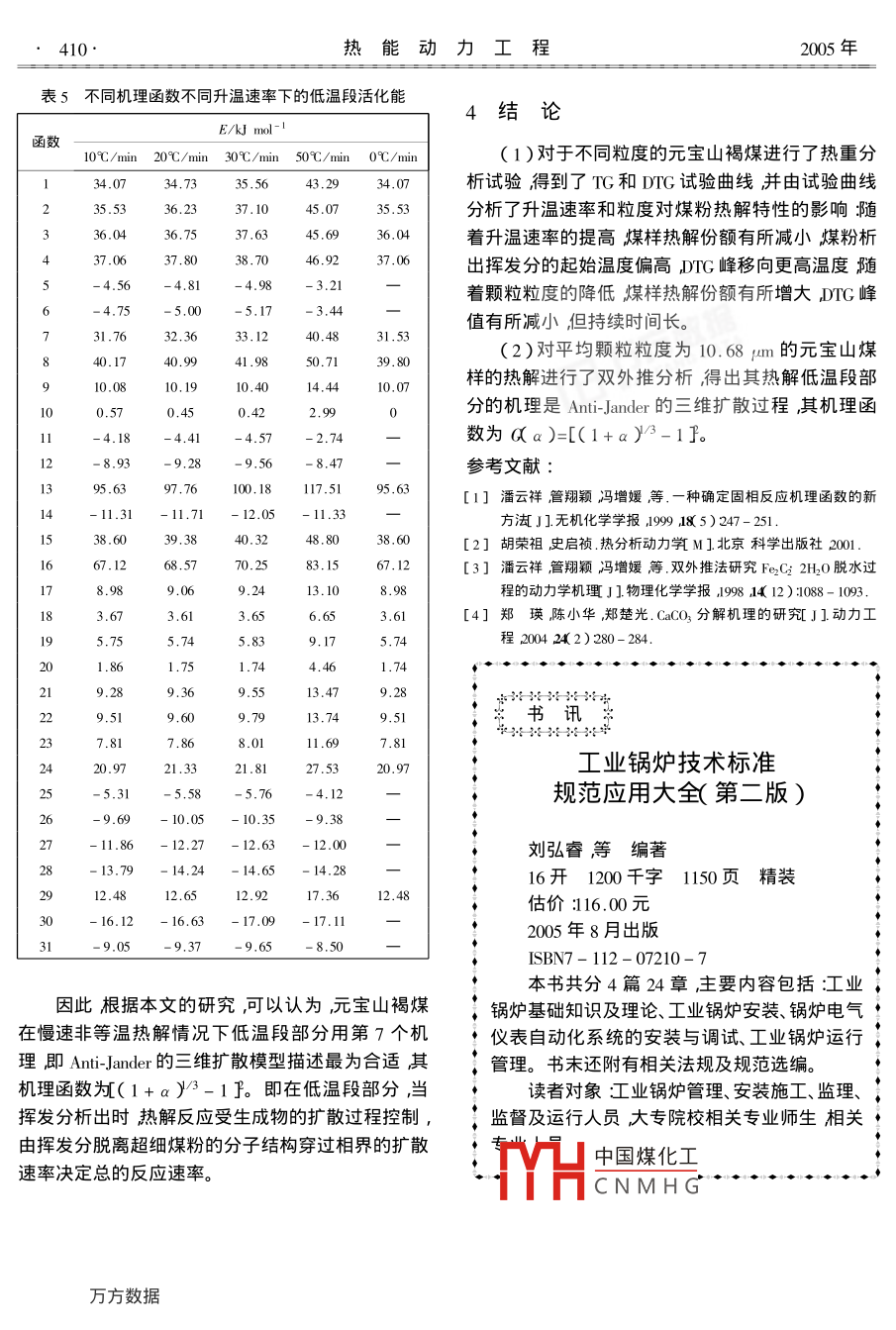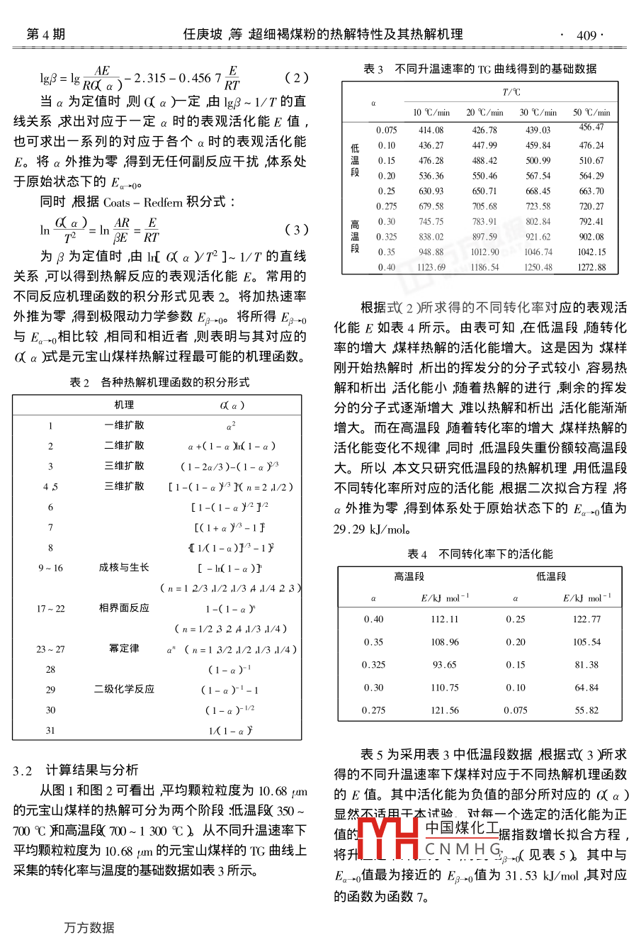第20卷第4期熱能動(dòng)力工程Vol. 20 No 42005年7月JOURNAL OF ENGINEERING FOR THERMAL ENERGY AND POWERJul.,2005文章編號(hào)l超細(xì)褐煤粉的熱解特性及其熱解機(jī)理任庚坡張超群,魏礫宏2姜秀民1.上海交通大學(xué)機(jī)械與動(dòng)力工程學(xué)院,上海2002402.哈爾濱工業(yè)大學(xué)能源科學(xué)與工程學(xué)院,黑龍江哈爾濱15000摘要在利用熱重法判斷熱解反應(yīng)機(jī)理時(shí)傳統(tǒng)方法很難在FeC2O12H2O體系獲得成功3],鄭瑛等將該方法確切推斷反應(yīng)的機(jī)理。為此從熱解曲線和動(dòng)力學(xué)方程出應(yīng)用到CaCO3分解機(jī)理的研究中取得成功4發(fā)運(yùn)用雙外推法得到了平均顆粒粒度為10.68{m的元寶本文通過(guò)對(duì)元寶山褐煤不同粒度煤樣的熱解特山褐煤熱解低溫段部分的機(jī)理為 Anti-Jander三維擴(kuò)散方程;性試驗(yàn)分析了升溫速率和顆粒粒度對(duì)煤粉熱解特同時(shí)對(duì)元寶山褐煤不同粒度煤樣的熱解特性進(jìn)行了研究分性的影響并通過(guò)熱解TG、DIG曲線用雙外推法確析了升溫速率和顆粒粒度對(duì)煤粉熱解特性的影響。定了平均顆粒粒度為10.68m的元寶山褐煤熱解關(guān)鍵詞超細(xì)煤粉雙外推法熱重分析颥粒粒度低溫段部分的動(dòng)力學(xué)機(jī)理。熱解機(jī)理中圖分類號(hào):Q530文獻(xiàn)標(biāo)識(shí)碼2超細(xì)煤粉的熱解特性試驗(yàn)前言2.1試驗(yàn)樣品試驗(yàn)樣品為元寶山褐煤將采集一定量的元寶煤的熱加工是當(dāng)前煤炭加工利用的最主要工山煤經(jīng)過(guò)洗滌、烘干、碾磨制成分析煤樣再各取·藝。煤熱解機(jī)理的研究與煤的熱加工技術(shù)如氣化、液化燃燒和碳化)極為密切的關(guān)系。例如煤爆的的試驗(yàn)煤樣這期間未對(duì)煤樣進(jìn)行任何篩分處理以保證試驗(yàn)數(shù)據(jù)能真實(shí)準(zhǔn)確地反映此煤粉的特性。元的影響也影響到燃燒的穩(wěn)定性及后期的燃盡問(wèn)題。寶山褐煤不同粒度煤樣的質(zhì)量見(jiàn)表1。煤熱解杋理硏究的成果將對(duì)煤的熱加工技術(shù)有直接的指導(dǎo)作用。表1不同粒度試驗(yàn)樣品質(zhì)量在確定固相熱分解反應(yīng)機(jī)理的各種方法中潘粒度/m云祥等提出了一種雙外推法1-2他們認(rèn)為由于固質(zhì)量8.48.338.28.43體樣品自身的熱傳導(dǎo)造成固體樣品內(nèi)外以及固體樣品與周圍氣氛之間存在著溫度差因而在測(cè)定過(guò)程2.2試驗(yàn)儀器和試驗(yàn)說(shuō)明中可以認(rèn)為樣品自始至終處于一種非熱平衡狀態(tài)采用由日本島津 SHIMADZU)公司生產(chǎn)的DC由此計(jì)算出的有關(guān)動(dòng)力學(xué)參數(shù)顯然與熱平衡下的真60H型熱重一差熱分析儀在不同升溫速率下對(duì)不實(shí)值有一定的偏差這種偏差隨樣品加熱速率的增同粒度的元寶山煤進(jìn)行了熱解試驗(yàn)研究。試驗(yàn)采用大而增大。因此將加熱速率外推為零實(shí)現(xiàn)理論上的升溫速率為10℃/min、20℃/min、30℃/min和的熱平衡狀態(tài),從而得到真實(shí)的動(dòng)力學(xué)參數(shù)值0℃/mi試驗(yàn)所用的氣體為100%的N2氣體總E它將反映出樣品熱解過(guò)程的真實(shí)情況。另流量為80ml/mimo外,一個(gè)樣品在不同轉(zhuǎn)化率時(shí)其表觀活化能往往呈2.3升溫速率對(duì)超細(xì)煤粉熱解特性的影響現(xiàn)規(guī)律性的變化。將樣品轉(zhuǎn)化率外推為零得到樣中國(guó)煤化工為10.68/m的元寶山品處于原始狀態(tài)下的Ea→0兩者相結(jié)合確定一個(gè)煤樣CNMHG解TG、DTG曲線如圖1固相反應(yīng)的最可能的機(jī)理函數(shù)。潘云祥等用該方法和圖2所示。由圖1可知同一樣品不同升溫速率收稿日期004-12-15基金項(xiàng)目家高技術(shù)研究發(fā)展計(jì)劃基金資助項(xiàng)目(2002AA527051)作者簡(jiǎn)介牲庚瑣數(shù)媧-)男安徽阜陽(yáng)人上海交通大學(xué)博士研究生408熱能動(dòng)力工程2005年下的失重率隨升溫速率的增大而減小。例如在本的揮發(fā)分的熱解和揮發(fā),所以DrG峰值持續(xù)時(shí)間試驗(yàn)中,升溫速率為10℃/min時(shí)煤樣的失重率為長(zhǎng)。46.97%而升溫速率為50℃/min時(shí)煤樣的失重率為40.76%。由此可見(jiàn)升溫速率的降低有利于此煤粉的熱解。由圖2可知攧著升溫速率的提高煤粉析岀揮發(fā)分的起始溫度偏高,DrG峰移向更高溫度。分析認(rèn)為這是因?yàn)樵跓峤夥磻?yīng)過(guò)程中介質(zhì)的擴(kuò)散和熱量的傳遞需要一定的時(shí)間即熱解反應(yīng)表60現(xiàn)出一定的延遲性,且這種延遲性隨著升溫速率的10.68um提高而增大。0200400600800100012001400T/℃50℃/min圖3煤樣不同粒度熱解TG曲線8010℃/mit0200400600800100012001400-0.101068μm圖1煤樣不同升溫速率熱解TG曲線54.960200400T/C0.05圖4煤樣不同粒度熱解DIG曲線0.00到-0.010℃30℃/3反應(yīng)機(jī)理的研究20℃50℃/min0.153.1雙外推方法原理0200400600800100012001400對(duì)于非等溫情形描述煤粉熱解反應(yīng)的動(dòng)力學(xué)積分式為圖2煤樣不同升溫速率熱解DIG曲線Ga)f2.4顆粒粒度對(duì)煤粉熱解特性的影響EI exp( -prdt升溫速率為30℃/min不同顆粒粒度的煤樣熱式中a—溫度為T時(shí)熱解的煤粉質(zhì)量百分比解TGDG曲線如圖3和圖4所示。由圖3可知:(α)描述控制化學(xué)反應(yīng)的機(jī)理函數(shù):A—頻率因隨著顆粒粒度的減小煤樣熱解分額有所增大。例孑φ