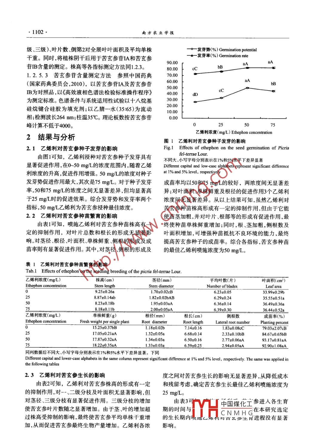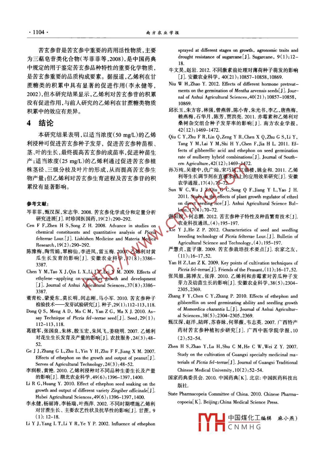 南方農(nóng)業(yè)學(xué)報(bào)JOURNAL OF SOUTHERN AGRICULTURE 2013.4()1100-1104ISSN 2095-1191; CODEN NNXAABhtp:/ww nfnyxb.cnDOI: 10.3969/jissn.2095-1 191.2013.7.1100乙烯利對(duì)苦參生長的影響謝陽姣',何志鵬2(廣西中醫(yī)藥大學(xué),南寧530001; 礦西藥用植物園,南寧530023)摘要:[目的]研究乙烯利對(duì)苦玄參種子發(fā)芽、種苗繁育、生長及苦玄參苷積累的影響,為苦玄參人工栽培及相關(guān)研究提供參考。[方法]設(shè)3個(gè)乙烯利濃度水平(25.50.75 mg/L),以清水為對(duì)照(CK),通過不同濃度乙烯利浸種葉面噴施等,研究乙烯利對(duì)苦玄參各生長指標(biāo)的影響。[結(jié)果]用50 -75 mg/L的乙烯利浸種可顯著促進(jìn)苦玄參種子發(fā)芽;50~75 mg/L的乙烯利可促進(jìn)幼苗莖徑、根徑、葉面積、單株鮮重、側(cè)根的形成及提高種子的成苗率;25-~75 mgL的乙烯利對(duì)苦玄參植株的莖徑三級(jí)分枝、葉數(shù)及生物產(chǎn)量的形成有促進(jìn)作用;但乙烯利對(duì)苦玄參生育進(jìn)程及苦玄參昔的積累沒有顯著影響。[結(jié)論用濃度為50 mg/L的乙烯利浸種或葉面噴施種苗可顯著促進(jìn)苦玄參種子發(fā)芽及種苗生長,最終提高種子的成苗率;對(duì)苦玄參植株噴施濃度為25 mg/L乙烯利可顯著促進(jìn)植株生長,提高苦玄參生物產(chǎn)量。關(guān)鍵詞:苦玄參;乙烯利;成苗率;生物產(chǎn)量中圖分類號(hào): S567.53文獻(xiàn)標(biāo)志碼:A文章編號(hào):2095-1191(2013)07-1100-05Effects of ethrel on growth of Picria fel- -terrae Lour.XIE Yang jiao' , HE Zhi-peng2(Guangxi University of Chinese Mediceine, Nanning 53000, China; 2Guangxi Medicinal Garden, Nanning 530023, China)Abstract: [objective]The efecets of ethrel on seed germination, seeding breeding, growth and accumulation of glycosidesin Picria fel trrae Lour. were studied to provide references for atificial culivation and relevant research of Picria fel teraeLour. [Method]With clear water as the contol, soaking seed and fliar pplication at three concentations of ethrel (25, 50, 75mg/L) were conducted to research the efects of ethrel on the growth of Picria fel-terrae Lour. [Result ]The seed germinationwas promoted by soaking seed with 50- -75 mg/L ethrel , and the seedling stem diameter, root diameter, leaf area, fresh weightper plant, lateral root number and percentage of seedling were iincreased by 50 -75 mg/L ethrel. The stem diameter of plant,level 3 branch, number of blades and biomass production were increased by 25 -75 m/L ethrel, but ethrel did not obviously in-luence the development progress of plant and the accumulation of glycosides. [Conclusion]Soaking seed and foliar applicationat optimal concentration of ethrel could promote seed germination and seedling growth, which led to a high percentage ofseedling Foliar application at optimal concentration of ethrel could markedly facilitate the growth of plant and consequenly in-crease the biomass production of Picria felterrae Lour.Key words: Picria fel-terrae Lour; ethrel; seedling rate; biomass production0引言了藥材供應(yīng)緊缺的問題,另一方面也遇到很多問題,[研究意義]苦玄參(Picria fel-terrare Lour. )是玄如種子繁殖和種苗繁育困難、人工種植藥材質(zhì)量下參科苦玄參屬唯- - 的一種植物,具有重要的藥理作降、投入增加而產(chǎn)出降低等。如何保證藥用植物在栽用,是許多中成藥的主要原料之- -。隨著苦玄參市場培過程中提高產(chǎn)量和質(zhì)量,是目前藥用植物人工種植需求量的增加,以及野生生長環(huán)境被人為破壞,苦玄值得研究的課題??嘈⒎N子千粒重約0.0708 g(謝陽參野生資源已不能滿足市場需求,人工種植成為主要姣和何志鵬,2012),由于種子細(xì)小,種子發(fā)芽所需營來源之一。藥用植物的規(guī)?;斯しN植,一方面解決養(yǎng)不足,種子出苗率及成苗率非常低;同時(shí),苦玄參在中國煤化工收稿日期:2013-02-01MYHCNMHG基金項(xiàng)目:廣西自然科學(xué)基金項(xiàng)目(2010CXNSFB013084)作者簡介:謝陽姣( 1975- ), 博士,副研究員,主要從事藥用植物資源與開發(fā)研究工作, E- mail:xieyangjiao@ 163.com謝陽姣等:乙烯利對(duì)苦玄參生長的影響●1101●人工種植過程中可能出現(xiàn)活性成分含量及組成發(fā)生度30C,光照10000 lx, 恒溫培養(yǎng)箱培養(yǎng)。每處理設(shè)4個(gè)改變的現(xiàn)象,導(dǎo)致藥材質(zhì)量不如野生資源。因此,保證復(fù),每個(gè)重復(fù)100粒種子。播種后每天觀察種子發(fā)芽苦玄參種苗供應(yīng)及產(chǎn)量和質(zhì)量不下降,是苦玄參人工情況,當(dāng)日種子發(fā)芽數(shù)達(dá)到最大時(shí),定為種子發(fā)芽勢栽培需要解決的問題。[前人研究進(jìn)展]前人對(duì)苦玄參的計(jì)數(shù)時(shí)間;種子發(fā)芽數(shù)變化可忽略不計(jì)時(shí)定為發(fā)芽藥理、藥效的研究較多,但對(duì)苦玄參人工種植及其相率計(jì)數(shù)時(shí)間。各指標(biāo)計(jì)算公式:關(guān)研究較少。甄漢深等( 2007 )對(duì)苦玄參的人工種植進(jìn)發(fā)芽勢(%)=(發(fā)芽勢計(jì)數(shù)當(dāng)日種子發(fā)芽總數(shù)/供行了初步研究;嚴(yán)慧貞和藍(lán)子康(2009)根據(jù)多年的種試種子數(shù))x100植經(jīng)驗(yàn)闡述了苦玄參的栽培技術(shù)要點(diǎn);此外,董青松發(fā)芽率(%)=(發(fā)芽率計(jì)數(shù)當(dāng)日種子發(fā)芽總數(shù)/供等(2010)對(duì)苦玄參種子的發(fā)芽檢驗(yàn)做了相關(guān)研究,但對(duì)苦玄參目前種植中遇到的問題未曾涉及。前人的許1.2.3乙烯利對(duì)苦玄 參種苗繁育的影響于2