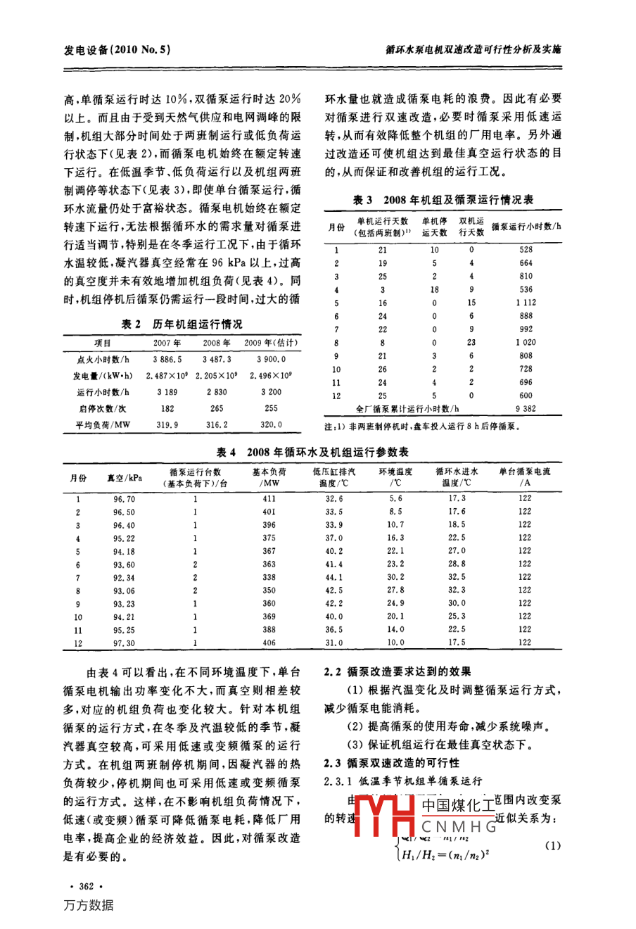 循環(huán)水泵電機雙速改遣可行性分析及實施發(fā)電設備(2010 No.5)循環(huán)水泵電機雙速改造可行性分析及實施葉建青(張家港華興電力有限公司,張家港215627)摘要:針對節(jié)約循環(huán)水泵電耗, 提出電機雙速改造的方案,并進行了可行性分析。分析表明,在冬春等低溫季節(jié)可采用低速運行循環(huán)水泵,節(jié)電效果明顯。介紹了改造的實施過程及收益。關鍵詞:燃氣-蒸汽聯(lián)合循環(huán);循環(huán)水泵;節(jié)能;雙速電機中團分類號:TM621.7文獻標識碼:A文章編號:1671-086X(2010)05-0361-03Feasibility Analysis and Execution of Double Speed Retrofitfor Motor of Circulating Water PumpYE Jian-qing(Zhangiagang Huaxing Electric Power Co., Ltd., Zhangjiagang 215627, China)Asbstract: In view of saving the power consumption of circulating water pump, the scheme of double speedretrofit for motor is put toward and the feasibilityt is analyzed. The analysis indicates the circulating waterpump operated with low speed may be used in the low temperature seasons of winter and spring etc., theeffect of saving elctric power is evident. The text introduces the execution process and benefit of retrofit.Keywords; gas-steam combined cycle ; circulating water pump; saving power; motor with double speed燃氣-蒸汽聯(lián)合循環(huán)機組因其環(huán)保、能效高、- 一臺備用;夏季等高溫季節(jié)采用2臺循泵并列運調(diào)峰能力強等特點越來越受到各國政府和電力行的方式。另外,循環(huán)水系統(tǒng)還向開式水系統(tǒng)、企業(yè)的歡迎。隨著國際和國內(nèi)燃氣價格的不斷工業(yè)水系統(tǒng)提供水源。上升,如何進一步降低燃氣輪機電廠的營運成循泵及其電機參數(shù)見表1。本,降低廠用電率是電廠節(jié)能優(yōu)化工作的一項重表1循泵及電機參數(shù)要工作,必須千方百計地降低輔機能耗來適應電項目數(shù)值力市場激烈競爭的需要。水泵型式立式固定葉電機型號YL900-141循環(huán)水系統(tǒng)簡介流量/(t+h-1)16 632額定電壓/kV轉(zhuǎn)速/(r*min-I)424額定功率/kW00張家港華興電力有限公司現(xiàn)有2臺美國GE汽蝕氽量/m6.額定電流/A29公司生產(chǎn)的S109FA單軸燃氣蒸汽聯(lián)合循環(huán)發(fā)電設計揚程/m19. 16絕緣等級F級機組,配套汽輪機為GE公司生產(chǎn)的D10三壓、單水泵類型混流泵功率因素0.712軸無抽汽、雙缸、雙排汽凝汽沖動式汽輪機。機組采用閉式循環(huán)水系統(tǒng),它由補給水泵、2循泵電機雙速改造的可行性分析反應沉淀池冷卻水塔、前池、啟閉器、鋼閘門、平板濾網(wǎng).、循環(huán)水泵、凝汽器和相關管道及閥門等2.1改造的必要性設備組成。每臺機組配置2臺循環(huán)水泵(以下簡由于燃氣蒸汽聯(lián)合循環(huán)機組的輔機設備較稱循泵),運行方式為冬春等低溫季節(jié)一臺運行,少,很中國煤化工中所占比例較收稿日期:2010-03-26YHCNMHG作者簡介:葉建青(1973-).男.工程師,從事燃氣-蒸汽聯(lián)合循環(huán)發(fā)電機組運行工作。E-mail: yejq3000@ yahoo. cn●361●發(fā)電設備(2010No.5)循環(huán)水泵電機雙速改造可行性分析及實施高,單循泵運行時達10%,雙循泵運行時達20%環(huán)水量也就造成循泵電耗的浪費。因此有必要以上。而且由于受到天然氣供應和電網(wǎng)調(diào)峰的限對循泵進行雙速改造,必要時循泵采用低速運制,機組大部分時間處于兩班制運行或低負荷運轉(zhuǎn),從而有效降低整個機組的廠用電率。另外通行狀態(tài)下(見表2),而循泵電機始終在額定轉(zhuǎn)速過改造還可 使機組達到最佳真空運行狀態(tài)的目下運行。在低溫季節(jié),低負荷運行以及機組兩班的,從而保證和改善機組的運行工況。制調(diào)停等狀態(tài)下(見表3),即使單臺循泵運行,循表32008年機組及循泵運行情況表環(huán)水流量仍處于富裕狀態(tài)。循泵電機始終在額定轉(zhuǎn)速下運行,無法根據(jù)循環(huán)水的需求量對循泵進單機運行天數(shù)單機停 雙機運(包括兩班制”適天數(shù)行天數(shù)循集運行小時數(shù)/行適當調(diào)節(jié),特別是在冬季運行工況下,由于循環(huán).2110528水溫較低,凝汽器真空經(jīng)常在96 kPa以上,過高215664的真空度并未有效地增加機組負荷(見表4)。同253時,機組停機后循泵仍需運行一段時間,過大的循161 112888表2歷 年機組運行情況.2:992項目2007年2008年2009 年(估計)81 020點火小時數(shù)/h3 883 487. 33 900. 080802(728發(fā)電量/(kW.h) 2. 487>102. 205X1092. 496X 10924696運行小時數(shù)/h3 1893 200600啟停次數(shù)/次18265255 .全廠循泵累計運行小時數(shù)/h9 382平均負荷/MW319.9316.2320. 0注:1)非兩班制停機時,盤車投入運行8 h后停循泵。表42008 年循環(huán)水及機組運行參數(shù)表循泵運行臺數(shù)基本負荷低壓缸排汽環(huán)境溫度循環(huán)水進水單臺循泵電流月份真空/kPa(基本負荷下)/臺/MW溫度/CC/A96. 7041132.65.617.312296. 5040133.58.517.696. 403933. 910.718.51295. 2237537.016.322.594.1840.222.127.093. 603641.423.228. 892. 343384.130.232.593. 0635042.527.832. 393. 2336042.224.930.094. 2140. 020.125.338836.514. 022. 597. 3031.010.017.5由表4可以看出,在不同環(huán)境溫度下,單臺2.2循泵改造要求達到的效果循泵電機輸出功率變化不大,而真空則相差較(1)根據(jù)汽溫變化及時調(diào)整循泵運行方式,多,對應的機組負荷也變化較大。針對本機組減少循泵電能消耗。循泵的運行方式,在冬季及汽溫較低的季節(jié),凝(2)提高循泵的使用壽命,減少系統(tǒng)