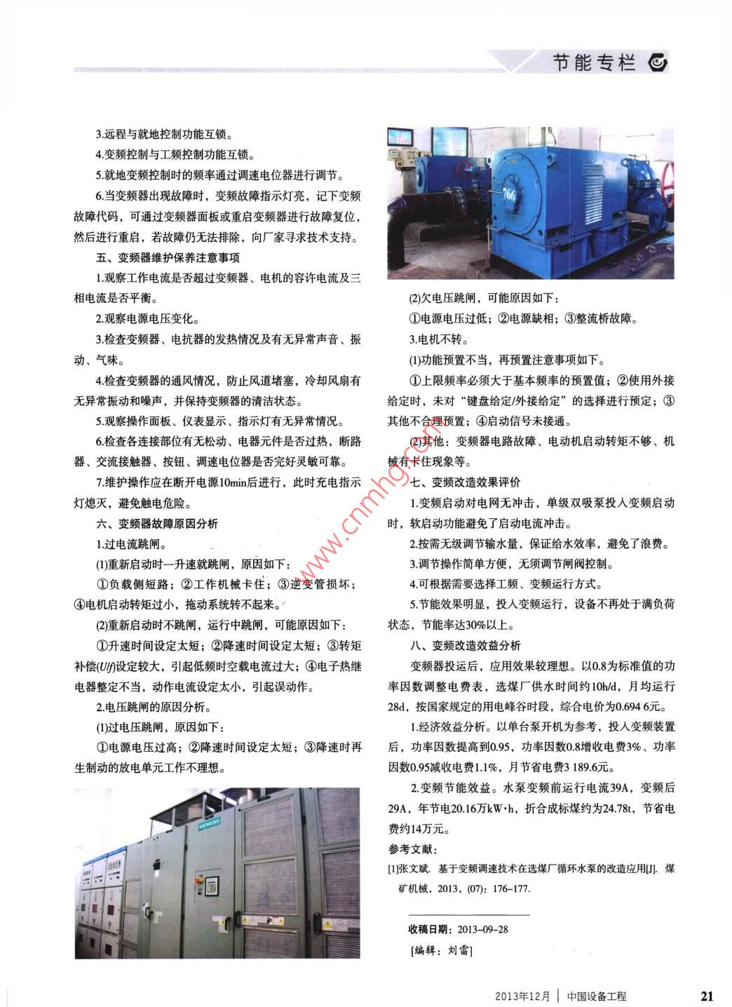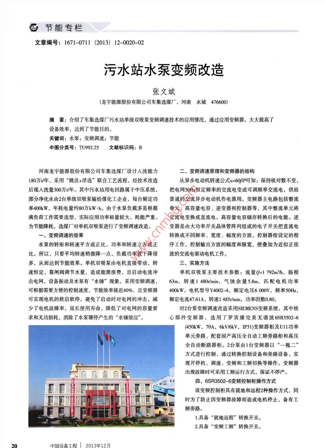 。節(jié)能專欄文章編號(hào): 1671-0711 (2013) 12- 0020-02污水站水泵變頻改造張文斌(龍宇能源股份有限公司車集選煤廠,河南永城476600)摘要:介紹了車集選煤廠污水站單級(jí)雙吸泵變頻調(diào)速技術(shù)的應(yīng)用情況,通過(guò)應(yīng)用變頻器,大大提高了設(shè)備效率,達(dá)到了節(jié)能目的。關(guān)鍵詞:水泵;變頻調(diào)速;節(jié)能中圖分類號(hào): TU992.25文獻(xiàn)標(biāo)識(shí)碼: B河南龍宇能源股份有限公司車集選煤廠設(shè)計(jì)入洗能力二、變頻調(diào)速原理和變頻器的結(jié)構(gòu)180萬(wàn)/年,采用“跳汰+浮選”聯(lián)合工藝流程,經(jīng)技術(shù)改造從異步電動(dòng)機(jī)轉(zhuǎn)速公式n=60/P可知:保持極對(duì)數(shù)不變,后現(xiàn)人洗量300萬(wàn)/年。其中污水站用電回路屬于中壓系統(tǒng),把電網(wǎng)50Hz恒定頻率的交流電變成可調(diào)頻率交流電,供給部分凈化水由2臺(tái)單級(jí)雙吸泵輸給煤化工企業(yè),每臺(tái)額定功普通的交流異步電動(dòng)機(jī)作電源用。變頻器主電路包括整流率400kW,年耗電量約80萬(wàn)kW.h。由于水泵負(fù)載多是根據(jù)單元、高容量電容、逆變器和控制器等,其中整流單元將滿負(fù)荷工作需要選型,實(shí)際應(yīng)用功率裕量較大,耗能嚴(yán)重。交流電變換成直流電。高容量電容儲(chǔ)存轉(zhuǎn)換后的電能。逆為節(jié)能降耗,選煤廠對(duì)單機(jī)雙吸泵進(jìn)行了變頻調(diào)速改造。變器是由大功率開(kāi)關(guān)晶體管陣列組成的電子開(kāi)關(guān)把直流電一、變頻調(diào)速的效果轉(zhuǎn)換成不同頻率、寬度、幅度的方波??刂破靼丛O(shè)定的程水泵的轉(zhuǎn)矩和轉(zhuǎn)速平方成正比,功率和轉(zhuǎn)速立方成正序工作,控制輸出方波的幅度和脈寬,使疊加為近似正弦比。所以,只要平均轉(zhuǎn)速稍微降-點(diǎn),負(fù)載功率就下降很波的交流電驅(qū)動(dòng)電機(jī)工作。多,從而達(dá)到節(jié)能效果。單機(jī)雙吸泵由電機(jī)直接帶動(dòng),轉(zhuǎn)三、實(shí)施方法速恒定,靠閘閥調(diào)節(jié)水量,造成能源浪費(fèi),且啟動(dòng)電流沖單機(jī)雙吸泵主要技術(shù)參數(shù):流量Q=1 792m/h,揚(yáng)程擊電網(wǎng),設(shè)備振動(dòng)及水泵有“水錘” 現(xiàn)象。采用變頻調(diào)速,63m,轉(zhuǎn)速1 480r/min, 氣蝕余量5.8m,匹配電機(jī)功率可根據(jù)需要方便的控制速度,節(jié)能效率接近40%,且變頻器400kW,電機(jī)型號(hào)Y4002 4,額定電壓6000V,頻率50Hz,可實(shí)現(xiàn)電機(jī)的軟啟軟停,避免了啟動(dòng)時(shí)對(duì)電網(wǎng)的沖擊,減額定電流47.61A,轉(zhuǎn)速1 485/min,功率因數(shù)0.80。少了電機(jī)故障率,延長(zhǎng)使用壽命,降低了對(duì)電網(wǎng)的容量要對(duì)2臺(tái)泵變頻調(diào)速改造采用SIEMENS變頻系統(tǒng),其中核求和無(wú)功損耗,消除了水泵驟停產(chǎn)生的“水錘效應(yīng)”。心部件變頻器,選用了羅賓康完美無(wú)諧波6SR3502-6(450kW,70A, 6kV/6kV, IP31)變頻器柜及U11功率單元旁路,配套國(guó)產(chǎn)高壓全自動(dòng)工頻旁路柜和高壓全自動(dòng)斷路器柜。2臺(tái)泵由1臺(tái)變頻器以“一拖二”方式進(jìn)行控制,通過(guò)轉(zhuǎn)換控制設(shè)備和旁路設(shè)備,實(shí)現(xiàn)開(kāi)停機(jī)、調(diào)速、變頻和工頻切換等操作。變頻器出現(xiàn)故障時(shí)可采用工頻運(yùn)行方式,保證不停產(chǎn)。四、6SR3502- 6變頻控制柜操作方式該變頻控制柜具有就地和遠(yuǎn)程2種操作方式,同時(shí)為了防止因變頻器故障而造成電機(jī)停止,備有工頻旁路。1具備“就地遠(yuǎn)程”轉(zhuǎn)換開(kāi)關(guān)。2.具備“變頻工頻”轉(zhuǎn)換開(kāi)關(guān)。20中國(guó)設(shè)備工程| 2013年12月節(jié)能專欄。3.遠(yuǎn)程與就地控制功能互鎖。4.變頻控制與工頻控制功能互鎖。5.就地變頻控制時(shí)的頻率通過(guò)調(diào)速電位器進(jìn)行調(diào)節(jié)。6.當(dāng)變頻器出現(xiàn)故障時(shí),變頻故障指示燈亮,記下變頻故障代碼,可通過(guò)變頻器面板或重啟變頻器進(jìn)行故障復(fù)位,然后進(jìn)行重啟,若故障仍無(wú)法排除,向廠家尋求技術(shù)支持。五、變頻器維護(hù)保養(yǎng)注意事項(xiàng)1.觀察工作電流是否超過(guò)變頻器、電機(jī)的容許電流及三相電流是否平衡。(2)欠電壓跳閘,可能原因如下:2.觀察電源電壓變化。①電源電壓過(guò)低;②電源缺相;③整流橋故障。3.檢查變頻器、電抗器的發(fā)熱情況及有無(wú)異常聲音、振3.電機(jī)不轉(zhuǎn)。動(dòng)、氣味。(1)功能預(yù)置不當(dāng),再預(yù)置注意事項(xiàng)如下。4.檢查變頻器的通風(fēng)情況,防止風(fēng)道堵塞,冷卻風(fēng)扇有①上限頻率必須大于基本頻率的預(yù)置值;②使用外接無(wú)異常振動(dòng)和噪聲,并保持變頻器的清潔狀態(tài)。給定時(shí),未對(duì)“鍵盤給定/外接給定”的選擇進(jìn)行預(yù)定;③5.觀察操作面板、儀表顯示、指示燈有無(wú)異常情況。其他不合理預(yù)置;④啟動(dòng)信號(hào)未接通。6.檢查各連接部位有無(wú)松動(dòng)、電器元件是否過(guò)熱,斷路(2)其他:變頻器電路故障、電動(dòng)機(jī)啟動(dòng)轉(zhuǎn)矩不夠、機(jī)器、交流接觸器、按鈕、調(diào)速電位器是否完好靈敏可靠。械有卡住現(xiàn)象等。7.維護(hù)操作應(yī