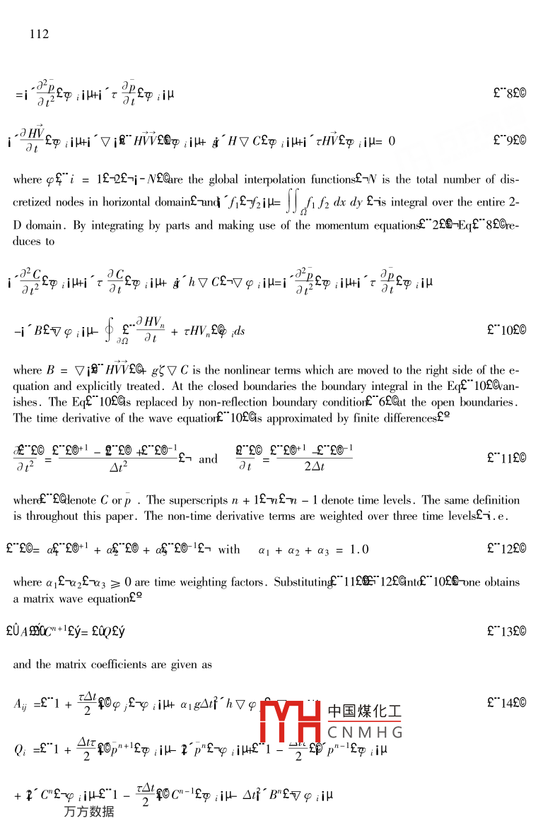 109Joumal of HydrodynamicsE fer. BE& *2000£0+09- 119China Ocean Press£ Beijing - Printed in ChinaWAVE EQUATION MODEL FOR SHIP WAVES IN BOUNDEDSHALLOW WATERT.S.LeeMechanical & Production Enginering Departmentf-National University of Singapore£-Singapore119620Wu Jian- kangf Xiong Chuan- guangMechanics Department of Huazhong University of Science & Technology E-Wuhan 430074E-P. R.ChinaC. ShuMechanical & Production Engineering Department- rNational University of Singapore£- Singaporef Received Dec. 18E-1999£OABSTRACT2 Ships were modelled as moving pressure disturbances on the free surface of a shal-ow water basin in the present paper. The moving- pressure generating waves were subjected to thereflection of land boundaries and the radiation of open boundaries. This paper proposed and exam-ined a wave equation modef" WEME@o solve the shallow water equations with moving surface pres-sures simulating ship waves in a bounded shallow water region. 'The Galerkin finite element methodwas used to solve a second order wave equation for the free surface elevations and the hydrodynamicpressure of the ship botom simultaneously. Horizontal velocities were obtained from the momentumequations. Numerical solutions of Series 60 Cp = 0. 6 ships moving with the depth Froude numberof Fn=0. 6E1. 0£1. 3 in a rectangular shallow water harbor were investigated. Three dimensional surfaceelevation profiles and the depth- averaged horizontal velocities were analysed. The numerical resultscharacterised very well the ship waves in shallow water. Strong boundary reflection waves werefound in the case of high depth Froude numbe£" Fn = 1. 32@ Waves generated by the interactionsof two ships moving in the same directions and in the opposite directions were also numerically in-vestigated in the present study .KEY WORDS ship wavesE- shallowv water equationsE FEM1. INTRODUCTIONIn the recent yearsE- waves in coastal shallow water£ generated by marine traffic and intensifiedby port expansion£ interaction with structures and reflection of land boundariesf Hhas become a cru-cial factor affecting water environments and engineering operation. In comparison with the windwaves and ocean swellsE-waves inside harbor ex中國煤化工1 certain areas. Thedominant ship waves are hardly dissipated in then with shorelinesf andmay cause wave resonance. This accumulatedMYHCNMHGevere increase of waveheight which causes damage to port facilities£- rdegradation of harbor infrastructures£- and excessivedisturbance to moored and moving vessels . The ship waves in riverfHakes£ Testuaries and coastal ar-eas are of great importance to environments£- engineering applications as well as ships.In shallow water areas£- the typical water depth is usually less than ship length. The wavelengthof ship waves aallow water is longer than that in deep water at the same speed. In many cases110the order of magnitude of the wavelength may be the same as ship length. In such situations the shipwaves in shallow water may be treated as shallow water waves£-i.e. k:h < < 1 2 and studied byshallow water equations. The nonlinearityE- energy dissipation and free surface disturbance may besignificant to shallow water waves£ 7and explicitly appear in the shallow water equations. The numer-ical solution of the Navier-Stokes equations are gaining popular in hydrodynamics in recent years .The shallow water equations are the depth-averaged Navier Stokes equations in the cases that the wa-ter depth is much less than horizontal flow scale. The shallow water is often bounded by shorelinesand varying seabed. The shoreline reflection makes ship waves even more complicated. The fielddata and experimental results in such situations are rarely available. Numerical model is of great in-terest in practical applications . The objective of this paper is to develop a finite element model to in-vestigate the characteristics of ship waves in bounded shallow water. In the present work ships areconsidered as moving pressure disturbance on the free surface£- rwhich is explicitly involved in theshallow water equations . This paper focuses the attention on the moving pressure on the free surface2-which generates waves in shallow water .The continuity equation is the first-order hyperbolic differential equation. It is known that thenumerical solution of the first-order hyperbolic differential equation has long been a difficult problemin computational fluid dynamics field . The numerical solutions of shallow water equations are easilyspoiled by numerical oscillationS 262EY. The wave equation modelE" WEME-first developed byLynch & Gra&U1E ntransforms the continuity equation and momentum equations to a second-orderwave equation2- then solves the wave equation for shallow water solutions£- instead of directly solvingcoupled continuity equation and momentum equations. The wave equation model eliminates numeri-cal oscillation effectively and decouples the continuity equation and momentum equations. Wave e-quation model has been sucssfully applied to many tidal computationS- 324252. The wave equationmodel and the Galerkin finite element method are employed to solve shallow water equations for in-vestigating ship waves in bounded shallow water in this paper. The numerical solutions of three-di-mensional free surface profiles and horizontal velocities are presented .2. WAVE EQUATION MODEL TO SOLVE SHALLOW WATER EQUATION WITHMOVING PRESSUREThe depth- averaged shallow water equations are given bydζ+ ViE" HVEO= 0f"120JHV+ Vi@"HVVE@+ gH°ζ + P£O+ tHV= 0f"20.pgwhere ζ is the surface elevation relative to still water£-V f" ufrfQs the depth- averaged horizontalvelocities£-H = h + ζ is the total water depthE-h is the still water depth£f" xEyEfGs the movingpressure on water surface£p is the water density£ g is the gravity acceleration£ tτ is the floor frictioncofficientE-und V =f" i. j EQs horizonl中國煤化工The present work is mainly concerned withMYHCNMH(Jing ship waves in shal-low wa