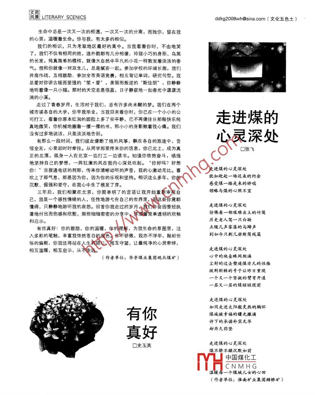 LITERARY SCENICSddkg2008wh@sina.com (文化五色土)生命中總是一次又-次的相遇,- -次又一次的分離,而獨(dú)你,留在我的心里,溫暖著生命。你與我,有太多的相似。我們的相識,只為考取地區(qū)最好的高中。當(dāng)我看著你時(shí),不由地笑了,我們不僅有相同的姓,連外貌都有幾分相像,玲瓏小巧的身形、烏黑的長發(fā),純真簡單的模樣,就像大自然中平凡的小花一樣散發(fā) 著淡淡的香氣。我和你就像一對雙生兒, 總是膩在一起。 參加學(xué)校的環(huán)城長跑,我們并肩作戰(zhàn)、互相鼓勵(lì);參加全市英語競賽,相互背記單詞,研究句型。我總愛對你講古板而堅(jiān)強(qiáng)的“簡.愛”,美麗而叛逆的“斯佳麗”,你靜靜地聽著像-只小貓。 那時(shí)的天空總是很藍(lán),子靜寂地一如春光 中潺潺流淌的小溪。走過了青春歲月,生活對于我們,總有許多尚未醒的夢。我們在兩個(gè)城市讀各自的大學(xué),你早我畢業(yè),當(dāng)我回來看你時(shí),你已在-個(gè)小小的公司打工,看著你原本紅潤的圓臉上多了些平靜,已不再像往8那般快樂純走進(jìn)煤的真地微笑,你機(jī)械地搬著-摞- 摞的書, 那小小的身影揪著我心痛。我們沒有過多地說話,只是淡淡地告別。有那么一段時(shí)間, 我們彼此像斷了線的風(fēng)箏,飄在各自的旅途中,音心靈深處信全無,心里卻時(shí)時(shí)牽掛。從同學(xué)那里傳來你的信息,你已北上,成為真門張飛正的北漂,孤身-人在北京一邊打工-邊讀書。知道你依然奮斗,頑強(qiáng)地堅(jiān)持自己的夢想,-陣狂瀾的風(fēng)在我內(nèi)心深處吹起?!?你好嗎?好想你! "當(dāng)撥通電話的剎那,傳來你清晰動(dòng)聽的聲音,我的心激動(dòng)無比。喜走進(jìn)煤的心靈深處歡上了那氣息,那是因?yàn)槟悖驗(yàn)槟愕臉酚^和堅(jiān)持。相識這么多年,你的猶如趕赴-場遲來的約會沉默、倔強(qiáng)和堅(jiān)守,在我心中生了根發(fā)了芽。感受煤一路走來的嬌喘三年后,我們相聚在北京,你簡單明了的言語讓我開始重新審視自領(lǐng)略與煤的心照不宣己,我是一個(gè)感性情緒的人,任性地游弋在自己的世界里,而這些你竟都懂得,只靜靜地聆聽我的哀怨?;厥啄阄易哌^的歲月,我們亦會因曾經(jīng)執(zhí)著地付出而傷感和欣慰,那些細(xì)細(xì)密密的分享中,洋溢著簡單透明的歡暢仿佛看一部艱難出土的竹簡和啟示。歷史老人駕一只白駒有你真好!你的鼓勵(lì),你的溫暖,你的理解,為我生命的草圖里,注點(diǎn)綴幾聲霉落的馬蹄聲入多彩的筆觸,豐富我依然蒼白的底色。你不驕傲,我亦不浮華,拋卻世到如今只剩幾冊斷簡殘篇俗的偏頗,你我還將站在人生的路口,相互守望,讓最純凈的心靈牽絆,相互溫暖,相互啟示,從不走遠(yuǎn)。(作者單位:華亭煤業(yè)集團(tuán)硯北煤礦)心中的塊壘蛛網(wǎng)爬滿塵封的過去塑造煤非凡的性格披荊斬棘的號子讓昨日重現(xiàn)一個(gè)又一個(gè)堅(jiān)挺的臂彎開道一層又一層的煤昭昭現(xiàn)前如同走進(jìn)太陽般炙熱的胸懷煤城被幸福的曙光撒滿有你許下的承諾樸實(shí)無華卻歷久彌堅(jiān)真好口史玉英煤不驕不躁沉默如前中國煤化工MHCNMH G溫暖每一個(gè)煤城兒女的心田(作者單位:淮南礦業(yè)集團(tuán)顧橋礦)數(shù)據(jù)工2012年第10期