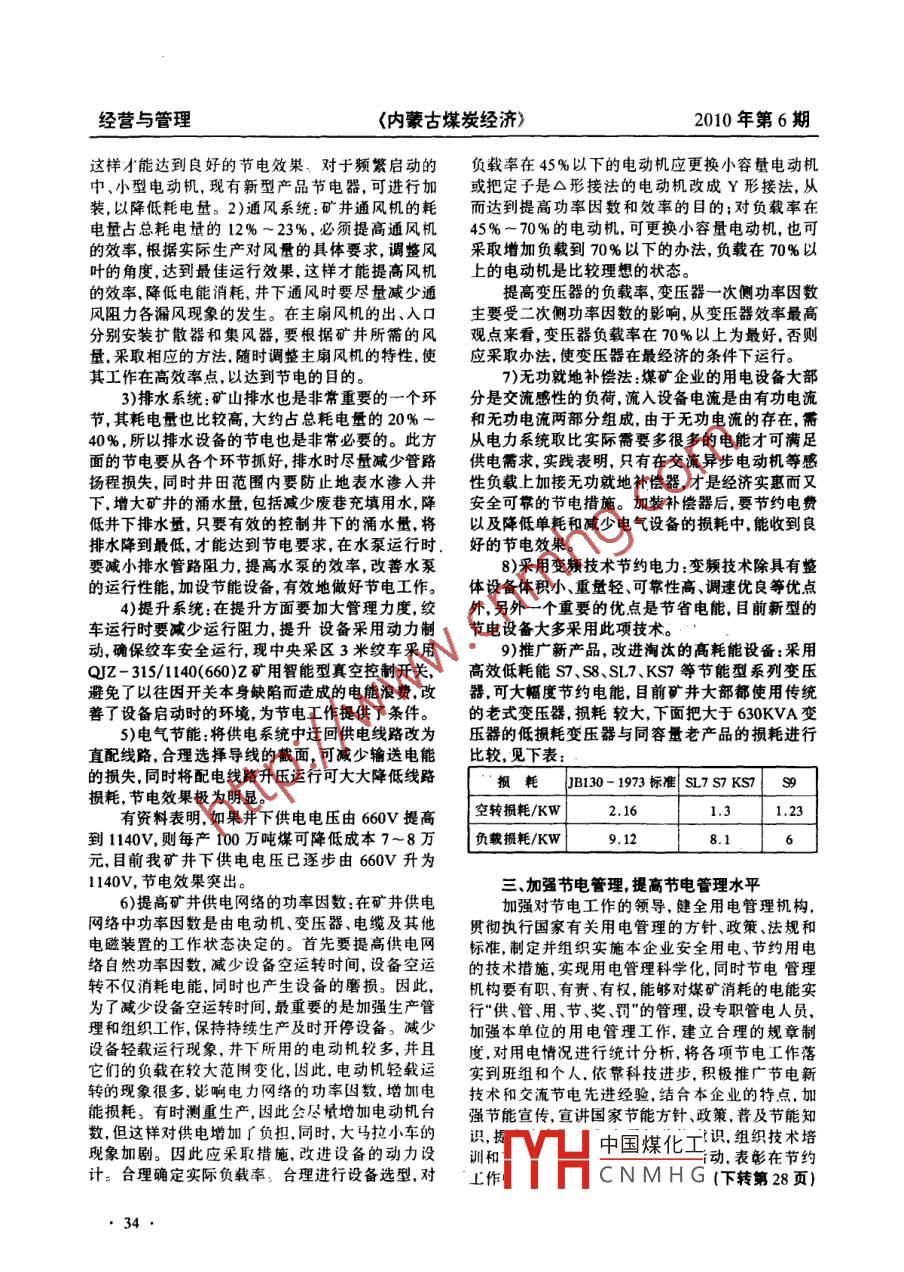 經(jīng)營(yíng)與管理<內(nèi)蒙古煤炭經(jīng)濟(jì))2010年第6期煤炭企業(yè)節(jié)電管理之我見(jiàn)王立武(魯能大雁能源公司,內(nèi)蒙古呼倫貝爾 021122 )摘要:煤礦礦 用的設(shè)備基本上以電力為動(dòng)力.電費(fèi)也在不斷攀升.如何控制電費(fèi)支出.降低成本,提高效益.是擺在我們面前的課題。本文通過(guò)對(duì)礦井各大系統(tǒng)如改造、新設(shè)備的引進(jìn)、提高管理水平、推行峰谷電價(jià)等手段,從而達(dá)到節(jié)約用電,降低企業(yè)成本的目的。關(guān)鍵詞:用電支出;節(jié)電途徑;管理水平中圖分類(lèi)號(hào):F270.7文獻(xiàn)標(biāo)志碼:B文章編號(hào):1008 015506-0033-02隨著煤炭企業(yè)的發(fā)展,井下機(jī)電設(shè)備由小型的達(dá)到理想的目的是不可能的,這就要求在節(jié)電工作逐漸被大功率、大容量的所替代。媒礦礦用的設(shè)備管理上,制定相應(yīng)的管理辦法和一整套約束機(jī)制加基本上以電力為動(dòng)力,電費(fèi)也在不斷攀升,如何控以規(guī)范,以達(dá)到節(jié)電的目的。制電費(fèi)支出、降低成本,提高效益,是擺在我們面前二、煤炭企業(yè)節(jié)電途徑課題,就如何控制電費(fèi)支出、節(jié)約用電,闌述如下:節(jié)電工作在煤炭企業(yè)中很重要,故抓此項(xiàng)工作一、抓基礎(chǔ)工作是控制用電支出的關(guān)鍵是非常必要的,要實(shí)現(xiàn)節(jié)電目標(biāo),除按以上所述的控制用電支出的關(guān)鍵在于抓基礎(chǔ)工作,所謂的嚴(yán)抓外,還要客觀的根據(jù)實(shí)際,制定出目標(biāo)和途徑,基礎(chǔ)工作包括:沿其目標(biāo)進(jìn)行工作,常抓不懈,在工作中不斷總結(jié)第一,建立節(jié)電意識(shí)營(yíng)造節(jié)電氛圍,創(chuàng)建節(jié)電.經(jīng)驗(yàn),取長(zhǎng)補(bǔ)短,去粗取精,才能達(dá)到節(jié)電的目的。環(huán)境。<中華人民共和國(guó)節(jié)約能源法>規(guī)定:“加強(qiáng)所謂目標(biāo)就是客觀的分析在企業(yè)井上、下的用節(jié)能宣傳和教育,普及節(jié)能科學(xué)知識(shí),增強(qiáng)全民的電設(shè)備,從哪些方面著手進(jìn)行技術(shù)改造,杜絕各設(shè)節(jié)能意識(shí)"。從中也不難看出節(jié)能是大家來(lái)做的,備空運(yùn)轉(zhuǎn),合理增加節(jié)電設(shè)備,推廣節(jié)能產(chǎn)品,提高節(jié)電更是如此,要在全體職工中廣泛宣傳節(jié)電的重設(shè)備效率,采用高效率、低消耗的生產(chǎn)工藝代替低大意義及給企業(yè)和大家?guī)?lái)的好處。利用板報(bào)、標(biāo)效率、高消耗的老工藝,降低生產(chǎn)電耗提高電氣設(shè)語(yǔ)班前會(huì)等各種會(huì)議等形式宣傳其主要性,在廣備的經(jīng)濟(jì)運(yùn)行水平,加強(qiáng)電力管理,提高功率因數(shù)。大職工中營(yíng)造這種氣氛,使職工真正意識(shí)到節(jié)電的加強(qiáng)運(yùn)行維護(hù),提高設(shè)備的檢修質(zhì)量??傊?要采.必要,樹(shù)立“節(jié)約能源光榮,浪費(fèi)能源可恥”的觀念。取積極有效的方法進(jìn)行節(jié)電而制定出節(jié)電目標(biāo),因煤炭生產(chǎn)企業(yè)是耗電大戶(hù),電力消耗占企業(yè)生產(chǎn)然后分階段、分步驟地實(shí)施。能耗的55% ~ 70%.能真正地把耗電降低,節(jié)約電節(jié)電不但要制定出目標(biāo),還要有完成此項(xiàng)工力資源會(huì)給企業(yè)帶來(lái)很大的經(jīng)濟(jì)效益,只有讓全體作的途徑也就是怎樣才能實(shí)現(xiàn)節(jié)電這一目標(biāo),要.職工樹(shù)立起節(jié)電意識(shí),且大家共同努力,發(fā)動(dòng)職工從以下幾個(gè)方面著手:1 )供電系統(tǒng)正確選擇電纜截的主觀能動(dòng)性,從相應(yīng)的各個(gè)環(huán)節(jié)嚴(yán)抓,上下齊抓面與型號(hào),減少線(xiàn)路損失,是節(jié)電的一大途徑。我共管,才能達(dá)到我們預(yù)想的節(jié)電目的。礦井下低壓供電電壓采用1140V和660V,在選擇第二,建立健全制度,制定相應(yīng)措施。落實(shí)一電纜時(shí),要按其供電電壓、所帶負(fù)荷及使用環(huán)境進(jìn)項(xiàng)工作完成情況,要達(dá)到相應(yīng)的標(biāo)準(zhǔn)和要求,首先行選擇,避免選用不合適的電纜,以保證經(jīng)濟(jì)運(yùn)行,要制定切實(shí)可行的措施及建立健全各種制度,進(jìn)行現(xiàn)有些成型的節(jié)能設(shè)備,如變頻設(shè)備?,F(xiàn)我礦西規(guī)范和約束,使該項(xiàng)工作能夠按照預(yù)想地意圖正常四、東二主扇均采用了變頻設(shè)備,節(jié)約了大量的電進(jìn)行,抓節(jié)電工作也是如此,要想把節(jié)電工作做到能,另外在變壓器的使用過(guò)程中.必須讓其在經(jīng)濟(jì)位,沒(méi)有一-整套的管理制度及切合實(shí)際的措施,想狀態(tài)下運(yùn)行,要求主變壓器的負(fù)載率不低于50%,中國(guó)煤化工收稿日期:2010- 06-21作者簡(jiǎn)介:王立武,大學(xué)本科畢業(yè),工程師,現(xiàn)任彳能大雁能源公司YHCNMHG33.經(jīng)營(yíng)與管理<內(nèi)蒙古煤炭經(jīng)濟(jì)>2010年第6期這樣才能達(dá)到良好的節(jié)電效果。對(duì)于頻繁啟動(dòng)的負(fù)載率在45%以下的電動(dòng)機(jī)應(yīng)更換小容量電動(dòng)機(jī)中、小型電動(dòng)機(jī),現(xiàn)有新型產(chǎn)品節(jié)電器,可進(jìn)行加或把定子是△形接法的電動(dòng)機(jī)改成Y形接法,從裝,以降低耗電量。2)通風(f
