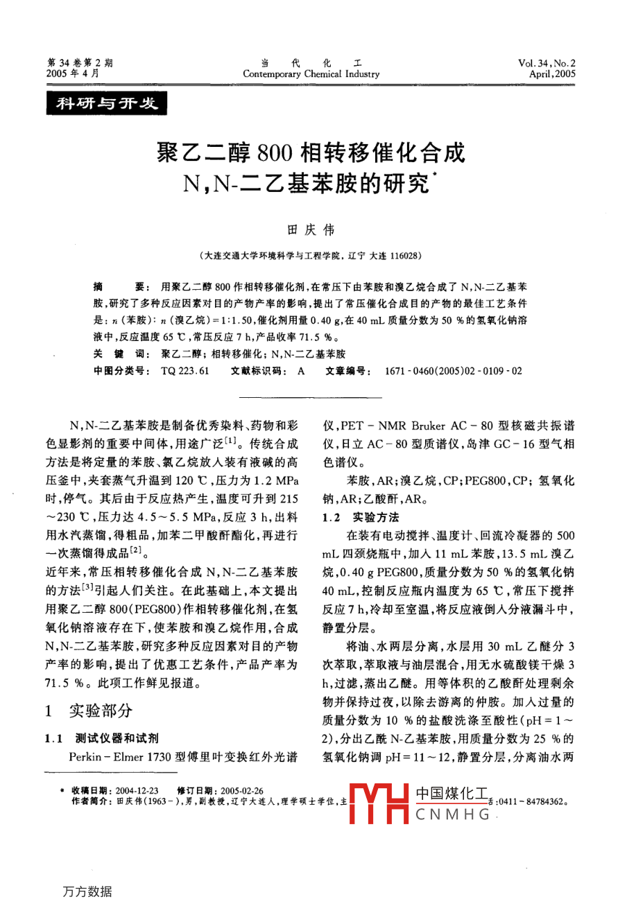 第34卷第2期當(dāng)代Vol. 34,No.22005年4月Contemporary Chemical IndustryApil,2005科研與開(kāi)發(fā)聚乙二醇800相轉(zhuǎn)移催化合成N,N-二乙基苯胺的研究”田慶偉(大連交通大學(xué)環(huán)境科學(xué)與工程學(xué)院,遼寧大連116028)摘要:用聚乙二醇 800作相轉(zhuǎn)移催化劑,在常壓下由苯胺和澳乙烷合成了N,N-二乙基苯胺,研究了多種反應(yīng)因索對(duì)目的產(chǎn)物產(chǎn)率的影響,提出了常壓催化合成目的產(chǎn)物的最佳工藝條件是: n(苯胺): n (澳乙烷)=1:1.50,催化劑用量0.40 g,在40 mL質(zhì)量分?jǐn)?shù)為50 %的氫氧化鈉溶液中,反應(yīng)溫度65 C ,常壓反應(yīng)7 h,產(chǎn)品收率71.5 %。關(guān)鍵詞:聚乙二醇;相轉(zhuǎn)移催化; N,N-二乙基苯胺中圖分類(lèi)號(hào): TQ 223.61文獻(xiàn)標(biāo)識(shí)碼: A文章編號(hào): 1671 - 0460(2005)02 -0109 -02N,N-二乙基苯胺是制備優(yōu)秀染料、藥物和彩儀,PET-NMRBrukerAC-80型核磁共振譜色顯影劑的重要中間體,用途廣泛。傳統(tǒng)合成儀,日立AC- 80型質(zhì)譜儀,島津GC- 16型氣相方法是將定量的苯胺、氯乙烷放人裝有液堿的高色譜儀。壓釜中,夾套蒸氣升溫到120 C ,壓力為1.2 MPa苯胺,AR;澳乙烷,CP; PEG800,CP;氫氧化時(shí),停氣。其后由于反應(yīng)熱產(chǎn)生,溫度可升到215鈉,AR;乙酸酐,AR。~230 C ,壓力達(dá)4.5~5.5 MPa,反應(yīng)3 h,出料1.2 實(shí)驗(yàn)方法用水汽蒸餾,得粗品,加苯二甲酸酐酯化,再進(jìn)行在裝有電動(dòng)攪拌、溫度計(jì)、回流冷凝器的500一次蒸餾得成品[2]。mL四頸燒瓶中,加入11 mL苯胺,13.5 mL溴乙近年來(lái),常壓相轉(zhuǎn)移催化合成N,N-二乙基苯胺烷,0.40 g PEG800,質(zhì)量分?jǐn)?shù)為50 %的氫氧化鈉的方法[3]引起人們關(guān)注。在此基礎(chǔ)上,本文提出40 mL,控制反應(yīng)瓶?jī)?nèi)溫度為65 C,常壓下攪拌用聚乙二醇800(PEG800)作相轉(zhuǎn)移催化劑,在氫反應(yīng)7 h,冷卻至室溫,將反應(yīng)液倒人分液漏斗中,氧化鈉溶液存在下,使苯胺和溴乙烷作用,合成靜置分層。N,N_二乙基苯胺,研究多種反應(yīng)因素對(duì)目的產(chǎn)物將油、水兩層分離,水層用30 mL乙醚分3產(chǎn)率的影響,提出了優(yōu)惠工藝條件,產(chǎn)品產(chǎn)率為次萃取,萃取液與油層混合,用無(wú)水硫酸鎂干燥371.5 %。此項(xiàng)工作鮮見(jiàn)報(bào)道。h,過(guò)濾,蒸出乙醚。用等體積的乙酸酐處理剩余物并保持過(guò)夜,以除去游離的仲胺。加入過(guò)量的1實(shí)驗(yàn)部分質(zhì)量分?jǐn)?shù)為10%的鹽酸洗滌至酸性(pH=1~1.1測(cè)試儀 器和試劑2),分出乙酰N-乙基苯胺,用質(zhì)量分?jǐn)?shù)為25%的Perkin-Elmer1730型傅里葉變換紅外光譜氫氧化鈉調(diào)pH=11~12,靜置分層,分離油水兩, 收稿日期: 2004-12-23修訂日期: 2005-02-26中國(guó)煤化工。; :0411- 84784362.作者簡(jiǎn)介:田慶偉(1963-).男,副教授,遼寧大連人,理學(xué)碩士學(xué)位,主MYHCNMHG110當(dāng)代化工第34卷第2期層。水層用30 mL乙醚萃取2次。將萃取液與所確定的條件為優(yōu)惠工藝條件。油層混合,用無(wú)水硫酸鎂干燥3 h,蒸去乙醚后減表1 L2s(5°)正交試驗(yàn)表壓蒸餾,收集沸點(diǎn)62~66 C、壓力400 Pa時(shí)的餾Table 1 The orthogonal experiment L2s(5*)分,得N,N-二乙基苯胺9.74 g,收率為71.5 %。1.3產(chǎn) 品分析廚富反座編貨n(萊院):比(羅加何化產(chǎn)暈粵時(shí)間π(澳乙烷)化舶)/銷(xiāo)用量產(chǎn)率將減壓蒸餾得到的產(chǎn)品分別通過(guò)//ml,45 0.20 1:1.50 3025 56. 9IR、'HNMR.GC- MS光譜鑒定,證實(shí)是N,N-二i 0.40 1:1.753530 54.2乙基苯胺。IR值(cm-1):1 598,1 573,1 506,15 0.601:2.004035 57.75 0.80 1:2.254540 55.1449(芳環(huán),C=C骨架振動(dòng)),3025(芳環(huán),C- H伸5 1.00 1:2.50:45 41.1縮振動(dòng)),1 355,1 266(芳環(huán),C- N伸縮振動(dòng)),5 0.40 1:2.00 445 46.55 0.60 1:2.2525 39.2746,693(-元取代苯) ,2 970,2 930,2 871(烷烴,5 0.80.1:2.503030 56.8C-H伸縮振動(dòng)),2 970,2 872,1 469,1 375(CH35 1.001:1.5035 58.1s 0.20 1:1.7510 70.2的C- H伸縮振動(dòng))。'HNMR的δ值(CDCL3,1145 0.60 1:2. S040 40.5TMS, 80MHZ)0.94 (3H, t, CH3),3.10 (2H,q,125 0.80 1:1.5045 58.813; 1.00 1:1.7525 62.2CH2),6.59(3H,m,苯環(huán)上鄰對(duì)位的氫),7.11$ 0.20 1:2.005030 43.6(2H,t,苯環(huán)上間位的氫)。MS(m/z,豐度):149.1535 0.40 1:2.2535 38.6(M* ,1 200 000),134(M- 15,2 800 000), 1061645 0.80 1:1.7535 s5.91755 1.00 1:2.00 .40 55.0(M-43,1 500 000),產(chǎn)品經(jīng)GC檢測(cè),質(zhì)量分?jǐn)?shù)1855 0.20 1:2.2545 53.7s 0.40 1:2.50 425 47. 5為98.43 %。20BS 0.60 1:1.50 4S30 52.6215 1.00 1:2.25 4030 48.72結(jié)果與討論225 0.204:35 40.02; 0.40 1:1.505(40 71. 5實(shí)驗(yàn)發(fā)現(xiàn),使用PEG800作相轉(zhuǎn)移催化劑時(shí),24s 0.60 1:1.75 3045 32.72535 0.80 1:2.00352544.2反應(yīng)時(shí)間、反應(yīng)溫度、催化劑用量、反應(yīng)物質(zhì)量的265.0 248.5 264.4 297.9 240.0 250.比、w (氫氧化鈉)、氫氧化鈉溶液用量等,均對(duì)目.1270.8 247.2258.275.2 250.5 255.9I243. 7301 9 22.7 247.0 282.9 250. s的產(chǎn)物產(chǎn)率發(fā)生影響。為弄清楚上述各影響因素264.7 237.0 270.8 235.3 256.4 292.3對(duì)產(chǎn)品收率的影響程度,獲得最佳的工藝條件,進(jìn)V 237.1 246.7 265.1225.9251.3 232.8行了表1所示的L2s(56)正交試驗(yàn)。59.48.0 50.0 1 281.3Il/5 54.2 49.4 51.755.0 50.1 51.2從表1看出,各影響因素對(duì)收率提高的重要1/5 48.7 60.4 44.5 49.4 56.6 50.1性次序依次是:反應(yīng)物質(zhì)的量比>反應(yīng)溫度>氫N(xiāo)V/5 52:9 47.4 54.2 47.1 51.3 58.V/5 47.4 49.3 53.045.250.3 46.