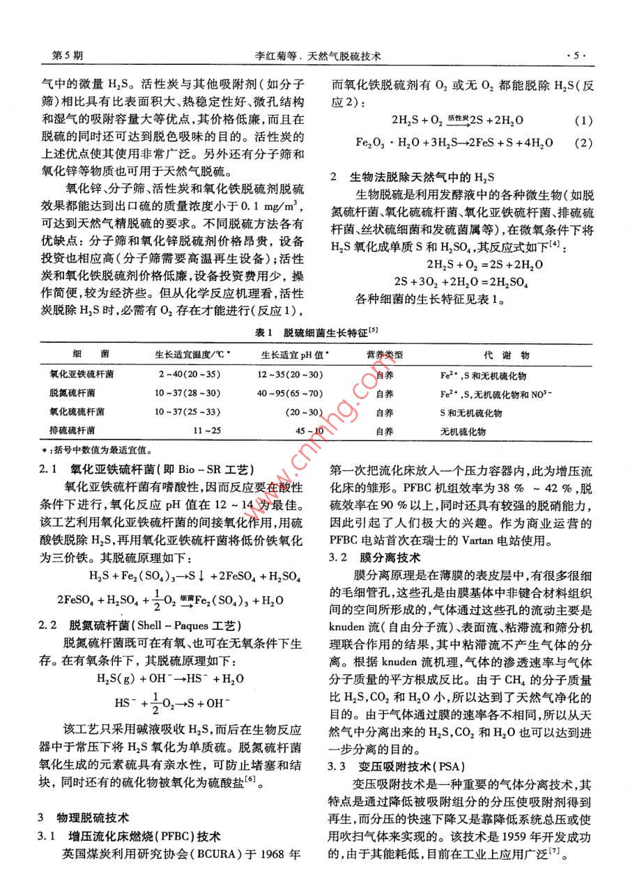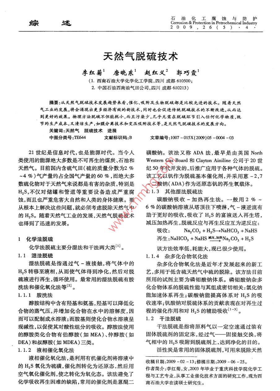 石油化工腐蝕,與防護綜述Corrosion & Protection in Petrochemical Industry2009,26(5).4,天然氣脫硫技術(shù)李紅菊'唐曉東'趙紅義2郭巧霞'(1.西南石油大學化學化工學院,四川成都610500;2.中國石油西南油氣田公司,四川成都610213)摘要:從天然氣脫硫技術(shù)發(fā)展趨勢來看,催化、吸附及生物脫硫都是比較先進的技術(shù)。隨著天然氣工業(yè)的發(fā)展,將會涌現(xiàn)出更多經(jīng)濟有效的新技術(shù),同時也會促進傳統(tǒng)脫硫技術(shù)的不斷改進,從而達到更好的效果。物理方法脫硫不但能耗小,而且污染少,幾乎無需在脫硫環(huán)節(jié)引入任何化學物質(zhì),既節(jié)釣生產(chǎn)成本,又清潔生產(chǎn),如膜分離技術(shù)和變壓吸附技術(shù)等,是天然氣脫硫技術(shù)的發(fā)展方向。關(guān)鍵詞:天然氣脫硫技術(shù)進展中圖分類號:TE644文獻標識碼:B文章編號:1007 - 015X(2009)05 -0004 -0321世紀是信息時代,也是能源時代。當今人磺酸鈉。該法又稱ADA法,最早是由英國North類使用的能源絕大多數(shù)是不可再生的煤炭、石油和Western Gas Board 和Clayton Ainiline 公司于20世天然氣。目前國內(nèi)含硫氣田(硫的質(zhì)量分數(shù)為2 %紀50年代開發(fā)的,后推廣應用于各種氣體的脫硫。~4 %)氣產(chǎn)量約占全國氣產(chǎn)量的60 % ,而絕大多該工藝以釩作為脫硫基本催化劑,并采用蒽-2,7數(shù)硫化物對于天然氣來說都是有害的雜質(zhì),特別是-二酸鈉( ADA)作為還原態(tài)釩的再生氧載體。H2S,不僅對儲罐和管道等重要設備造成嚴重腐1.1.3其他濕法脫 硫法蝕,而且也嚴重危害大自然和人類的身體健康。要碳酸鈉吸收-加熱再生法。一般用2 % ~從根本上解決這些問題,就必須考慮脫除天然氣中6 %的碳酸鈉溶液從塔頂往下噴淋,氣-液逆流有的HS。隨著天然氣工業(yè)的發(fā)展,天然氣脫硫技術(shù)助于更好的吸收,吸收了H2S 的富液送入再生塔,也得到了迅速的發(fā)展。減壓加熱再生,脫硫反應與再生反應互為逆反應:吸收:Na2CO3 + H2S-→+NaHCO, + NaHS1化學法脫硫再生:NaHCO3 + NaHS眼壓.加熱Na2CO, + H2S化學法脫硫主要分濕法和千法兩大類"。該方法效率低,耗能大,現(xiàn)已很少使用。1.1。濕法脫硫1.1.4雜多化合物氧化法濕法脫硫是指通過氣-液接觸,將氣體中的雜多化合物氧化法是近年才發(fā)展起來的新工H2S轉(zhuǎn)移至液相,從而使氣體得到凈化,然后對脫藝,多用于低含硫天然氣中硫的脫除。該方法目前硫液進行再生,循環(huán)使用。最常用的濕法脫硫有胺所用的試劑主要為磷鉬酸鈉體系。磷鉬酸鈉雜多洗法和催化氧化法等2]?;衔矬w系的脫硫性能與其組成密切相關(guān):氯化鈉1.1.1 胺洗法能加速體系再生;碳酸鈉能提高體系對H2S的吸醇胺結(jié)構(gòu)中含有羥基和氨基,羥基可以降低化收速率;釩酸鈉對脫硫體系的貢獻表現(xiàn)在對再生過合物的蒸氣壓,并增加化合物在水中的溶解度,因程的催化作用和對H2S的輔助吸收(1-3]。而可以配制成水溶液;而胺基則使化合物水溶液呈1.2 干法脫硫現(xiàn)堿性,以促使其對酸性組分的吸收。醇胺法使用干法脫硫是指將原料氣以-定空速通過裝有的醇胺類化合物有伯醇胺(如MEA)、仲醇胺(如固體脫硫劑的固定床,經(jīng)過氣一固接觸交換 ,將DEA)和叔醇胺(如MDEA)三類。氣相中的H2S吸附到脫硫劑上,達到凈化的目的。1.1.2液相催化氧化法活性炭是常用的固體脫硫劑,可用來脫除天然液相催化氧化法,是利用有機催化劑將溶液中收稿日期:2009 -02 - 13;修稿日期:2009 -06 -25。的H2S氧化為硫磺,催化劑轉(zhuǎn)化為還原態(tài),然后用作者簡介:李紅菊,女,2003年畢業(yè)于重慶科技學院化學工空氣氧化催化劑,使之轉(zhuǎn)化為氧化態(tài)。該法避免了程與工藝專業(yè),從事工業(yè)催化技術(shù)方面的研究工作,現(xiàn)為西化學吸收再生困難的缺陷,常用的催化劑是蒽醌=南石油大學在讀碩士研究生。第5期李紅菊等.天然氣脫硫技術(shù)氣中的微量H2S?;钚蕴颗c其他吸附劑(如分子而氧化鐵脫硫劑有O2或無O2都能脫除H2S(反篩)相比具有比表面積大、熱穩(wěn)定性好、微孔結(jié)構(gòu)應2):和濕氣的吸附容量大等優(yōu)點,其價格低廉,而且在2H2S + O2拓性發(fā)2S +2H20(1)脫硫的同時還可達到脫色吸味的目的?;钚蕴康腇e2O3. H20 +3H2S- +2FeS +S +4H20 (2)上述優(yōu)點使其使用非常廣泛。另外還有分子篩和氧化鋅等物質(zhì)也可用于天然氣脫硫。2生物法脫除天然氣中的H,S氧化鋅、分子篩、活性炭和氧化鐵脫硫劑脫硫生物脫硫是利用發(fā)酵液中的各種微生物(如脫效果都能達到出口硫的質(zhì)量濃度小于0.1 mg/m',氮硫桿菌、氧化硫硫桿菌氧化亞鐵硫桿菌、排硫硫可達到天然氣精脫硫的要求。不同脫硫方法各有桿菌、絲狀硫細菌和發(fā)硫菌屬等) ,在微氧條件下將優(yōu)缺點:分子篩和氧化鋅脫硫劑價格昂貴,設備H2S氧化成單質(zhì)S和H2SO, ,其反應式如下[4]:投資也相應高(分子篩需要高溫再生設備);活性2H2S +O2 =2S +2H20炭和氧化鐵脫硫劑價格低廉,設備投資費用少,操2S +302 + 2H20 =2H2SO,作簡便,較為經(jīng)濟些。但從化學反應機理看,活性各種細菌的生長特征見表1。炭脫除H,S時,必需有O2存在才能進行(反應1),表1脫硫細菌生長特征[5)細菌生長適宜溫度/心●生長適宜pH值*營養(yǎng)類型代謝物氧化亞鐵確桿菌2-40(20-35)12 -35(20 -30)自養(yǎng)Fe2+ ,S和無機硫化物脫氮硫桿菌10 -37(28 ~30)40 ~95(65 ~70)Fe2+ ,S,無