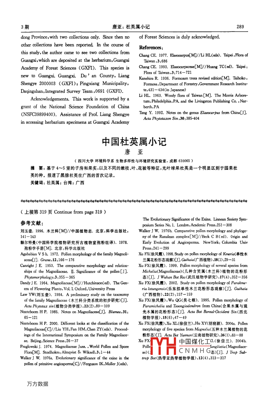 西植物 Guihaia28(3):288-2892008年5月Notes on Elaeocarpus(Elaeocarpaceae) from ChinaTAaLaboratory for Biodiversity and Environmental Studies, Department ofEnvironmental Sciences, Sichuan University, Chengdu 610065, China)Abstract: Having different characteristics of branchlets, leaves and perianth, Elaeocarpus hayata is treated as a dis-tinct species rather a variety of E sphaericus. E atro punctatus is reported from guangxi for the first time.Key words: Elaeocarpus; Taiwan: GuangxiCLC Number Q949, 757. 1 Document Code: a Article ID: 1000-3142(2008)03-0288-02pus hayata Kanehira Sasaki, Trans. tion GanitrusNat. Hist. Soc. Foan. 24: 398, t 2. 1934; KanehiraSince its leaves look similar to E. decipiens andFormosan Trees, rev. ed. 431, t. 388. 1936; Liu, Sasaki E. sylvestris, E, hayate sometimes has been treated asKeng, Quart. J. Taiwan Mus. 8(4): 306. 1955: H L. a synonym of these; however, as noted above E hayaLi, Woody Fl. Taiwan 533. 1963: C. E Chang, Quart. J. tae is in a separate section.Taiwan Forest. 3(2): 22. 1967Only two species of the section Ganitrus are recElaeocarpus sphaericus( Gaertner )Schumman ognized in China, of which E. angusti folius Blame isvar hayate(Kanehira Sasaki)C. E Chang in H. found in southern Yunnan, Elaeocapus hayate Kane-L, Li et aL. (eds ), Fl. Taiwan 3: 686, pL. 776. 1979 and hira Sasaki differs from E angustifolius Blume in aT. C. Huang(ed), Fl, Taiwan, ed. 2, 3: 718. pl. 366. number of characteristics including glabrous(vs. pubescent) branchlets, petioles, and abaxial leaf surfaceElaeocarpus sylvestris (Lour. ) Poiret var haya- smaller leaves (7-13 X 2.5-3. 5 vs 13-17 X 4-6 cm),fe-tae(Kanehira Sasaki)Y. C. Liu, Lign, Pl. Taiwan wer lateral veins(6-8 vs 10-13), veins and veinlets dis-376.1972tinctly(vs. poorly) anastomosing, sepals glabrous(vs.This species was originally described as havingberulent) adaxially, petal segments 13-15(vS 15-25)loculed ovary In Kanehira,s"Formosan Trees Re- and 4-or 5-loculed (vs 5-loculed) ovary and fruit. Invised Edition", the cross section of the ovary is illustra- view of these differences, we prefer to treat it as a dis-ted clearly as 3-loculed but the cross section of fruit is tinct species rather than a variety. In addition, up to5-loculed with 4 locules degenerating(Kanehira, 1936, date records of geographical distribution indicated thatg. 388: G D. Examination of type materials by C. they are allopatric. This species is endemic to TaiwanE. Chang revealed that the ovary and fruit are 4-or 5-The discovery of both 4-loculed and 5-loculed o-loculed(Chang, 1977, PL 766: 1, 4). In the infrageneric varies and fruit might be important in the study of evo-system of ElaeocarPus(Tang, 1992), species with 5- lution of this genus. E hayate is distributed in theloculed ovaries and fruit belong to Section Ganitrus but periphery of the section and the reduction in locules ofspecies with 2-or 3-loculed ovaries and 1-loculed fruit ovary and fruit might be derived.belong to Section Elaeocarpus. Since its ovary is 4-orElaeocarpus atropunctatus H. T Chang, Acta Phy5-loculed, E. hayate is certainly not a member of the tota. Sin. 17:52.1979Section Elaeocarpus but rather a member of the Sec-This species was described from Luoding, Guang-Received date: 2007-02-08 Accepted date: 2007-06-16中國(guó)煤化工基金項(xiàng)目:國(guó)家自然科學(xué)基金(3989940[ Supported by the National Natural ScienceCNMHG作者簡(jiǎn)介:唐亞(1963-),男,貴州盤縣人教授博士,主要從事植物學(xué)和生態(tài)學(xué)方溫嗎x期唐亞:杜英屬小記289ong Province, with two collections only. Since then no of Forest Sciences is duly acknowledged.other collections have been reported. In the course ofthis study, the author came to see two collections fromChang CE. 1977. Elaeocarpus[ MI//Li HL(eds). Taipei: Flora ofGuangxi, which are deposited at the herbarium, GuangxiTaiwan, 3: 686Academy of Forest Sciences (GXFI). This species is Chang CE. 1993. Elaeocarpaceae [M//Huang TC(ed).TaipeiFlora of Taiwan, 3: 714-721newan County, langKanehira R. 1936. Fortrees revised edition[M]. TaihokoShengye 2000003( GXFI), Pingxiang Municipality,Formosa: Department of Forestry, Government Research Institu-Daqingshan, Integrated Survey Team, 0691(GXFDte,431-434(in JapaneseAcknowledgements. This work is supported byLi HL 1963, Woody flora of Taiwan [M]. The Morris Arbore-um. Philadelphia, PA and the Livingston Publishing Co, Nar-grantationaberth, PA(NSFC39899400). Assistance of Prof. Liang Shengye Tang Y. 1992. Notes on the genus Elaeocarpus from China[J]Acta Phytotron Sin, 30: 385-404in accessing herbarium specimens at Guangxi Academy中國(guó)杜英屬小記唐亞(四川大學(xué)環(huán)境科學(xué)系生物多樣性與環(huán)境研究實(shí)驗(yàn)室,成都610065摘要:基于4~5室的子房和果實(shí),以及不同的嫩枝、葉花被等特征,光葉球果杜英是一個(gè)明顯區(qū)別于園果杜英的種。報(bào)道了黑腺杜英在廣西的首次記錄關(guān)鍵詞:杜英屬;臺(tái)灣;廣西④36633386368公6省自36863663636合8634663663己公(上接第319頁(yè) Continue from page319)參考文獻(xiàn)The Evolutionary Significance of the Exine. Linnean Society Symposium Series No. 1. London: Academic Press: 251-308劉玉壺.1996.木蘭科[M//中國(guó)植物志.北京:科學(xué)出版社: Walker J W.1976b. Comparative pollen morphology and phyloge-ny of the Ranalean complex[M]//Beck C B(ed). Origin and額爾特曼(中國(guó)科學(xué)院植物研究所古植物室孢粉組譯).1978.Early Evolution of Angiosperms. New York: Columbia Univ孢粉學(xué)手冊(cè)[M.北京:科學(xué)出版社Press:241-299cm13.6 mparative morphology and relation- Xu FX(徐風(fēng)霞).19. en morphology of sevan/Agbabian VSh.1972. Pollen morphology of the family magnoli--XuFX(徐鳳霞).1998 Study on pollen morphology of Kmeria(單性木aceae]. Grana, 12: 166-17蘭屬花粉形態(tài)觀察] Guihai(廣