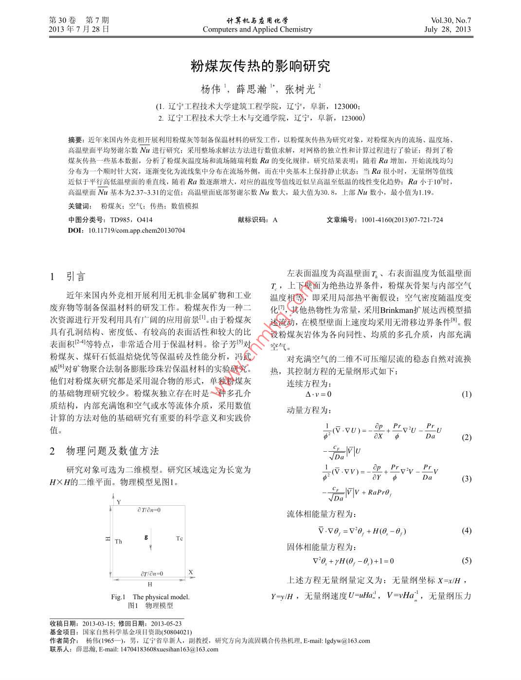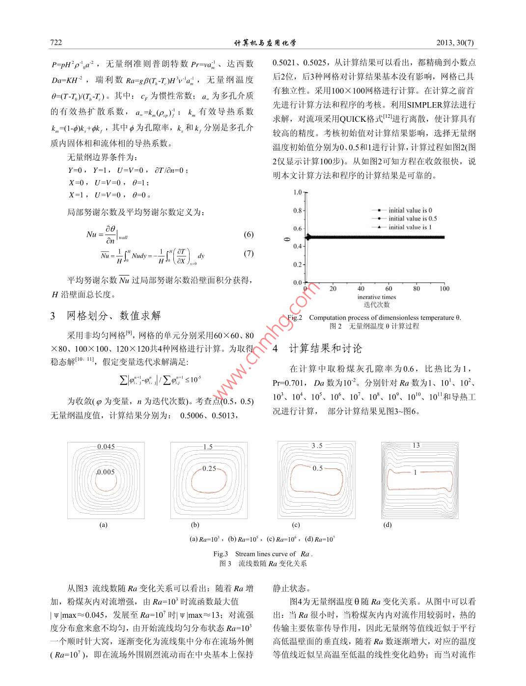 第30卷第7期計算機與應用化學2013年7月28日Computers and applied ChemistryJuly28,2013粉煤灰傳熱的影響研究楊偉',薛思瀚",張樹光1.遼寧工程技術大學建筑工程學院,遼寧,阜新,1230002.遼寧工程技術大學土木與交通學院,遼寧,阜新,123000摘要:近年來國內(nèi)外競相開展利用粉煤灰等制備保溫材料的硏發(fā)工作,以粉煤灰傳熱為硏究對象,對粉煤灰內(nèi)的流場、溫度玚高溫壁面平均努謝爾數(shù)M進行硏究:采用整場求解法方法進行數(shù)值求解,對網(wǎng)格的獨立性和計算過程進行了驗證:得到了粉煤灰傳熱一些基本數(shù)據(jù),分析了粉煤灰溫度場和流場隨瑞利數(shù)Rα的變化規(guī)律。硏究結(jié)果表明:隨著Rα增加,開始流線均勻分布為一個順時針大窩,逐漸變化為流線集中分布在流場外側(cè),而在中央基本上保持靜止狀態(tài):當Ra很小時,無量綱等值線近似于平行高低溫壁面的垂直線,隨著Ra數(shù)逐漸增大,對應的溫度等值線近似呈高溫至低溫的線性變化趨勢;Ra小于105時,高溫壁面Mat基本為2.37~3.31的定值;高溫壁面底部努謝爾數(shù)№!數(shù)大,最大值為30.8,上部Na數(shù)小,最小值為1.19。關鍵詞:粉煤灰:空氣;傳熱:數(shù)值模擬中圖分類號:TD985,O414獻標識碼:A文章編號:1001-4160(2013)07-721-724DOl: 10. 11719/com. app. chem201307041引言左表面溫度為高溫壁面T、右表面溫度為低溫壁面T’上下壁面為絕熱邊界條件,粉煤灰骨架與內(nèi)部空氣近年來國內(nèi)外競相開展利用無機非金屬礦物和工業(yè)溫度相等,即采用局部熱平衡假設:空氣密度隨溫度變廢棄物等制備保溫材料的研發(fā)工作。粉煤灰作為一種二化,其他熱物性為常量,采用 Brinkman擴展達西模型描次資源進行開發(fā)利用具有廣闊的應用前景。由于粉煤灰述流動,在模型壁面上速度均采用無滑移邊界條件。假具有孔洞結(jié)構(gòu)、密度低、有較高的表面活性和較大的比設粉煤灰?guī)r體為各向同性、均質(zhì)的多孔介質(zhì),內(nèi)部充滿表面積等特點,非常適合用于保溫材料。徐子芳對空氣。粉煤灰、煤矸石低溫焙燒優(yōu)等保溫磚及性能分析,馮武對充滿空氣的二維不可壓縮層流的穩(wěn)態(tài)自然對流換威對礦物聚合法制備膨脹珍珠巖保溫材料的實驗研究。熱,其控制方程的無量綱形式如下他們對粉煤灰研究都是采用混合物的形式,單獨粉煤灰連續(xù)方程為的基礎物理研究較少。粉煤灰獨立存在時是一種多孔介△·v=0質(zhì)結(jié)構(gòu),內(nèi)部充滿飽和空氣或水等流體介質(zhì),采用數(shù)值動量方程為:計算的方法對他的基礎研究有重要的科學意義和實踐價P物理問題及數(shù)值方法研究對象可選為二維模型。研究區(qū)域選定為長寬為(VVv可p,PrVPrHXH的二維平面。物理模型見圖1。traPreoTan=0流體相能量方程為:Vv=V2+H(O2-0)T固體相能量方程為ar/an=0上述方程無量綱量定義為:無量綱坐標X=xHFig. I The physical modelYyH,無量綱速度U=uh,V=wHa,無量綱壓力圖1物理模型收稿日期:2013-03-15;修回日期:2013-05-23基金項目:國家自然科學基金項目資助(50804021)作者簡介:楊偉(1965-),男,遼寧省阜新人,副教授,研究方向為流固耦合傳熱機理,E-mai:Igdyw@163.com聯(lián)系人:薛思瀚,E-mail:14704183608xueshanI63a163.com計算機與應用化學2013,30(7)P-pH'p'oa2,無量綱準則普朗特數(shù)Pr=w、達西數(shù)05021.0.505,從計算結(jié)果可以看出,都精確到小數(shù)點Da=KH2,瑞利數(shù)Ra=gB( T-THV a,無量綱溫度后2位,后3種網(wǎng)格對計算結(jié)果基本沒有影響,網(wǎng)格已具0=(7-T)(T-T)。其中:C為慣性常數(shù);an為多孔介質(zhì)有獨立性。采用100×100網(wǎng)格進行計算。在計算之前首的有效熱擴散系數(shù),a.k()}:k,有效導熱系數(shù)先進行計算方法和程序的考核。利用 SIMPLER算法進行求解,對流項采用QUCK格式12進行離散,使計算具有kn(-9+,其中φ為孔隙率,k和k,分別是多孔介較高的精度??己顺跏贾祵τ嬎憬Y(jié)果影響,選擇無量綱質(zhì)內(nèi)固體相和流體相的導熱系數(shù)。溫度初始值分別為0、0.5和1進行計算,計算過程如圖2(圖無量綱邊界條件為2僅顯示計算100步)。從如圖2可知方程在收斂很快,說Y=0,Y=1,U=V=0,OT/an=0;明本文計算方法和程序的計算結(jié)果是可靠的。X=1,U=V=0,=01.0局部努謝爾數(shù)及平均努謝爾數(shù)定義為initial value is 0.5initial value is Iwarl!0.2平均努謝爾數(shù)Mu過局部努謝爾數(shù)沿壁面積分獲得,H沿壁面總長度。選代次數(shù)3網(wǎng)格劃分、數(shù)值求解Fig 2 Computation process of dimensionless temperature 0,圖2無量綱溫度θ計算過程采用非均勻網(wǎng)格明,網(wǎng)格的單元分別采用60×60、80×80、100×100、120×120共4種網(wǎng)格進行計算。為取得4計算結(jié)果和討論穩(wěn)態(tài)解1,假定變量迭代求解滿足在計算中取粉煤灰孔隙率為0.6,比熱比為1,∑叫:g.∑q≤10Pr=0.701,Da數(shù)為102。分別針對Ra數(shù)為1、10、102、為收斂(為變量,n為迭代次數(shù))??疾辄c(0.5,0.5)103、104、105、105、107、103、10、101°、10和導熱工無量綱溫度值,計算結(jié)果分別為:0.5006、0.5013,況進行計算,部分計算結(jié)果見圖3~圖6。0.045-130.005(d)()a=10,(b)Ra10,()R10,(d)Ra=10Fig 3 Stream lines curve of Ra圖3流線數(shù)隨Ra變化關系從圖3流線數(shù)隨Ra變化關系可以看出:隨著Ra增靜止狀態(tài)加,粉煤灰內(nèi)對流增強,由Ra=103時流函數(shù)最大值圖4為無量綱溫度θ隨Ra變化關系。從圖中可以看Wmax≈0.045,發(f