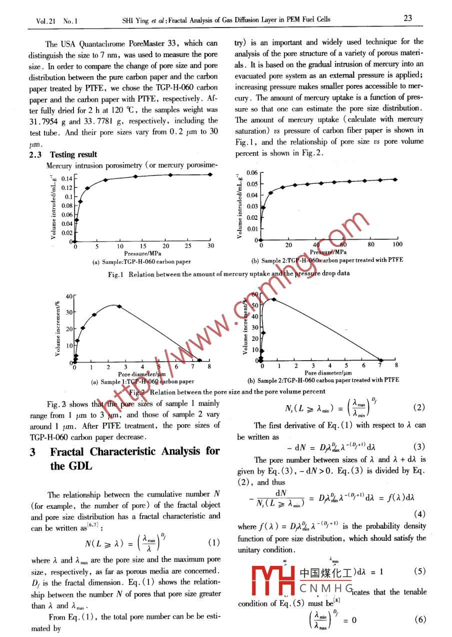 Vol 21 No IJoumal of Wuhan University of Technology-Mater. Sci.EdMarch 2006fractal Analysis of Gas Diffusion Layer in PEM Fuel CellsSHI Ying" XIAO Jinsheng PAN Mu YUAN Runzhang(1. State Key Laboratory of Advanced Technology for Materials Synthesis and Processing, wuhan University of TechnologyWuhan 430070, China; 2. School of Automation, Wuhan University of Technology, Wuhan 430070,China3. School of Automotive Engineering, Wuhan University of Technology, Wuhan 430070, ChiAbstract: The aim of this study is to show how fractal analysis can be effectiely used to characterize thetexture of porous solids. The materials under study were carbon papers, the backing material of the gas diffulayer( GDL) in Proton Exchange Membrane Fuel Cell( PEMFC). The fractal dimensions were calculatedanalyzing data from mercury porosimetry. The polytetrafluoroethylene( PTFE)treated carbon paper shous a sig-nificantly high fractal dimension ualue than pure sample, and the high fractal dimension signifies that the physicalcomplexity of the pore surface is enhanced, The fractal dimension can be used as a walid parameter to monitor theextural evolution of the samples as the treatment progresses, as this behaves in a similar way to other textural parameters. The use of fractal analysis in conjunction with the results of classical characterization methods leads to abetter understanding of textural modifications in the processing of materialsKey words: PEMFC; gas diffusion layer; fractal dimension mercury porosimetry1 Introductioninformation that may be added to the results of traditionaldeterminations. The aim of the present study is threefoldFirst, it will show that the gDl has a fractal characterisThe gas diffuse layer(GDL) is one of the most im- tic. Second, fractal techniques can enhance the underportant components in PEM fuel cells( PEMFC).TheGDL can make reactant gases be dispersed uniformly onstanding of textural modifications undergone by carbonelectrode surface, and provide electron channels and per as a consequence of PtFe treatment. Third, the fracdrain channels. Meanwhile, the GDL supports the cata- tal dimension is a useful parameter to monitor the texturalevolution during the PTFE treatmentFor these reasons, the structure and material parameters 2 Pore Distribution Measurement ofof the GDl influence the overall performance of the PEM-GDLFC significantly. In order to obtain a suitable end product, the textural properties of carbon paper, backing ma-terial of the GDL, are very important, and it is desirable 2.1 Preparation of the GDL sampleto know as much as possible about their textural featuresSince carbon papers have a homogeneous porous laThe surface area, porosity and pore size distribution are, mella structure, as well as excellent conductance, chemiamong others, useful parameters in achieving this goal, cal stability, and thermal stability as graphite, they areand are traditionally used to characterize the texture of po- widely used as GDl material in the PEMFC electroderous solids. In recent years, a new approach to the study For the same reasons, carbon papers are also used asof porous structures and surfaces, fractal analysis, is in- backing materials of the GDL in our present research.Thecreasingly used. This method has its origin in fractal theo- carbon papers that are most widely used in China are fromry, which was formally introduced in the mid-1970sJapanese TORAY Inc, German SGL technique IncThe fractal approach relies on the concept of self-similari- Canadian Ballard Inc. or E-Tek Inc. The TGP-H-060ty and is an altemative way to characterize complex georcarbon papers used in our experiments are from Japaneseetries such as the surface area or pore structure of mate- TORAY Inc. The thickness of the carbon papers is 0. 19rials(2-53. The fractal analysis of data collected from mer- mm. PTFE emulsion( Du Pont )was diluted to makeury porosimetric analysis furmishes us with extra textural aqueous solutions. The carbon papers were dipped entirely in the PTFE solutions and dried at room temperatureReceived: March 24, 2004; Accepted June 23, 2005)After then, the samples were heat-treated in air. The ac-SHI Ying(11): Lecturer: PhD Candidate: E-mail: a- laly@ tive carbon powder(Vulcan XC72)was mixed with PTFE* Corresponding Author: XIAO Jinsheng(肖金生):PhD;Pof.;Eemulsion in the solvent of water and ethanol then soni.mail, whut. edu. en中國煤化工 e was obtained.TheFunded byundation of Hubeixture. This coating2003ABA088)and the Special Scientific Research Foundation for laverCNMHGCollege Doctor Subjects from Ministry of Education of China(N20030497012)2.2 Testing methodVol 21 No. 1SHI Ying et al: Fractal Analysis of Gas Diffusion Layer in PEM Fuel CellsThe USA Quantachrome PoreMaster 33, which can try)is an important and widely used technique for thedistinguish the size to 7 nm, was used to measure the pore analysis of the pore structure of a variety of porous materi-size. In order to compare the change of pore size and pore als. It is based on the gradual intrusion of mercury into ardistribution between the pure carbon paper and the carbon evacuated pore system as an extemal pressure is applied;paper treated by PTFE, we chose the TGP-H-060 carbon increasing pressure makes smaller pores accessible to merpaper and the carbon paper with PTFE, respectively. Af- cury. The amount of mercury uptake is a function of prester fully dried for 2 h at 120 C, the samples weight was sure so that one can estimate the pore size distribution31.7954 g and 33. 7781 g, respectively, including the The amount of mercury uptake( calculate with mercurytest tube. And their pore sizes vary from 0. 2 um to 30 saturation)us pressure of carbon fiber paper is shown inFig 1, and the relationship of pore size us pore volume2. 3 Testing resultpercent is shown in Fig. 2Mercury intrusion porosimetry (or mercury porosime-020.1言004已003202530Pressure/MPaFig1 Relation between the amount of mercury uptake and the pressure drop da
