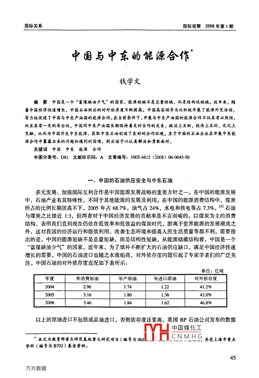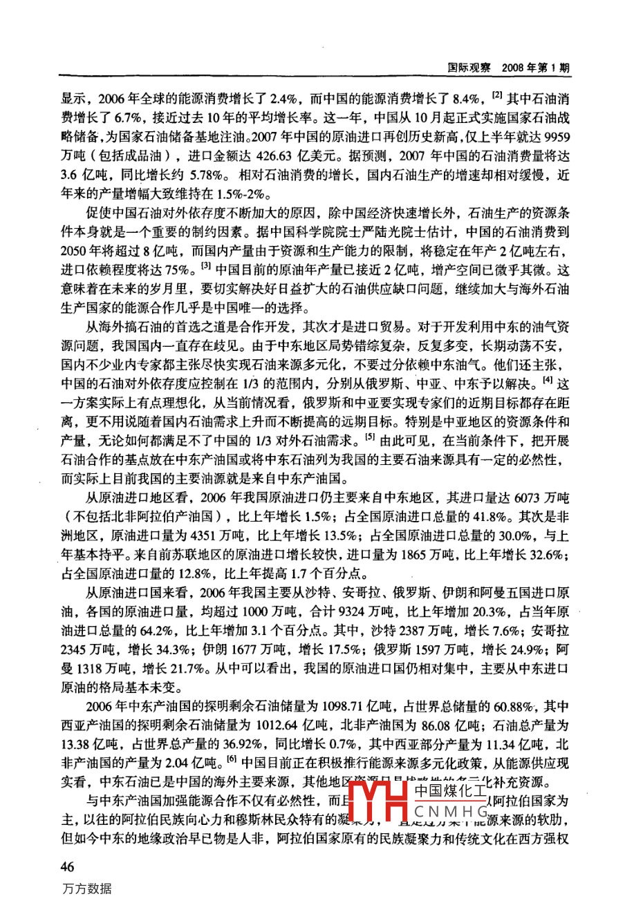 國際關(guān)系國際觀察2008年第1期中國與中東的能原合作錢學文摘要中國是一個“富煤缺油少氣”的國家,能源短缺不是總量短缺,而是結(jié)構(gòu)性短缺。近牛釆,隨著中國經(jīng)濟快速增長,中國石油供應的對外依存度不斷提高。中國高層領(lǐng)導為此積極開展了能源外交活動有力地促進了中國與中東產(chǎn)油國的能源合作。在當前條件下,開展與中東產(chǎn)油國的能源合作不僅具有必然性,而且具有一定的安全性。中國同中東產(chǎn)油國長期保持著友好合作的關(guān)系,政治上互助,經(jīng)濟上互補,文化上交融,從而為中國開發(fā)中東能源,獲取中東石油創(chuàng)造了良好的合作環(huán)境。至于中國的石油企業(yè)在開展中東能源合作中暴露出來的問題和遇到的困難,則應該予以認真解決和勇敢面對。關(guān)鍵詞中國中東能源合作中圖分類號:D81文獻標識碼:A文章編號:1005-4812(2008)060045-50、中國的石油供應安全與中東石油多元發(fā)展、加強國際互利合作是中國能源發(fā)展戰(zhàn)略的重要方針之一。在中國的能源發(fā)展中,石油產(chǎn)業(yè)有其特殊性,不同于其他能源的發(fā)展及利用。在中國的能源消費結(jié)構(gòu)中,煤炭所占的比例長期居高不下,2005年占687%,油氣占24%,水電和核電等占73%。田石油與煤炭之比接近1:3,但兩者對于中國經(jīng)濟發(fā)展的貢獻率是不言而喻的。以煤炭為主的消費結(jié)構(gòu),表明我們直到現(xiàn)在仍處在低效率和低效益的煤炭時代,游離于世界能源的發(fā)展潮流之外,這對我國的經(jīng)濟運行和能效利用、改善生態(tài)環(huán)境和提高人民生活質(zhì)量等都不利。需要指出的是,中國的能源短缺不是總量短缺,而是結(jié)構(gòu)性短缺。從能源儲藏結(jié)構(gòu)看,中國是一個富煤缺油少氣”的國家,近年來,為了填補不斷擴大的石油供應缺口,滿足中國經(jīng)濟快速增長的需要,中國的石油進口也隨之水漲船高,對外依存度問題引起了專家學者們的廣泛關(guān)注。中國石油的對外依存度近況如下表所示單位:億噸年度年消費原油年產(chǎn)原油年進口原油對外依存度20041.2241.2%3.1618043.0%20063.4618416246.8%以上的原油進口不包括成品油進口,否則依存度還要高。英國BP石油公司發(fā)布的數(shù)據(jù)中國煤化工本文為教育部重點研究基地重大研究項目(編號為06JCNMHG一"以,并受上海市重點學科(編號為B702)基金資助。國際觀察2008年第1期顯示,2006年全球的能源消費增長了24%,而中國的能源消費增長了84%,四其中石油消費增長了67%,接近過去10年的平均增長率。這一年,中國從10月起正式實施國家石油戰(zhàn)略儲備,為國家石油儲備基地注油。2007年中國的原油進口再創(chuàng)歷史新高僅上半年就達9959萬噸(包括成品油),進口金額達42663億美元。據(jù)預測,2007年中國的石油消費量將達36億噸,同比增長約578%。相對石油消費的增長,國內(nèi)石油生產(chǎn)的增速卻相對緩慢,近年來的產(chǎn)量增幅大致維持在1.5%2%。促使中國石油對外依存度不斷加大的原因,除中國經(jīng)濟快速增長外,石油生產(chǎn)的資源條件本身就是一個重要的制約因素。據(jù)中國科學院院士嚴陸光院士估計,中國的石油消費到2050年將超過8億噸,而國內(nèi)產(chǎn)量由于資源和生產(chǎn)能力的限制,將穩(wěn)定在年產(chǎn)2億噸左右,進口依賴程度將達75%。因中國目前的原油年產(chǎn)量已接近2億噸,增產(chǎn)空間已微乎其微。這意味著在未來的歲月里,要切實解決好日益擴大的石油供應缺口問題,繼續(xù)加大與海外石油生產(chǎn)國家的能源合作幾乎是中國唯一的選擇。從海外搞石油的首選之道是合作開發(fā),其次才是進口貿(mào)易。對于開發(fā)利用中東的油氣資源問題,我國國內(nèi)一直存在歧見。由于中東地區(qū)局勢錯綜復雜,反復多變,長期動蕩不安,國內(nèi)不少業(yè)內(nèi)專家都主張盡快實現(xiàn)石油來源多元化,不要過分依賴中東油氣。他們還主張,中國的石油對外依存度應控制在1/3的范圍內(nèi),分別從俄羅斯、中亞、中東予以解決。向這一方案實際上有點理想化,從當前情況看,俄羅斯和中亞要實現(xiàn)專家們的近期目標都存在距離,更不用說隨著國內(nèi)石油需求上升而不斷提高的遠期目標。特別是中亞地區(qū)的資源條件和產(chǎn)量,無論如何都滿足不了中國的1/3對外石油需求。由此可見,在當前條件下,把開展石油合作的基點放在中東產(chǎn)油國或?qū)⒅袞|石油列為我國的主要石油來源具有一定的必然性,而實際上目前我國的主要油源就是來自中東產(chǎn)油國。從原油進口地區(qū)看,2006年我國原油進口仍主要來自中東地區(qū),其進口量達6073萬噸(不包括北非阿拉伯產(chǎn)油國),比上年增長1.5%;古全國原油進口總量的41.8%。其次是非洲地區(qū),原油進口量為4351萬噸,比上年增長13.5%;古全國原油進口總量的300%,與上年基本持平。來自前蘇聯(lián)地區(qū)的原油進口增長較快,進口量為1865萬噸,比上年增長326%;占全國原油進口量的128%,比上年提高17個百分點。從原油進口國來看,2006年我國主要從沙特、安哥拉、俄羅斯、伊朗和阿曼五國進口原油,各國的原油進口量,均超過1000萬噸,合計9324萬噸,比上年增加203%,占當年原油進口總量的642%,比上年增加3.1個百分點。其中,沙特2387萬噸,增長76%;安哥拉2345萬噸,增長34.3%;