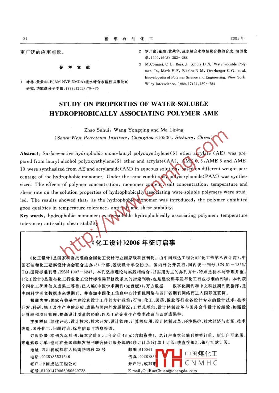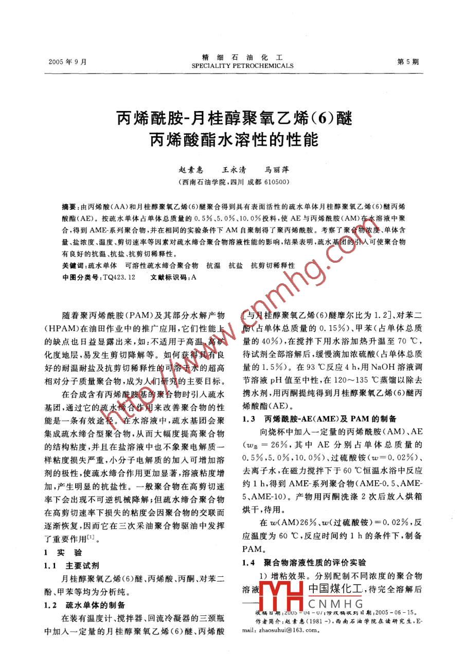 2005年9月精細(xì)石油化工SPECIALITY PETROCHEMICALS第5期丙烯酰胺-月桂醇聚氧乙烯(6)醚丙烯酸酯水溶性的性能趙素惠王永清馬麗萍(西南石油學(xué)院,四川成都610500)摘要:由丙烯酸(AA)和月桂醇聚氧乙烯(6)醚聚合得到具有表面活性的硫水單體月桂醇聚氧乙烯(6)醚丙烯酸酯(AE)。按疏水單體占單體總質(zhì)量的0.5%、5.0%、10.0%投料,使AE與丙烯酰胺(AM)在水溶液中聚合,得到AME系列聚合物,并在相同的實(shí)驗條件下AM自聚制得了聚丙烯酰胺??疾炝司酆衔餄舛取误w含量、鹽濃度、溫度、剪切速率等因素對疏水締合聚合物溶液性能的影響,結(jié)果表明,疏水基團(tuán)的引入可使聚合物有良好的抗溫、抗鹽、抗剪切稀釋性關(guān)鍵詞:疏水單體可溶性疏水締合聚合物抗溫抗鹽抗剪切稀釋性中圖分類號:TQ423.12獻(xiàn)標(biāo)識碼:A隨著聚丙烯酰胺(PAM)及其部分水解產(chǎn)物[與月桂醇聚氧乙烯(6)醚摩爾比為1.2]、對苯二(HPAM)在油田作業(yè)中的推廣應(yīng)用,它們性能上酚(占單體總質(zhì)量的0.15%)、甲苯(占單體總質(zhì)的缺點(diǎn)也日益顯露出來,如:不適用于高溫、高礦量的40%),在攪拌下用水浴加熱升溫至70℃化度地層,易發(fā)生剪切降解等。如何獲得具有良待試劑全部溶解后,緩慢滴加濃硫酸(占單體總質(zhì)好的耐溫耐鹽及抗剪切稀釋性的可溶于水的超高量的1.5%)。在93℃反應(yīng)4h,用NaOH溶液調(diào)相對分子質(zhì)量聚合物,成為人們研究的主要目標(biāo)。節(jié)溶液pH值至中性,在120~135℃蒸餾以除去在合成含有丙烯酰胺基的聚合物時引人疏水?dāng)y水劑,用丙酮提純得到月桂醇聚氧乙烯(6)醚丙基團(tuán),通過它的疏水締合作用來改善聚合物的性烯酸酯(AE)。能是一條有效途徑。在水溶液中,疏水基團(tuán)會聚1.3丙烯酰胺-AE(AME)及PAM的制備集成疏水締合型聚合物,從而大幅度提高聚合物向燒杯中加入一定量的丙烯酰胺(AM)、AE的結(jié)構(gòu)粘度,并且在鹽溶液中也不象聚電解質(zhì)(=26%,其中AE分別占單體總質(zhì)量的樣粘度損失嚴(yán)重,小分子電解質(zhì)的加入可增加溶0.5%,5.0%,10.0%)、過硫酸銨(=0.02%)劑的極性,使疏水締合作用更加顯著溶液粘度增去離子水,在磁力攪拌下于60℃恒溫水浴中反應(yīng)加,產(chǎn)生明顯的抗鹽性。一般聚合物在高剪切速約1h,得到AME系列聚合物(AME0.5、AME率下會出現(xiàn)不可逆機(jī)械降解;但疏水締合聚合物5、AME10)。產(chǎn)物用丙酮洗滌2次后放入烘箱在高剪切速率下?lián)p失的粘度會因聚合物的交聯(lián)而烘干,待用逐漸恢復(fù),因而它在三次采油聚合物驅(qū)油中發(fā)揮在w(AM)26%、v(過硫酸銨)=0.02%,反了重要作用應(yīng)溫度為60℃,反應(yīng)時間約1h的條件下,制備實(shí)驗PAM1.1主要試劑1.4聚合物溶液性質(zhì)的評價實(shí)驗月桂醇聚氧乙烯(6)醚、丙烯酸、丙酮、對苯」1)增粘效果。分別配制不同濃度的聚合物酚、甲苯等均為分析純。溶中國煤化工,待完全溶解后12疏水單體的制備CNMHG在裝有溫度計、攪拌器、回流冷凝器的三頸瓶U4-0/;修漢收巧日期:2005-06-15作者簡介:趙素惠(1981-),西南石油學(xué)院在讀研究生,E中加入一定量的月桂醇聚氧乙烯(6)醚、丙烯酸mil:zhaosuhuit163.com精細(xì)石油化工2005年用NX6-3型旋轉(zhuǎn)粘度計測定各溶液粘度。超分子結(jié)構(gòu)的動態(tài)物理交聯(lián)網(wǎng)絡(luò),使流體力學(xué)體2)抗溫性能。分別配制0.5%的聚合物溶積增大,溶液粘度增幅較大,此時溶液的粘度明顯液,在不同溫度下用NX6型旋轉(zhuǎn)粘度計在300高于PAM2。此外,疏水單體含量越高,溶液的r/min、500s-1條件下測定各溶液的粘度。粘度也就越高。3)抗鹽性能。分別配制0.5%的聚合物溶2.2溫度對聚合物溶液粘度的影響液,向其中加入一定量的NaCl,得到不同濃度的圖2為聚合物水溶液的粘度與溫度的關(guān)系。鹽溶液,在30℃用NX6型旋轉(zhuǎn)粘度計在300r/從圖2可見,AME5、AME-10聚合物水溶液的min、500s-1條件下測定各溶液的粘度。粘度隨溫度的升高都有所降低,但AME0.5的4)抗剪切性能。分別配制0.5%的聚合物溶曲線變化情況無規(guī)律。在相同溫度下,PAM水液,在25℃用NX6型旋轉(zhuǎn)粘度計測定不同轉(zhuǎn)速溶液的粘度值要比AME系列聚合物水溶液的粘下各溶液的粘度度值低。有人[3認(rèn)為,疏水締合作用是一個吸熱2結(jié)果與討論的熵驅(qū)動過程,當(dāng)溫度升高時,有利于分子間的締2.1聚合物含量對水溶液粘度的影響合,溶液的粘度上升;但同時溫度的升高使疏水基圖1為各溶液在不同聚合物含量下的粘度曲和水分子的熱運(yùn)動加劇,疏水基團(tuán)周圍的水合層線。從圖1可以看出,PAM水溶液的粘度與含量發(fā)生變化,疏水締合作用減弱。這兩個因素競爭的關(guān)系表現(xiàn)為一條較為平坦的曲線,在PAM含的結(jié)果決定了不同疏水締合聚合物溶液的粘度量2.0~4.0mg/g范圍內(nèi)粘度沒有變化。而值,所以締合聚合物溶液的粘度隨溫度的變化關(guān)AME系列聚合物溶液的粘度均隨聚合物含量的系復(fù)雜無規(guī)律。增加而增加,在含量較低時,粘度與含量可近似成正比例關(guān)系;達(dá)到一定值后,粘度的增幅開始顯著增大。AME-1OAME-S溫度AME-O-S圖2AME,PAM水溶液的粘度與溫度的關(guān)系2.3NaCl含量對聚合物粘度的影響聚合物含量Amg·g)圖3為聚合物溶液粘度與NaCl含量的關(guān)圖1聚合物含量與溶液粘度的關(guān)系系這種現(xiàn)象