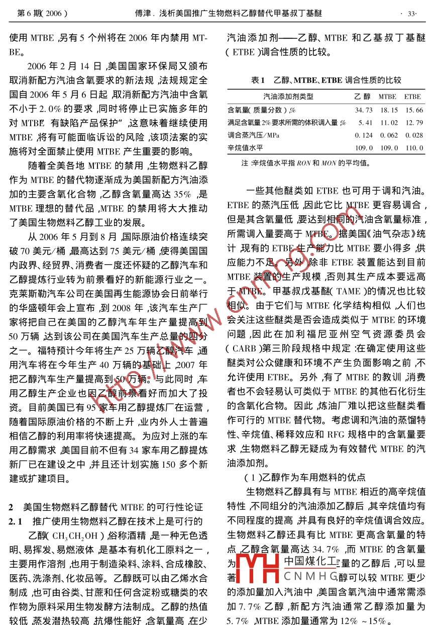 石油化工技術(shù)經(jīng)濟第22卷國內(nèi)外動態(tài)淺析美國推廣生物燃料乙醇替代甲基叔丁基醚傅津(中海油田服務(wù)股份有限公司北京100010)擿要:由于甲基叔丁基醚MTBE〕的污染問題以及囯際油價的持續(xù)高漲生物燃料乙醇越來越受到美國社會公眾的關(guān)注。生物燃料乙醇具有與MIBE相近的高辛烷值、良好的辛烷值調(diào)合效應(yīng)、含氧量高達34.7%等特性在技術(shù)和經(jīng)濟上都具有替代MTBE的可行性美國大力推廣生物燃料乙醇替代MTBE。針對美國禁用MTBE的趨勢對國內(nèi)MIBE的生產(chǎn)和應(yīng)用前景提出了發(fā)展建議關(guān)鍵詞:美國燃料乙醇替代甲基叔丁基醚自20世紀70年代石油危機以來,為了應(yīng)對20世紀90年代末期開始美國加州在湖泊石油價格急劇上漲的局面降低美國對國外石油和溪流中陸續(xù)發(fā)現(xiàn)有MIBE污染并在地下水中的依存度美國一直致力于各種各樣的汽車耗能也檢測出MTBE之后有關(guān)的爭論就開始了。加替代品研究其中包括油電兩用、天然氣、生物柴州從1997年秋季開始對MTBE及其他含氧化合油、氫燃料和乙醇等。目前美國感到要從長遠戰(zhàn)物對水資源影響進行全面調(diào)查于1998年底得出略的角度解決美國能源和污染問題,氫能源可能結(jié)論MBE對地下水和飲用水有污染如此用于是最有希望的嘗試。而從近中期的角度看燃料水處理和保健費用將每年高達30億美元。同時乙醇則可能最具吸引力。美國國土調(diào)查報告的結(jié)論也稱在全美范圍內(nèi)有27%的城區(qū)水井監(jiān)測到了MTBE。MTBE污染問1美國生物燃料乙醇替代MTBE的歷史緣由題越來越受到美國國會和社會公眾的關(guān)注美國甲基叔丁基醚MTBE)是異丁烯和甲醇在強各州紛紛采取措施逐漸減少直至禁止MTBE的使酸性陽離子交換樹脂作用下生成的一種高辛烷值用。其中緬因州已于1998年10月宣布禁用MT汽油組分其馬達法辛烷值為l0Ⅰ研究法辛烷值BEΣ添加劑。新澤西州鑒于本州環(huán)保部門已發(fā)現(xiàn)為117。在汽油組分中有良好的辛烷值調(diào)合效有400口私用井和65口公用井被MTBE污染的應(yīng)并具有很好的穩(wěn)定性和互溶性。所以汽油中事實于1999年4月12日也公開呼吁美國立法MTBE的添加作用在于它的抗爆性及含氧性。禁用汽油添加劑MTBE。美國加州于204年1美國環(huán)保局在1979年批準將MTBE作為無月1日起禁用MTBE亞利桑那州、康涅狄格州和鉛汽油添加劑使用后,MTBE被廣泛用于調(diào)和汽紐約州也尾隨其后。明尼蘇達州和內(nèi)布拉斯加州油。1990年美國國會通過空氣清凈法修正案,也通過法案減少汽油中MTBE加入量。對汽油除了要求控制蒸汽壓、苯含量外還要求含2003年4月美國參議院以67票對29票通氧汽油添加不超過2.7%(質(zhì)量分數(shù))的氧新配過了撥款75億美元挾持乙醇生產(chǎn)和禁用MTBE方汽油添加不少于2.0%(質(zhì)量分數(shù))的氧。這樣的j正家。據(jù)國可再生燃料協(xié)會報告各煉油廠為了滿足新配方汽油的含氧要求在含到中國煤化工禁止在汽油中添加和氧、新配方汽油中大量使用MTBE。過去10余年CNMHG間美國共有17個州使用新配方及含氧汽油,它收稿日期2006-0908。門的使用量一直占全美汽油消耗量的三分之作者簡介搏津女35歲經(jīng)濟師畢業(yè)于北京大學經(jīng)濟管而其中約85%使用了MTBE作為含氧化合物僅理學院。目前在中海油田股份有限公司董事會秘書辦公室約8%使用牽葧遞料乙醇作為含氧化合物第6期2006)傅津.淺析美囯推廣生物燃料乙醇替代甲基叔丁基醚使用MTBE另有5個州將在2006年內(nèi)禁用MT-汽油添加劑——乙醇、MTBE和乙基叔丁基醚BE(ETBE)調(diào)合性質(zhì)的比較。2006年2月14日美國國家環(huán)保局又頒布取消新配方汽油含氧要求的新法規(guī)法規(guī)規(guī)定全表1乙醇、MTBE、ETBE調(diào)合性質(zhì)的比較國自2006年5月6日起取消新配方汽油中含氧汽油添加劑類型乙醇 MTBE ETBE不小于2.0%的要求同時將停止已實施多年的含氧量(質(zhì)量分數(shù))%34.7318.1515.66對M'TBE有缺陷產(chǎn)品保護”這意味著繼續(xù)使用滿足含氧量2%要求所需的體積調(diào)入量%5.411.0212.79MTBE將有可能面臨訴訟的風險,該項法案的實調(diào)合蒸汽壓/MPa0.1240.0620.028施將對全面禁止使用MTBE產(chǎn)生重要的影響。辛烷值水平109.0109.0110.0隨著全美各地MBE的禁用生物燃料乙醇注辛烷值水平指RON和MON的平均值。作為MTBE的替代物逐漸成為美國新配方汽油添加的主要含氧化合物,乙醇含氧量高達35%,是些其他醚類如ETBE也可用于調(diào)和汽油MTBE理想的替代品,MTBE的禁用將大大推動ETBE的蒸汽壓低因此它比MTB更容易調(diào)合,了美國生物燃料乙醇工業(yè)的發(fā)展。但是其含氧量低要達到相同的汽油含氧量標準,從2006年5月到8月國際原油價格連續(xù)突所需調(diào)入量要高于MTBE。據(jù)美國《油氣雜志》統(tǒng)破70美元/桶最高達到75美元/桶使得美國國計現(xiàn)有的ETBE生產(chǎn)能力比MTBE要小得多供內(nèi)政界、經(jīng)貿(mào)界、消費者一度還懷疑的乙醇汽車和應(yīng)能力不足。另外除非ETBE裝置能達到目前乙醇提煉行業(yè)轉(zhuǎn)為前景看好的新能源行業(yè)之MTBE裝置的生產(chǎn)規(guī)模否則其生產(chǎn)成本要遠高克萊斯勒汽車公司在美國再生能源協(xié)會日前舉行于MTBE。甲基叔戊基醚TAME)的情況也比較的華盛
