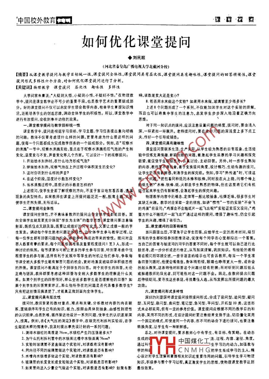 。中國校外教育I課程探索如何優(yōu)化課堂提問◆劉民順(河北省朵鼠品廣”媚電視大學(xué)北嫩河分校)[摘要]從課堂教學(xué)提問與教學(xué)目標統(tǒng)一性,課堂提問全體性,課堂提問具有層次性,課堂提問具有趣味性,課堂提問的回答稍候性,課堂提問形式多樣性六個方面.對如何優(yōu)化課堂提問進行了分析。[關(guān)鍵詞]物理教學(xué)課堂提問 層次性 趣味性多樣性大學(xué)問家朱熹說:“大疑則大悟小疑則小悟,不疑則不惜。”在物理教響,讀數(shù)是變大還是變小?學(xué)中,提問是課堂教學(xué)必不可少的重要手段,也是教學(xué)藝術(shù)的重要組成部8.能否用水來做這個實驗?如果用水來做,玻璃管至少得多長?分。好的課堂提問不僅可以啟發(fā)學(xué)生領(lǐng)會教學(xué)內(nèi)客,檢查學(xué)生掌握知識情上述8個問題形成了一個系列,不僅能加深學(xué)生對這個實驗的理解,況,還能培養(yǎng)學(xué)生的創(chuàng)造思維.調(diào)動全體學(xué)生的積極性。所以,課堂教學(xué)中而且也可以將集 中學(xué)生的注意力,啟發(fā)學(xué)生步步深入地沿著正確方向進行有效提問,會收到事半功倍的效果。思維。一.課堂教學(xué)提問與教學(xué)目標統(tǒng)一性對于同一知識點的提問,應(yīng)該注意設(shè)置問題的梯度,提問時,要由淺入課堂教學(xué)中,提問是根據(jù)學(xué)習(xí)目標、學(xué)習(xí)主題、學(xué)習(xí)任務(wù)提出意向明確深,一環(huán)緊扣一環(huán)展開。 老師提問時,要在安排問題的深淺度上多下點工的問題。教師不僅要考慮提什么樣的問題,更要考慮為什么提這樣的問夫,作好一個引導(dǎo)或鋪墊。題,使每一個問題都成為完成教學(xué)任務(wù)的一-個組成部分。例如,在“ 觀察水四、課堂提問具有趣味性的沸騰"一節(jié)中,觀察水沸騰賣驗,重點在于觀察水沸騰前后氣泡的產(chǎn)生和課堂提問要聯(lián)系生活、生產(chǎn)實際,從學(xué)生較為熟悉的日?,F(xiàn)象、生活經(jīng)變化,溫度變與不變,聲音變化等幾個方面??梢栽O(shè)計一下的觀察提問:驗中提煉充滿情趣、新穎別致的問題,能激起學(xué)生濃厚的學(xué)習(xí)興趣和探兗1.開始給水加熱時,在什么地方形成氣泡?欲望,能促使學(xué)生積極思考認真討論、主動回答。另外,對一些學(xué)生熟知2.繼續(xù)給水加熱.觀察氣泡在上升過程中體積發(fā)生的變化?的內(nèi)容.教師要不落俗套,善于變換提問角度,設(shè)計精巧.生動有趣的提問,3.這時你聽到什么樣的聲音?讓學(xué)生聽后有新鮮感,剌激學(xué)生的探究欲。例如,學(xué)習(xí)“熱傳遞"時,可提這4.在這個階段,溫度計示數(shù)怎樣變化?樣-一個問題:"把包著同種紙的木棒和鐵棒,同時放在火上燒,問哪個棒上5.當水沸騰過程中,溫度計的示數(shù)足怎樣的?的紙先燃?”木棒、鐵棒、紙、火都是學(xué)生熟悉的物體,但在這里將它們有機.上述提問,使學(xué)生全面了解觀察的方向,不至于盲目地東看西看,遺漏組合起來學(xué)生仍有 新鮮感,會激起學(xué)生的探究興趣?,F(xiàn)象的典型特點。如果教師在課堂上所提問題泛泛一般,脫離主題,只能.物理教學(xué)內(nèi)容中的概念定律等. -般比較抽象,枯燥乏味,很多學(xué)生對使學(xué)生茫然失措,無所適從。其缺乏興趣。教學(xué)時應(yīng)采取一定的措施,如講“慣性"一節(jié)的實驗“不會飛二、課堂提問全體性的雞蛋"前設(shè)問:“雞蛋會不會隨紙片一起飛出呢?"實驗證實后又設(shè)問:“雞課堂提問全體性,并不意味著教師的提問應(yīng)使全體學(xué)生都能回答。面蛋為什么不隨紙片一 起飛出?"通過這樣的提問,增強了趣味性,仍會引起向全體學(xué)生就是要充分體現(xiàn)“學(xué)生為主體"的教學(xué)思想,課堂提問要注意輻學(xué)生的興趣,增強 了吸引力。射面既抓住點又顧及面,既要讓成績好的同學(xué)發(fā)言,又要讓成績-般的學(xué)五、課堂提問的回答稍候性生發(fā)言。調(diào)動每個學(xué)生思考問題的積極性,讓全體學(xué)生參與教學(xué)過程,讓當問題提出后,不要急于讓學(xué)生回答,應(yīng)給學(xué)生一定的思考時間,吸引每一位學(xué)生都有回答問題的機會,體驗參與和成功帶來的愉悅。提問對應(yīng)所有的學(xué) 生都積極參加思維活動,促使每個同學(xué)在心里都擬出一個答案。答人數(shù)要有量的要求。每個問題根據(jù)難易及重要程度提問!至3人,形成一當 自己的答案與被提問的同學(xué)的答案不同時,每個學(xué)生就可以自己進行比種討論的氛圍。每節(jié)課要盡可能讓更多的學(xué)生參與回答,特別要考慮中低較思考 ,進-步分析或進行修正,從而加深理解,鞏固知識。有經(jīng)驗的教師程度學(xué)生的參與面,選擇有利于發(fā)展中等學(xué)生的時機讓他們參與,爭取每常在提問后環(huán)顧全班, -些非語言的暗示也可告訴教師,每當一個學(xué)生準節(jié)課全班大多數(shù)學(xué)生能有解答問題的機會.更好地激發(fā)班級群體積極思維備回答問題時 ,他便會嘴微張,身體稍前傾,眼睛也睜得更大一些,或許會的熱情。課堂提問不能滿足于個別學(xué)生的回答。對個別學(xué)生的回答,無論抬起頭微笑 ,這表明他對回答這個間題比較有把握;而對聽到問題后低頭正確與錯誤,教師都要考慮這種回答與全班大多數(shù)學(xué)生的理解是什