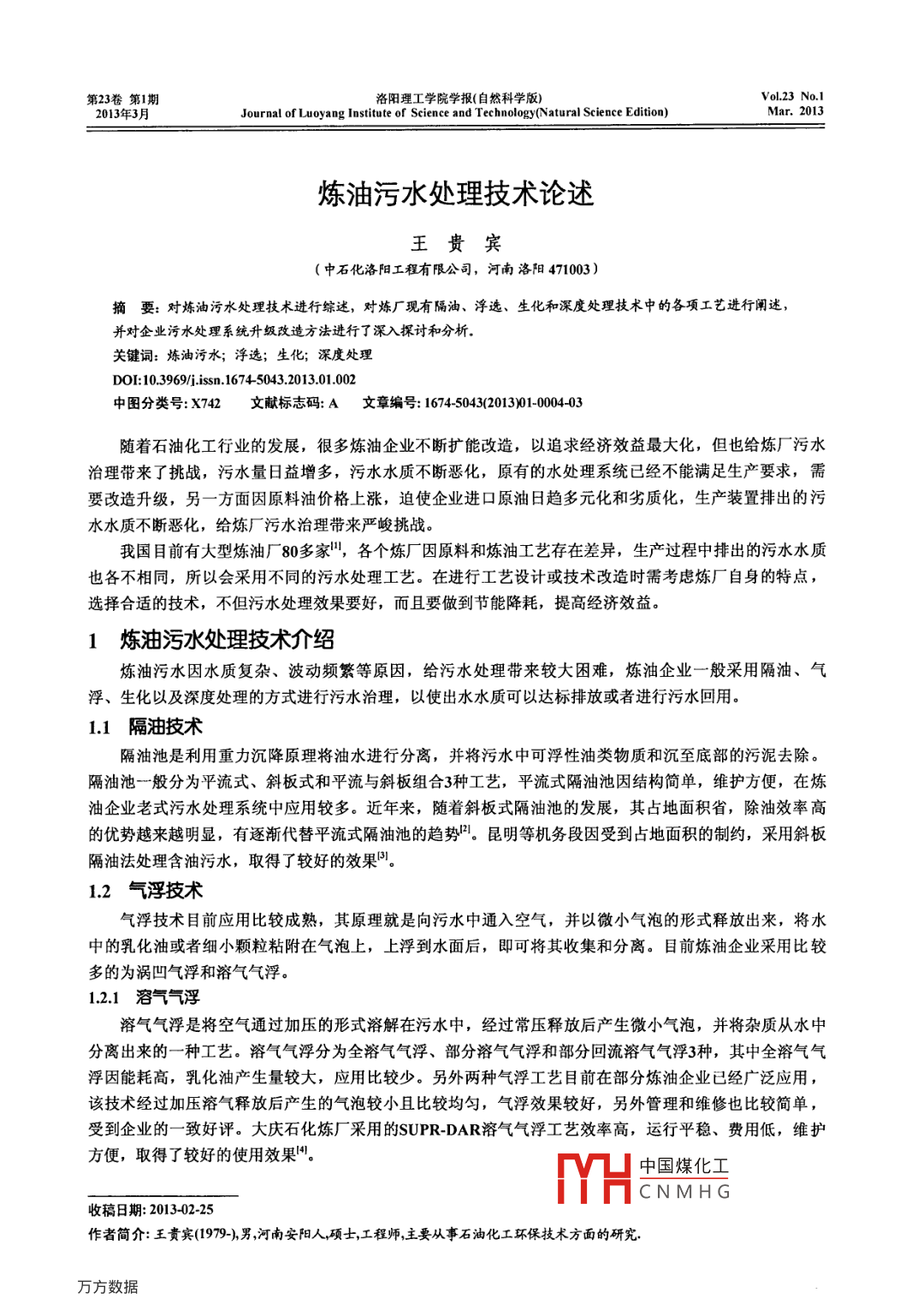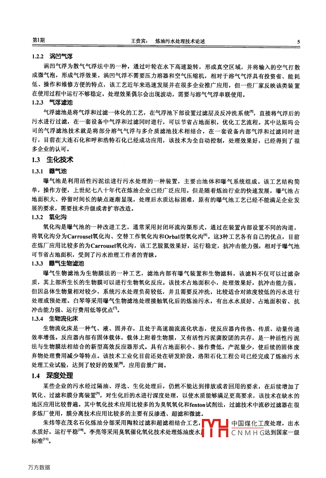 第23卷第1期洛陽理工學(xué)院學(xué)報(bào)(自然科學(xué)版)Vol.23 No.12013年3月Journal of Luoyang Institute of Science and Technology(Natural Science Edition)Mar.2013===煉油污水處理技術(shù)論述王貴賓(中石化洛陽工程有限公司,河南洛陽471003 )商要:對煉油污水處理技術(shù)進(jìn)行綜述,對煉廠現(xiàn)有隔油、浮選、生化和深度處理技術(shù)中的各項(xiàng)工藝進(jìn)行闡述,并對企業(yè)污水處理系統(tǒng)升級改造方法進(jìn)行了深入探討和分析.關(guān)鍵詞:煉油污水;浮選;生化;深度處理D0:103969/.ssn.1674 5043.2013.01.002中圖分類號:X742.文獻(xiàn)標(biāo)志碼: A文章編號: 1674-50431201301-0004-03隨著石油化工行業(yè)的發(fā)展,很多煉油企業(yè)不斷擴(kuò)能改造,以追求經(jīng)濟(jì)效益最大化,但也給煉廠污水治理帶來了挑戰(zhàn),污水量日益增多,污水水質(zhì)不斷惡化,原有的水處理系統(tǒng)已經(jīng)不能滿足生產(chǎn)要求,需要改造升級,另一方面因原料油價(jià)格上漲,迫使企業(yè)進(jìn)口原油日趨多元化和劣質(zhì)化,生產(chǎn)裝置排出的污水水質(zhì)不斷惡化,給煉廠污水治理帶來嚴(yán)峻挑戰(zhàn)。我國目前有大型煉油廠80多家",各個(gè)煉廠因原料和煉油工藝存在差異,生產(chǎn)過程中排出的污水水質(zhì)也各不相同,所以會采用不同的污水處理工藝。在進(jìn)行工藝設(shè)計(jì)或技術(shù)改造時(shí)需考慮煉廠自身的特點(diǎn),選擇合適的技術(shù),不但污水處理效果要好,而且要做到節(jié)能降耗,提高經(jīng)濟(jì)效益。1煉油污水處理技術(shù)介紹煉油污水因水質(zhì)復(fù)雜、波動頻繁等原因,給污水處理帶來較大困難,煉油企業(yè)一般采用隔油、 氣浮、生化以及深度處理的方式進(jìn)行污水治理,以使出水水質(zhì)可以達(dá)標(biāo)排放或者進(jìn)行污水回用。1.1隔油技術(shù)隔油池是利用重力沉降原理將油水進(jìn)行分離,并將污水中可浮性油類物質(zhì)和沉至底部的污泥去除。隔油池-般分為平流式、斜板式和平流與斜板組合3種工藝,平流式隔油池因結(jié)構(gòu)簡單,維護(hù)方便,在煉油企業(yè)老式污水處理系統(tǒng)中應(yīng)用較多。近年來,隨著斜板式隔油池的發(fā)展,其占地面積省,除油效率高的優(yōu)勢越來越明顯,有逐漸代替平流式隔油池的趨勢凹。昆明等機(jī)務(wù)段因受到占地面積的制約,采用斜板隔油法處理含油污水,取得了較好的效果”。1.2氣浮技術(shù)氣浮技術(shù)目前應(yīng)用比較成熟,其原理就是向污水中通入空氣,并以微小氣泡的形式釋放出來,將水中的乳化油或者細(xì)小顆粒粘附在氣泡上,上浮 到水面后,即可將其收集和分離。目前煉油企業(yè)采用比較多的為渦凹?xì)飧『腿軞鈿飧 ?.2.1溶氣氣浮溶氣氣浮是將空氣通過加壓的形式溶解在污水中,經(jīng)過常壓釋放后產(chǎn)生微小氣泡,并將雜質(zhì)從水中分離出來的一種工藝。溶氣氣浮分為全溶氣氣浮、部分溶氣氣浮和部分回流溶氣氣浮3種,其中全溶氣氣浮因能耗高,乳化油產(chǎn)生量較大,應(yīng)用比較少。另外兩種氣浮工藝目前在部分煉油企業(yè)已經(jīng)廣泛應(yīng)用,該技術(shù)經(jīng)過加壓溶氣釋放后產(chǎn)生的氣泡較小且比較均勻,氣浮效果較好,另外管理和維修也比較簡單,受到企業(yè)的-致好評。大慶石化煉廠采用的SUPR-DAR溶氣氣浮工藝效率高,運(yùn)行平穩(wěn)、費(fèi)用低,維護(hù)方便,取得了較好的使用效果"。中國煤化工MHCNMHG收稿日期: 2013-02-25作者簡介:王貴賓(1979-),男,河南安陽人,碩士,工程師,主要從事石油化工環(huán)保技術(shù)方面的研究第1期王貴賓:煉油污水處理技術(shù)論述51.2.2渦凹?xì)飧u凹?xì)飧樯鈿飧》ㄖ械囊环N,通過葉輪在水下高速旋轉(zhuǎn),形成真空區(qū)域,并將輸入的空氣打散成微氣泡,形成氣浮效果。渦凹?xì)飧〔恍枰獕毫θ芷骱涂諝鈮嚎s機(jī),相對于溶氣氣浮具有投資省、能耗低、操作和維修方便的特點(diǎn),該工藝近年來迅速發(fā)展并在很多企業(yè)推廣應(yīng)用,但一些廠家反映該類裝置在使用過程中運(yùn)行不夠穩(wěn)定,處理效果偶爾會出現(xiàn)波動,需要與溶氣氣浮串聯(lián)使用。1.2.3氣浮濾池氣浮濾池是將氣浮和過濾- -體化的工藝, 在氣浮池下部設(shè)置過濾層及反沖洗系統(tǒng)”,直接將氣浮后的污水進(jìn)行過濾,在- -套設(shè)備中氣浮和過濾同時(shí)進(jìn)行,可以節(jié)省占地面積,優(yōu)化工藝流程。其中達(dá)斯瑪公司的氣浮濾池技術(shù)就是將部分溶氣氣浮與多介質(zhì)濾池技術(shù)相結(jié)合,在一套設(shè)備內(nèi)部氣浮和過濾同時(shí)進(jìn)行,目前在大連石化和呼和浩特石化已經(jīng)成功應(yīng)用,該技術(shù)為全自動控制,處理效果好,已經(jīng)得到了很多企業(yè)的認(rèn)可。1.3 生化技術(shù)1.3.1曝氣池曝氣池是利用活性污泥法進(jìn)行污水處理的一-種裝置,主要由池體和曝氣系統(tǒng)組成。該工藝結(jié)構(gòu)簡單,操作方便,上世紀(jì)七八十年代在煉油企業(yè)已經(jīng)廣泛應(yīng)用。但是隨著煉油行業(yè)的快速發(fā)展,曝氣池占地面積大、停留時(shí)間長的缺點(diǎn)逐漸顯現(xiàn),處理后水質(zhì)達(dá)標(biāo)困難,原有的曝氣池工藝已經(jīng)不能滿足企業(yè)發(fā)展的要求,需要技術(shù)升級或者擴(kuò)容改造。1.3.2氧化溝氧化溝是