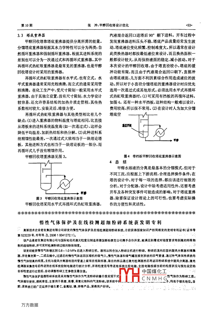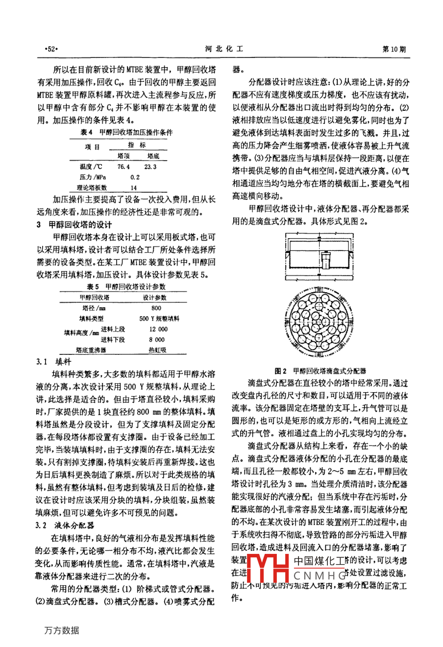 第32卷第10期VoL 32 No 1009年10月y工甲醇回收塔設(shè)計優(yōu)化張沖(中石油東北煉化工程有限公司葫蘆島設(shè)計院遼寧葫蘆島125001)[摘要]對甲醇水溶液的分離操作條件進行了對比對于MTBE裝置甲醇回收塔,采用加壓分離甲醇水溶液有利于回收進料中的C輕組分。另外對甲醇回收塔設(shè)計中比較常見的問題如填料選擇液體分配器的設(shè)計及塔底重沸器的選型根據(jù)設(shè)計實踐進行了分析,并提出了良好的設(shè)計建議[關(guān)鍵詞]甲醇回收:加壓;液體分配器;重沸器[中圖分類號]1205文獻(xiàn)標(biāo)識碼]B[文章編號]1003-5095(2009)100051-03甲醇與水的分離通常采用分餾的方法。在甲基的分離有可能采用其他方案。如MTBE裝置進入甲醇叔丁基醚 CTBE裝置中過量甲醇與異丁烯反應(yīng)生成回收塔的原料內(nèi)含有3%左右的c組分,具體組成見MTBE剩余的甲醇,通過水洗的方式從未反應(yīng)C4中分表2離出來為了降低成本通常這部分甲醇都要求回收,表2MBE裝置甲醇回收塔原料組成循環(huán)使用組分甲醇回收流程量/kgh'含量(t)偉異丁烷20110119醇水分離是最基本的二元分離過程,采用常規(guī)丁烯-17.5260.445分離方式即可以實現(xiàn),MTBE裝置中,甲醇回收示意流正丁烷0.7480.044程見圖1順丁烯620反丁烯8.946.53166.8759.88水溫度/℃40壓力/Pa0.6如果采用常壓操作條件,則塔頂每小時約有圖1甲醇水分離示意流程50kg的放空,放空的組分一般都進入了裝置的火炬2操作條件系統(tǒng)白白燒掉對于年產(chǎn)4萬t的MBE裝置每年大1常規(guī)操作條件約達(dá)到420t左右C損失掉,按3000元/t估算,甲醇水溶液的分離比較容易,采用常規(guī)分餾方損失大約達(dá)到126萬元。MIBE裝置甲醇回收塔放空案,在常壓下即可實現(xiàn),甲醇水分離常規(guī)操作條件見組分的組成見表3表1表3甲醇回收塔放空組分的組成衰1甲醇水溶液分離操作條件組分量/kgh1含量(wt)偉%項目異丁烷1.61塔頂塔底丁烯-15,40溫度/c6201041正丁烷0.55壓力Pa順丁烯3.49理論塔板數(shù)2.2加壓分離中國煤化工8對于某些化工裝置考慮到其他因素甲醇水溶液CNMHG.O[收稿日期]200904-24溫度/40[作者簡介張沖(1972-),女,工程師從事工藝設(shè)計工作壓力Pa河北化工第10期所以在目前新設(shè)計的MTBE裝置中,甲醇回收塔器有采用加壓操作,回收C。由于回收的甲醇主要返回分配器設(shè)計時應(yīng)該注意:(1)從理論上講好的分MTBE裝置甲醇原料罐,再次進入主流程參與反應(yīng),所配器不應(yīng)有速度梯度或壓力梯度,也不應(yīng)該有擾動,以甲醇中含有部分C4并不影響甲醇在本裝置的使以便液相從分配器出口流出時得到均勻的分布。(2)用。加壓操作的條件見表4。液相排放應(yīng)當(dāng)以低速度進行以避免霧化同時也為了表4甲醇回收塔加壓操作條件避免液體到達(dá)填料表面時發(fā)生過多的飛濺。并且過指標(biāo)高的壓力降會產(chǎn)生細(xì)霧噴灑使液體容易被上升氣流塔頂塔底攜帶。(3)分配器應(yīng)當(dāng)與填料層保持一段距離,以便在溫度/℃76.423.3壓力/MPa塔中提供足夠的自由氣相空間,促進汽液分離。(4氣理論塔板數(shù)相通道應(yīng)當(dāng)均勻地分布在塔的橫截面上,要避免氣相加壓操作主要提高了設(shè)備一次投入費用,但從長高速橫向移動。遠(yuǎn)角度來看,加壓操作的經(jīng)濟性還是非??捎^的。甲醇回收塔設(shè)計中,液體分配器、再分配器都采3甲醇回收塔的設(shè)計用的是滴盤式分配器。具體形式見圖2。甲醇回收塔本身在設(shè)計上可以采用板式塔,也可以采用填料塔,設(shè)計者可以結(jié)合工廠所處條件選擇所需要的設(shè)備類型。在某工廠MTBE裝置設(shè)計中,甲醇回收塔采用填料塔,加壓設(shè)計。具體設(shè)計參數(shù)見表5。表5甲醇回收塔設(shè)計參數(shù)甲醇回收塔設(shè)計參數(shù)填料類型500Y規(guī)整填料填料高度進料上段12000進料下段塔底重沸器熱3.1填料填料種類繁多,大多數(shù)的填料都適用于甲醇水溶圖2甲醇回收塔滴盤式分配器液的分離,本次設(shè)計采用500Y規(guī)整填料,從理論上滴盤式分配器在直徑較小的塔中經(jīng)常采用。通過講,此選擇是適合的。但由于塔直徑較小,填料采購改變盤內(nèi)孔徑的尺寸和數(shù)目,可以適用于不同的液體時,廠家提供的是1塊直徑約800m的整體填料填流率。該分配器固定在塔壁的支耳上,升氣管可以是料塔雖然是分段設(shè)計,但為了支撐填料及固定分配圓形的,也可以是矩形的或方形的,氣相向上流經(jīng)立器,在每段塔體都設(shè)置有支撐圈。由于設(shè)備已經(jīng)加工式的升氣管。液相通過盤上的小孔實現(xiàn)均勻的分布完畢,當(dāng)裝填填料時,由于支撐圈的存在,填料無法安滴盤式分配器從結(jié)構(gòu)上來看,存在一個小的缺裝只有割掉支撐圈待填料安裝后再重新焊接這也點。滴盤式分配器液體分配的小孔在分配器的最底為日后填料更換制造了麻煩。所以對于此類規(guī)格的填端,而且孔徑一般都較小,為2~5m左右,甲醇回收料,雖然有整體填料但考慮到裝填及日后的檢修,建塔設(shè)計時孔徑為3mm。當(dāng)處理介質(zhì)清潔時該分配器議在設(shè)計時應(yīng)該采用分塊的填料,分塊組裝雖然裝能實現(xiàn)很好的汽液分配:但當(dāng)系統(tǒng)中存在污垢時,分填麻煩,但可以避免許多不可預(yù)見的問題配器底部的小孔非常容易發(fā)生堵塞,而引