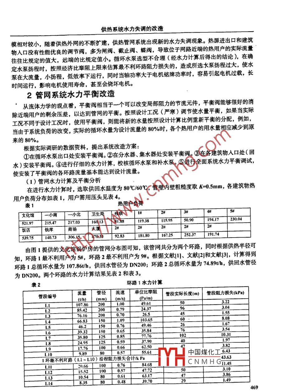 土木建筑學術文庫第13卷2010年供熱系統(tǒng)水力失調的改造朱利軍高琳霞(河南省建設集團有展公司)摘要供熱管網運行的水力平衡調節(jié)是供熱系統(tǒng)中的重要環(huán)節(jié),調節(jié)得好壞直接影響到用戶的供熱質量以及供熱單位的經濟效益.本文分析了某文化館鍋爐房供熱管網水力失調的原因和后果,并提出了解決水力失調的措施。通過對其供熱管網的改造,既達到了節(jié)能降耗的目的,又解決了用戶的熱力失調問題,提高了供熱的質量關鍵詞供熱系統(tǒng)水力失調水力計算衡閥在熱水供暖系統(tǒng)運行過程中,往往會由于設計、施工、改建和調節(jié)等原因,使供熱管網中流量分配與熱用戶所需流量不相符合,有時甚至會差別很大,供熱系統(tǒng)的這種實際水力工況與設計水力工況的不一致性稱為供熱系統(tǒng)的水力失調叫。供熱系統(tǒng)水力失調必然會導致用戶的熱力失調,同時,供熱系統(tǒng)水力失調會直接造成供熱系統(tǒng)運行效果差、能源浪費等后果。有關水力失調的分類和產生的原因有很多,其解決水力失調的辦法也就各不相同。本文以某文化館鍋爐房供熱系統(tǒng)為案例,分析了水力失調形成的原因,歸納了存在的問題,提出了相應的改造方案,通過對管網的水力計算,在熱源、熱用戶出口安裝平衡閥,并調整了閥門的開度,調整、匹配循環(huán)水泵,解決了用戶的熱力失調問題。1文化館鍋爐房供熱現狀及原因分析建筑面積65萬m2,鍋爐型號:SZL280.7/9570-AI,2臺4t(56MW)的鍋爐,間供式系統(tǒng),設計供回水溫度為95℃/70℃。循環(huán)水泵2臺(一用一備),型號R150-125-400(流量8#7##152003h,揚程H=3mHQO,電機「時功率N=55kW),補水泵2臺(文化m21.34151617819110用一備),型號為:1S50-32160(流鍋斯同3n2Dx1小N1Ns1N125125DDN)環(huán)路量v=15m/h,揚程H=32mH2O,電機功率N=3kW),最高建筑物為L.2環(huán)郢220m,該建筑物和鍋爐房地形高差1. 16為5m,膨脹水箱定壓,熱網分布1)\15 I)\50) 1\125 I)\I) I\N如圖1所示,鍋爐運行參數:通常網路供水溫度為55℃~70℃,最高達80℃,環(huán)路1溫差12℃,環(huán)路2溫差7℃;用戶室內最高溫度圖1熱網分布示意圖中國煤化工28℃,最低溫度12℃。CNMHG根據上面的運行參數可以看出,該鍋爐房供熱系統(tǒng)從啊坑,近、遠端用戶冷熱不均,環(huán)路1和環(huán)路2之間的流量分配不平衡,系統(tǒng)大流量小溫差運行。管網設計之初,由于規(guī)供熱系統(tǒng)水力失調的改造模相對較小,隨著供熱外網的不斷擴建,供熱管網系統(tǒng)出現新的水力失調現象。熱源進出口和建筑物人口沒有性能優(yōu)良的調節(jié)閥,多為閘閥、截止閥、蝶閥,導致位于網路近端的熱用戶的實際流量往往比規(guī)定的值大,遠端的比規(guī)定值小。循環(huán)水泵選型不合理(經水力計算后得出的結論),在確定水泵揚程時,按照經濟比摩阻上限來估算最不利環(huán)路阻力損失的,造成所選水泵揚程過大,使水泵在大流量,小揚程,低效率下運行,同時當軸功率大于電機銘牌功率時,容易引起電機過載,長時間運行,影響電機使用壽命,甚至會燒壞電機。2管網系統(tǒng)水力平衡改造從流體力學的觀點看,平衡閥相當于一個可以改變局部阻力的節(jié)流元件,平衡閥能夠很好的消除近端用戶的剩余壓差,以達到管網的平衡。按照設計工況(嚴寒)調節(jié)使水量平衡,如果當實際工況不同于設計工況時,使用平衡閥,則能將新的水量按照設計計算比例重新平衡的分配,例如,當由于系統(tǒng)負荷的改變,實際的循環(huán)水量為設計流量的80%時,各個熱用戶的用水量相應減少到原來的80根據實際調研的數據資料,提出系統(tǒng)改造方案:①在循環(huán)水泵出口處安裝平衡閥。②在分水器、集水器處安裝平衡閥。③在各建筑物入口處(回水)安裝平衡閥。④進行仔細的水力計算,校核循環(huán)水泵和補水泵。⑤進行全面系統(tǒng)水力平衡調試,使安裝了平衡閥的各環(huán)路流量基本能達到設計流量。(1)管網水力計算及平衡分析在進行水力計算時,選取供回水溫度為80℃/60℃,管壁內壁粗糙度取K=05mm,各建筑物熱用戶負荷分布如表1,用戶需用壓頭見表4。表1熱用戶負荷文化館一小南小北衛(wèi)生局殘聯194.17230.0452L972154720310388938595090飯店錢庫140.73306.15470.339283181.80167.259752523797由圖1提供的文化館鍋爐房的管網分布圖可知,該管網共分為兩個環(huán)路,同時根據供熱半徑可知,環(huán)路1最不利用戶為5#,環(huán)路2最不利用戶為肼。根據文獻l、文獻2和文獻3l,計算得到環(huán)路1總循環(huán)水量為107.86t/h,供回水管徑為DN00;環(huán)路2總循環(huán)水量為74.89h,供回水管徑為DN200。兩個環(huán)路的水力計算結果見表2和表3。表2環(huán)路1水力計算管段編號流量管徑流速單位比摩阻|管段實際長度(m)管段阻力損失kPa)(a/m1006132224.3776.162656683462150L67393215006580125009895561中國煤化工643環(huán)最不利環(huán)路(L-L10)沿程阻力損失合計kPa43.63CNMHGIL4521661003.0803860.48土木建筑學術文庫第13卷2010年衰3環(huán)路2水力計算管段編號流量/流魂/單位比享阻管段實際長度管段阻力損失kPa14890.692368516815032472環(huán)最不利環(huán)路(L-110)沿程阻力損失合計/P由表2和表3的水力計算結果可知,環(huán)路1的管網阻力損失為4363kPa,末端用戶資用壓頭30kPa,則有一環(huán)路資用壓頭為4363+30-=73.63kPa,取值為100kPa,同理環(huán)路2的資用壓頭取為80k根據文獻4提供