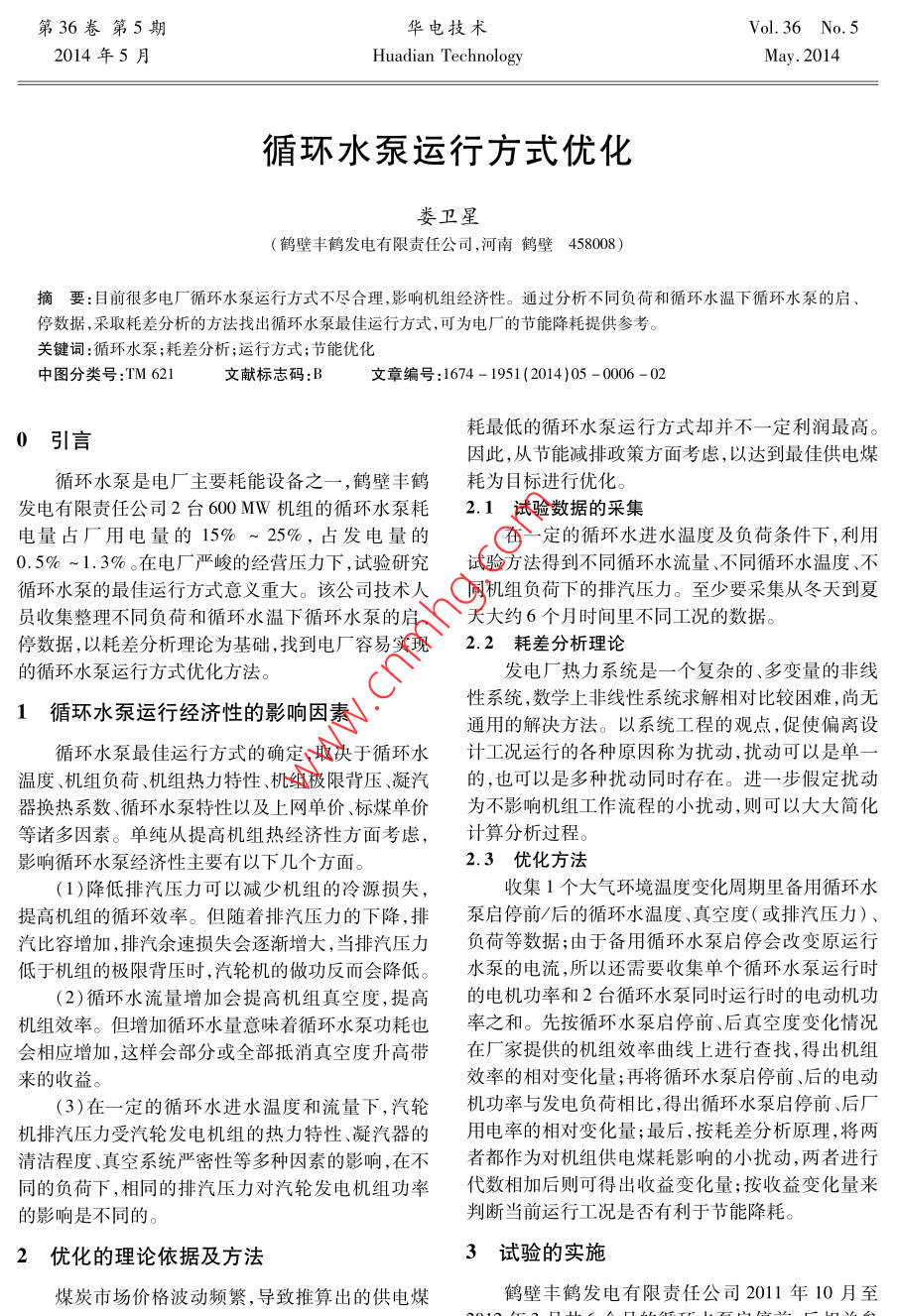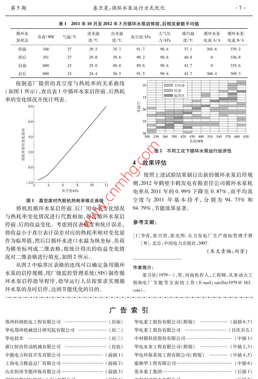 第36卷第5期華電技術Vol 36 No 52014年5月Huadian TechnologyMay.2014循環(huán)水泵運行方式優(yōu)化婁衛(wèi)星(鶴壁豐鶴發(fā)電有限責任公司,河南鶴壁458008)摘要:目前很多電廠循環(huán)水泵運行方式不盡合理,影響機組經(jīng)濟性。通過分析不同負荷和循環(huán)水溫下循環(huán)水泵的啟停數(shù)據(jù),采取耗差分析的方法找出循環(huán)水泵最佳運行方式,可為電廠的節(jié)能降耗提供參考。關鍵詞:循環(huán)水泵;耗差分析;運行方式;節(jié)能優(yōu)化中圖分類號:TM621文獻標志碼:B文章編號:1674-1951(2014)05-0006-020引言耗最低的循環(huán)水泵運行方式卻并不一定利潤最高。因此,從節(jié)能減排政策方面考慮,以達到最佳供電煤循環(huán)水泵是電廠主要耗能設備之一,鶴壁豐鶴耗為目標進行優(yōu)化發(fā)電有限責任公司2臺600MW機組的循環(huán)水泵耗2.1試驗數(shù)據(jù)的采集電量占廠用電量的15%~25%,占發(fā)電量的在一定的循環(huán)水進水溫度及負荷條件下,利用0.5%~1.3%在電廠嚴峻的經(jīng)營壓力下,試驗研究試驗方法得到不同循環(huán)水流量、不同循環(huán)水溫度、不循環(huán)水泵的最佳運行方式意義重大。該公司技術人同機組負荷下的排汽壓力。至少要采集從冬天到夏員收集整理不同負荷和循環(huán)水溫下循環(huán)水泵的啟、天大約6個月時間里不同工況的數(shù)據(jù)。停數(shù)據(jù),以耗差分析理論為基礎,找到電廠容易實現(xiàn)2.2耗差分析理論的循環(huán)水泵運行方式優(yōu)化方法。發(fā)電廠熱力系統(tǒng)是一個復雜的、多變量的非線循環(huán)水泵運行經(jīng)濟性的影響因素性系統(tǒng),數(shù)學上非線性系統(tǒng)求解相對比較困難,尚無通用的解決方法。以系統(tǒng)工程的觀點,促使偏離設循環(huán)水泵最佳運行方式的確定,取決于循環(huán)水計工況運行的各種原因稱為擾動,擾動可以是單溫度、機組負荷、機組熱力特性、機組極限背壓、凝汽的,也可以是多種擾動同時存在。進一步假定擾動器換熱系數(shù)、循環(huán)水泵特性以及上網(wǎng)單價、標煤單價為不影響機組工作流程的小擾動,則可以大大簡化等諸多因素。單純從提高機組熱經(jīng)濟性方面考慮,計算分析過程。影響循環(huán)水泵經(jīng)濟性主要有以下幾個方面2.3優(yōu)化方法(1)降低排汽壓力可以減少機組的冷源損失,收集1個大氣環(huán)境溫度變化周期里備用循環(huán)水提高機組的循環(huán)效率。但隨著排汽壓力的下降,排泵啟停前/后的循環(huán)水溫度、真空度(或排汽壓力)、汽比容增加,排汽余速損失會逐漸增大,當排汽壓力負荷等數(shù)據(jù);由于備用循環(huán)水泵啟停會改變原運行低于機組的極限背壓時,汽輪機的做功反而會降低。水泵的電流,所以還需要收集單個循環(huán)水泵運行時2)循環(huán)水流量增加會提高機組真空度,提高的電機功率和2臺循環(huán)水泵同時運行時的電動機功機組效率。但增加循環(huán)水量意味著循環(huán)水泵功耗也率之和。先按循環(huán)水泵啟停前、后真空度變化情況會相應增加,這樣會部分或全部抵消真空度升高帶在廠家提供的機組效率曲線上進行查找,得出機組來的收益。效率的相對變化量;再將循環(huán)水泵啟停前、后的電動(3)在一定的循環(huán)水進水溫度和流量下,汽輪機功率與發(fā)電負荷相比,得出循環(huán)水泵啟停前、后廠機排汽壓力受汽輪發(fā)電機組的熱力特性、凝汽器的用電率的相對變化量;最后,按耗差分析原理,將兩清潔程度、真空系統(tǒng)嚴密性等多種因素的影響,在不者都作為對機組供電煤耗影響的小擾動,兩者進行同的負荷下,相同的排汽壓力對汽輪發(fā)電機組功率代數(shù)相加后則可得出收益變化量;按收益變化量來的影響是不同的。判斷當前運行工況是否有利于節(jié)能降耗2優(yōu)化的理論依據(jù)及方法3試驗的實施煤炭市場價格波動頻繁,導致推算岀的供電煤鶴壁豐鶴發(fā)電有限責任公司2011年10月至第5期婁衛(wèi)星:循環(huán)水泵運行方式優(yōu)化表12011年10月至2012年3月循環(huán)水泵啟停前、后相關參數(shù)平均值循環(huán)水進水溫負荷/MW氣溫/℃出水溫排汽溫循環(huán)水泵循環(huán)水泵真空度/kPa泵狀態(tài)力/kPa度/℃電流A/A電流B/A停前37,1370.2停后39.690.298.6336.8啟前89.6啟后2336.591.542.7368.4369.3按制造廠提供的真空度與熱耗率的關系曲線不經(jīng)濟(如圖1所示),查出表1中循環(huán)水泵啟停前、后熱耗臨界區(qū)上率的變化情況并統(tǒng)計列表。這好皮要哥以300330360390420450480510540570600630負荷/MW圖2不同工況下循環(huán)水泵運行經(jīng)濟性4效果評估按照上述試驗結(jié)果制訂出新的循環(huán)水泵啟停規(guī)則,2012年鶴壁豐鶴發(fā)電有限責任公司循環(huán)水泵耗真空度kPa電率從2011年的0.99%下降至0.87%,而平均真圖1真空度對汽輪機熱耗率修正曲線空度與2011年基本持平,分別為94.73%和將機組循環(huán)水泵啟停前、后廠用電率變化情況94.79%,節(jié)能效果顯著。與熱耗率變化情況進行代數(shù)相加,得出循環(huán)水泵啟停前后的收益變化??紤]到儀表精度和統(tǒng)計誤差,參考文獻:將收益小于真空表計誤差對應的熱耗率相對變化量[1]李青,張興營,徐光照.火力發(fā)電廠生產(chǎn)指標管理手冊作為臨界值,然后以循環(huán)水進口水溫為縱坐標、負荷[M].北京: