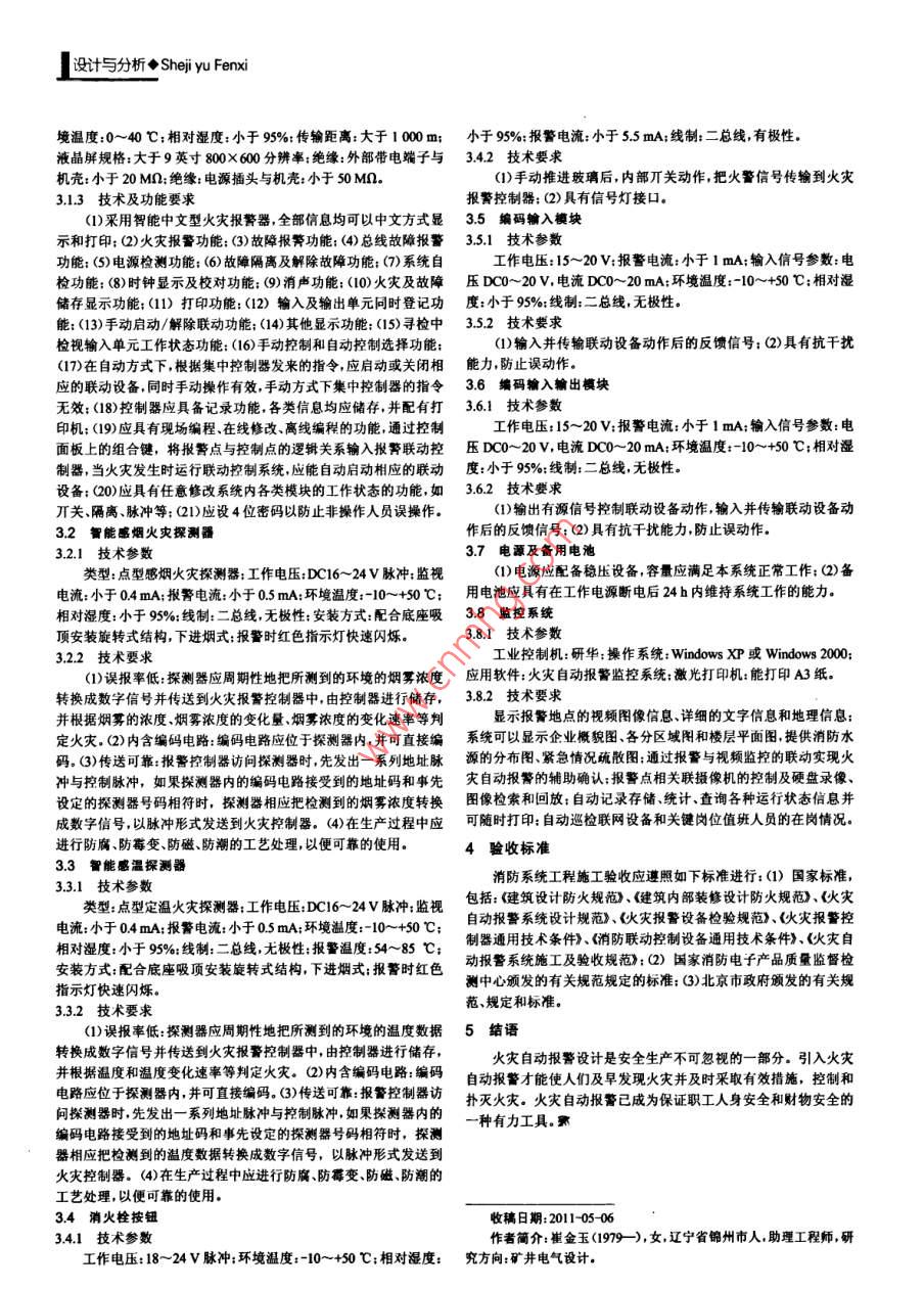 Sheji yu Fenxi◆設(shè)計(jì)與分析淺析水煤漿廠消防系統(tǒng)設(shè)計(jì)崔金玉(北京中煤科工集團(tuán)天地科技股份有限公司開采設(shè)計(jì)事業(yè)部,北京100013)摘要:通過對(duì)日前一家選煤廠消防系統(tǒng)具體實(shí)例的分析,提出了消防系統(tǒng)在安全生產(chǎn)中的必要性。詳細(xì)介紹了整個(gè)設(shè)計(jì)理念提出了應(yīng)極早重視應(yīng)用火災(zāi)自動(dòng)報(bào)警系統(tǒng)的建議關(guān)鍵詞:火災(zāi)自動(dòng)報(bào)警:煤礦;設(shè)計(jì)1工程消防概況消防控制系統(tǒng)由中文智能火災(zāi)報(bào)警控制器CRT圖形顯示本工程為集中式聯(lián)網(wǎng)型火災(zāi)報(bào)警及消防控制系統(tǒng),全廠設(shè)置屏、打印機(jī)應(yīng)急廣播設(shè)備消防直通對(duì)講電話UPS不間斷電源及套火災(zāi)自動(dòng)報(bào)警系統(tǒng)分別對(duì)輸煤走廊原料煤倉轉(zhuǎn)載站、制漿備用電源等組成車間、藥劑車間、機(jī)修車間、儲(chǔ)漿罐、各主要變配電室電纜夾層、主消防設(shè)備平面布置圖如圖1所示。要電纜溝控制室等場地的火災(zāi)危險(xiǎn)實(shí)施監(jiān)控消防控制中心設(shè)在制漿車間中心二層。根據(jù)全廠總平面布置,在機(jī)修車間、添加劑復(fù)配車間維修配電倉庫設(shè)區(qū)域報(bào)警器,放在添加劑復(fù)配車間:在破碎車間、破碎車間至六號(hào)轉(zhuǎn)載棧橋及六號(hào)轉(zhuǎn)載站至制漿車間棧橋設(shè)區(qū)域報(bào)警器,放在破碎車間;其余入儲(chǔ)煤皮防控制帶棧橋及原煤倉設(shè)區(qū)域報(bào)警器放在原煤倉上配電室各區(qū)域控制器通過總線控制方式接入到消防控制中心集中報(bào)警控制器上,形成全廠火災(zāi)報(bào)警控制系統(tǒng)2功能要求圖1消防控制室平面圖2.1消防配電及電纜線路、敷設(shè)方式1一火災(zāi)報(bào)警控制器2一消防聯(lián)動(dòng)控制器3一聯(lián)動(dòng)備用電源4廣播本工程消防電源為兩部分:一部分為消防泵房用電設(shè)備配電,主機(jī)柜5-消防電話主機(jī)6CRT罡示器7一雙電源切換稿另外一部分為消防控制電源。一電視墻9一藍(lán)控控制臺(tái)消防泵房用電為一級(jí)負(fù)荷采用雙電源供電。電源引自破碎車控制系統(tǒng)控制方式為手動(dòng)控制通過聯(lián)動(dòng)控制臺(tái),可實(shí)現(xiàn)對(duì)消火間,破碎車間有2臺(tái)變壓器分別為消防水泵供電。因?yàn)榇讼辣盟缁鹣到y(tǒng)自動(dòng)噴水滅火系統(tǒng)、火災(zāi)應(yīng)急廣播火災(zāi)應(yīng)急照明疏散房由本廠區(qū)自己提供所以其設(shè)備電源用電量及電纜敷設(shè)由廠區(qū)指示等的監(jiān)視及控制火災(zāi)發(fā)生時(shí)可手動(dòng)/動(dòng)切斷非消防電源自己統(tǒng)一考慮。(1)對(duì)消火栓系統(tǒng)的監(jiān)視與控制:設(shè)置消火栓起泵按鈕。當(dāng)發(fā)生消防控制電源亦采用雙回路供電。電源引自制漿車間低壓變火災(zāi)時(shí)可通過按動(dòng)消火栓起泵按鈕啟動(dòng)消防泵,并發(fā)出報(bào)警信號(hào)電所低壓變電所有9臺(tái)變壓器,消防控制電源由其中2臺(tái)獨(dú)立提至相關(guān)區(qū)域報(bào)警器及消防控制室并在消防控制室報(bào)控制器上顯供示起泵按鈕的位置。消防泵啟動(dòng)后將啟泵信號(hào)反饋至消防控制室,消防設(shè)備電源電纜采用NHYN型電力電纜,電纜沿涂防火同時(shí)將消防泵運(yùn)行信號(hào)反饋至消火栓處(現(xiàn)場消火栓指示燈點(diǎn)亮涂料的金屬線槽敷設(shè)或穿金屬管敷設(shè)應(yīng)急照明回路采用NHBv消防泵既可以在消防控制室聯(lián)動(dòng),又可以在消防泵房就地自動(dòng)/手型導(dǎo)線穿金屬管敷設(shè)穿管敷設(shè)線路沿墻、地面現(xiàn)澆樓板內(nèi)暗敷,動(dòng)控制啟停。消防控制室具有啟動(dòng)控制優(yōu)先權(quán)消防泵的啟動(dòng)停止在不燃燒體結(jié)構(gòu)層內(nèi)且保護(hù)層厚度不小于30m,明數(shù)或吊頂內(nèi)運(yùn)行信號(hào)及故障信號(hào)送至消防控制室并在聯(lián)動(dòng)控制臺(tái)上顯示數(shù)設(shè)時(shí)鋼管涂防火涂料保護(hù)。2)火災(zāi)確認(rèn)后應(yīng)切斷有關(guān)部位的非消防電源22火災(zāi)應(yīng)急照明(3)消防應(yīng)急廣播:在消防控制室設(shè)有消防應(yīng)急廣播盤。消防應(yīng)急廣播回路按建筑防火分區(qū)分路,當(dāng)發(fā)生火災(zāi)時(shí),消防控制室值火災(zāi)應(yīng)急照明包括事故照明和疏散照明在變電所配電室、消防水泵等有人員工作的地方要設(shè)事故照班人員可根據(jù)火災(zāi)發(fā)生的區(qū)域,自動(dòng)或手動(dòng)進(jìn)行切換控制技相鄰明如制漿車間變電所、消防控制室、破碎車間變電所添加劑復(fù)配防火分區(qū)接通應(yīng)急廣播揚(yáng)聲器進(jìn)行應(yīng)急廣播。車間配電室、儲(chǔ)漿罐配電室、水泵房、原煤倉配電室等設(shè)事故照明,3主要設(shè)備技術(shù)參數(shù)及要求火災(zāi)時(shí)持續(xù)工作的備用照明時(shí)間≥180min,照度不低于正常照明31智能型火災(zāi)報(bào)警控制器(聯(lián)動(dòng)型)照度。311柜體型式:琴臺(tái)式在提供人員疏散的場所應(yīng)設(shè)疏散標(biāo)志與疏散通道照明。如皮帶機(jī)柜應(yīng)能容納下本工程消防系統(tǒng)所包含的火災(zāi)報(bào)警控制器走廊