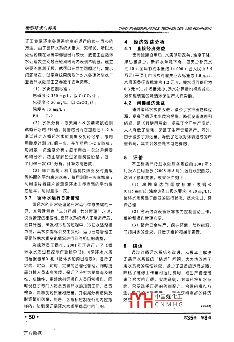 綠塑技術(shù)與裝備CHINA RUBBERPLASTICS TECHNOLOGY AND EQUIPMENT工業(yè)循環(huán)水運(yùn)行評(píng)價(jià)和處理方案馮瓊,張秋紅,馮平平(中國(guó)神馬集團(tuán)橡膠輪胎有限責(zé)任公司,河南平頂山467001)摘要:循環(huán)冷卻水在循環(huán)使用的過(guò)程中,往往在系統(tǒng)中嚴(yán)生結(jié)垢、腐蝕和生物粘泥,介紹了橡膠輪公司循環(huán)冷卻水處理的邁行評(píng)價(jià)和處理萬(wàn)聚,實(shí)踐證明,選擇正確的藥劑配方,臺(tái)理的操作方法良好的遠(yuǎn)行管理,可以使系統(tǒng)安全可靠地運(yùn)行關(guān)鍵詞:循環(huán)冷卻水;評(píng)價(jià);水處理;滿洗預(yù)膜中圖分類號(hào):TQ330.46文章縮號(hào):1009797X(2009)08-0046-05文獻(xiàn)標(biāo)識(shí)碼:B0o|:10.3969/ J.ISSN.1009797X2009.08.009中國(guó)神馬集團(tuán)橡膠輪胎有限責(zé)任公司為適應(yīng)生產(chǎn)所需,曾于1998年對(duì)循環(huán)水系統(tǒng)進(jìn)行技術(shù)改造,改造后循環(huán)冷卻水系統(tǒng)的最大供水量由原生嚴(yán)供水來(lái)的400m3/h增加到1200m/h,并釆用腐植酸系防垢技術(shù)作為循環(huán)水冷卻系統(tǒng)的水處理劑。近兩年來(lái)為緩解缺水與經(jīng)濟(jì)發(fā)展的矛盾、節(jié)生產(chǎn)回水約水資源和保護(hù)環(huán)境,國(guó)家不斷上調(diào)水資源費(fèi)生產(chǎn)補(bǔ)充水和污水處理費(fèi)的征收價(jià)格,使企業(yè)的生產(chǎn)成本1一冷卻塔:2一冷卻塔供水泵:3一熱水迆,4一冷水池也隨之增加。為降耗增效,我公司及時(shí)制定了生產(chǎn)供水泵;6-水表節(jié)能規(guī)劃,在《工業(yè)水管理制度》中規(guī)定水的圖1改造前工藝示意圖重復(fù)利用率>90%(循環(huán)水占工業(yè)用水的80%供水泵(型號(hào)為ISG-200-400(1),Q以上),這樣就要求必須有效的提高水的循環(huán)重400m3/h,H=50m)、4臺(tái)冷卻塔供水泵(型復(fù)利用率,為達(dá)到此目的,必須確保循環(huán)水系號(hào)為ISG-200-315(1),Q=400m/h,H統(tǒng)的安全可靠運(yùn)行32m)和一臺(tái)型號(hào)為BNB-1200的冷卻塔組成。其循環(huán)水量:700-1000m/h,補(bǔ)充水量:201循環(huán)冷卻水處理流程、工藝參數(shù)及25m3/h。循環(huán)冷卻給水壓力05MPa、濕度≤設(shè)備介紹32℃;循環(huán)冷卻回水壓力溫度35~40℃,濃縮循環(huán)冷卻水處理流程是根據(jù)循環(huán)冷卻水水質(zhì)倍數(shù)保持在2.5~3.0之間,系統(tǒng)一直采用腐植標(biāo)準(zhǔn)、補(bǔ)充水水質(zhì)指標(biāo)、濃縮倍數(shù)、熱交換設(shè)備酸系防垢技術(shù)的方式運(yùn)行。劉污垢熱阻值和腐蝕率的要求,考慮保護(hù)環(huán)境節(jié)約用水、水質(zhì)穩(wěn)定、經(jīng)濟(jì)合理,同時(shí)吸取成功生產(chǎn)給水通過(guò)循環(huán)水泵將冷水池的水加壓后進(jìn)入循環(huán)冷卻給水管道,供應(yīng)生嚴(yán)冷卻用水的運(yùn)行經(jīng)驗(yàn),通過(guò)技術(shù)經(jīng)濟(jì)比較后確定的。我公司原循環(huán)冷卻水處理系統(tǒng)如圖1所示中國(guó)煤化工師,主要從事設(shè)備管理循環(huán)冷卻水系統(tǒng)的主要設(shè)備由4臺(tái)生產(chǎn)CNMHG第35卷第8期設(shè)備管理與維護(hù)馮瓊等·工業(yè)循環(huán)水運(yùn)行評(píng)價(jià)和處理方案循環(huán)冷卻回水則通過(guò)循環(huán)冷卻回水管道依靠重2.3循環(huán)冷卻水系統(tǒng)的運(yùn)行評(píng)價(jià)力回流到熱水池,經(jīng)冷卻塔供水泵送到冷卻塔依據(jù)調(diào)研的情況,根據(jù)補(bǔ)充水的水質(zhì)狀況的配水系統(tǒng)均勻分布后,在冷卻塔內(nèi)自上而下卻水的運(yùn)行狀態(tài)和對(duì)冷卻塔結(jié)垢樣品進(jìn)行了進(jìn)行氣水換熱降溫,冷卻后進(jìn)人冷水池,再通分析,提出了該系統(tǒng)的運(yùn)行評(píng)價(jià)如下。過(guò)循環(huán)水泵加壓供出。如此循環(huán)往復(fù)。(1)補(bǔ)充水(并水)水質(zhì)分析見(jiàn)表2循環(huán)冷卻水系統(tǒng)的特點(diǎn)、存在的問(wèn)表1補(bǔ)充水質(zhì)分析Mg硬度總clsO4sio題及運(yùn)行評(píng)價(jià)14.128224621.020.820.52.1循環(huán)冷卻水系統(tǒng)的特點(diǎn)三,項(xiàng)目的單位均為mg/L(1)輪胎公司換熱設(shè)備繁多(如空壓機(jī)、由表1中數(shù)據(jù)可看出我公司補(bǔ)水水質(zhì)硬度、密煉機(jī)、開(kāi)煉機(jī)、擠出機(jī)、水泵等),并且大小堿度高,以這樣的補(bǔ)水水質(zhì)計(jì)算,我公司循環(huán)不均,且材質(zhì)多樣,熱介質(zhì)溫度不一,給水處水的濃縮倍數(shù)最好為3.0~3.5倍理運(yùn)行帶來(lái)一定困難;(2)循環(huán)水水質(zhì)分析見(jiàn)表2。(2)循環(huán)水冷卻塔不是一個(gè)全封閉系統(tǒng),塔池與外界直接接觸,由外界帶來(lái)的污染物比表2循環(huán)水質(zhì)分析較多。由于塔池周圍的塵土、泥沙、雜草、樹(shù)PH濃縮咫數(shù)硬總堿濁度化驗(yàn)結(jié)果8602.4610.3360.2葉等雜物,在風(fēng)天極易進(jìn)人冷卻塔水池,循環(huán)注:除PH外,具他項(xiàng)目的單位均為mg/L冷卻水在冷卻塔中進(jìn)行熱交換時(shí),這些雜質(zhì)就進(jìn)人到循環(huán)水中,造成系統(tǒng)懸浮物、濁度偏高根據(jù)以上水質(zhì)分析結(jié)果顯示循環(huán)水的鈣硬(3)我公司采用地下并水作為循環(huán)水的補(bǔ)堿度已超過(guò)900mg/L,表明該循環(huán)水系統(tǒng)為結(jié)垢充水,水中的Ca、Mg等鷂子硬度及碩度均狡大,型?,F(xià