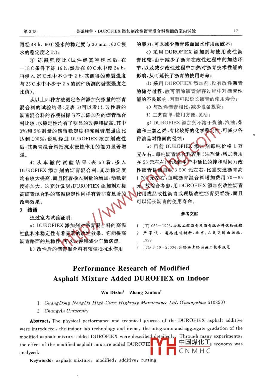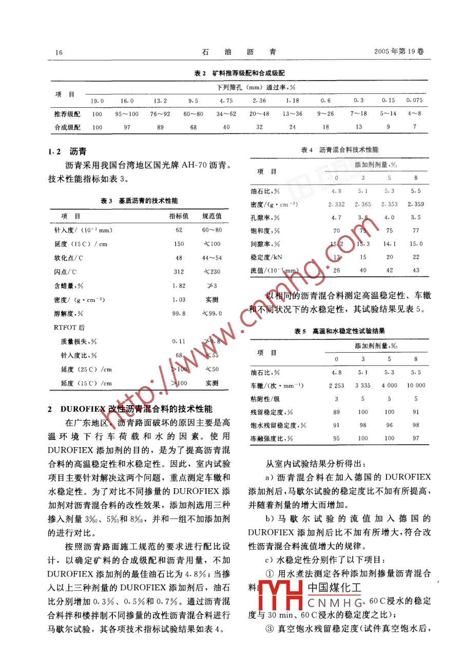 2005年6月石油瀝青PETROLEUM ASPHALT第19卷第3期DUROFIEX添加劑改性瀝青混合料性能的室內(nèi)試驗吳砥柱|張秀華21廣東能達高等級公路維護有限公司(廣州 510850 )2長安大學(xué)摘要簡要介紹了 德國DUROFIEX瀝青添加劑的物理性能和使用工藝,詳細地敘述了使用添加劑改性瀝青混合料的室內(nèi)試驗的工藝、項目以及組成材料和配比。并通過各項試驗結(jié)果,總結(jié)分析了DUROFIEX添加劑改性瀝青混合料的效果和特點。此外還在經(jīng)濟方面作了分析關(guān)鍵詞瀝青混合料改性添加劑車轍廣東深汕(深圳一汕頭)高速公路西段,自0. 3% ~0.4%左右。拌和溫度則需要提高10C左1996年12月建成通車以來,由于交通流量大、重右。DUROFIEX添加劑在實驗室的拌和鍋中不型車輛多,以及當(dāng)時面層設(shè)計及施工等多種原因,,能充分融化,用于混合料性能試驗的混合料試樣瀝青路面破壞較嚴(yán)重。特別是在埔邊主線收費廣必須通過拌和樓拌制。場地段,車轍問題尤為顯著,嚴(yán)重影響到路面的1瀝青混合料類型及組成材料使用質(zhì)量和行車安全。該地段亦曾多次進行維修,結(jié)合埔邊主線收費廣場地段維修工程,瀝青但效果甚微。于是決定采用德國的DUROFIEX混合料有AC-25、AC-20和AC-16三種類型[1.2]。添加劑,對瀝青混合料進行改性,試圖以此來增室內(nèi)試驗研究選用維修面層用的AC-16.強瀝青混合料的抗高溫變形能力和提高水穩(wěn)定1.1礦料性,達到治理車轍及其他類型病害的目的。為了礦料選用當(dāng)?shù)禺a(chǎn)的花崗巖。磨耗率22. 4%;了解和掌握這種材料的技術(shù)性能和操作工藝,在壓碎值22.6%;針片狀含量4.2%;小于0. 075使用前,對DUROFIEX添加劑改性瀝青混合料mm的顆粒含量為0.3%,均符合規(guī)范要求。組成的工藝和效果進行了室內(nèi)試驗。規(guī)格及密度如表1。DUROFIEX添加劑為黑色固體,粒狀,粒徑表1礦料類型與密度4. 75~0.15 mm,形狀不規(guī)則,密度1.042 g/cm3,規(guī)格/mm10~25 15~15 5~10 0~5 礦粉不溶解于煤油、汽油、柴油和三氯乙烯。供貨商密度/100 <505. I5.35.5延度(15C) /cm> 100車轍/(次●mm~I)22533335400010000粘附性/級2 DUROFIEX 改性瀝青混合料的技術(shù)性能殘留穩(wěn)定度,%101在廣東地區(qū),瀝青路面破壞的原因主要是高飽水殘留穩(wěn)定度,%9896)8溫環(huán)境下行車荷載和水的因素。使用凍融強度比,%9510CDUROFIEX添加劑的目的,是為了提高瀝青混合料的高溫穩(wěn)定性和水穩(wěn)定性。因此,室內(nèi)試驗從室內(nèi)試驗結(jié)果分析得出:項目主要針對解決這兩個問題,重點測定車轍和a)瀝青混合料在加入德國的DUROFIEX水穩(wěn)定性。為了對比不同摻量的DUROFIEX添添加劑后,馬歇爾試驗的穩(wěn)定度比不加有所提高,加劑對瀝青混合料的改性效果,添加劑選用三種并隨著劑量的增大而增加。摻入劑量3%、5%。和 8%,并和一組不加添加劑b)馬歇爾試驗的流值加入德國的的進行對比。DUROFIEX添加劑后比不加有所增大,符合改按照瀝青路面施工規(guī)范的要求進行配比設(shè)性瀝青混合料流值增大的規(guī)律。計,以確定礦料的合成級配和瀝青用量,不加c)水穩(wěn)定性分別作了以下項目:DUROFIEX添加劑的最佳油石比為4. 8%;當(dāng)摻①用水煮法測定各種添加劑摻量瀝青混合入以上三種劑量的DUROFIEX添加劑后,油石中國煤化工比分別增加0.3%、0. 5%和0.7%。通過瀝青混YHCNMHG 60C浸水的穩(wěn)定合料拌和樓拌制不同摻量的改性瀝青混合料進行度與30 min、60 C浸水的穩(wěn)定度之比);馬歇爾試驗,其各項技術(shù)指標(biāo)試驗結(jié)果如表4。③真空飽水殘留穩(wěn)定度(試件真空飽水后,第3期吳砥柱等.DUROFIEX添加劑改性瀝青混合料性能的室內(nèi)試驗17再經(jīng)48 h、60C浸水的穩(wěn)定度與30 min、60C浸的能力,可以減少瀝青路面因水作用而破壞;水的穩(wěn)定度之比);c)采用DUROFIEX添加劑與使用改性瀝④凍融強度比(試件經(jīng)真空飽水后,在青比較,由于減少了瀝青在改性過程中的加熱環(huán)-18C條件下凍16 h,然后在60C水中浸24 h,節(jié),以及減少改性過程中加熱對瀝青技術(shù)性能的再浸入25C水中不少于2 h,其測得的劈裂強度影響,從而延長了瀝青的使用壽命;與25C水中不少于2h的試件所測的劈裂強度之d)采用DUROFIEX添加劑,沒有改性瀝青比值)。的儲存過程,故可消除瀝青儲存過程中對瀝青性從以上四種方法測定各種添加劑摻量的瀝青能的不良影響,因而可以延長瀝青的使用壽命;混合料的試驗結(jié)果(見表5)可以看出,改性后的e)與改性瀝青相比,減少設(shè)備投資;瀝青混合料的各項指標(biāo)與不加添加劑的瀝青混合f)工藝簡單,使用方便、靈活;料比較,水穩(wěn)定性均有了明顯的改善和提高。其中g(shù)) DUROFIEX添加劑不溶于煤油、汽油、柴3%和5%劑量的殘留穩(wěn)定度和凍融劈裂強度比油和三氯乙烯,有比較好的化學(xué)穩(wěn)定性,可減少各達到100%,說明經(jīng)過DUROFIEX添加劑改性種油品對路面的侵蝕;后,其瀝青混合料抵抗水浸蝕作用的能力顯著增h)目前DUROFIEX添加劑每噸價格1萬強元左右。每噸瀝青混合料若用5%劑量,增加費用d)從車轍的試驗結(jié)果(表5)看,摻入在55元左右(考慮到生產(chǎn)中延長的拌和時間);改DUROFIEX添加劑的瀝青混合料,其動穩(wěn)定度性瀝青目前每噸3500元左右,比重交通瀝青高均有較大提高。而且隨著摻入劑量的增加,動穩(wěn)定1700 元左右,每噸瀝青混合料增加費用