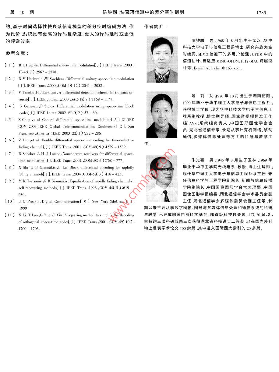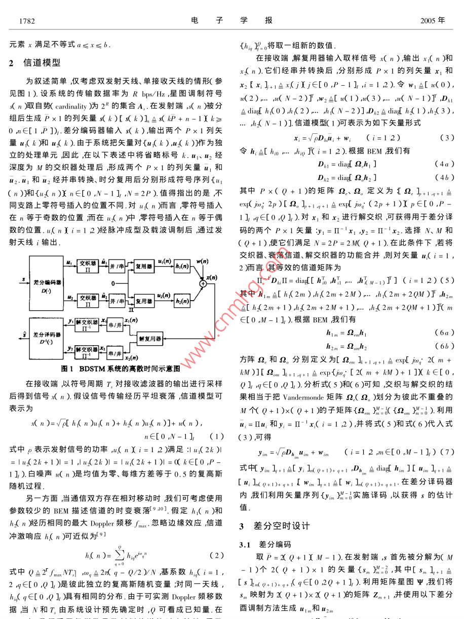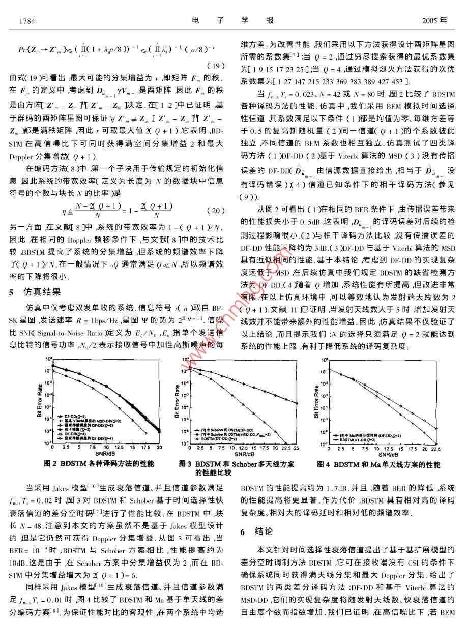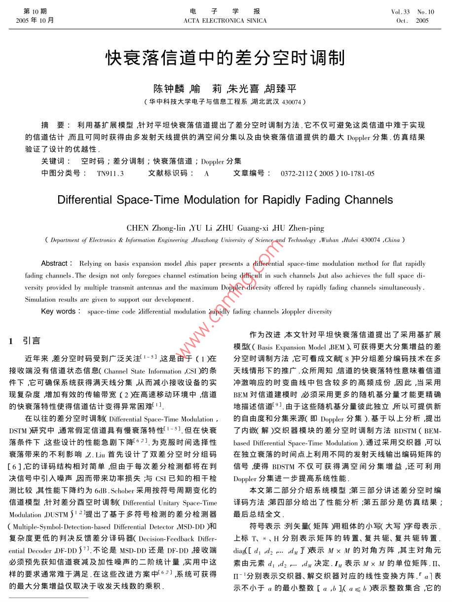 第10期電子學(xué)報(bào)Vol 33 No 102005年10月ACTA ELECTRONICA SINICA0ct.2005快衰落信道中的差分空時(shí)調(diào)制陳鐘麟喻莉朱光喜胡臻平華中科技大學(xué)電子與信息工程系湖北武漢430074摘要:利用基擴(kuò)展模型,針對(duì)平坦快衰落信道提岀了差分空時(shí)調(diào)制方法.它不僅可避免這類信道中難于實(shí)現(xiàn)的信道估計(jì)而且可同時(shí)獲得由多發(fā)射天線提供的滿空間分集以及由快衰落信道提供的最大 Doppler分集.仿真結(jié)果驗(yàn)證了設(shè)計(jì)的優(yōu)越性關(guān)鍵詞:空時(shí)碼冫差分調(diào)制;快衰落信道; Doppler分集中圖分類號(hào):T911.3文獻(xiàn)標(biāo)識(shí)碼:A文章編號(hào):0372-2112(2005)10-1781-05Differential Space-Time Modulation for Rapidly Fading ChannelsCHEN Zhong-lin YU Li ZHU Guang-xi ,HU Zhen-pingDepartment of Electronics Information Engineering, Huazhong Unicersity of Science and Technology Wuhan, Hubei 430074, ChinaAbstract: Relying on basis expansion model this paper presents a differential space-time modulation method for flat rapidlyfading channels. The design not only foregoes channel estimation being difficult in such channels but also achieves the full space diversity provided by multiple transmit antennas and the maximum Doppler diversity offered by rapidly fading channels simultaneouslySimulation results are given to support our developmentKey words: space-time code differential modulation arapidly fading channels doppler diversity引言作為改進(jìn)本文針對(duì)平坦快衰落信道提出了采用基擴(kuò)展模型(( Basis Expansion Model BEM)可獲得更大分集增益的差近年來差分空時(shí)碼受到廣泛關(guān)注1-5這是由于(1)在分空時(shí)調(diào)制方法它可看成文獻(xiàn)8中分組差分編碼技術(shù)在多接收端沒有信道狀態(tài)信息( Channel State Information,CsI)的條天線情形下的推廣,眾所周知信道的快衰落特性意味著信道件下它可確保系統(tǒng)獲得滿天線分集從而減小接收設(shè)備的實(shí)沖激響應(yīng)的時(shí)變曲線中包含較多的高頻成份,因此,當(dāng)采用現(xiàn)復(fù)雜度增加有效的傳輸帶寬〔2迕髙速移動(dòng)環(huán)境中,信道BEM對(duì)信道建模時(shí)必須采用更多旳隨杋基分量才能更精確的快衰落特性使得信道估計(jì)變得異常困難地描述信道ν.由于這些隨機(jī)基分量彼此獨(dú)立所以可提供新在以往的差分空時(shí)調(diào)制 Differential Space- Time modulation,的自由度和分集來源(即 Doppler分集).基于以上分析,提出DsTM汧究中通常假定信道具有慢衰落特性-5].但在快衰了內(nèi)嵌(解)交織器模塊的差分空時(shí)調(diào)制方法 BDSTA(BEM落條件下這些設(shè)計(jì)的性能急劇下降6.為克服時(shí)間選擇性 based Differential Space- Time Modulation)通過采用交織器可以褒落帶來的不利影響Z,Li首先設(shè)計(jì)了雙差分空時(shí)分組碼在獨(dú)立衰落的時(shí)間點(diǎn)上利用不同的發(fā)射天線輸出編碼矩陣的[6]它的譯碼結(jié)構(gòu)相對(duì)簡(jiǎn)單但由于每次差分檢測(cè)都將在判信號(hào)使得 BDSTM不僅可獲得滿空間分集增益,還可利用決信號(hào)中引入噪聲因而帶來功率損失瀉與CSI已知的相干檢 Doppler分集進(jìn)一步提高系統(tǒng)性能.測(cè)比較其性能下降約為6dB. Schober采用按符號(hào)周期變化的本文第二部分介紹系統(tǒng)模型;第三部分講述差分空時(shí)編信道模型計(jì)對(duì)差分酉空時(shí)調(diào)制 Differential Unitary Space-rime譯碼方法涕四部分給岀了性能分析第五部分是仿真結(jié)果;Modulation dustm)2提出了基于多符號(hào)檢測(cè)的差分檢測(cè)器最后總結(jié)全文( Multiple- Symbol- Detection-based Differential Detector, MSD-DD)和符號(hào)表示冽矢量(矩陣)用粗體的小寫(大寫序母表示復(fù)雜度更低的判決反饋差分譯碼器( Decision- Feedback differ-上標(biāo)T、*、H分別表示矩陣的轉(zhuǎn)置、復(fù)共軛、復(fù)共軛轉(zhuǎn)置ntial Decoder DE-DD)7.不論是MsD-DD還是DF-DD接收端diag[d1d2…dn丁表示MxM的對(duì)角方陣其主對(duì)角元必須預(yù)先獲知信道衰減及加性噪聲的二階統(tǒng)計(jì)量實(shí)用中這素由元素d1,d2灬,,du決定.I表示M×M的單位矩陣Ⅱ、樣的要求通常難于滿足在這些改進(jìn)方案中6)系統(tǒng)可獲得Ⅱ分別表示交織器、解交織器對(duì)應(yīng)的線性變換方陣「a表的最大分集增益僅取決于收發(fā)天線數(shù)的乘積示不小于a的最小整數(shù)[a,b]a≤b)表示整數(shù)集合,它的1782電子學(xué)報(bào)2005年元素x滿足不等式a≤x≤b.hn將取一組新的數(shù)值2信道模型在接收端解復(fù)用器輸入取樣信號(hào)x(n)輸出x(n)和x(n).它們經(jīng)串并轉(zhuǎn)換后分別形成P×1的列矢量x1和為敘述簡(jiǎn)單僅考慮雙發(fā)射天線、單接收天線的情形參x2x1+14xjj∈[0,P-1J=12)令w1A[u(0)見圖1)設(shè)系統(tǒng)的傳輸數(shù)據(jù)率為Rb星圖調(diào)制符號(hào)n(2)灬(N-2)w2A[(1),n(3)灬,n(N-1),Datsn-取自( cardinality為2"的集合A,在發(fā)射端,n)被分盤diah10),h(2)灬…h(huán)(N-2)],D2dagh1),h3)組后生成P×1的列矢量s(k)[sk)]4s(AP+n-1k≥0n∈[I,P]).差分編碼器輸入s(k)輸出兩個(gè)P×1列矢h(N-1)]信道模型(1)可表示為如下矢量形式量u(k)和u、k).由于系統(tǒng)把矢量對(duì){u(k),u、k)作為獨(dú)√pDu(i=12)(3)立的處理單元因此在以下表述中將省略標(biāo)號(hào)k,1、n2經(jīng)令h盤[h0灬hi=12).根據(jù)BEM我們有深度為M的交織器處理后形成兩個(gè)Px1的列矢量u