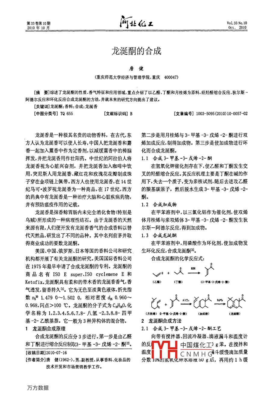 第33卷第10期河北化工VoL33 Na 102010年10月0ct. 2010龍涎酮的合成唐健(重慶師范大學(xué)經(jīng)濟(jì)與管理學(xué)院,重慶40047)[摘要]綜述了龍涎酮的性質(zhì) 、香氣特征和應(yīng)用領(lǐng)域,重點(diǎn)介紹了以乙醛.丁酮和月桂烯為原料,經(jīng)羥醛縮合反應(yīng)、狄爾斯-阿德爾反應(yīng)和環(huán)化反應(yīng)合成龍涎酮的方法,并就未來的研究方向提出了建議。[關(guān)鍵詞]龍涎酮;香料;合成:龍涎香[中圖分類號(hào)] TQ 655[文獻(xiàn)標(biāo)識(shí)碼] B[文章編號(hào)] 1003-5095 (2010) 10-0057-02龍涎香是一-種極其名貴的動(dòng)物香料,在古代,東第二步是用月桂烯與3-甲基-3-戊烯-2-酮進(jìn)行雙方人認(rèn)為龍涎香可以使人長(zhǎng)壽,中國(guó)人把龍涎香和麝烯加成反應(yīng),制得加成物。第三步是使加成物進(jìn)行環(huán)香一起加入薰香中作為定香劑,以減緩蔑香中的樟腦化而合成龍涎酮。揮發(fā),并把龍涎香用作壯陽(yáng)藥。中世紀(jì)的阿拉伯人將1.1 合成3-甲基-3-戊烯-2-酮龍涎香視為心臟興奮劑,并把龍涎香加入咖啡中飲在氫氧化鉀催化劑存在下,使乙醛和丁酮發(fā)生交用,突尼斯人用龍涎香、藏紅花和玫瑰花花瓣制成珠叉的羥醛縮合,反應(yīng)。其反應(yīng)機(jī)理主要是丁酮在堿的作子穿在金項(xiàng)鏈上佩帶。西方人也使用龍涎香,在14世用下,失去一個(gè)質(zhì)子,變?yōu)橛H核試劑,隨后去進(jìn)攻乙醛紀(jì)馬可●波羅視龍涎香為-種商品,在17世紀(jì),西方的羰基碳原子,然后脫水生成3-甲基-3-戊烯-2-的藥典中有龍涎香是一種治療 大腦和心臟疾病藥物,酮。并有預(yù)防瘟疫作用的記載。1.2 合成加成物龍涎香是抹香鯨胃腸內(nèi)未完全消化食物(特別是在甲苯溶劑中,以三氯化鋁作為催化劑,使雙烯烏賊)所形成的一種病理性結(jié)石。由于龍涎香的天然體月桂烯與親雙烯體3-甲基-3-戊烯-2-酮發(fā)生狄來源有限,人們便開發(fā)有龍涎香香氣的合成香料以替爾斯-阿德爾反應(yīng),得到加成物。代天然品,研發(fā)出了不同的品種。其中名列前茅并取1.3 合成龍涎酮得商業(yè)成功的要數(shù)龍涎酮。在甲苯溶劑中,用磷酸作為環(huán)化劑,使加成物發(fā)美國(guó)、中國(guó)、俄羅斯、日本等國(guó)的香料公司和研究生環(huán)化反應(yīng),合成龍涎酮。機(jī)構(gòu)都開展了有關(guān)龍涎酮的研究。美國(guó)國(guó)際香料公司合成龍涎酮的化學(xué)反應(yīng)式:在1975年最早申請(qǐng)了合成龍涎酮的專利。龍涎酮的Ko商品名有ISO Esuper.ISO cyclemene E和Ketofix.龍涎酮具有柔和的帶木香的龍涎香香氣,香(乙酯)(T南)(3-甲基-3-戊端-2-酬)氣透發(fā),留香持久”。它為無色至淡黃色液體,折光指數(shù)n3° 1.479 0~1.502 0,相對(duì)密度ds 0.960~0.968,閃點(diǎn)>100 C.龍涎酮的分子式為CH2O,化ef世二學(xué)名稱為1,2,3,4,5,6,7,8- 八氫-2,3,8,8- 四甲(月桂姆) 0-甲基-0婚-2-刪)(加成物)(龍涎制)基-2-乙酰基蔡。它一-般為 3種異構(gòu)體的混合物。2龍涎酮合成方法1龍涎酮合成原理2.1 合成3-甲基-3-戊烯-2-酮工藝合成龍涎酮的反應(yīng)分3步進(jìn)行。第-步是由乙醛向帶有攪拌器、回流冷凝器、滴液漏斗和溫度計(jì)和丁酮進(jìn)行縮合反應(yīng)制取3-甲基-3-戊烯-2-酮。的反中國(guó)煤化工g苯。在攪拌和[收稿日期]2010-07-16溫度CN M H斗緩慢滴加質(zhì)量[作者簡(jiǎn)介]唐健 (1962-),男,副教授,從事香料、化妝品的分?jǐn)?shù)1U%的氫氧化鉀水路液5U g后,再用約1 h緩技術(shù)開發(fā)和市場(chǎng)營(yíng)銷教學(xué)工作。.58*河北化工第10期慢滴加質(zhì)量分?jǐn)?shù)40%乙醛330 go加料完畢后,在溫度精、香皂香精和化妝品香精的配制,可作為變調(diào)劑使為30 C條件下繼續(xù)攪拌反應(yīng)3 h,即結(jié)束反應(yīng)。用。由于龍涎酮兼具紫羅蘭香氣,并可以給花香型香用質(zhì)量分?jǐn)?shù)10%的乙酸水溶液將反應(yīng)混合物中精增強(qiáng)香氣和賦予動(dòng)物香香韻,尤其適用于香水香精和至pH值為7,并用蒸餾水洗滌,再通過常壓蒸餾回的調(diào)配,在配方中的質(zhì)量百分含量可以高達(dá)10%日。另收苯,然后進(jìn)行減壓蒸餾,收集63 C/6. 57 kPa餾外,龍涎酮對(duì)提高煙草的香氣品質(zhì)有極佳的效果,可份,可以得到約100 g3-甲基-3-戊烯-2-酮淡黃,以用它調(diào)配煙用香 精以用于煙草的加香。色透明液體。合成龍涎酮的關(guān)鍵中間體為月桂烯,不僅可以用2.2合成加成物工藝石油化工產(chǎn)品中的Cs烯烴制取,也可以從月桂葉油、向裝有攪拌器、溫度計(jì)和回流冷凝器的反應(yīng)器馬鞭草油、蛇麻油、黃柏油等中提取月桂烯,更能夠利中,加入100 g3-甲基-3-戊烯-2-酮、140 g月桂用松節(jié)油所含的β-蒎烯進(jìn)行熱裂解開環(huán),從而經(jīng)濟(jì)烯.11 g三氯化鋁和300 g甲苯。保持反應(yīng)溫度40~地制取月桂烯同。50 C條件下攪拌反應(yīng)6 h,即結(jié)束反應(yīng)??傻玫郊s總之,利用月桂烯合成龍涎酮是經(jīng)濟(jì)可行的。同160 g加成物。時(shí)還需要改進(jìn)龍涎酮合成工藝,一是研究利用陽(yáng)離子.3合成龍涎酮工藝交換樹脂替代無機(jī)酸(磷酸)作為催化劑,以減小環(huán)境污染,二是研究進(jìn)一步提高合成反應(yīng)中香氣強(qiáng)度大的中,加入160 g加成物.50 g 85%磷酸和250 g甲苯。龍涎酮異構(gòu)體的收率,使龍涎酮合成工藝更加完善。攪拌加熱,在保持溫度70~80 