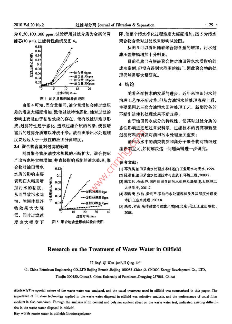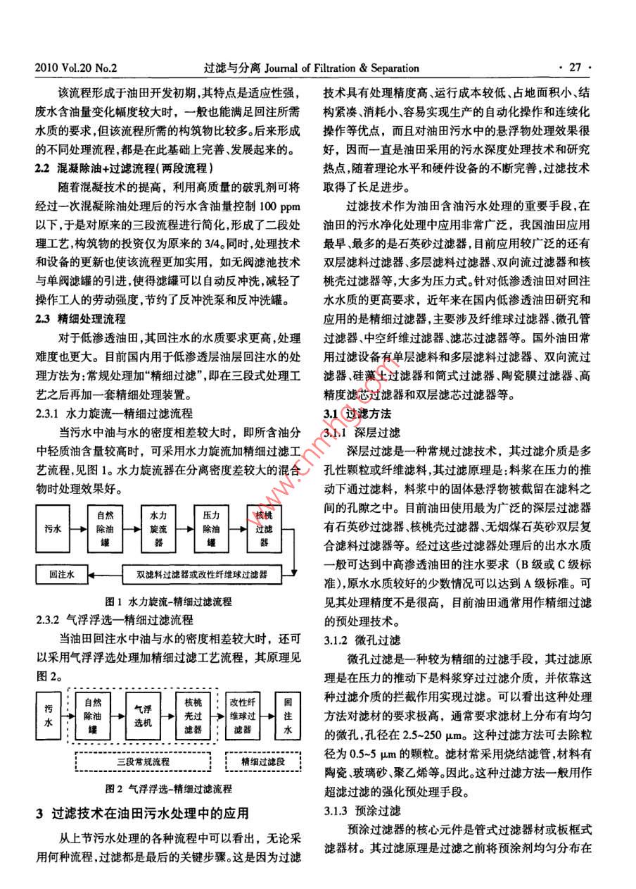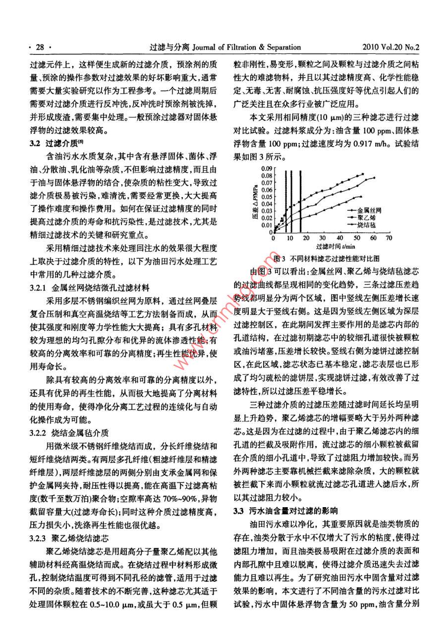 ●26●過濾與分離Jourmal of Filtration & Separation2010 Vol.20 No.2油田污水處理研究李靜',祁萬(wàn)軍",吉慶林3(1.中國(guó)石油工程設(shè)計(jì)有限責(zé)任公司北京分公司,北京10083;2.中海 油能源發(fā)展股份有限公司,天津300450;3.中國(guó)石油大學(xué)(華東),山東東營(yíng)257061)摘要:分析了 油田污水的特殊性質(zhì) ,總結(jié) 了其常規(guī)處理工藝及相關(guān)裝置,重點(diǎn)分析 了過濾技術(shù)在油田污水處理方面的重要性,并比較了常用過濾介質(zhì)的性能特點(diǎn)。通過試驗(yàn)分析了油含量和聚合物含量對(duì)污水過濾處理的影響,指出了油田污水處理的難度所在。關(guān)鍵詞:油田污水;過濾;聚合物;中團(tuán)分類號(hào):TE992文獻(xiàn)標(biāo)識(shí)碼:A文章編號(hào): 1005- 8265/2010)02-0026-04目前,對(duì)油田含油污水的精細(xì)處理已經(jīng)成為熱門(3)水中含有SO子。硫酸鹽容易滋生細(xì)菌,細(xì)菌大課題,特別隨著國(guó)內(nèi)外各油田進(jìn)入中后開采期,注水開量繁殖不僅腐蝕管線,而且還會(huì)造成地層嚴(yán)重堵塞;發(fā)方式被普遍采用,同時(shí)為了提高采收率油田助劑也(4)含有大量成垢離子。含有大量的HCO3、Ca?*、被大量使用,致使油田采出液含水量不斷增加、成分更Mg”°等成垢離子,容易在管道及容器內(nèi)結(jié)垢;加復(fù)雜,特別是隨著聚合物驅(qū)油技術(shù)的8益成熟,采出(5)懸浮物含量高。懸浮物含量高,顆粒微小,容易水中所含的高分子聚合物使得污水處理難度進(jìn)一-步加造成地層堵;大。為了增加經(jīng)濟(jì)效益和達(dá)到環(huán)保要求,油田采出水通(6)含高分子聚合物。使污水水質(zhì)惡化,凈化難度常經(jīng)過多道處理工序后用于回注,如果處理不達(dá)標(biāo)就加大?;刈?將導(dǎo)致管線腐蝕結(jié)垢、滲油口堵塞、注水壓力升2油田采出水常規(guī)處理方式1-4高等一系列問題,特別是某些低滲透和特低透滲油田,對(duì)回注水含油量要求小于5 ppm,懸浮物粒徑要小于1目前國(guó)內(nèi)油田采用的污水處理技術(shù)一般包括:重μm,懸浮物濃度要小于1 ppm?;刈⑶皩?duì)含油污水的力沉降技術(shù)、粗?;夹g(shù)、氣浮技術(shù)、過濾技術(shù)等。重力處理涉及懸浮雜質(zhì)、防垢、防蝕、殺菌和隔氧等多個(gè)方沉降的處理效果完全依賴于污水中各成分的重力差以面,其中,最難處理的是懸浮雜質(zhì),包括浮油、分散油、及化學(xué)藥劑的效果,設(shè)備占地面積大;粗?;夹g(shù)處理效果的好壞依賴于粗?;牧系木劢Y(jié)性能,聚結(jié)性能乳化油、懸浮固體、聚合物等。好的粗粒化材料能使細(xì)小油珠變?yōu)榇笥椭?,從而使?油田采出水性質(zhì)除油更容易;氣浮技術(shù)在油田含油污水處理中的應(yīng)用油田采出水成分復(fù)雜,是一一種以水為主體,集固體主要是密閉加壓溶氣氣浮技術(shù),常用氣源為天然氣,氮雜質(zhì)、油類等懸浮體、溶解氣、鹽類和一些有機(jī)物為一氣也有所應(yīng)用。 此外,膜分離技術(shù)、井下油水分離技術(shù)、體的復(fù)雜混合物,一般含油量高、懸浮物高、礦化度高。三相旋流分離技術(shù)等也是目前油田污水處理技術(shù)中的通過對(duì)國(guó)內(nèi)主要油田污水水樣進(jìn)行分析,發(fā)現(xiàn)具有如研究熱點(diǎn)。.下特點(diǎn):2.1自然除油+混凝除油+過濾流程(三段流程)(1)礦化度高。高礦化度會(huì)加速腐蝕,并給污水生自然除油階段利用重力進(jìn)行油水分離,去除浮油;化處理帶來(lái)困難;混凝階段進(jìn)-步去除浮油和部分乳化油;經(jīng)過這兩個(gè)(2)含油量高。高含油量的污水,回注容易堵塞地階段后污水中含油量較低,可以進(jìn)行過濾操作,在過濾層,外排會(huì)造成油污染;階段主要去除污水中的懸浮物和微量油類。收稿日期:2000 04-28作者簡(jiǎn)介:李靜(1983-),女,碩士,E-mail:1jing19840415@163.com.2010 Vol.20 No.2過濾與分離Jourmal of Filtration & Separation●27●該流程形成于油田開發(fā)初期,其特點(diǎn)是適應(yīng)性強(qiáng),技術(shù)具有處理精度高、運(yùn)行成本較低、占地面積小、結(jié)廢水含油量變化幅度較大時(shí),一般也能滿足回注所需構(gòu)緊湊 、消耗小、容易實(shí)現(xiàn)生產(chǎn)的自動(dòng)化操作和連續(xù)化水質(zhì)的要求,但該流程所需的構(gòu)筑物比較多。后來(lái)形成操作等優(yōu)點(diǎn),而且對(duì)油田污水中的懸浮物處理效果很的不同處理流程,都是在此基礎(chǔ)上完善、發(fā)展起來(lái)的。好,因而一直是油田采用的污水深度處理技術(shù)和研究2.2混凝除油+過濾流程(兩段流程)熱點(diǎn),隨著理論水平和硬件設(shè)備的不斷完善,過濾技術(shù)隨著混凝技術(shù)的提高,利用高質(zhì)量的破乳劑可將取得了長(zhǎng)足進(jìn)步。經(jīng)過一次混凝除油處理后的污水含油量控制100 ppm過濾技術(shù)作為油田含油污水處理的重要手段,在以下,于是對(duì)原來(lái)的三段流程進(jìn)行簡(jiǎn)化,形成了二段處油 田的污水凈化處理中應(yīng)用非常廣泛,我國(guó)油田應(yīng)用理工藝,構(gòu)筑物的投資僅為原來(lái)的3/4。同時(shí)處理技術(shù)最早、最多的是石英砂過濾器,目前應(yīng)用較廣泛的還有和設(shè)備的更新也使該流程更加實(shí)用,如無(wú)閥濾池技術(shù)雙層濾料過濾器多層濾料過濾器、雙向流過濾器和核與